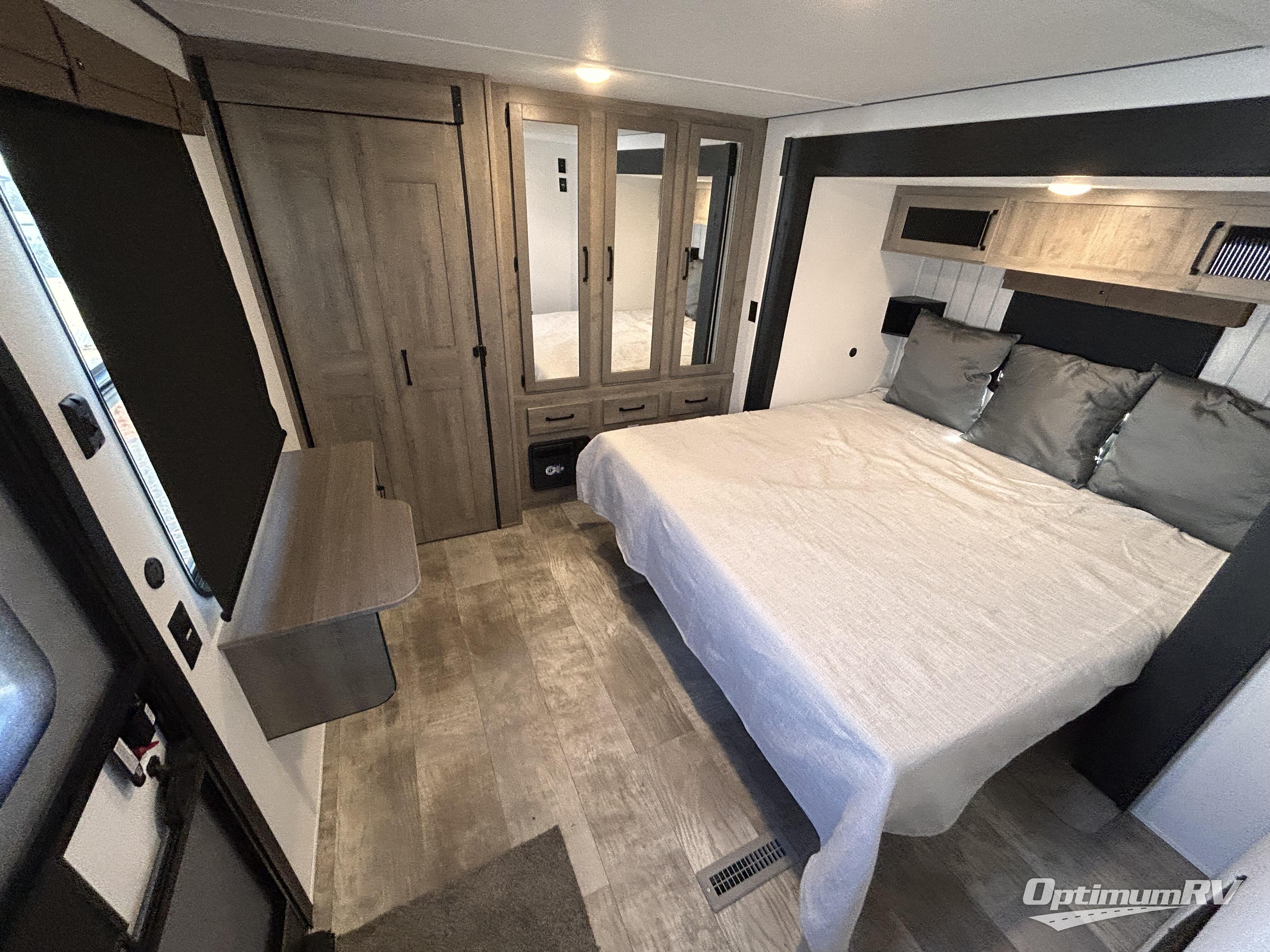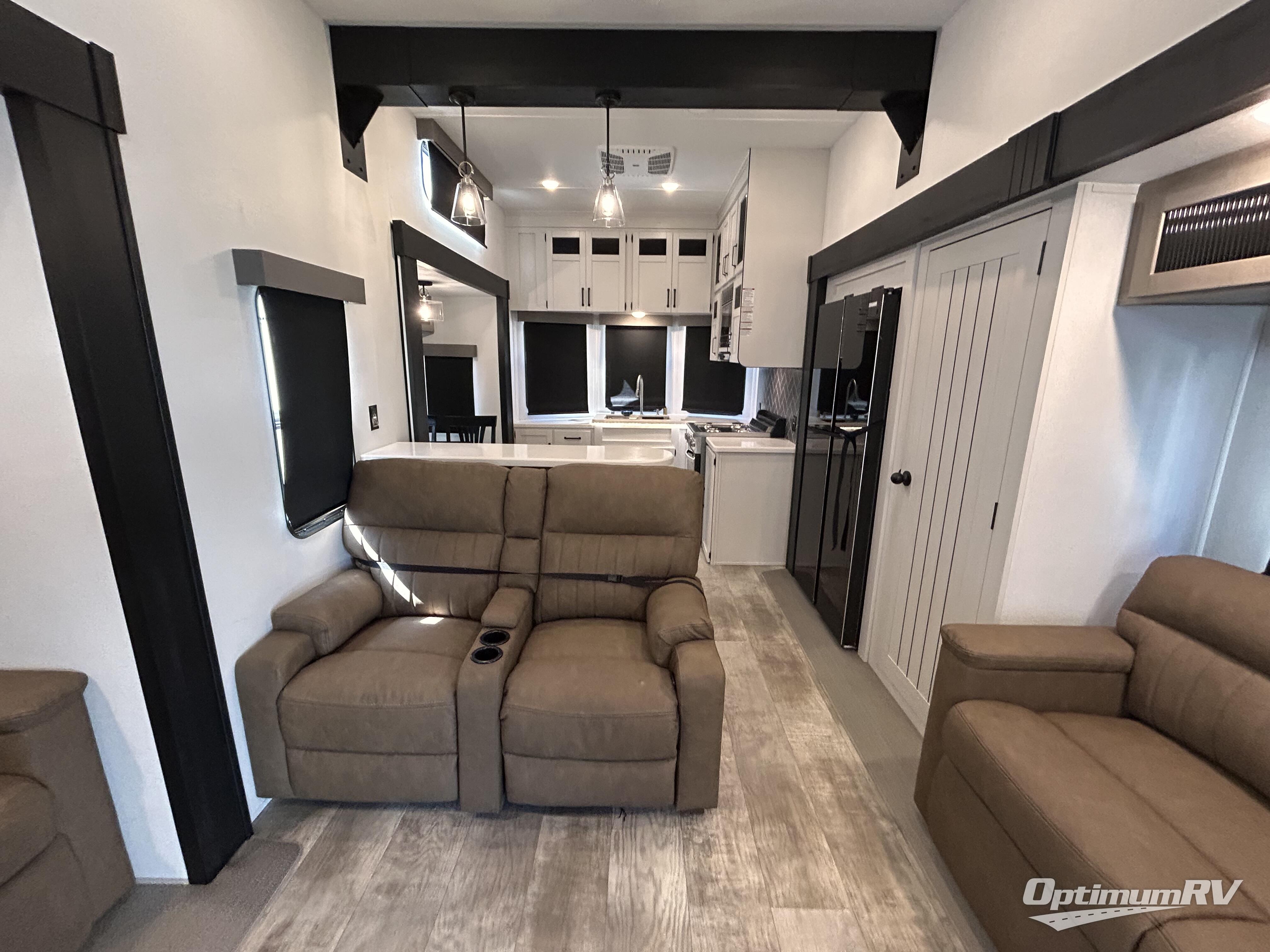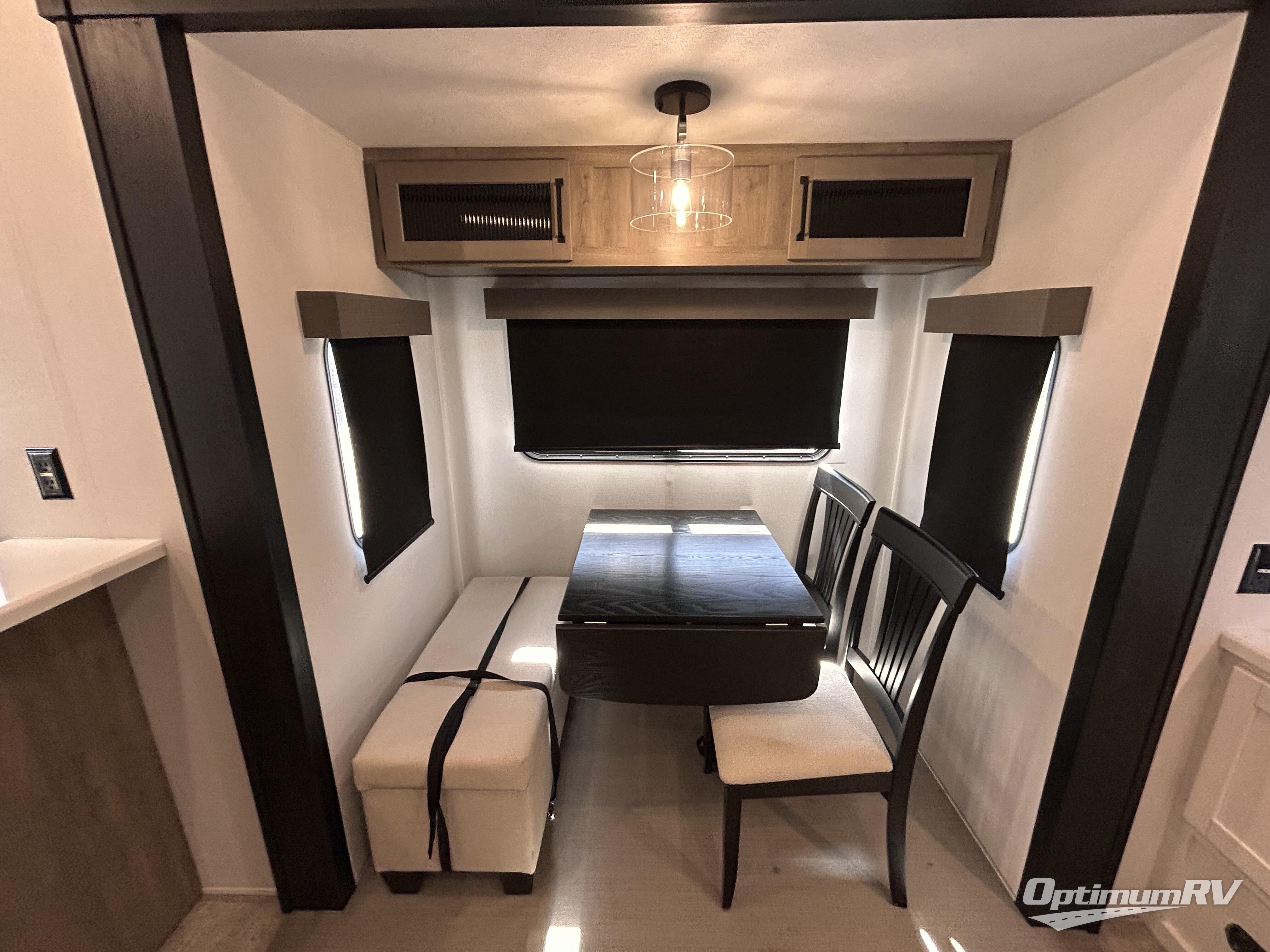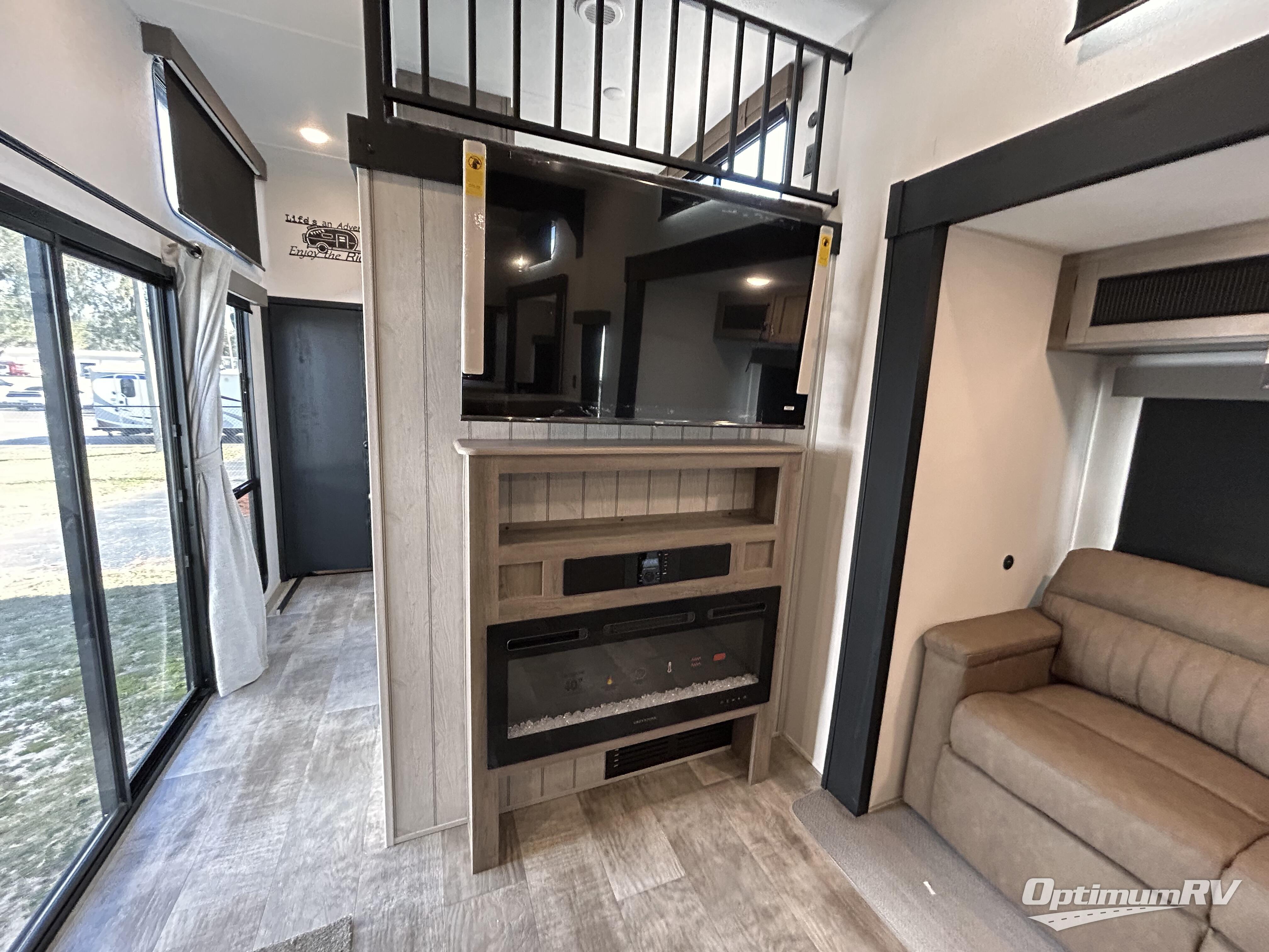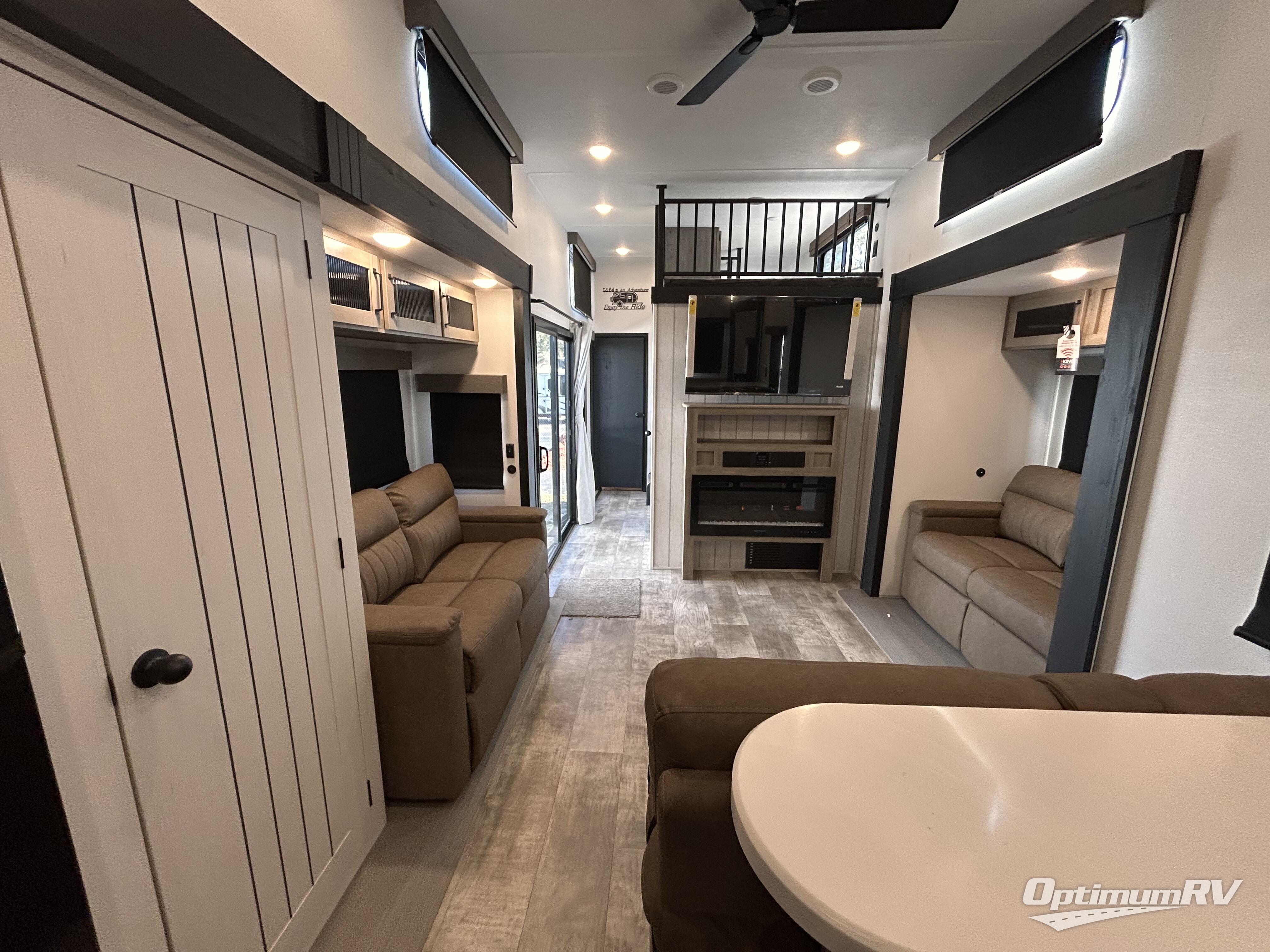 This is the perfect destination trailer for a larger group since it can sleep up to nine campers each night. The little ones will love the double loft areas with three bunk mats and storage space for their things, while you take the rear private bedroom. There is a king bed slide out here, along with a wardrobe/closet for your clothes, plus a second closet with the option to add washer and dryer prep. Everyone can meet in the middle living room to relax on the dual sofas or recliners across from the fireplace and entertainment center. Head to the front of the unit where you'll find the kitchen that includes ample counter space to prep meals, a residential style refrigerator and pantry for food storage, and a free-standing table to dine at. There is also a breakfast nook that overlooks the living area so you can visit with the cook and watch a movie at the same time!