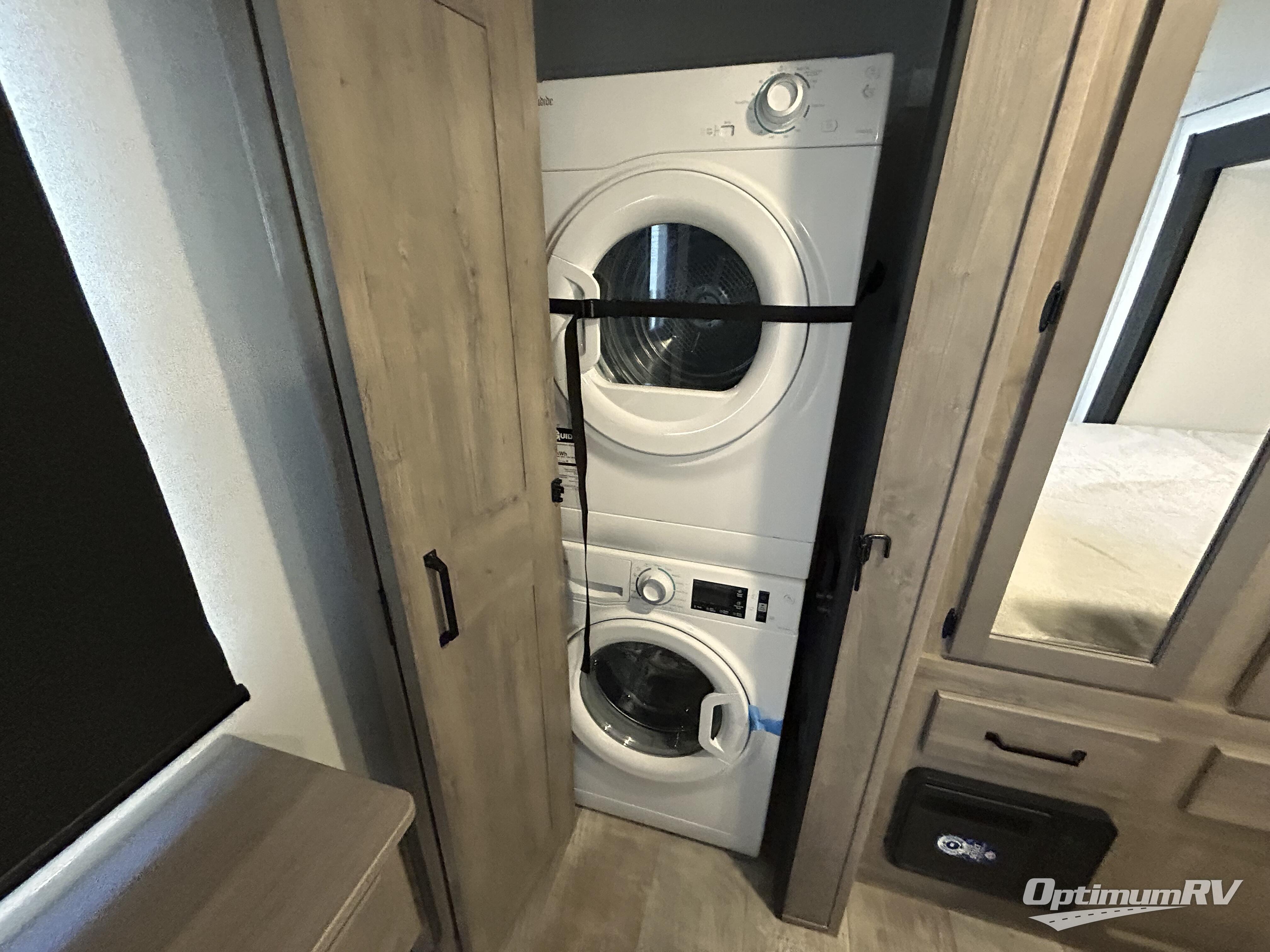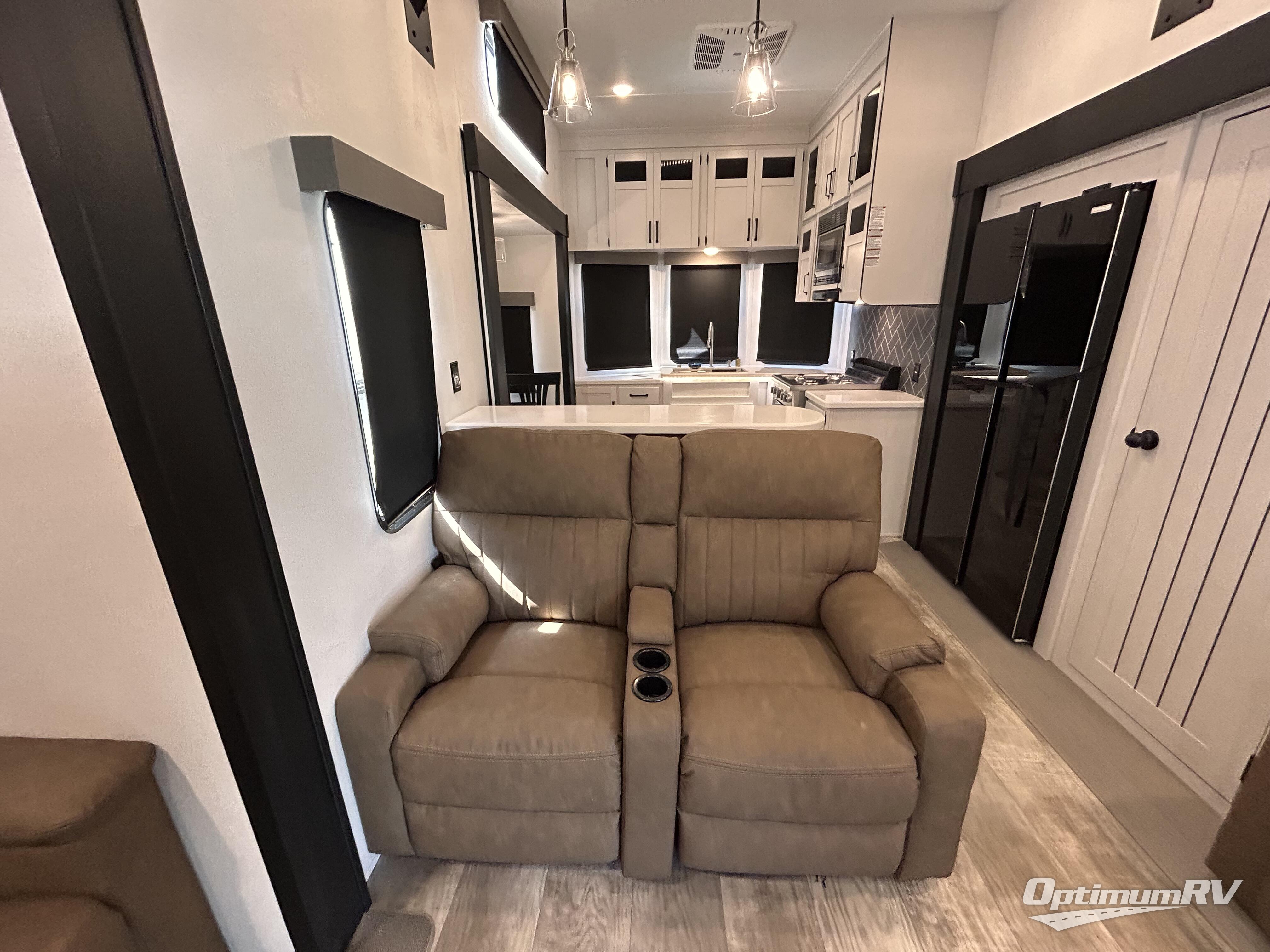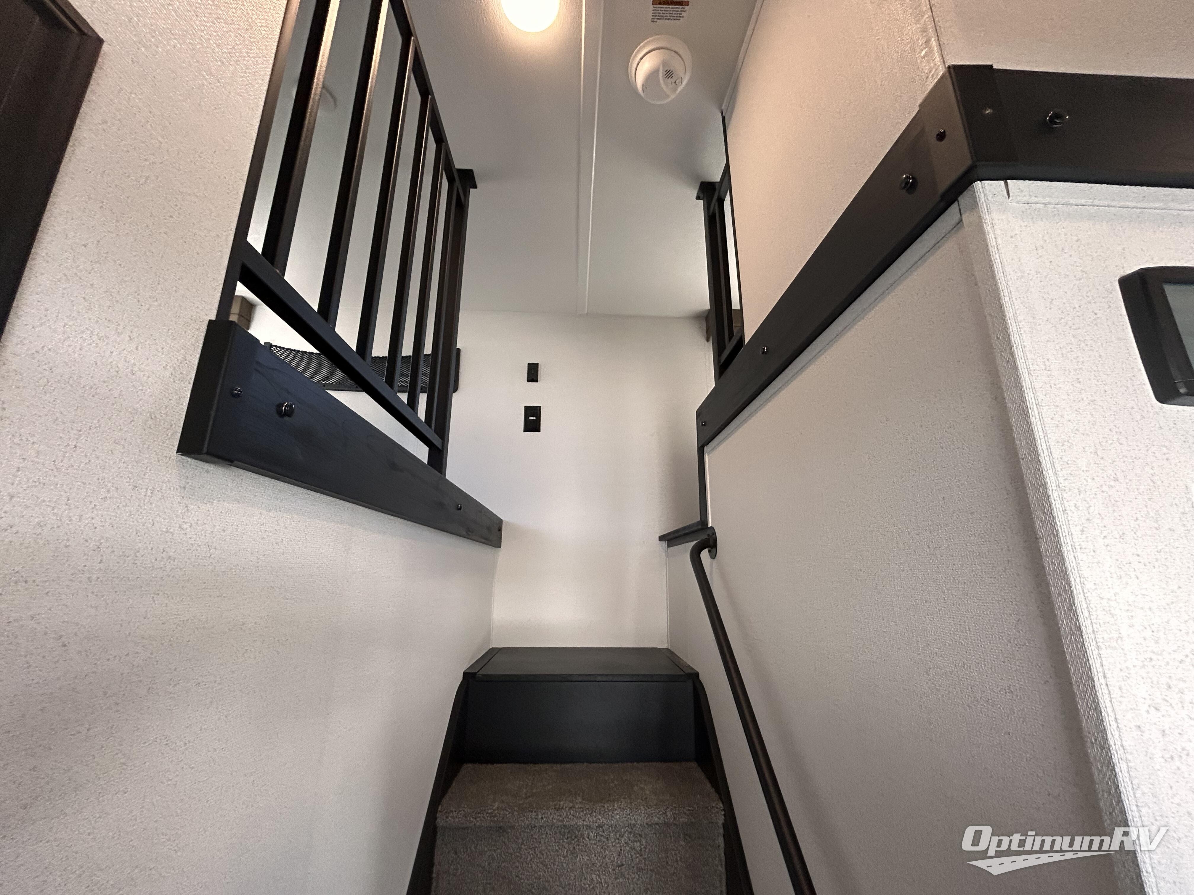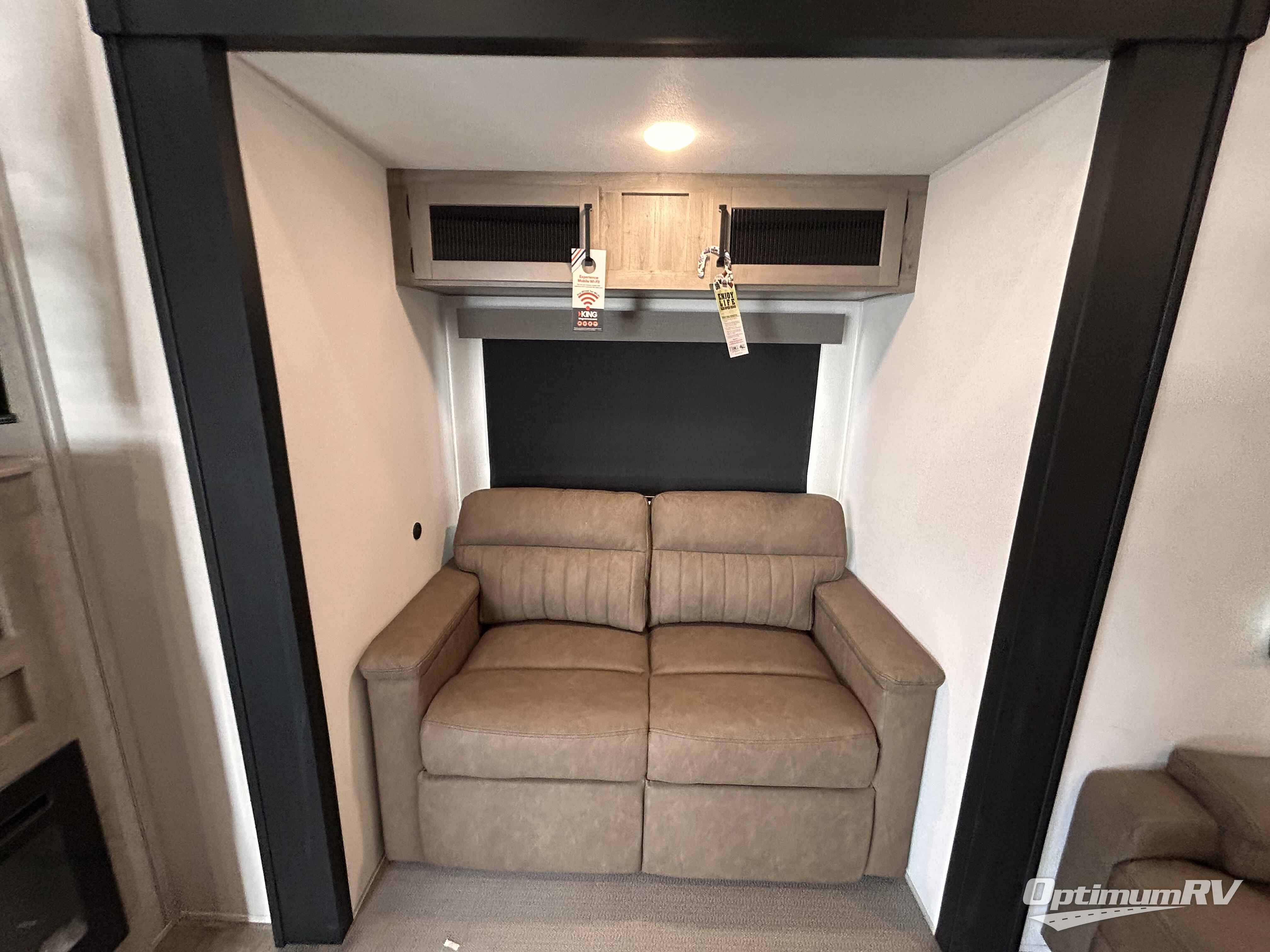 This is the perfect destination trailer for a larger group since it can sleep up to nine campers each night. The little ones will love the double loft areas with three bunk mats and storage space for their things, while you take the rear private bedroom. There is a king bed slide out here, along with a wardrobe/closet for your clothes, plus a second closet with the option to add washer and dryer prep. Everyone can meet in the middle living room to relax on the dual sofas or recliners across from the fireplace and entertainment center. Head to the front of the unit where you'll find the kitchen that includes ample counter space to prep meals, a residential style refrigerator and pantry for food storage, and a free-standing table to dine at. There is also a breakfast nook that overlooks the living area so you can visit with the cook and watch a movie at the same time!