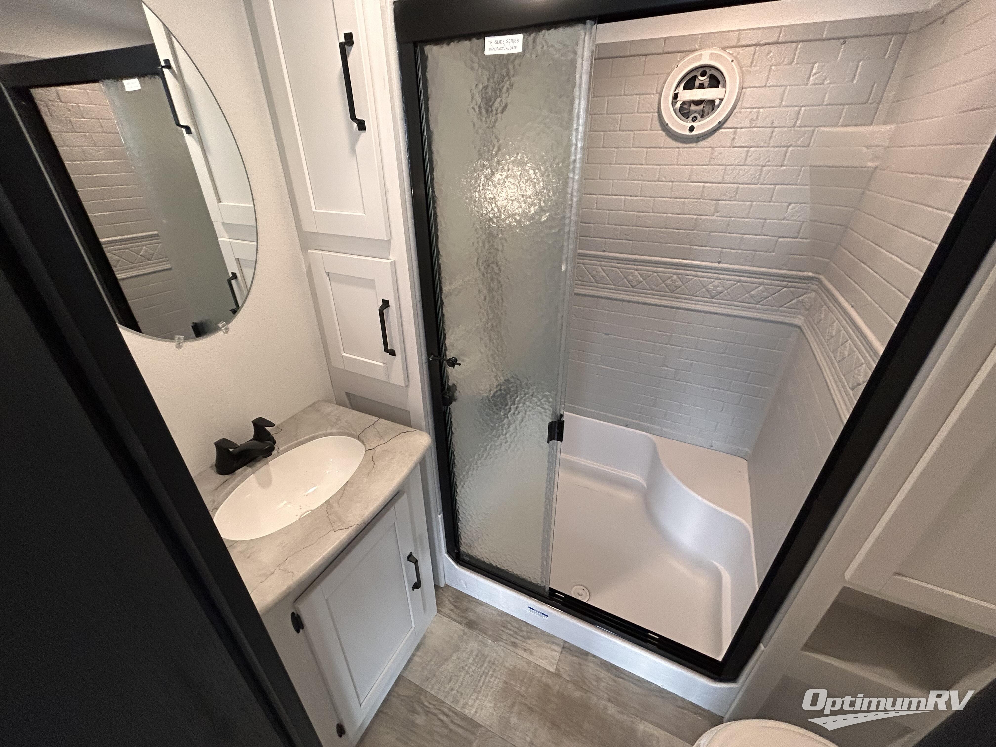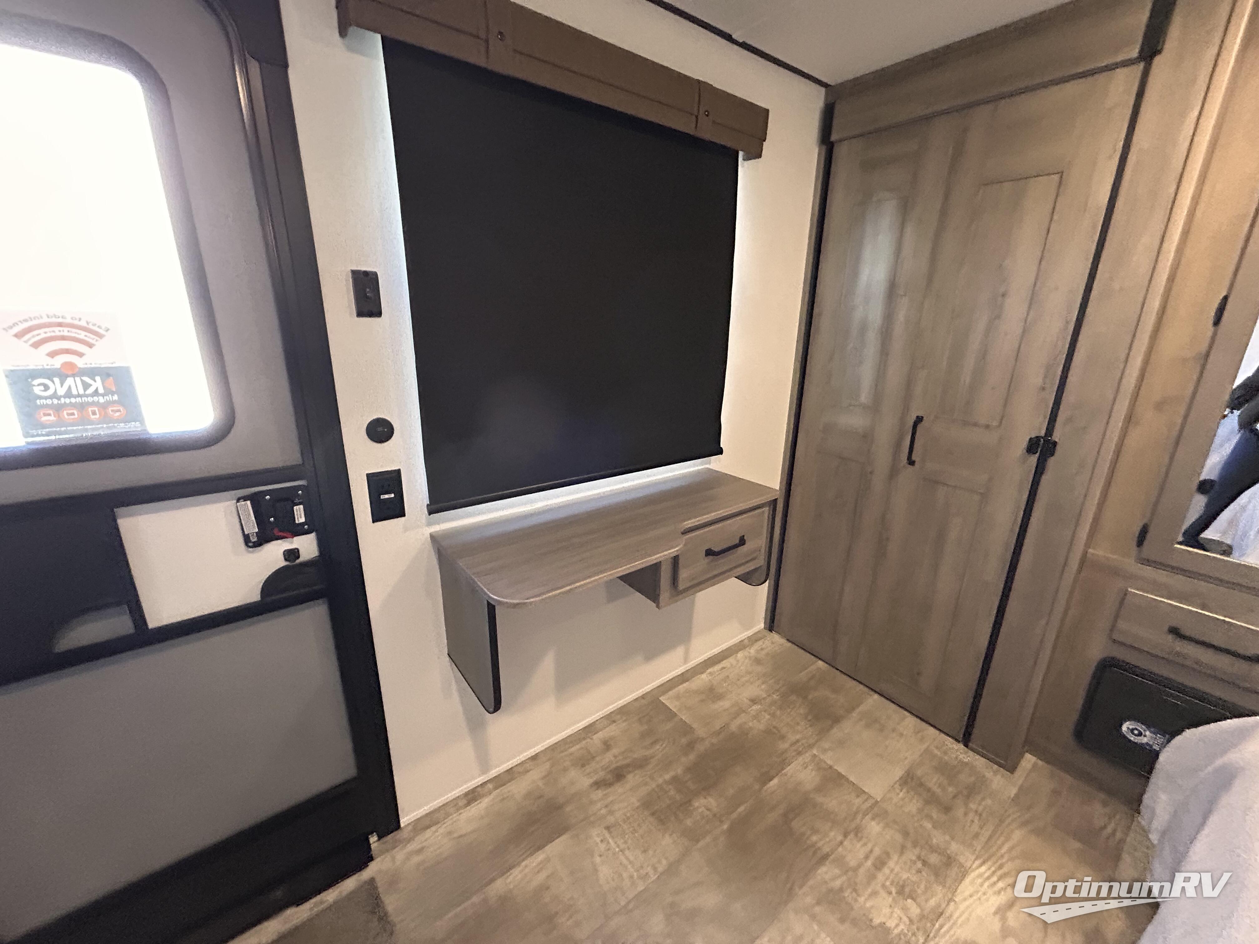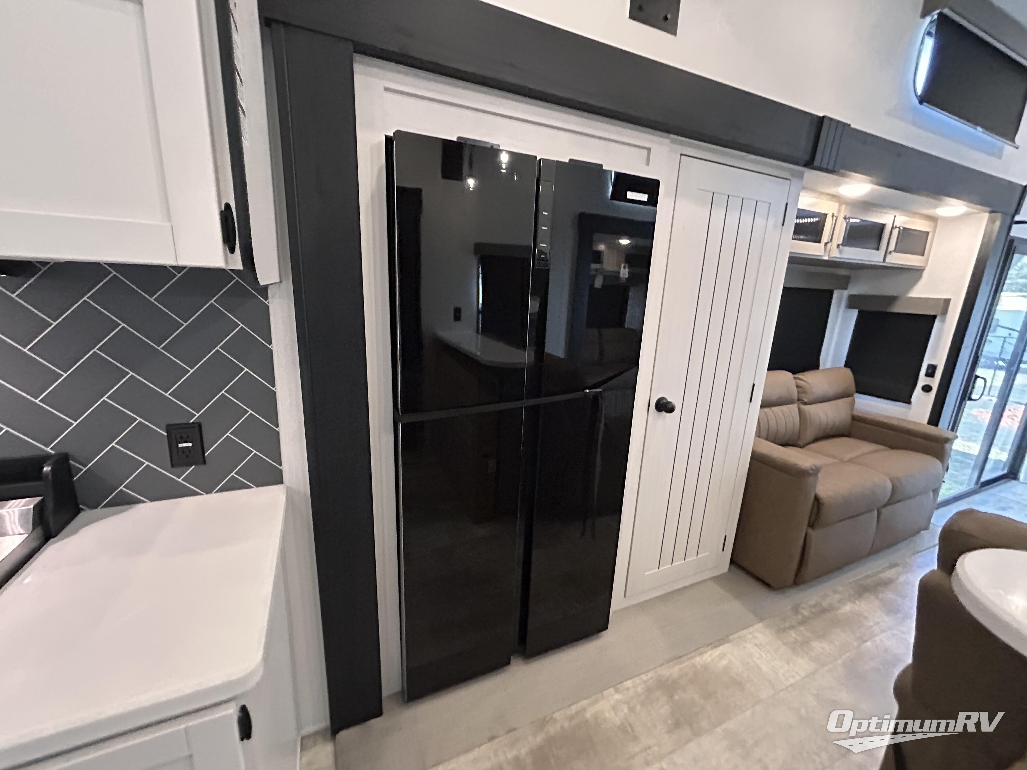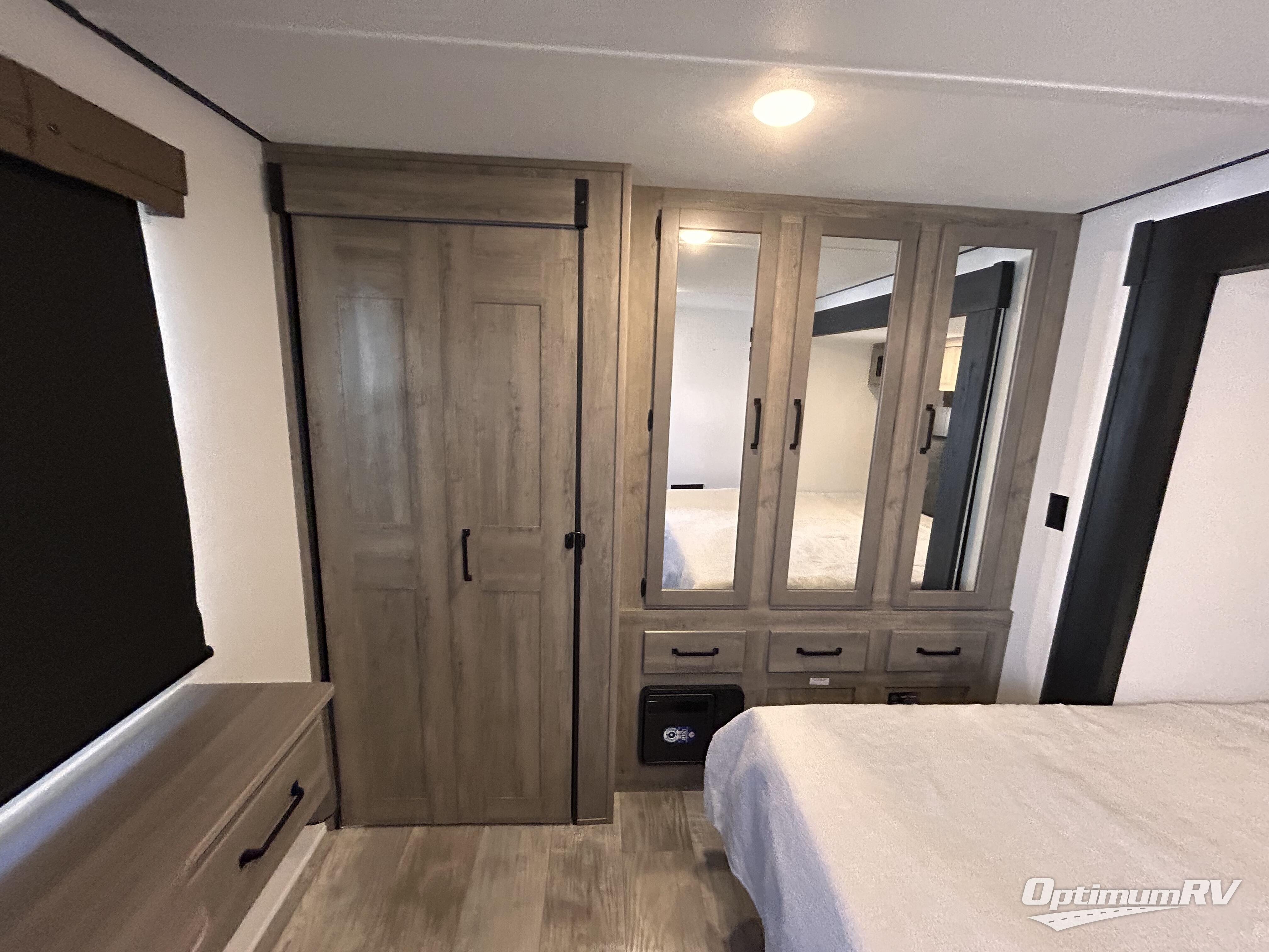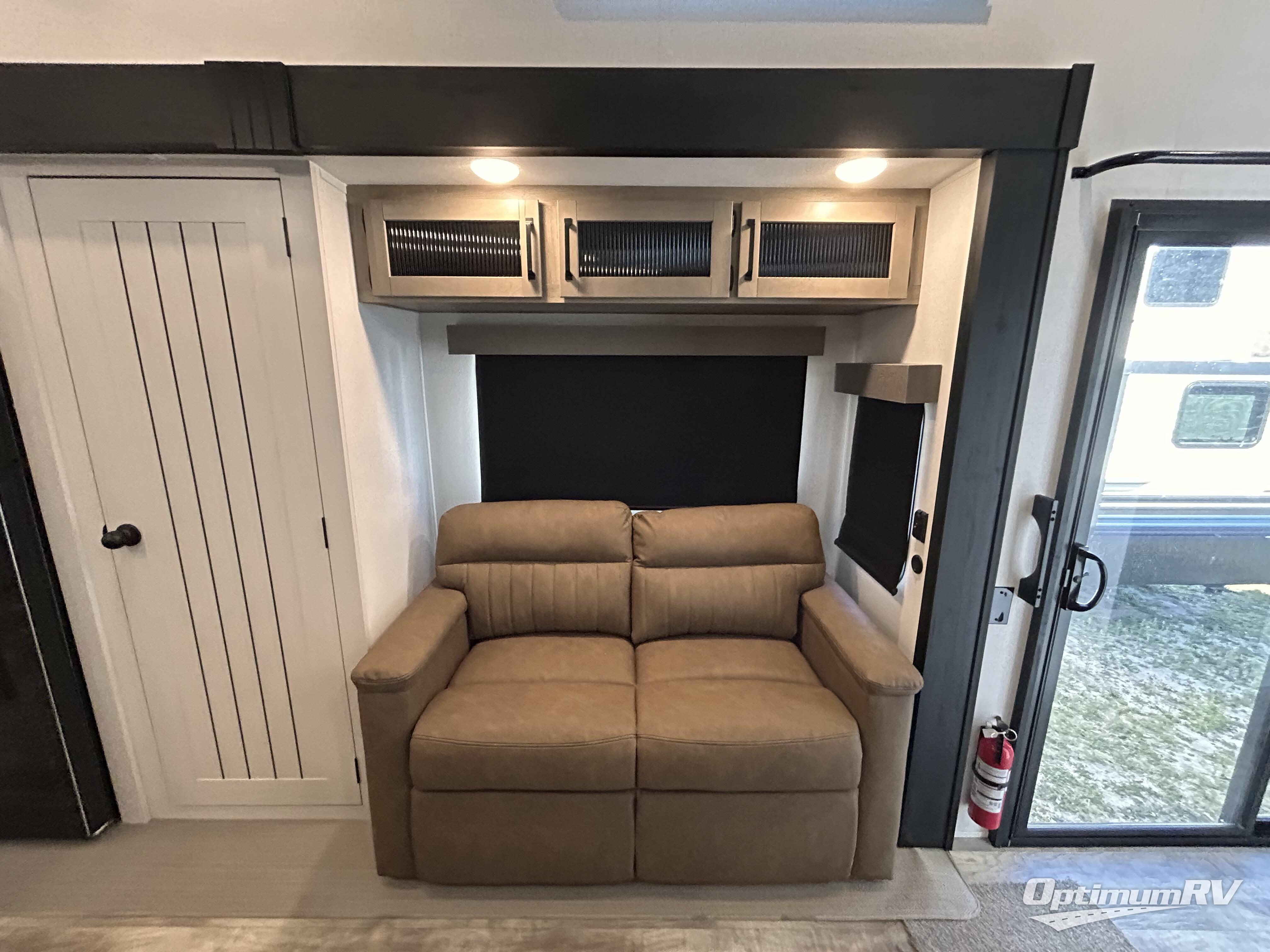 This is the perfect destination trailer for a larger group since it can sleep up to nine campers each night. The little ones will love the double loft areas with three bunk mats and storage space for their things, while you take the rear private bedroom. There is a king bed slide out here, along with a wardrobe/closet for your clothes, plus a second closet with the option to add washer and dryer prep. Everyone can meet in the middle living room to relax on the dual sofas or recliners across from the fireplace and entertainment center. Head to the front of the unit where you'll find the kitchen that includes ample counter space to prep meals, a residential style refrigerator and pantry for food storage, and a free-standing table to dine at. There is also a breakfast nook that overlooks the living area so you can visit with the cook and watch a movie at the same time!
