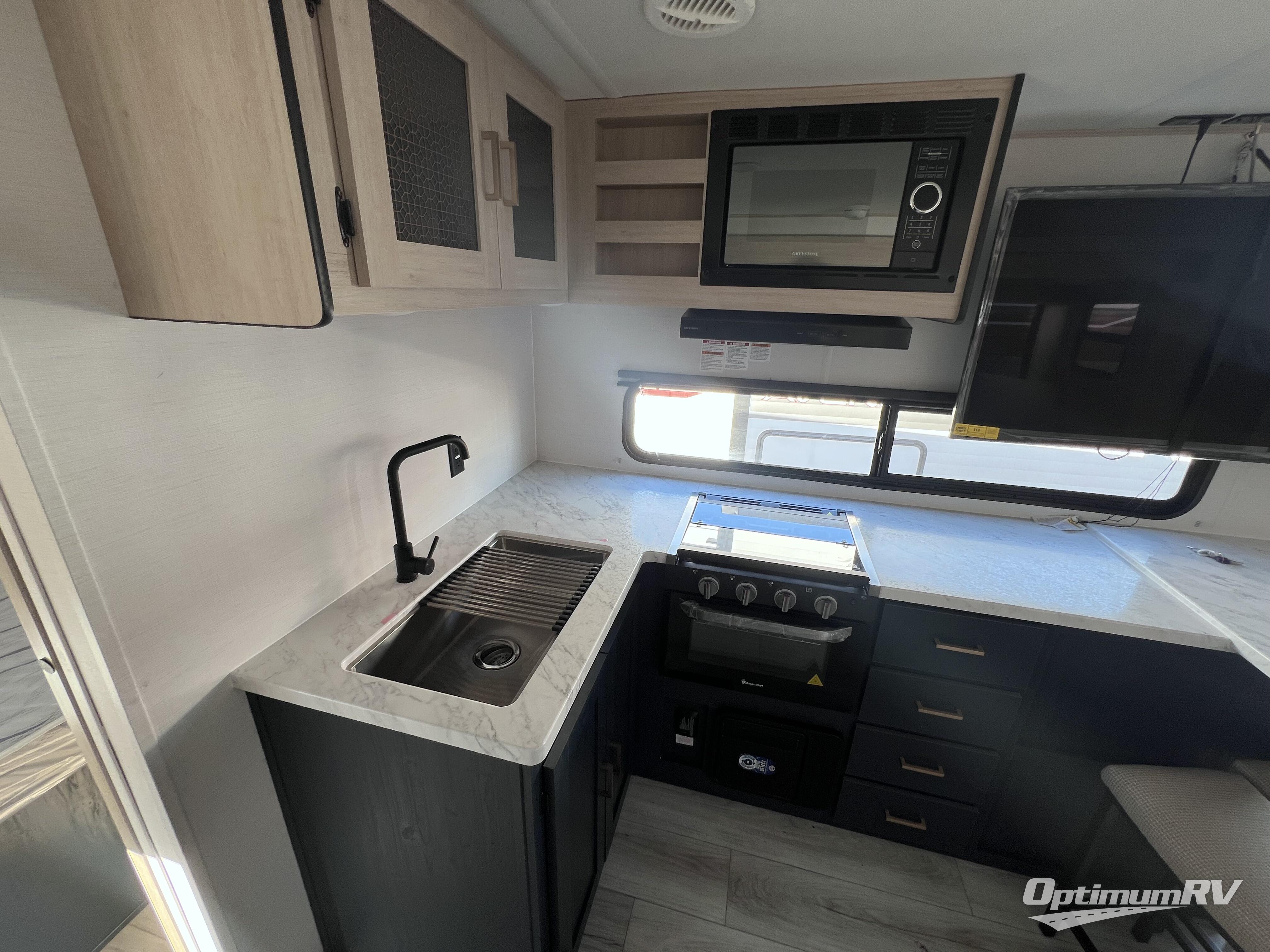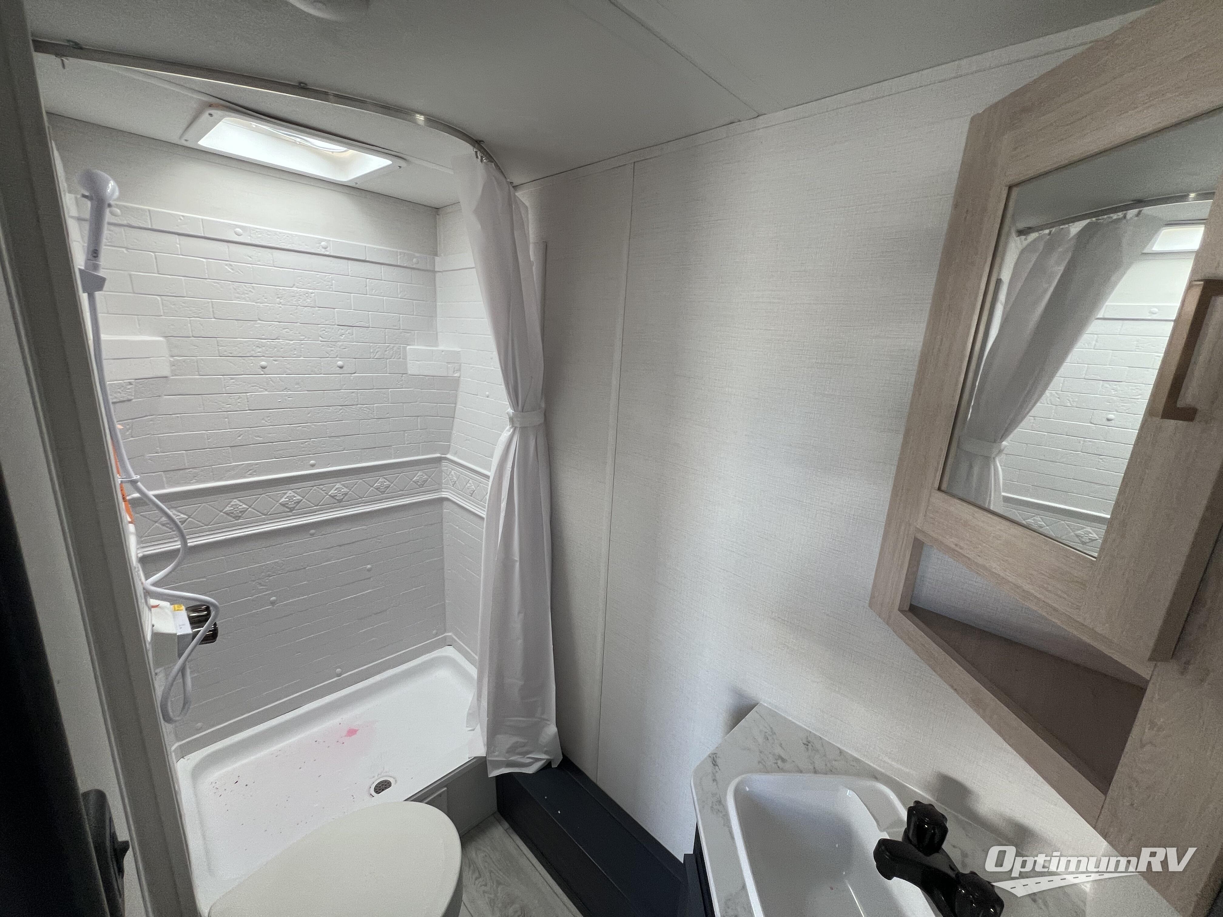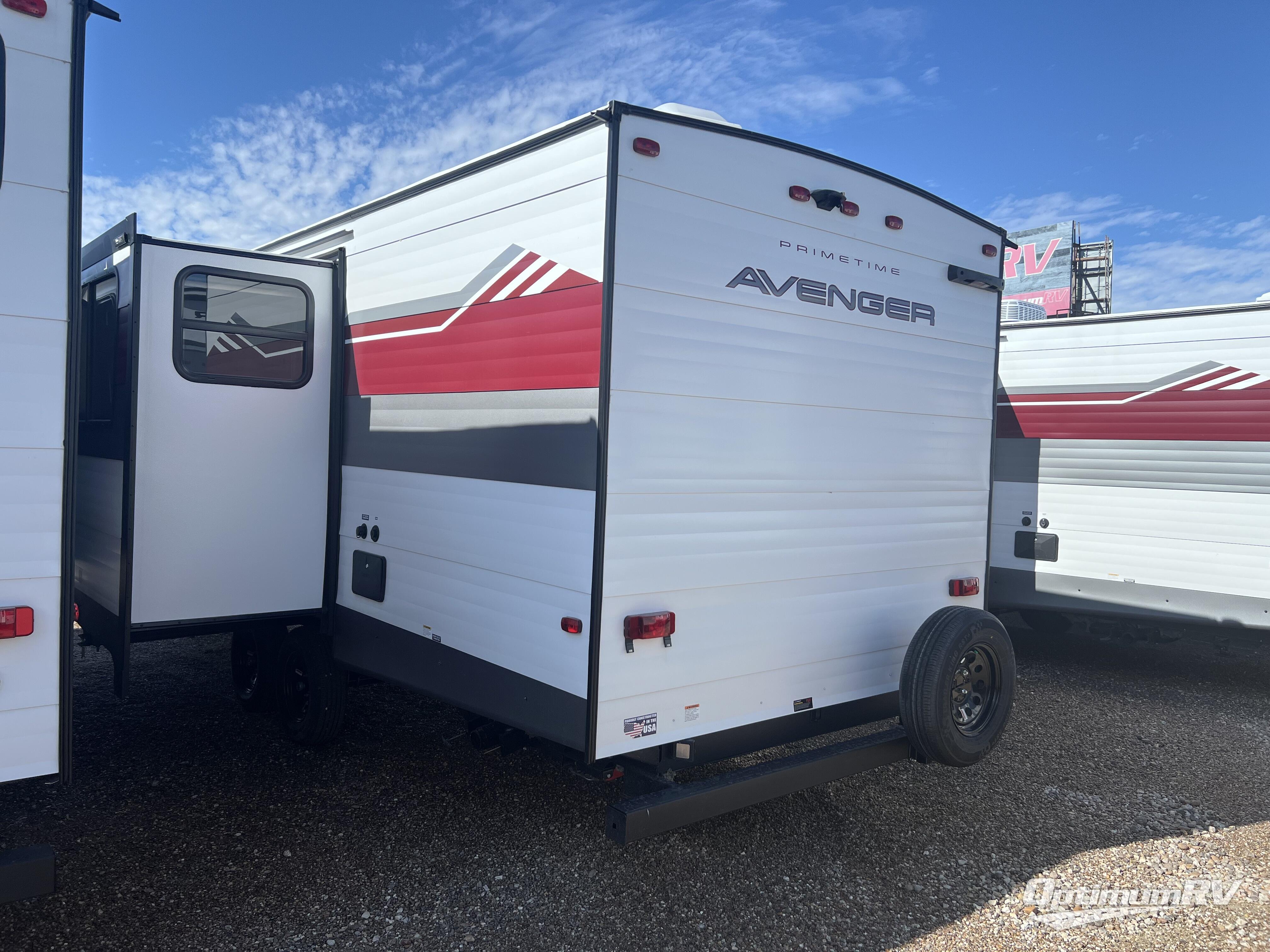 With any Avenger travel trailer by Prime Time, the exterior includes an aerodynamic smooth front metal, a diamond plate front rock guard for protection on the road, and four stabilizer jacks to keep your unit secure. There is a fully walkable roof plus an enclosed and heated underbelly that will help extend your camping season. The interior offers a 15,000 BTU air conditioner for the perfect climate inside, in-floor ducted heat, a systems monitor panel, and a Winegard 360+ antenna with Wi-Fi prep that will give you the option to stay connected as you camp. Each model also includes seamless Carefree Congoleum flooring, kitchen backsplash, shower pans in all models, and pleated nightshades throughout to name a few interior comforts!
