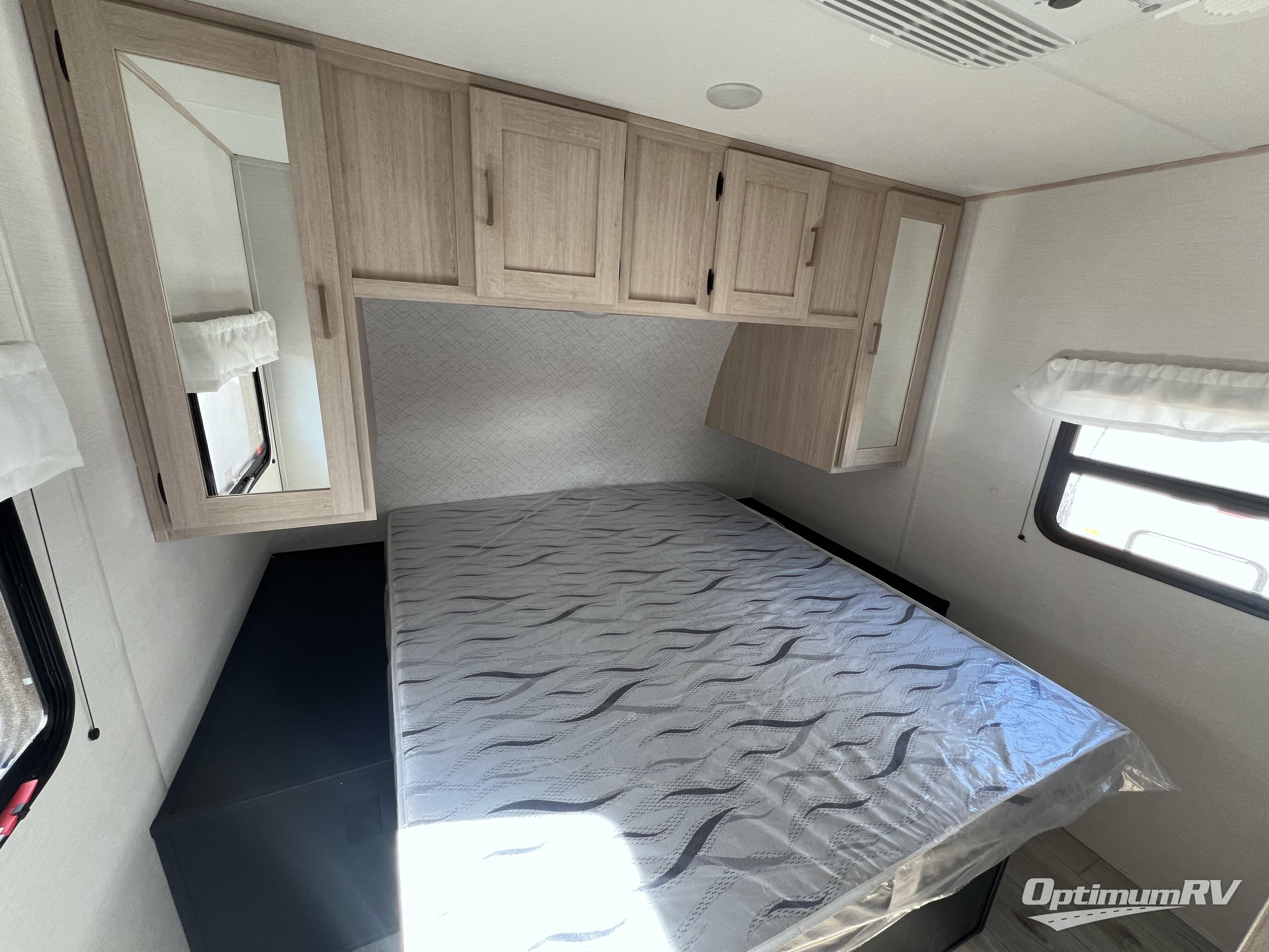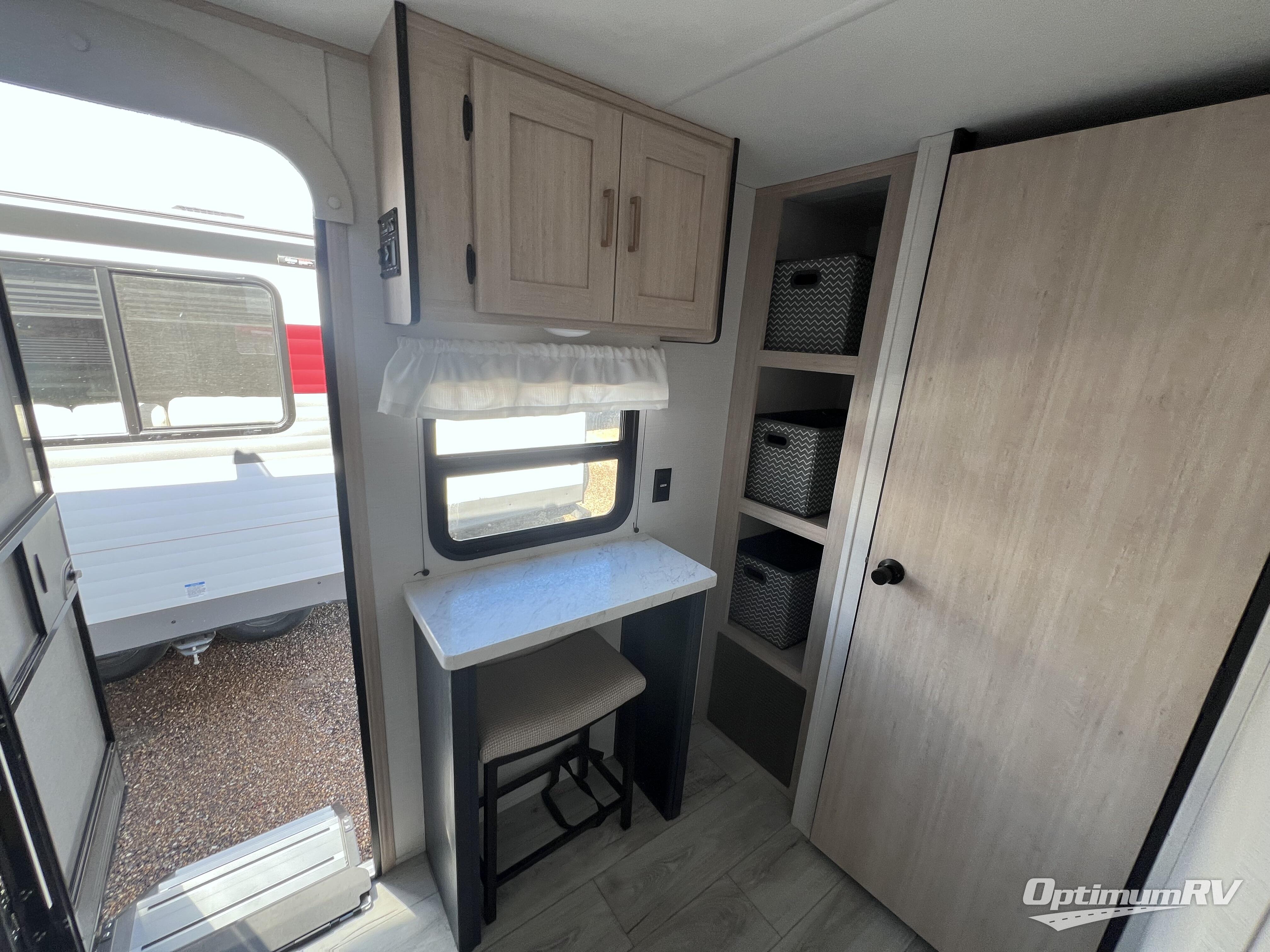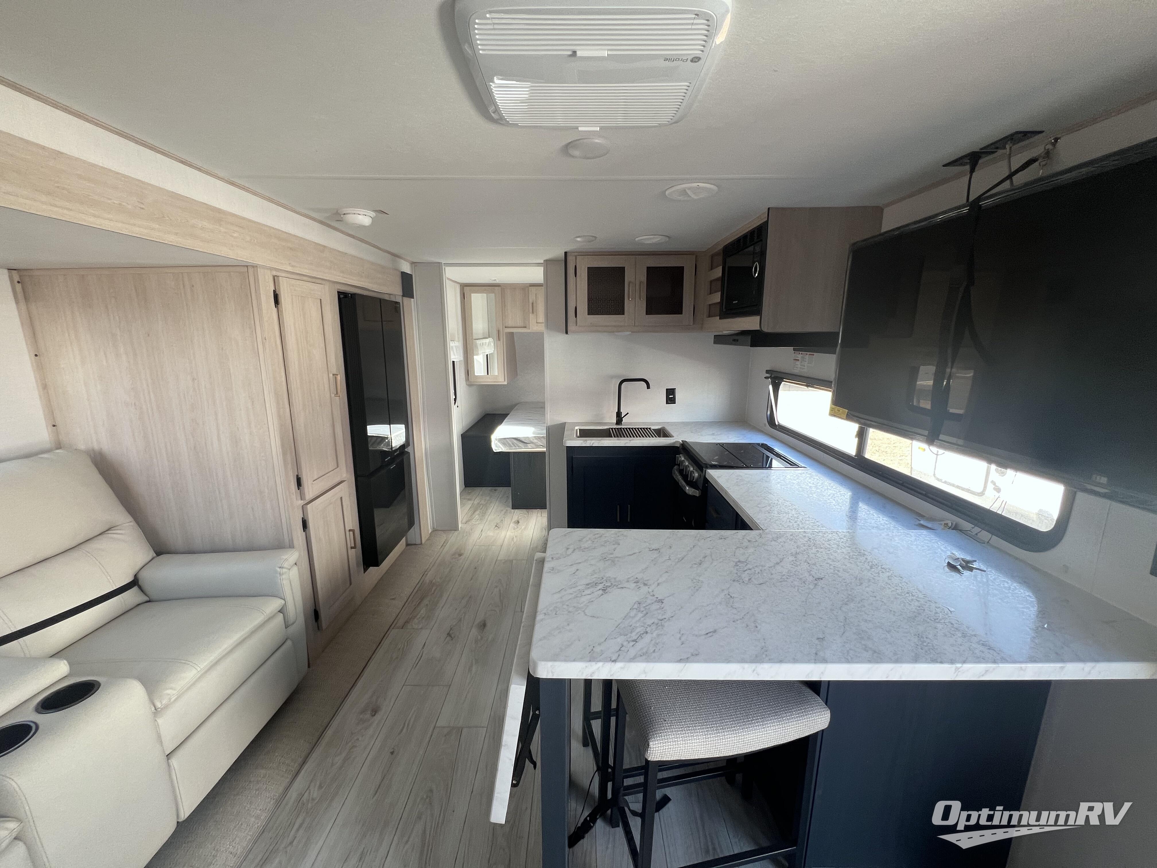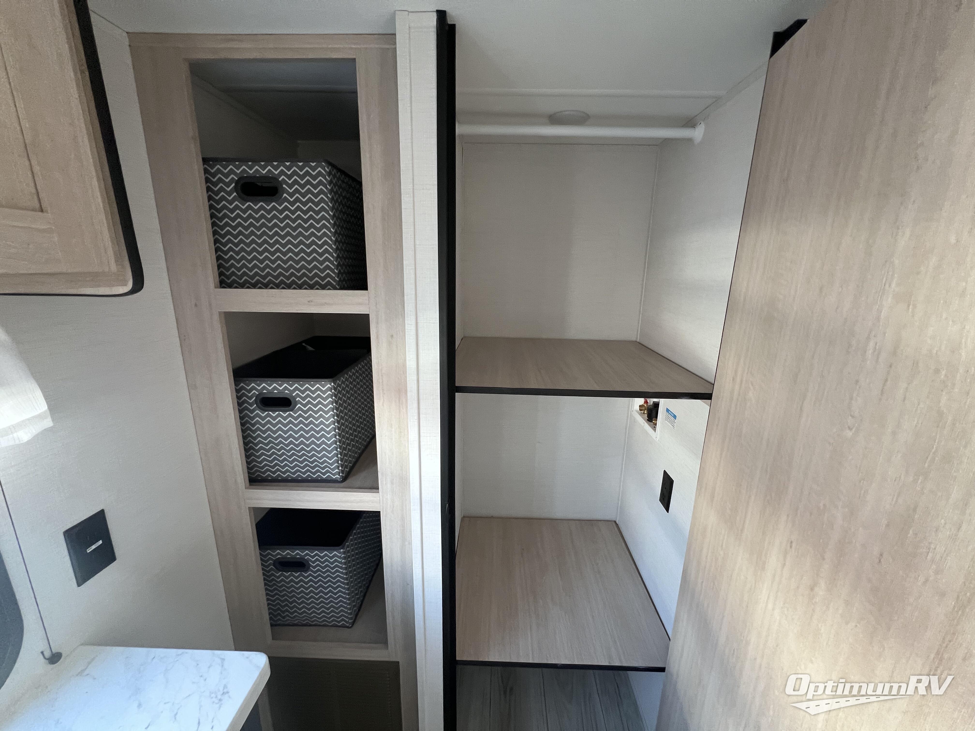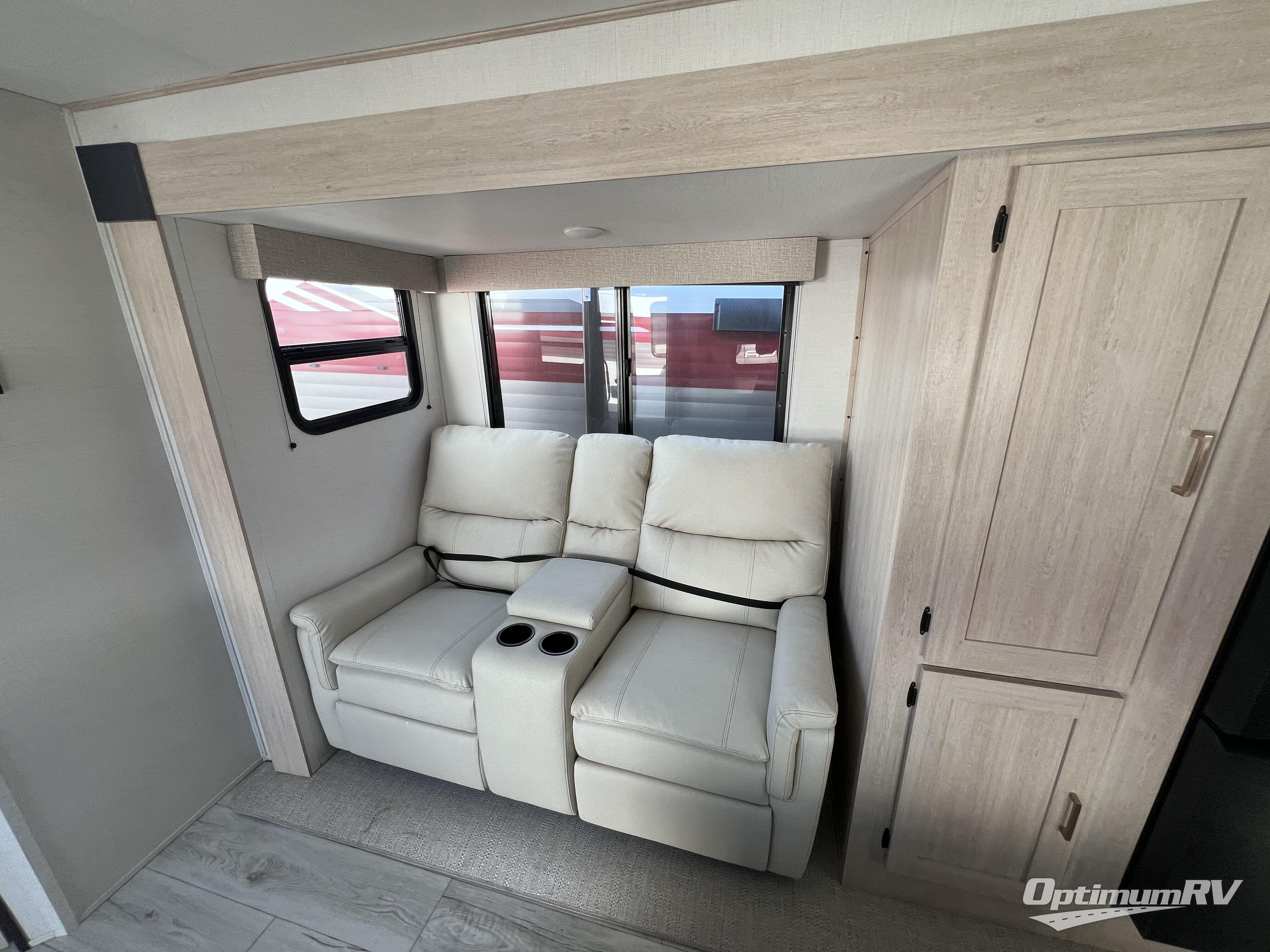 Head to your local state park in this spacious travel trailer! Once you arrive at the campground, you can grab a cold drink from the exterior refrigerator, then head inside to make lunch. An L-shaped counter with two chairs provides a place to enjoy your morning coffee at, or you may find yourselves on the theater seat within the large slide out. The French door refrigerator and pantry is also found here and can hold all your food for the week. You'll feel right at home in the front private bedroom that includes a queen bed, dual wardrobes, and an overhead cabinet for even more storage. This model also includes washer and dryer prep if you choose to add those appliances!