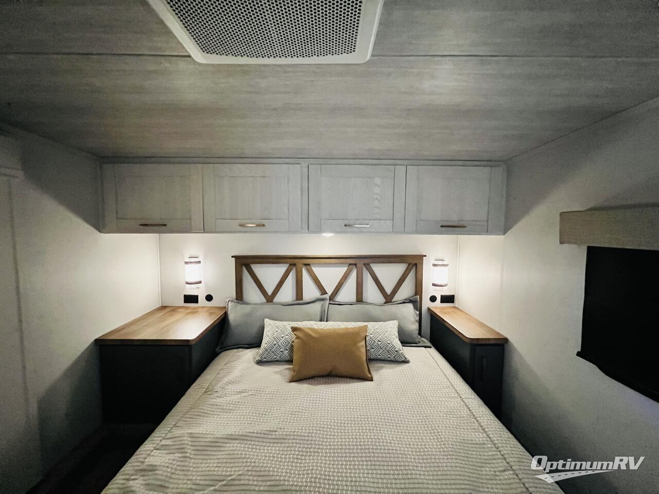 A rear private bunkhouse for your guests and a front private bedroom for you; it's the perfect fifth wheel to camp with a larger group! Four campers can sleep on the double-size bunks, and there is overhead storage plus a desk with drawers below if you need to get some work done. You'll find your own storage in the front private bedroom within the wardrobe slide, plus there are dual nightstands to keep your book, phone, and glasses nearby. Everyone can meet in the combined kitchen and living area in the morning as the cook makes breakfast on the three burner cooktop. You'll find seating spaces on the theater seating or the booth dinette that can be optioned out for a free-standing table with four chairs. Some other stand-out features this model includes are the coat hooks and storage cubbies, the hidden pantry behind the entertainment center, and the outside kitchen!