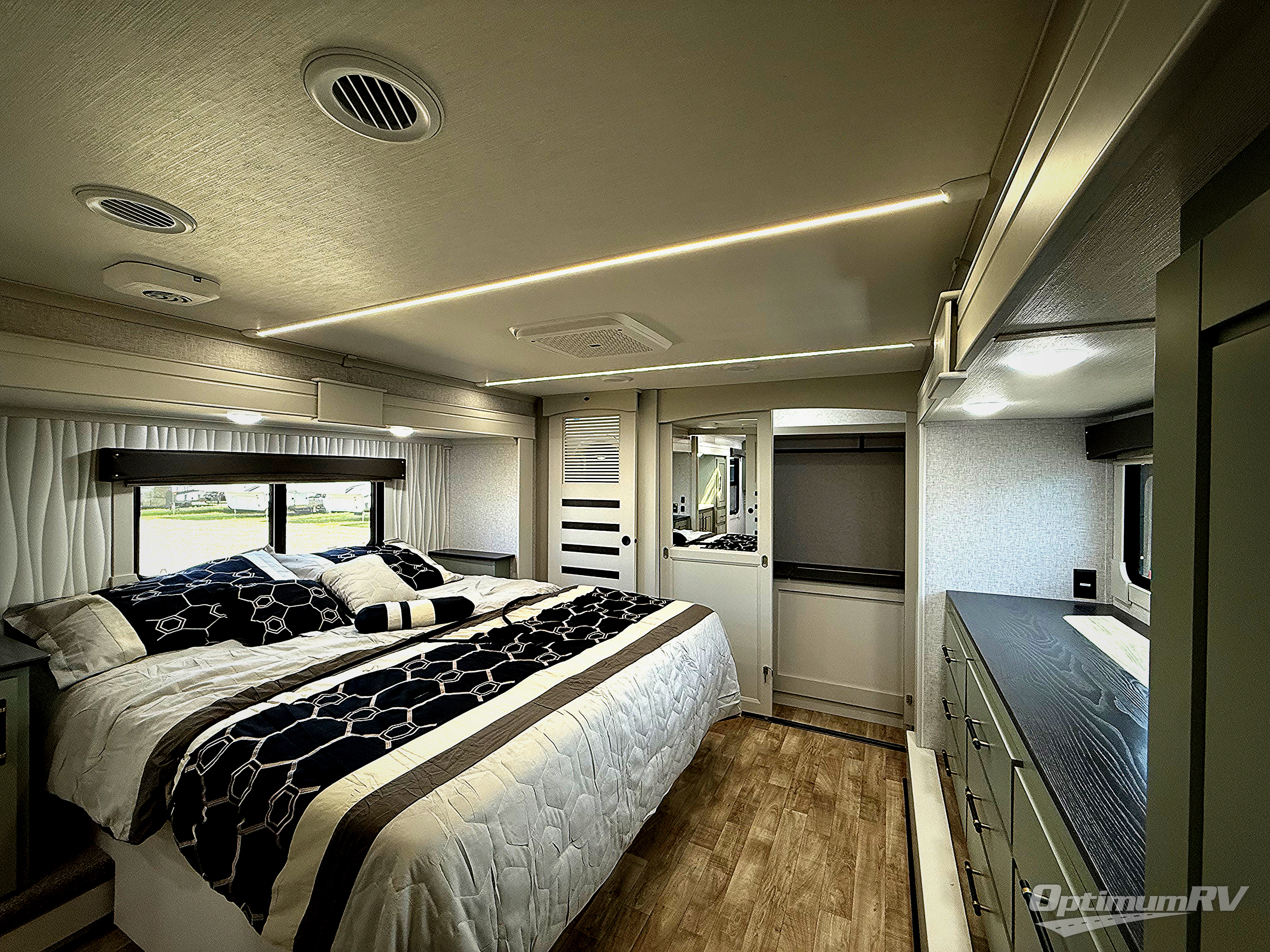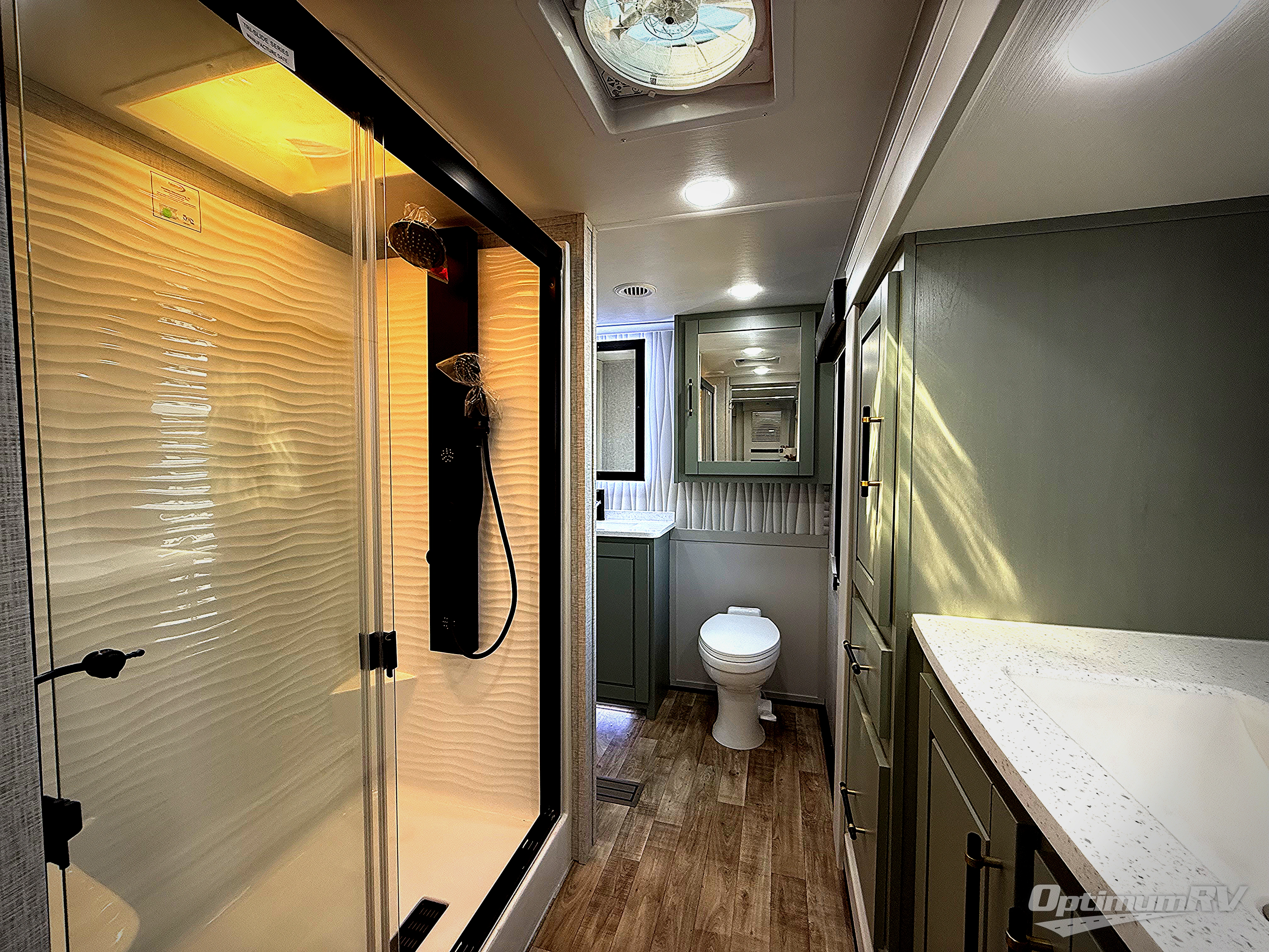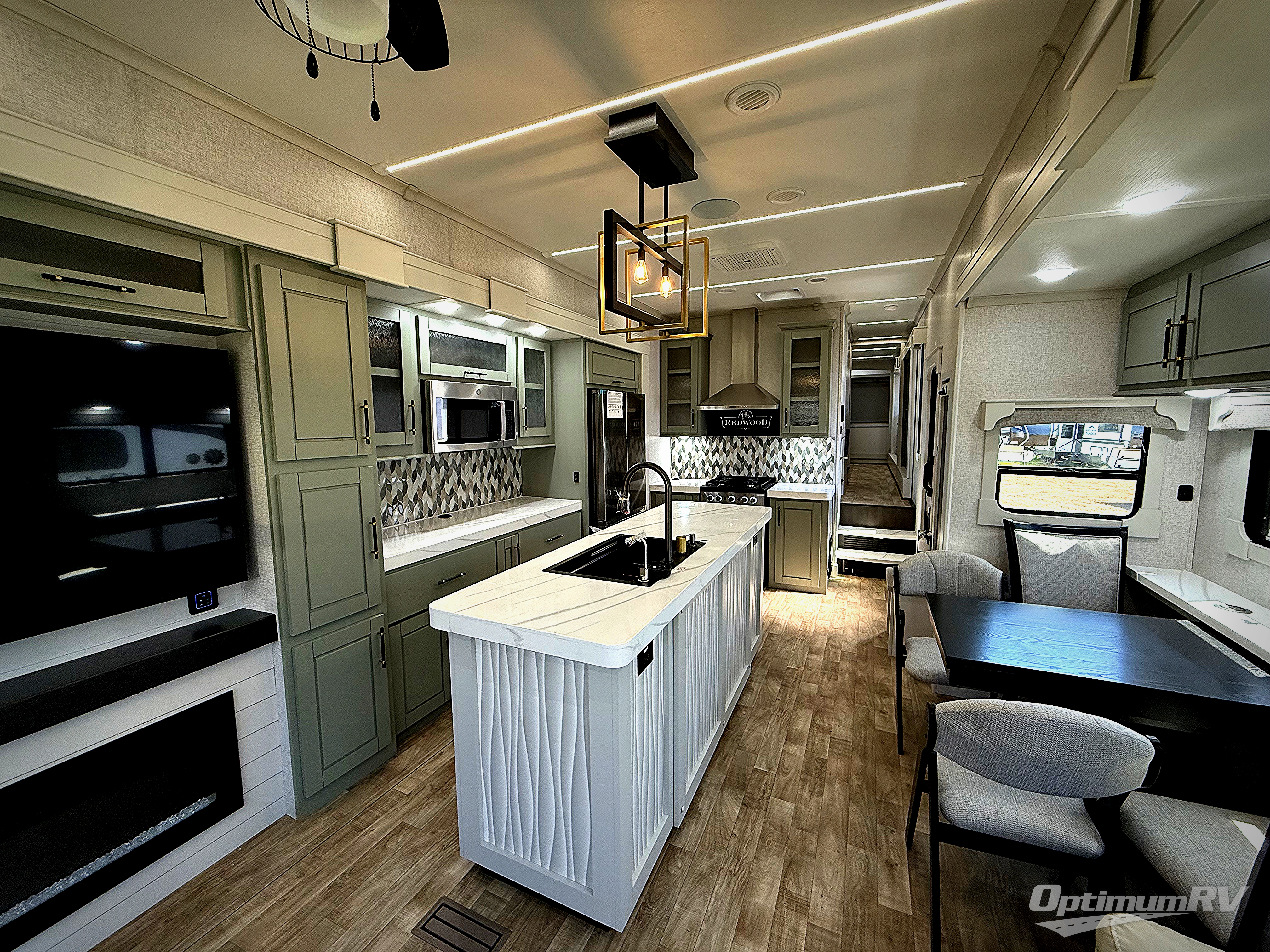 Live large in this Redwood RV quad slide fifth wheel featuring a combined kitchen and living area with dual opposing slides for maximum space in this area alone. There is plenty of seating with an 80" tri-fold sofa along the rear wall, and 68" theater seats plus a dining table with two chairs within the curbside slide. You can easily entertain guests in this space and the center island with sink, and the dishwasher prep gives you the option to make cleaning easier. You will love the entertainment center with 65" TV opposite the theater seats for movie night, and when it's time to turn in, a spacious master bedroom with dual opposing slides as well. This space offer a king bed, ample storage, and a dual entry bath with 48" shower including a seat with a slide out linen cabinet and vanity sink which is all part of the bed slide.