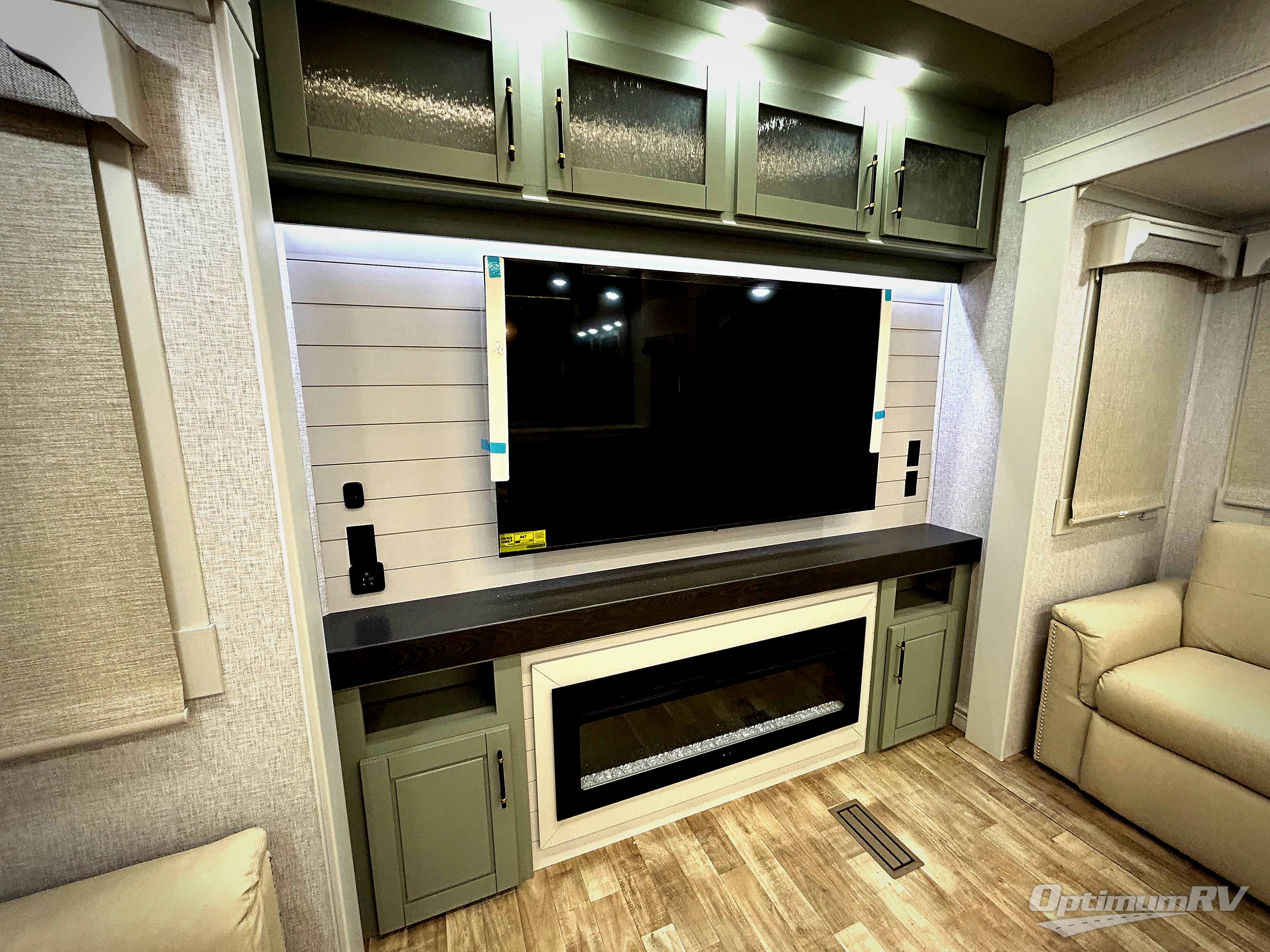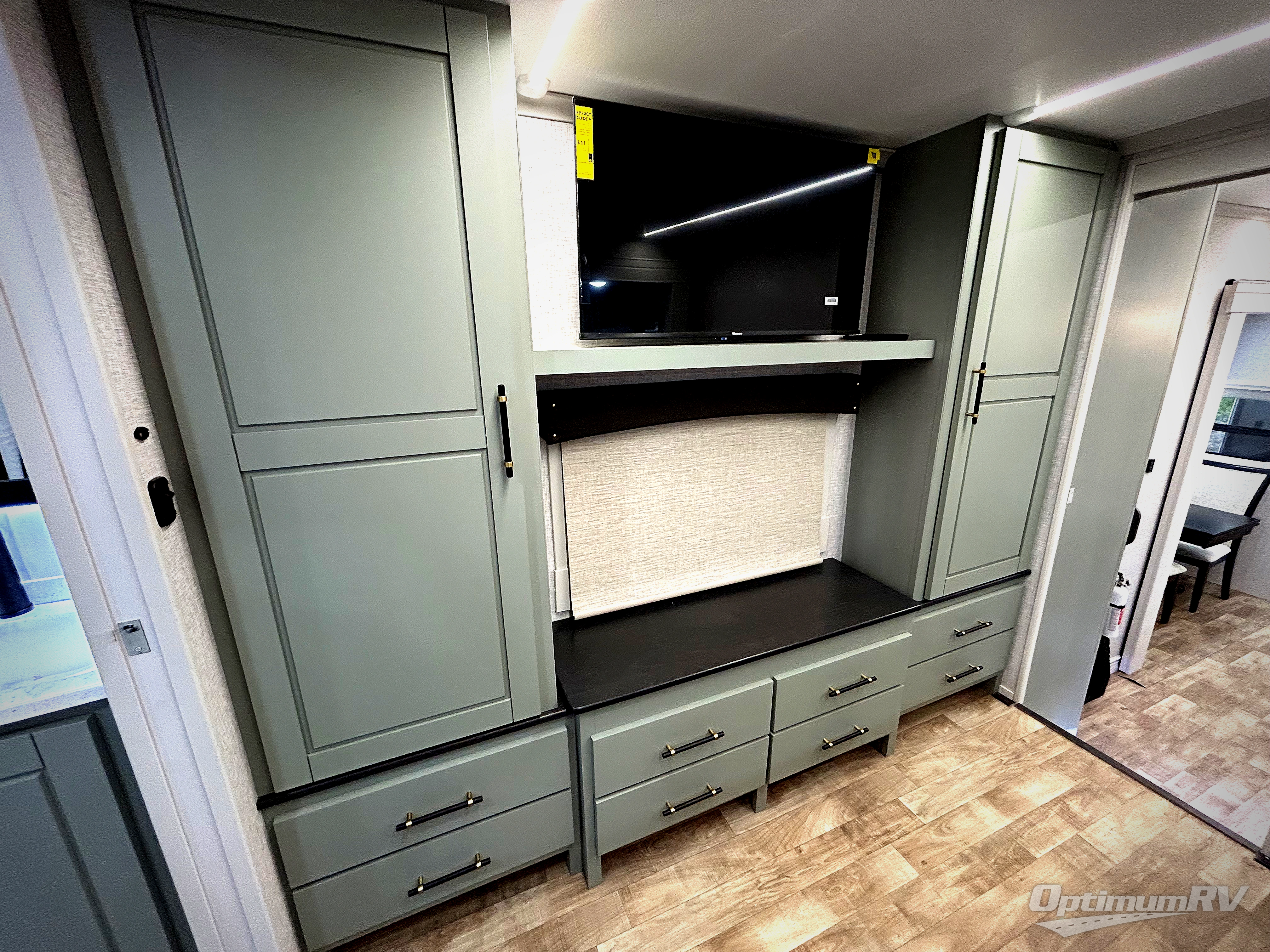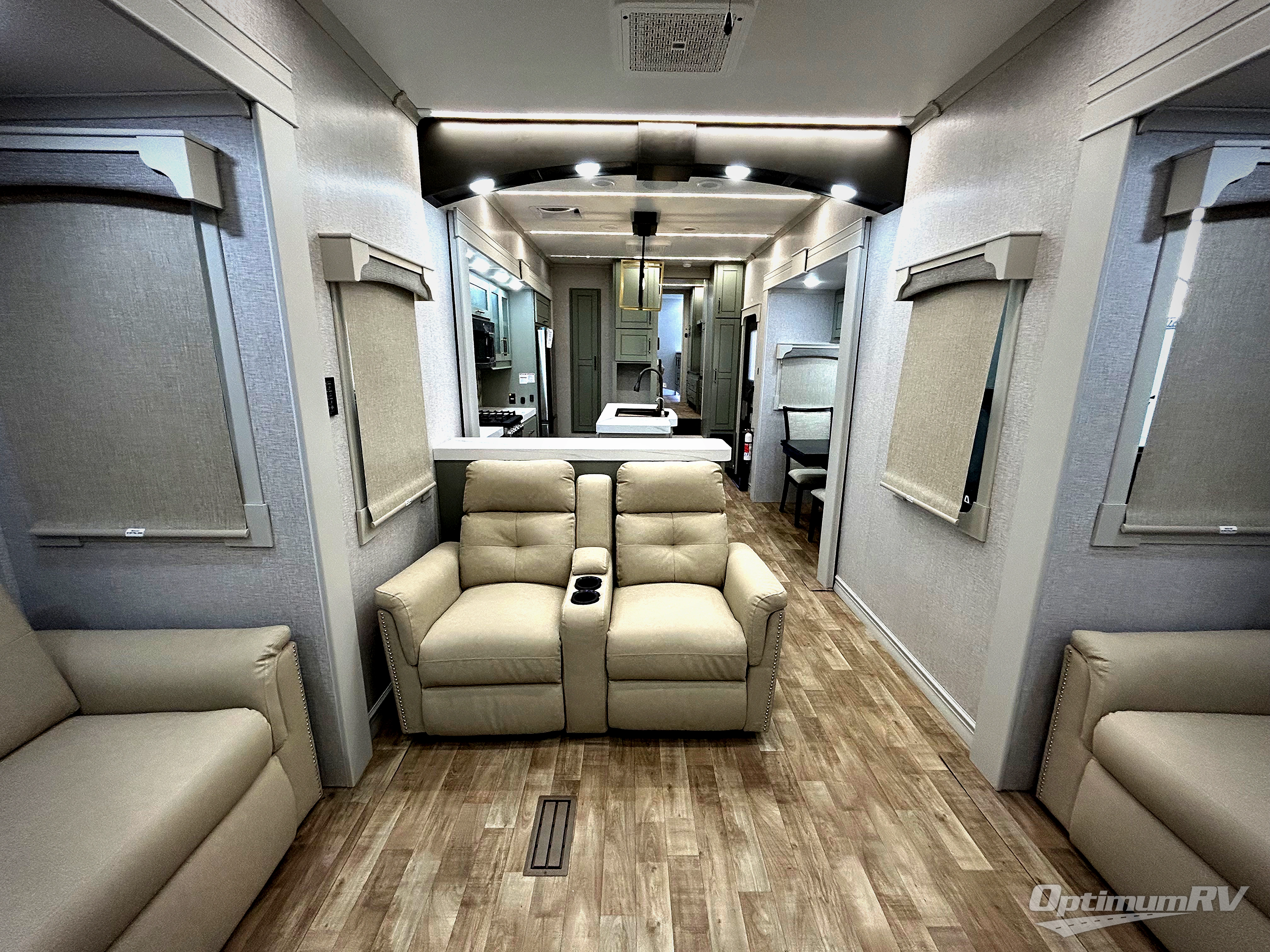 This Redwood fifth wheel is going to make you say wow! The rear living room is fully impressive with its 72" tri-fold sofa slides that are across from one another, its 60" theater sofa, its entertainment center with 65" TV, and its ceiling fan. All in all, it will feel like you're lounging back at home. The kitchen is also completely decked out with opposing slides, a pull-out waste basket at the large island, two buffets, a pantry, and a message center, and just a few steps away from the kitchen is where you will find the luxurious master suite. This space has a full bathroom up at the front where you will find a huge walk-in closet, and within the bedroom, the king bed slide rests across from the 39" TV so that you can watch a movie in comfort.
