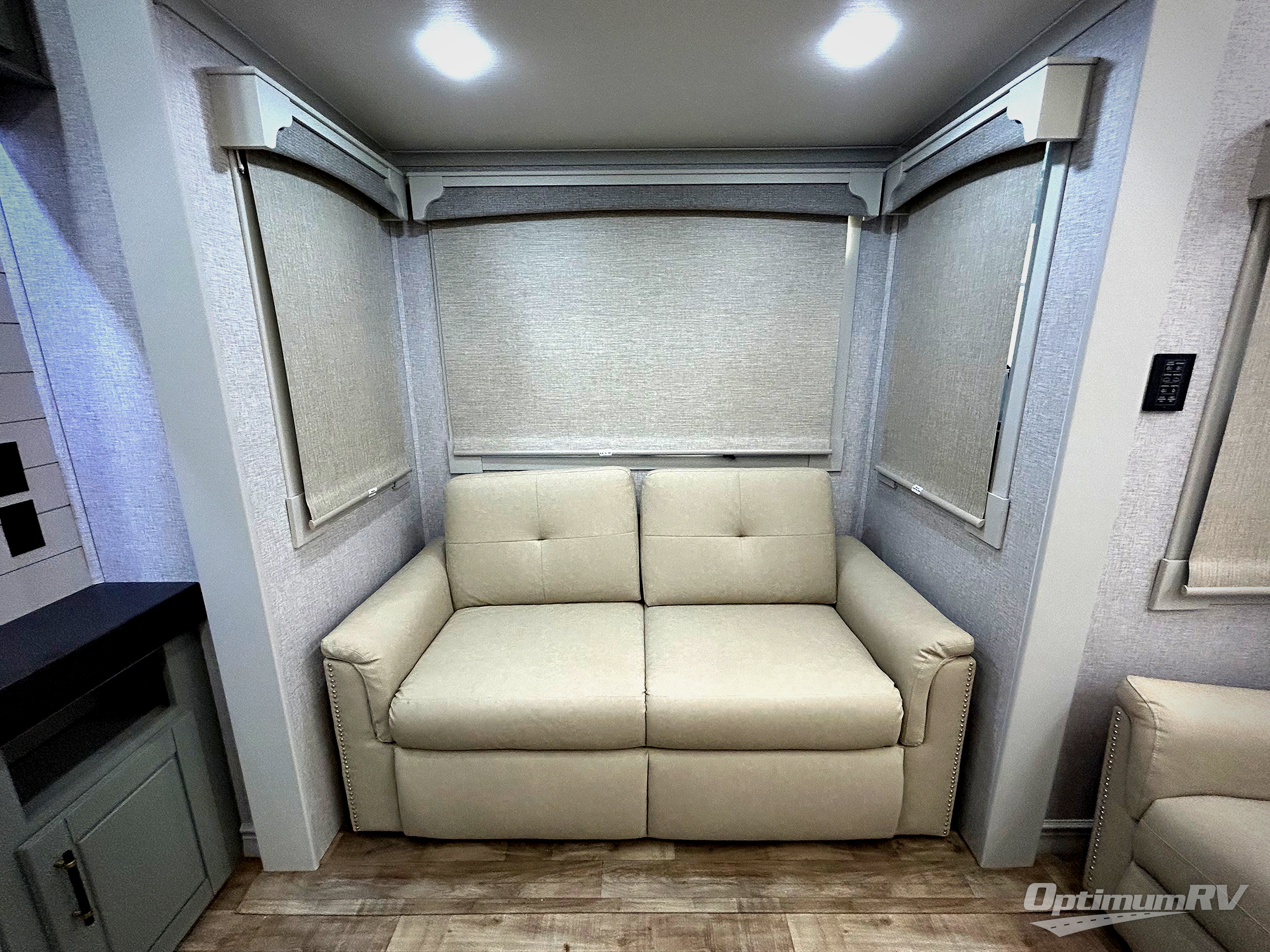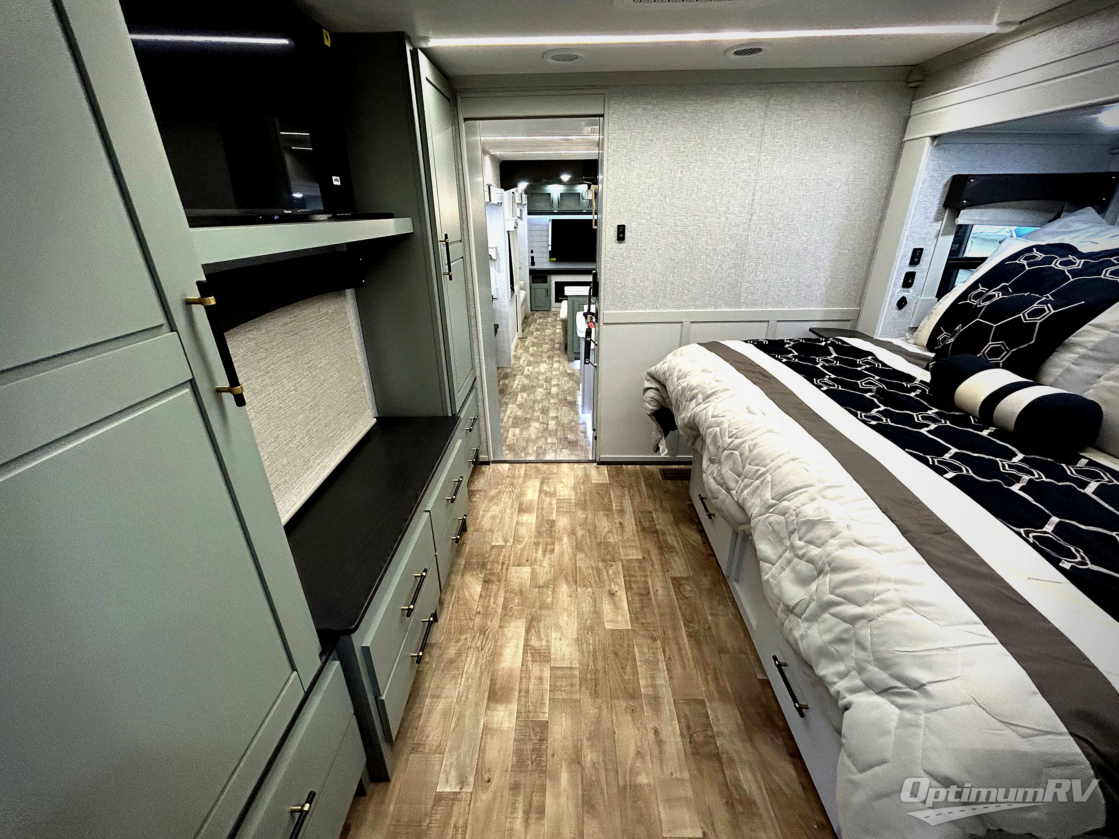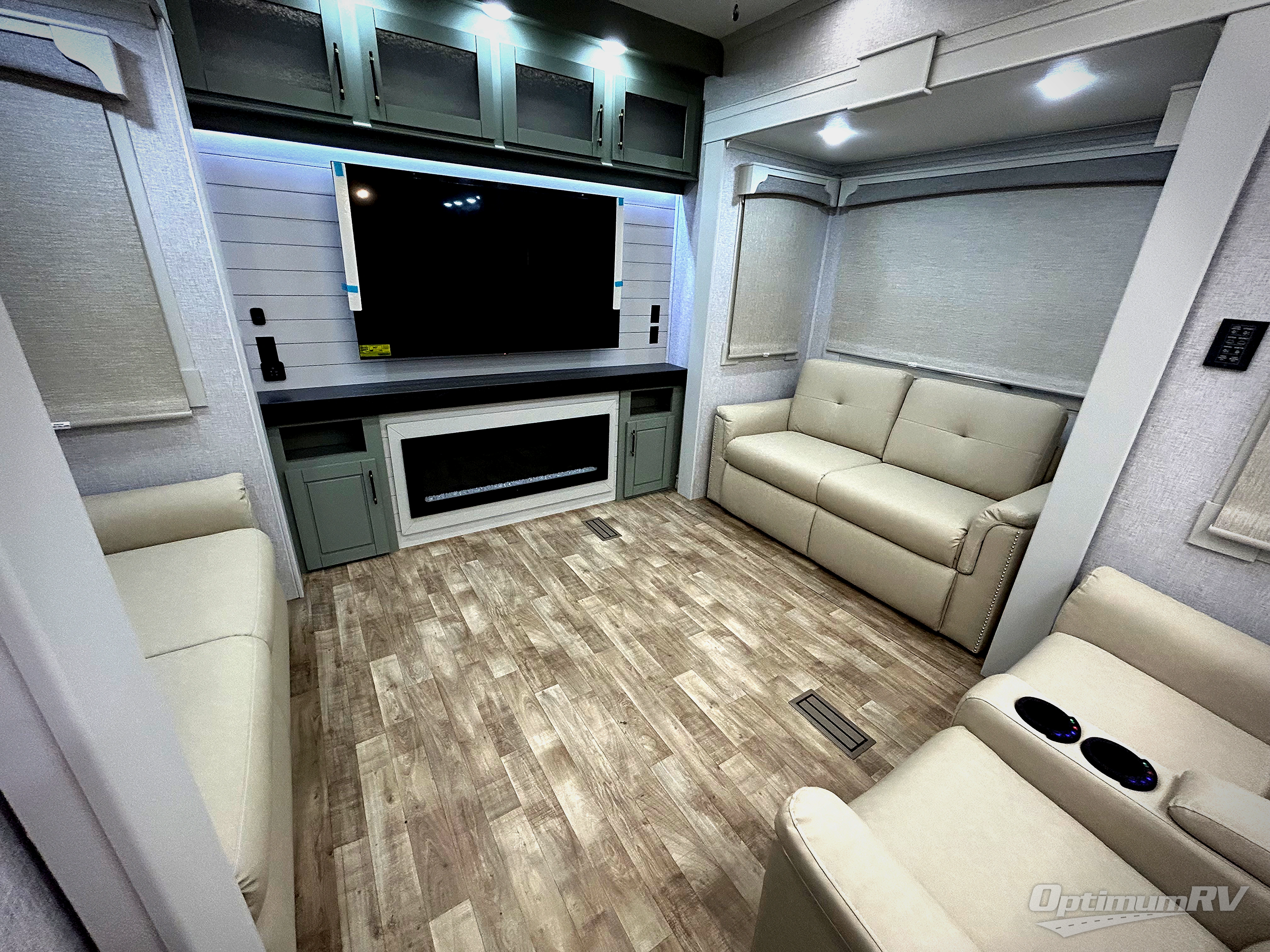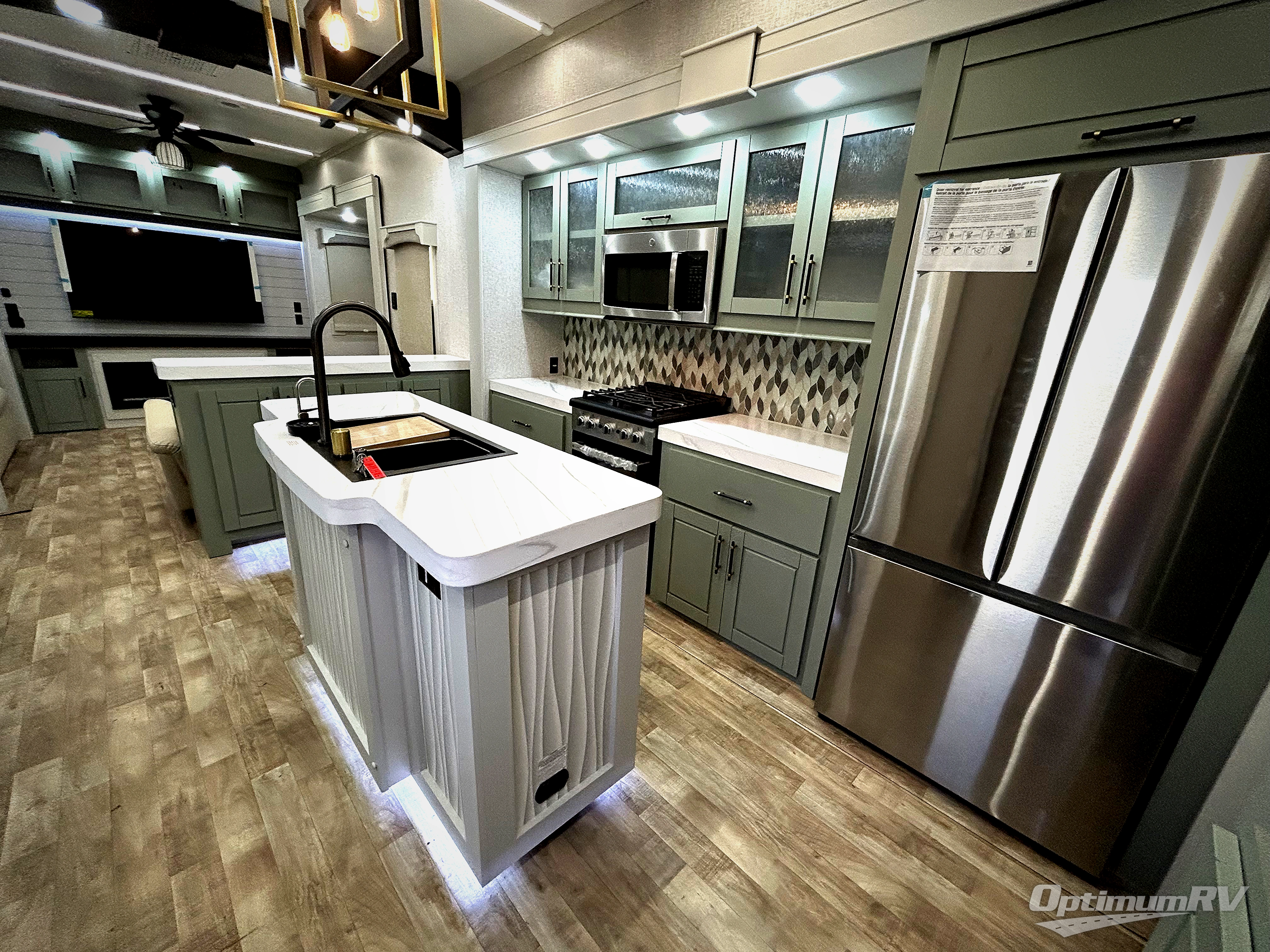 This Redwood fifth wheel is going to make you say wow! The rear living room is fully impressive with its 72" tri-fold sofa slides that are across from one another, its 60" theater sofa, its entertainment center with 65" TV, and its ceiling fan. All in all, it will feel like you're lounging back at home. The kitchen is also completely decked out with opposing slides, a pull-out waste basket at the large island, two buffets, a pantry, and a message center, and just a few steps away from the kitchen is where you will find the luxurious master suite. This space has a full bathroom up at the front where you will find a huge walk-in closet, and within the bedroom, the king bed slide rests across from the 39" TV so that you can watch a movie in comfort.