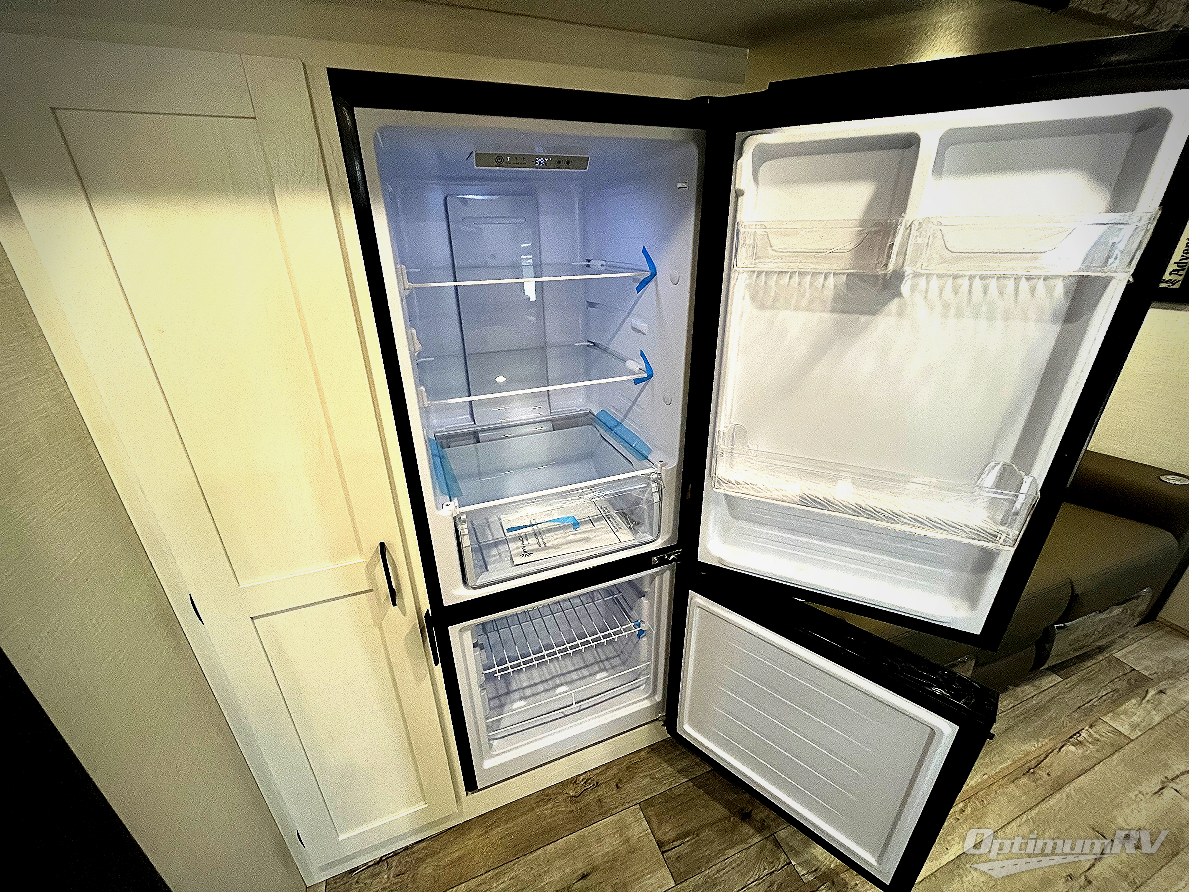You'll love every minute spent in this dual entry travel trailer. The front master bedroom includes one of these doors, along with a Sleep Tight queen bed, dual wardrobes, and easy access into the walk-thru bath. Your crew can relax on the theater seating within the large slide out, play a game at the Sit N' Slide table with flipside reversible cushions, or dine at the bartop with stools. There is also a rear kitchen with ample counter space. Head outdoors to enjoy the 20' power awning in your camp chairs!