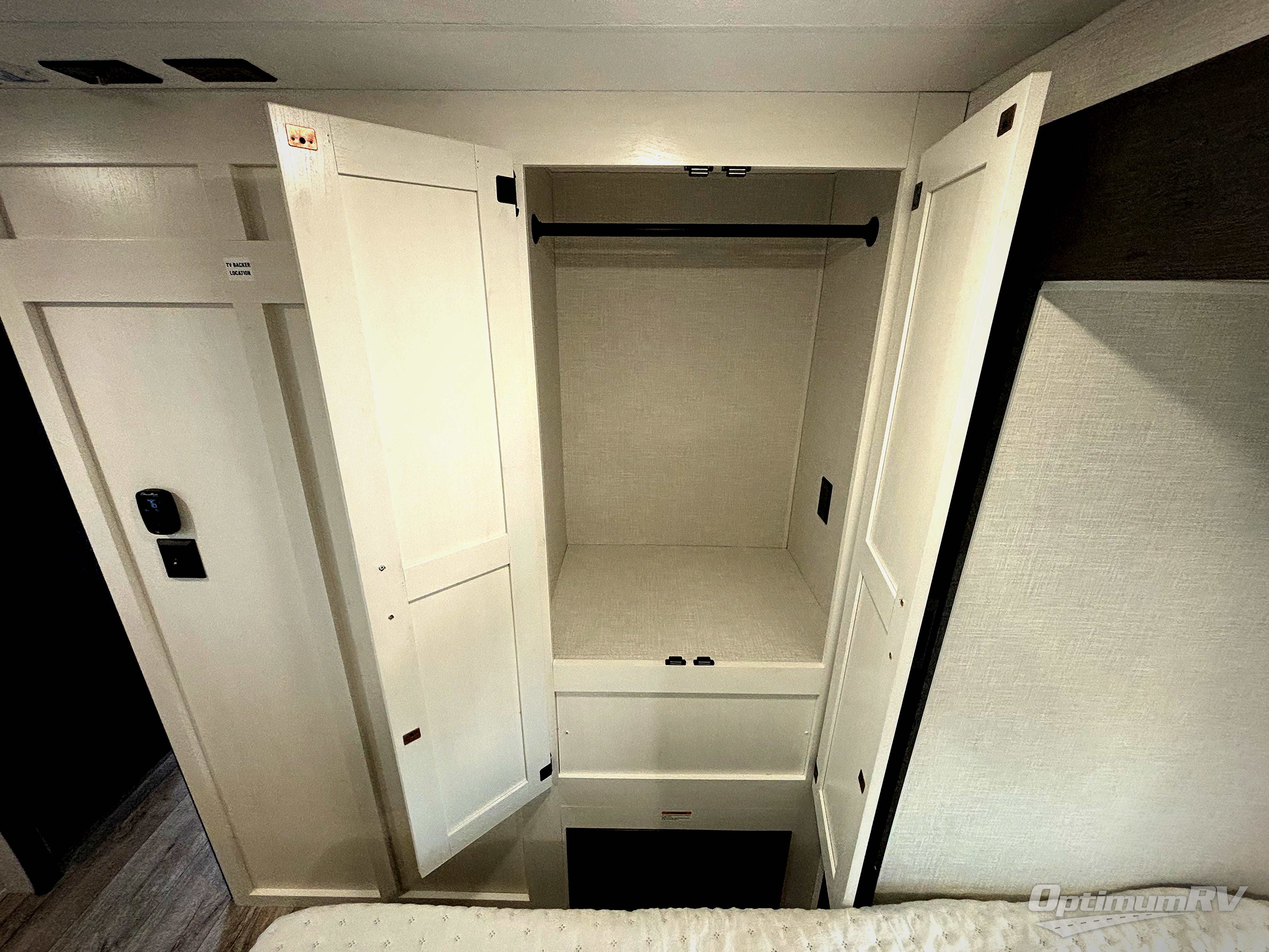 This travel trailer will feel just like home thanks to its spacious interior, large front private bedroom, and kitchen island. There are plenty of places to seating space, including a rear 70" sofa plus theater seating and a Sit N' Slide table within one of the slides. The opposing slide here includes the entertainment center and some of the kitchen appliances. You will also appreciate two pantries, one with washer and dryer prep if you want to add those appliances. A full bath lets you stay clean throughout your trip without having to use the campground's facilities, and the front bedroom is sure to make you feel at home. There is a Sleep Tight queen bed slide, a large front closet, plus a dresser and a second closet for ample storage space!