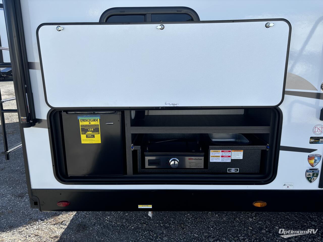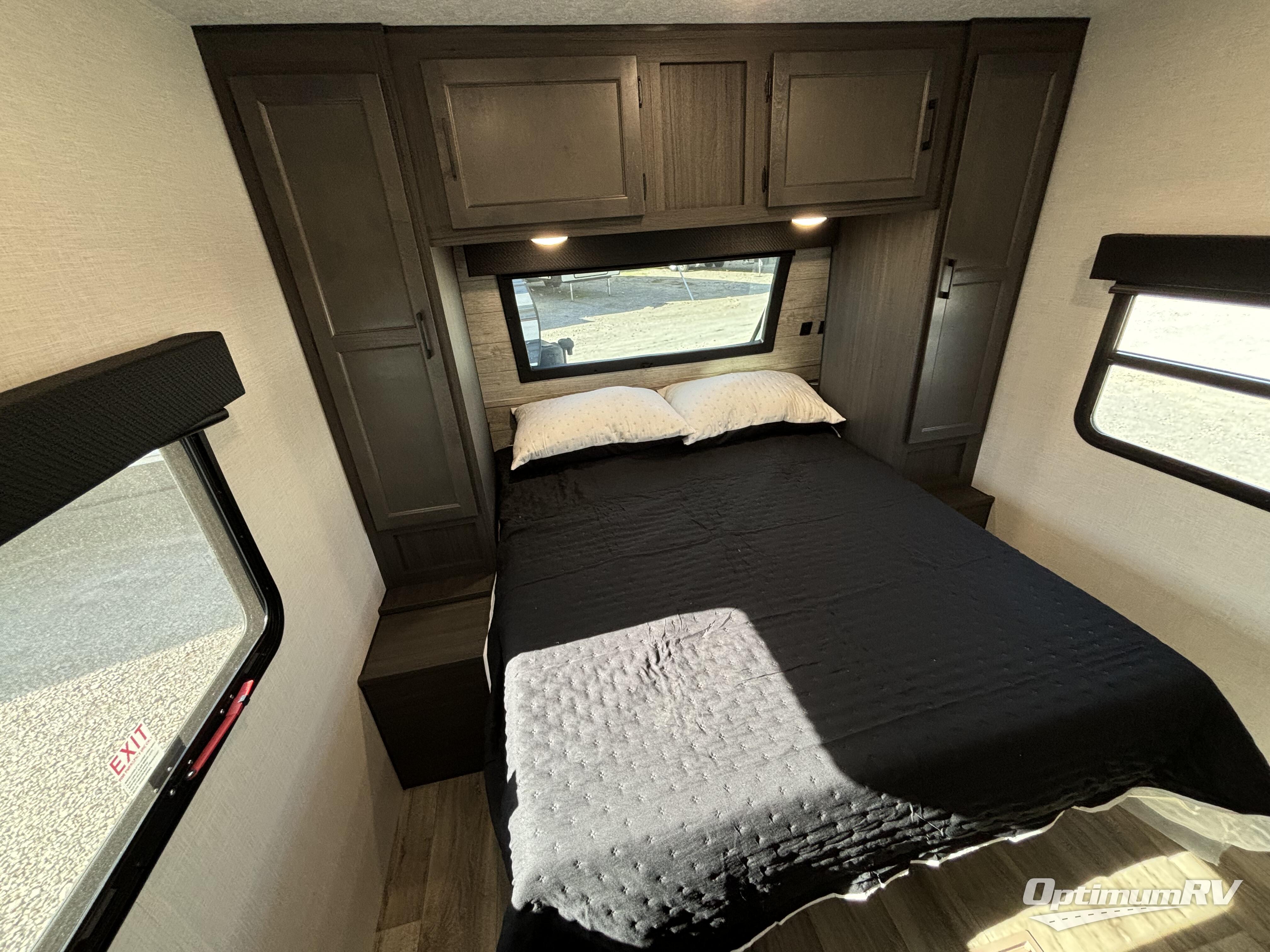 A front private bedroom with a Sleep Tight queen bed is sure to make you feel at home, while your guests take the double-size bunks in the back. There is a full bath right next to the bunks for easy nighttime use, and any other guests can sleep on the U-shaped dinette with flipside reversible cushions. There is plenty of storage space, including a walk-in pantry with coat hooks, dual bedside closets to keep clothes wrinkle-free, and an exterior pass-thru storage for camp gear! A full kitchen inside will let you cook in comfort when the weather isn't cooperating, and an exterior campfire cafe includes an outdoor refrigerator, sink, and griddle for a sunrise breakfast!