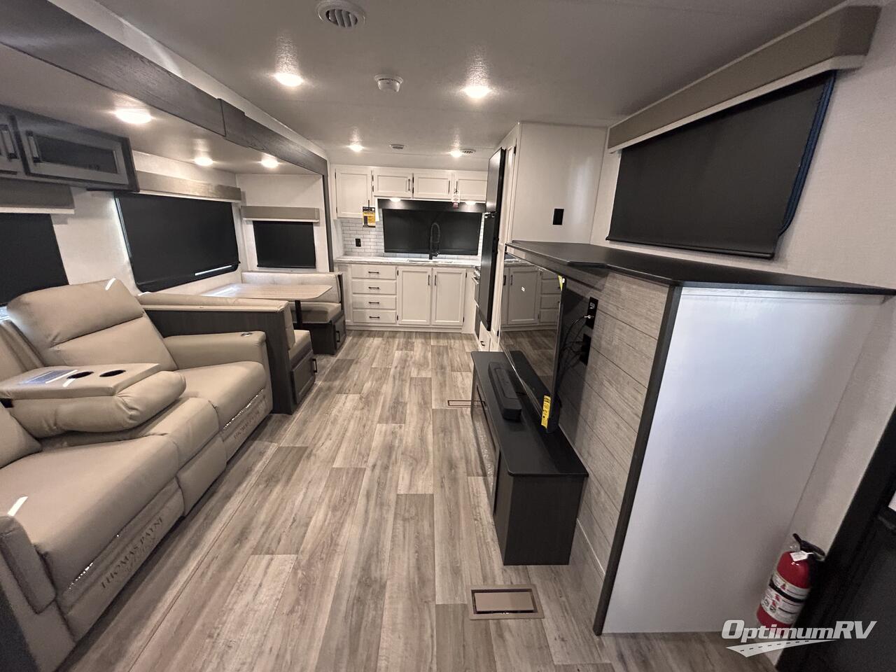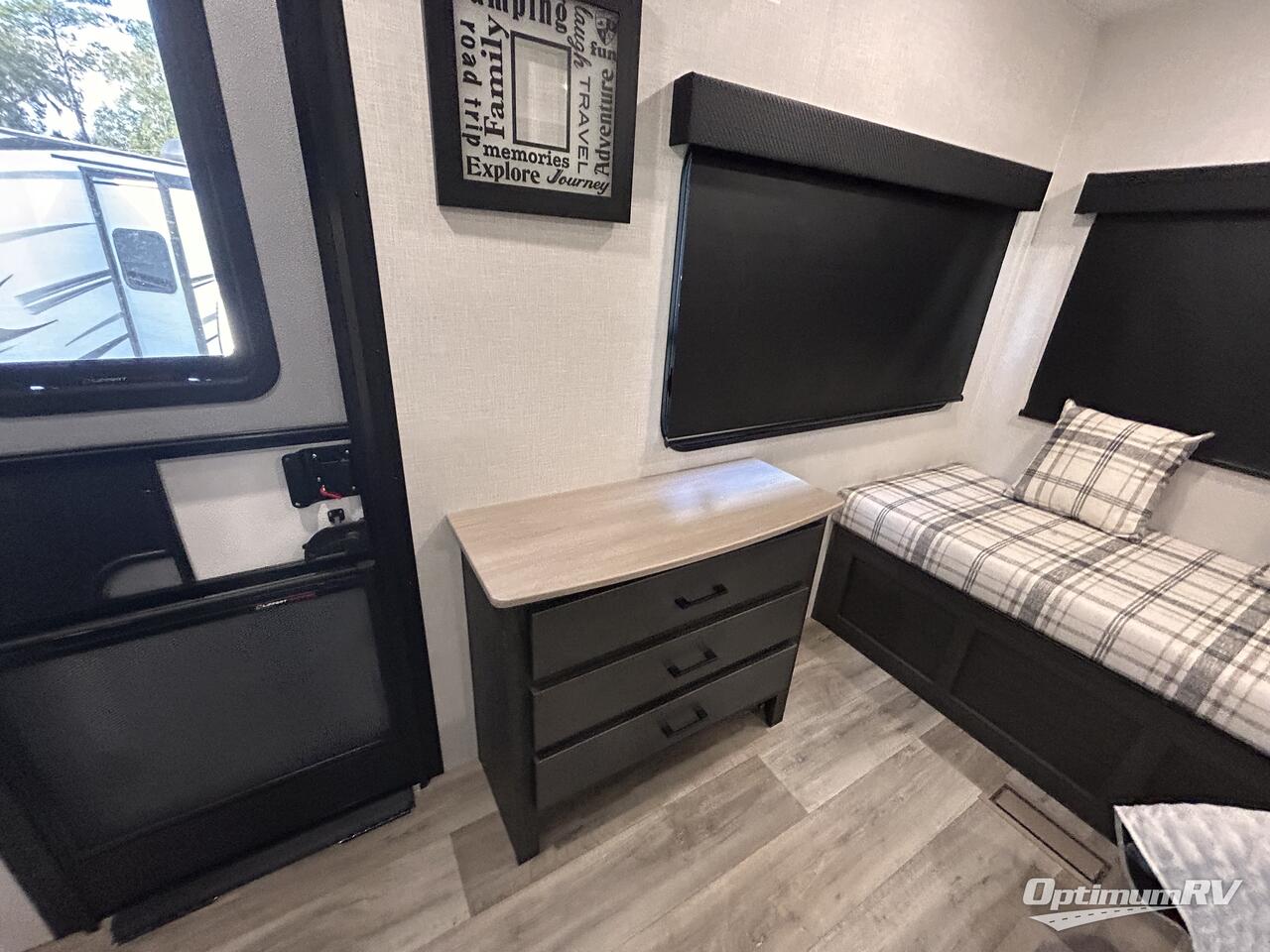 A front kitchen in this travel trailer provides more interior space! Once you have prepared your best meals with the Furrion oven and three burner cooktop, you can head to the Sit N' Slide table with flipside reversible cushions to dine. The 70" sofa also offers a comfortable place to take an afternoon nap or sit while enjoying the entertainment center with a frameless electric fireplace and 40" TV on a swing arm. A walk-thru bath makes it easy for all to enter and has a 30" x 36" shower to freshen up in each morning. The rear private bedroom has a Sleep Tight queen bed slide for a good night's rest, a dresser, two wardrobes, and a bench seat where you sit to put your hiking boots on. You'll also find one of the dual entry doors here for added convenience!