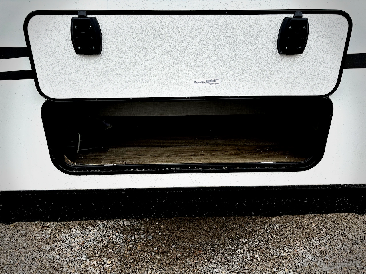 A front kitchen in this travel trailer provides more interior space! Once you have prepared your best meals with the Furrion oven and three burner cooktop, you can head to the Sit N' Slide table with flipside reversible cushions to dine. The 70" sofa also offers a comfortable place to take an afternoon nap or sit while enjoying the entertainment center with a frameless electric fireplace and 40" TV on a swing arm. A walk-thru bath makes it easy for all to enter and has a 30" x 36" shower to freshen up in each morning. The rear private bedroom has a Sleep Tight queen bed slide for a good night's rest, a dresser, two wardrobes, and a bench seat where you sit to put your hiking boots on. You'll also find one of the dual entry doors here for added convenience!