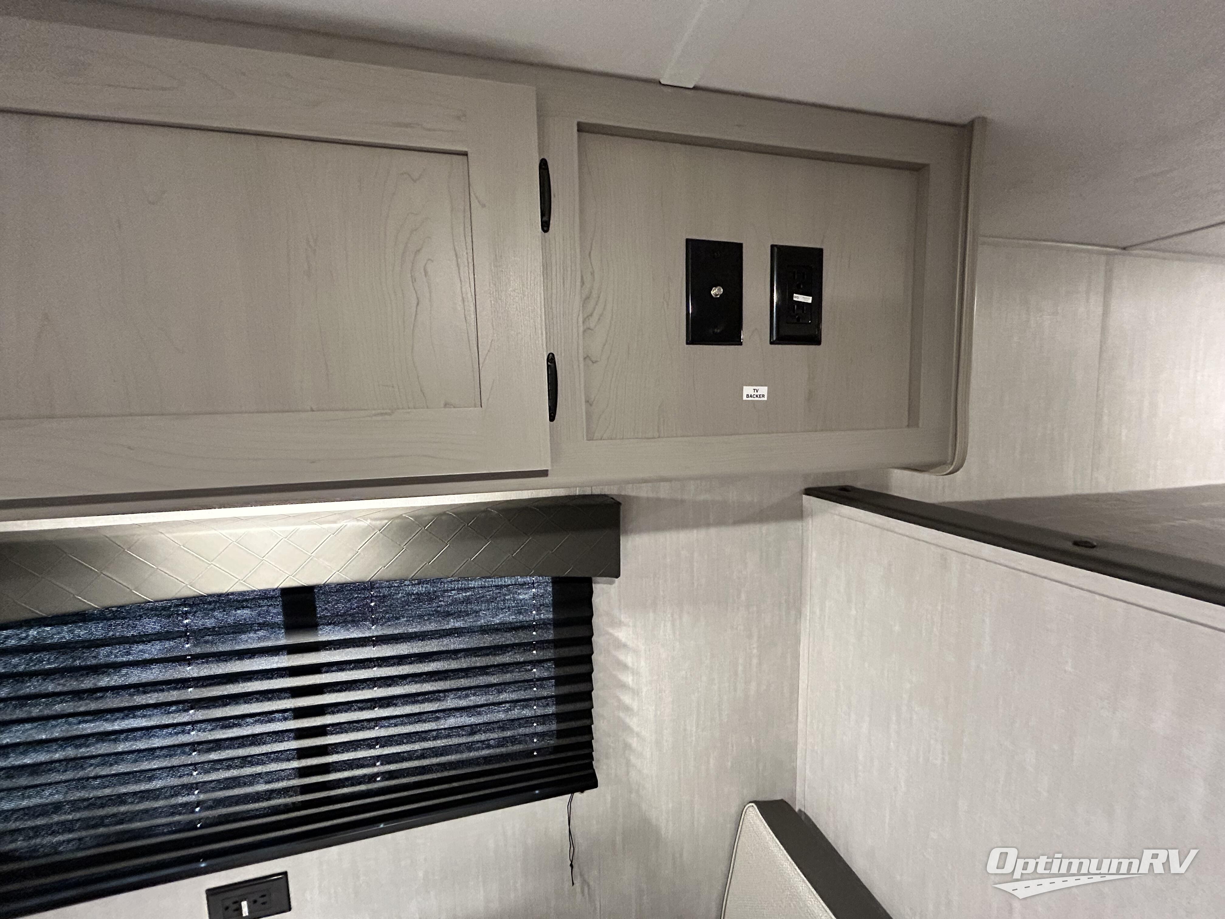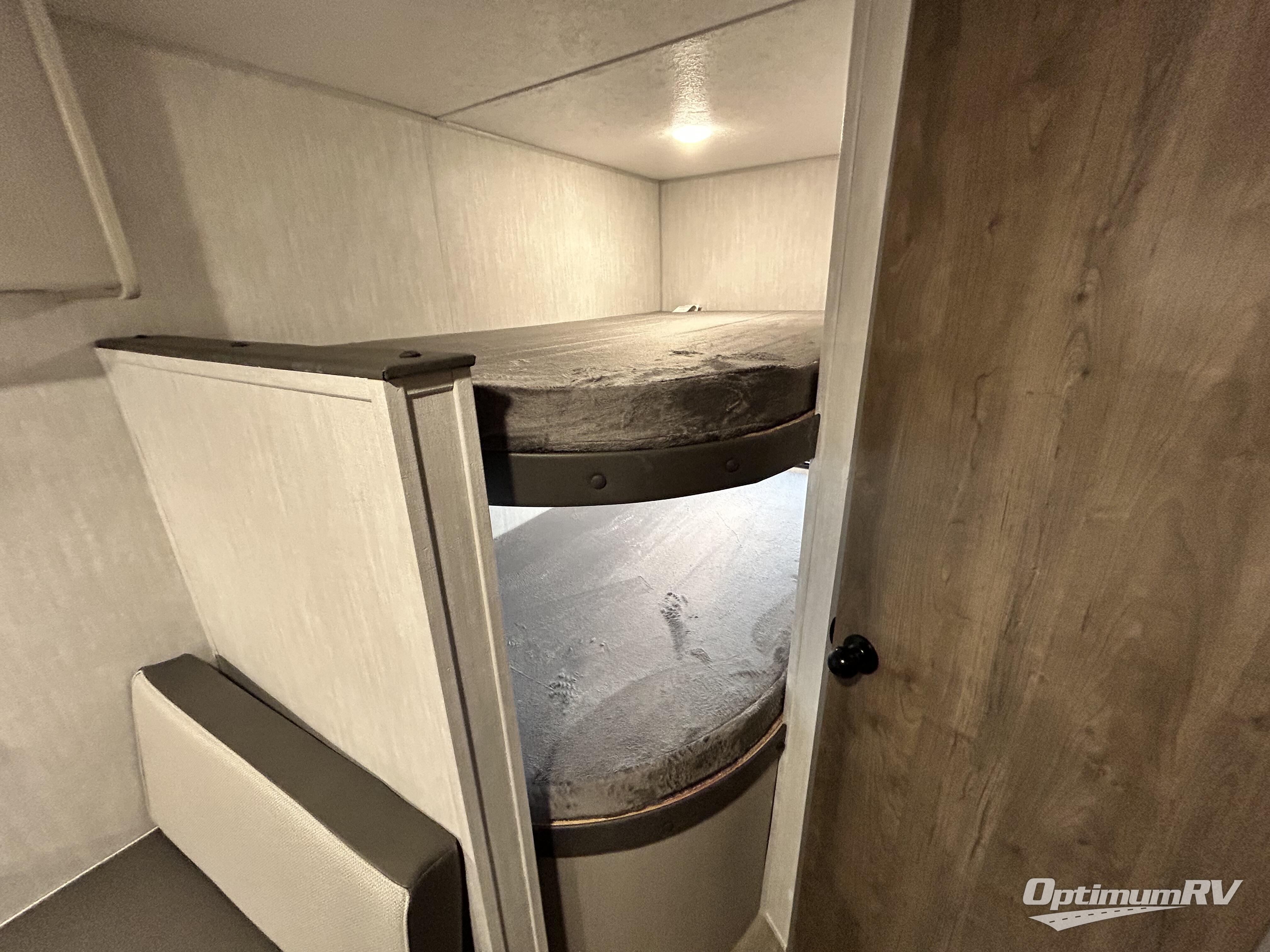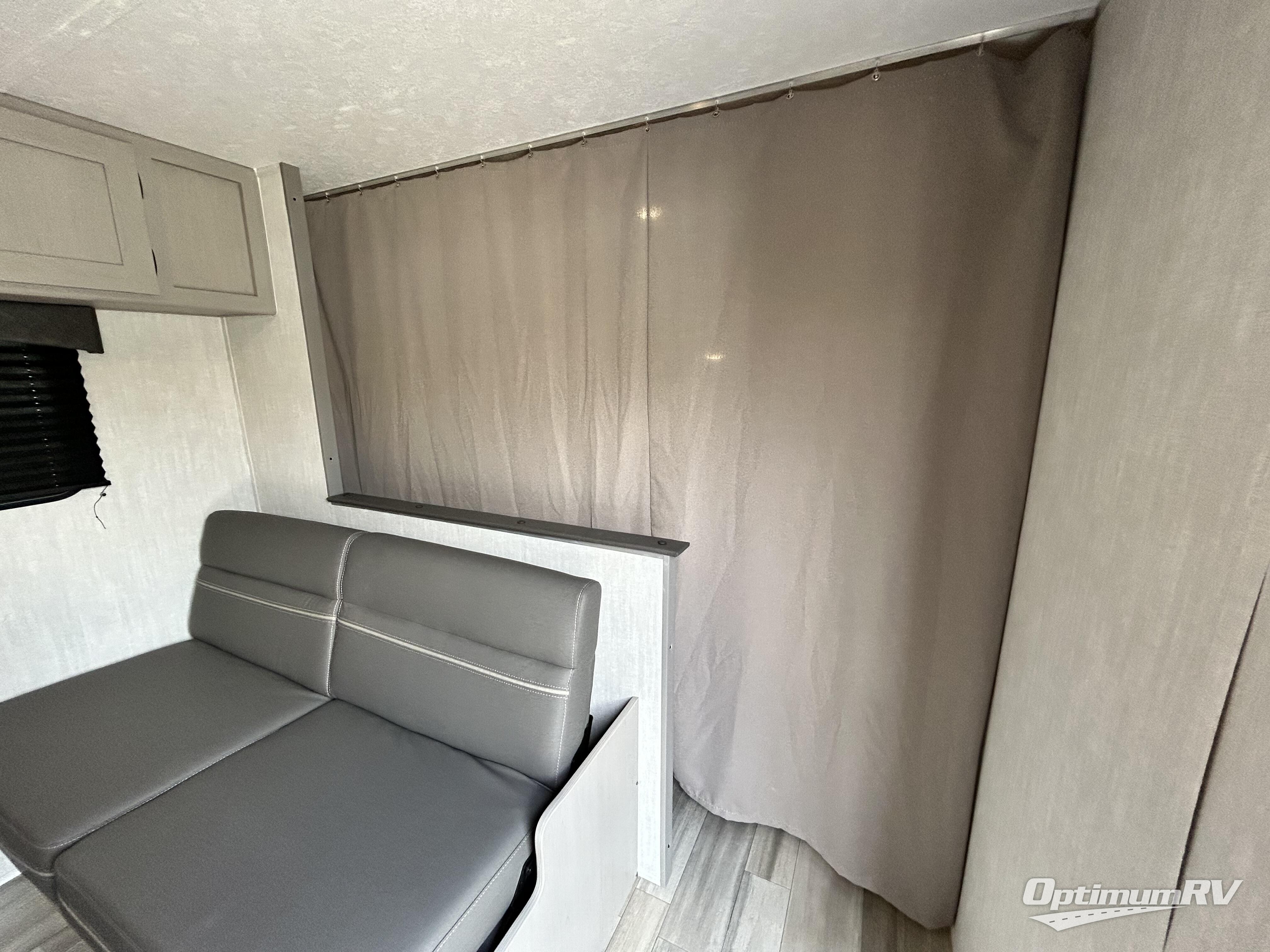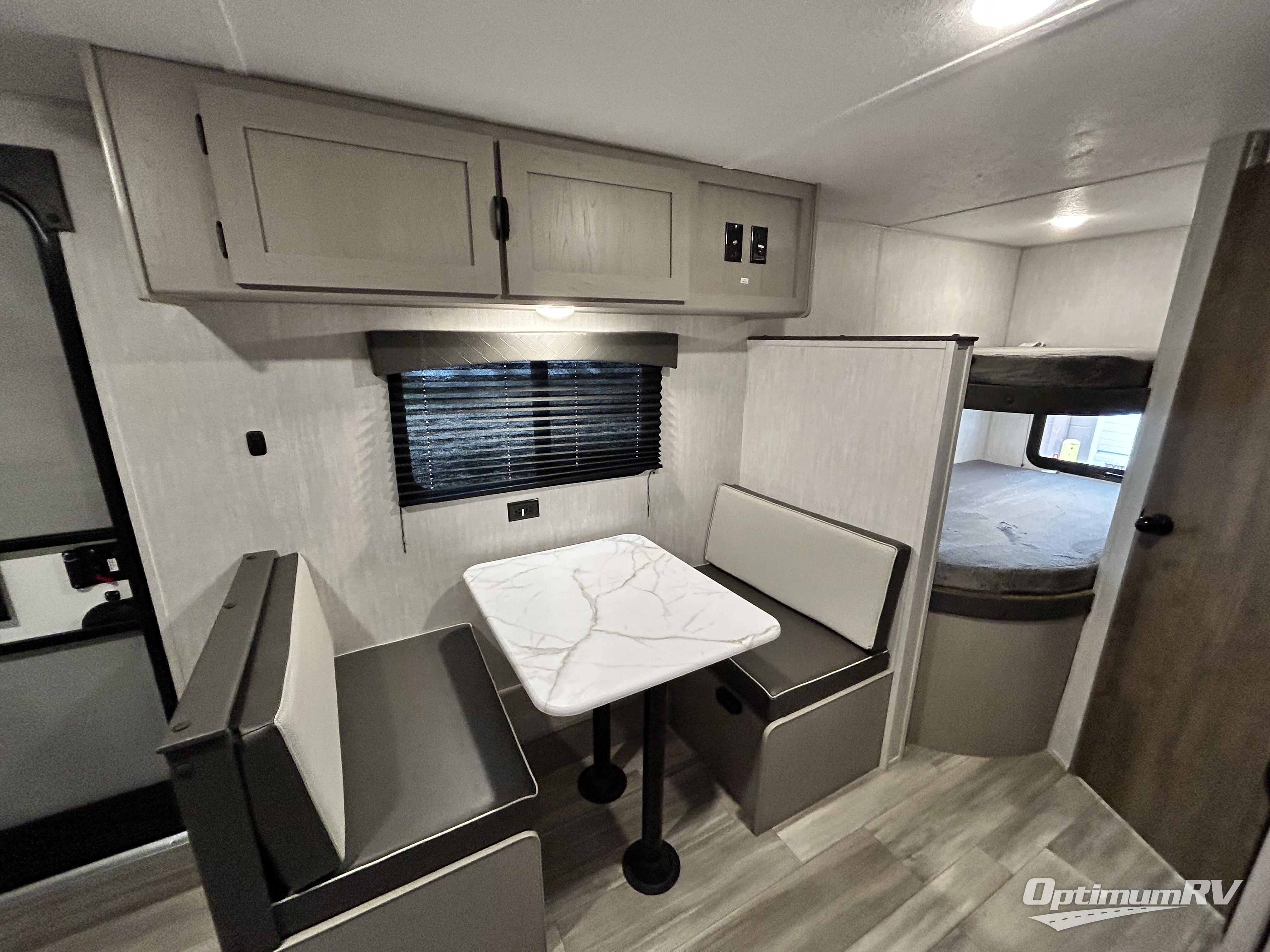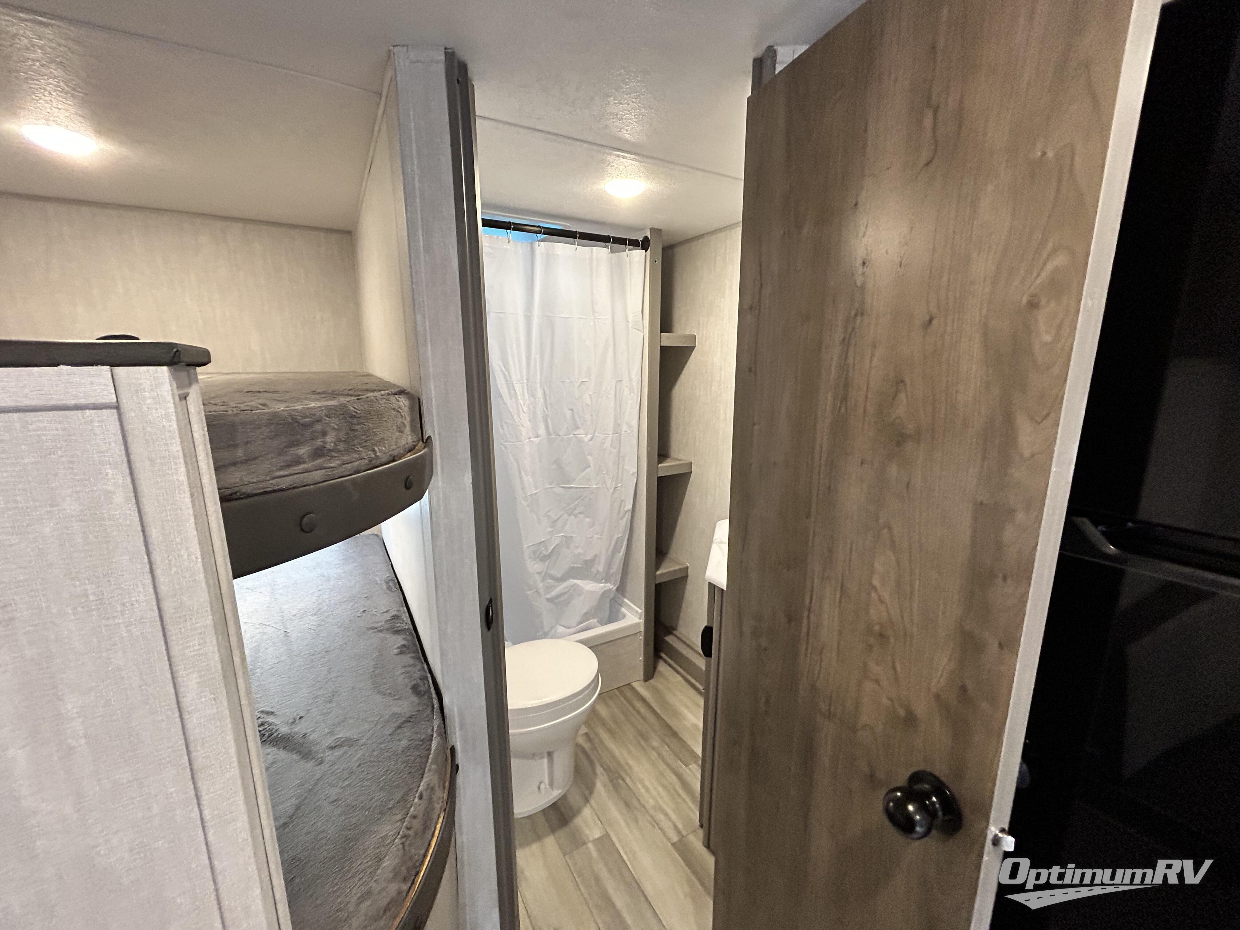Bring the whole family with you in this travel trailer! The kiddos can sleep on the rear corner set of double bed bunks. The opposite rear corner features a full bath including a 24" x 36" shower, linen cabinet, toilet, and vanity with medicine cabinet overhead. In the main living space, you will find plenty of seating with a booth dinette and jackknife sofa which can also transform into an extra sleeping space if needed. Everyone's bellies will stay full with the two burner cooktop, 11 cu. ft. 12-volt refrigerator, and microwave which you can use to pop a bag of popcorn for movie night. You will enjoy the front bedroom for a bit of privacy including a queen bed and large overhead cabinet for your things. On the outside, a large front pass-through for lawn chairs and camp gear. There is more storage beneath the double bed bunks in back and a nice 10' awning to provide protection from the elements when outdoors.