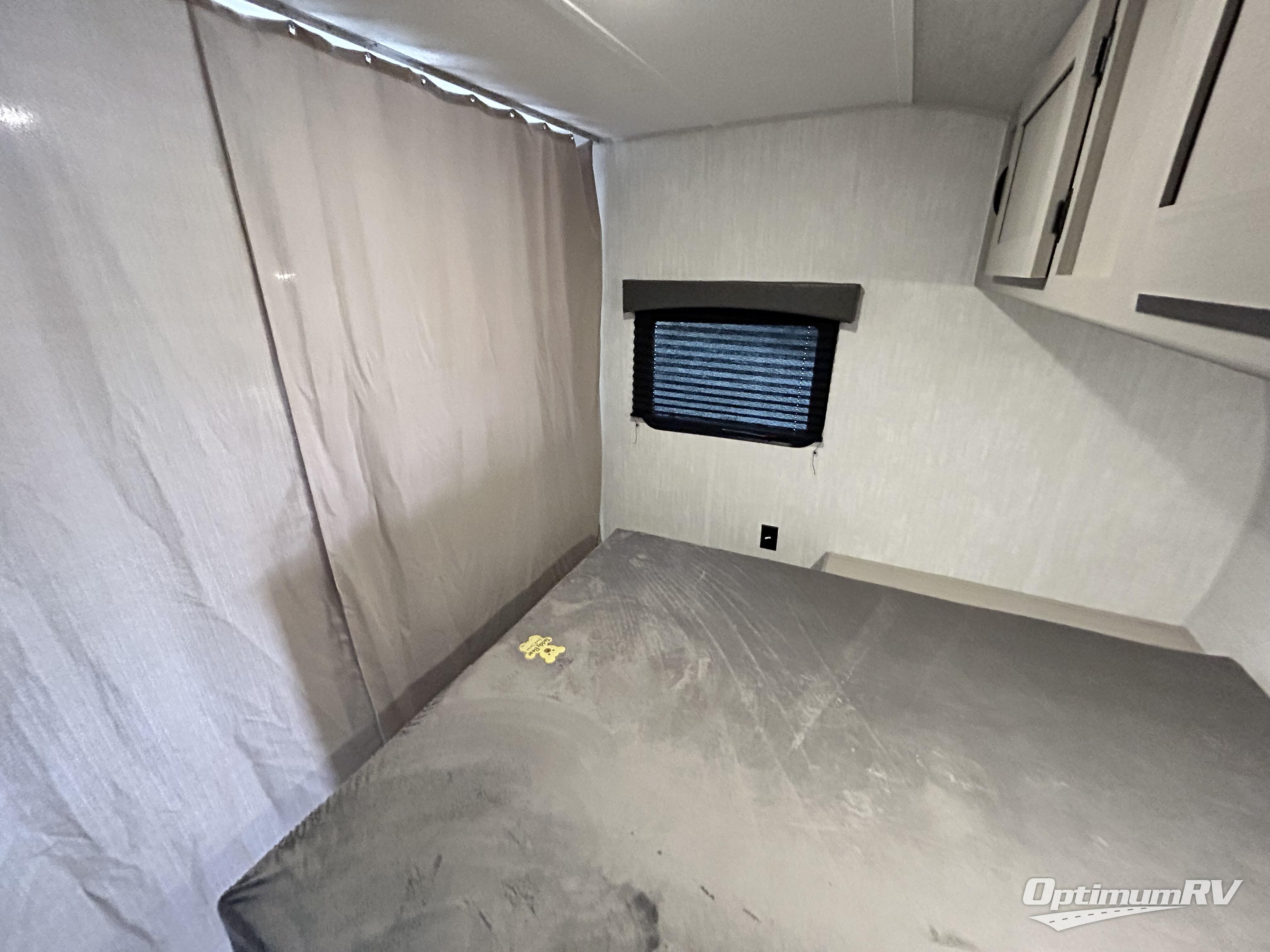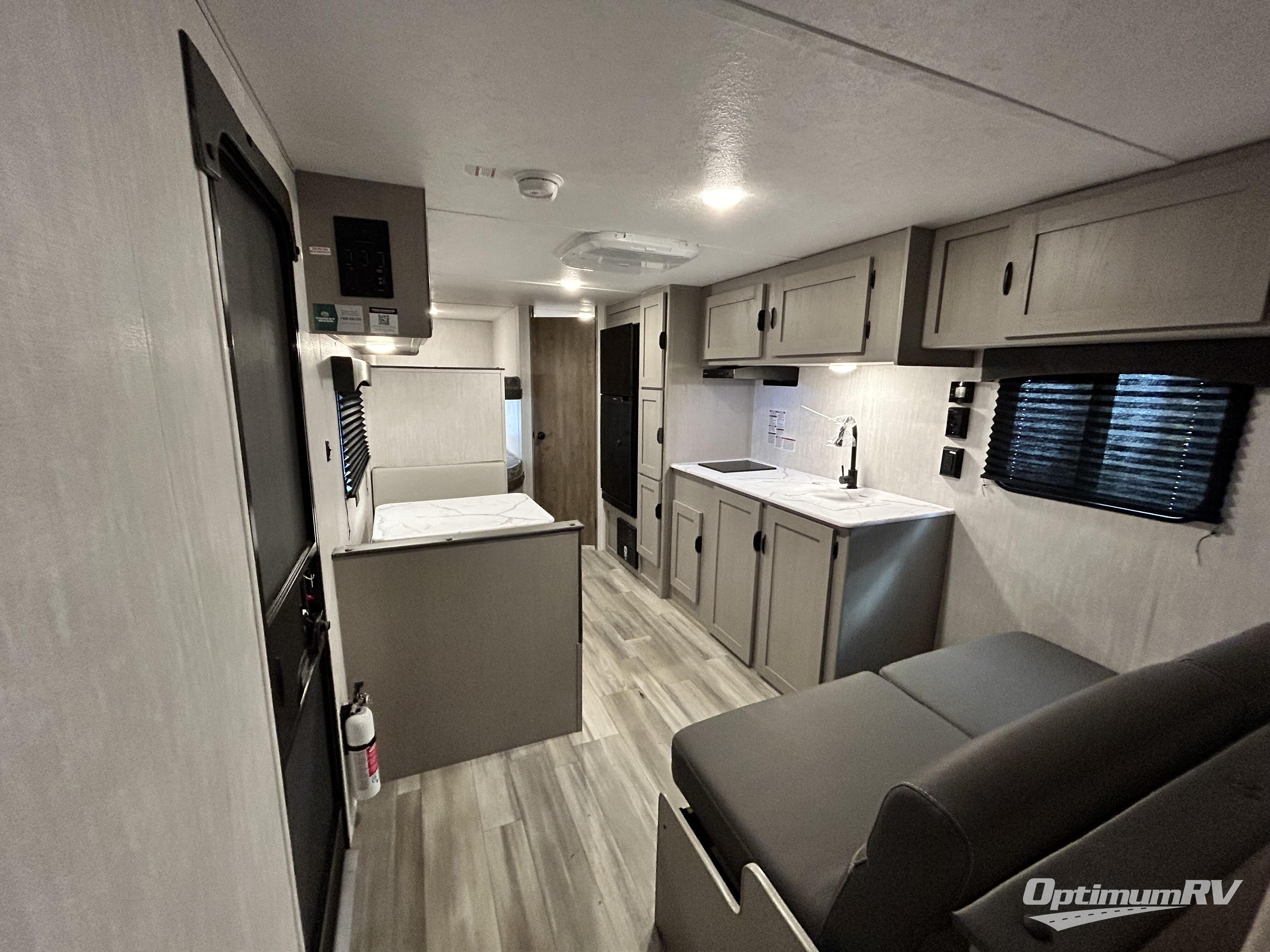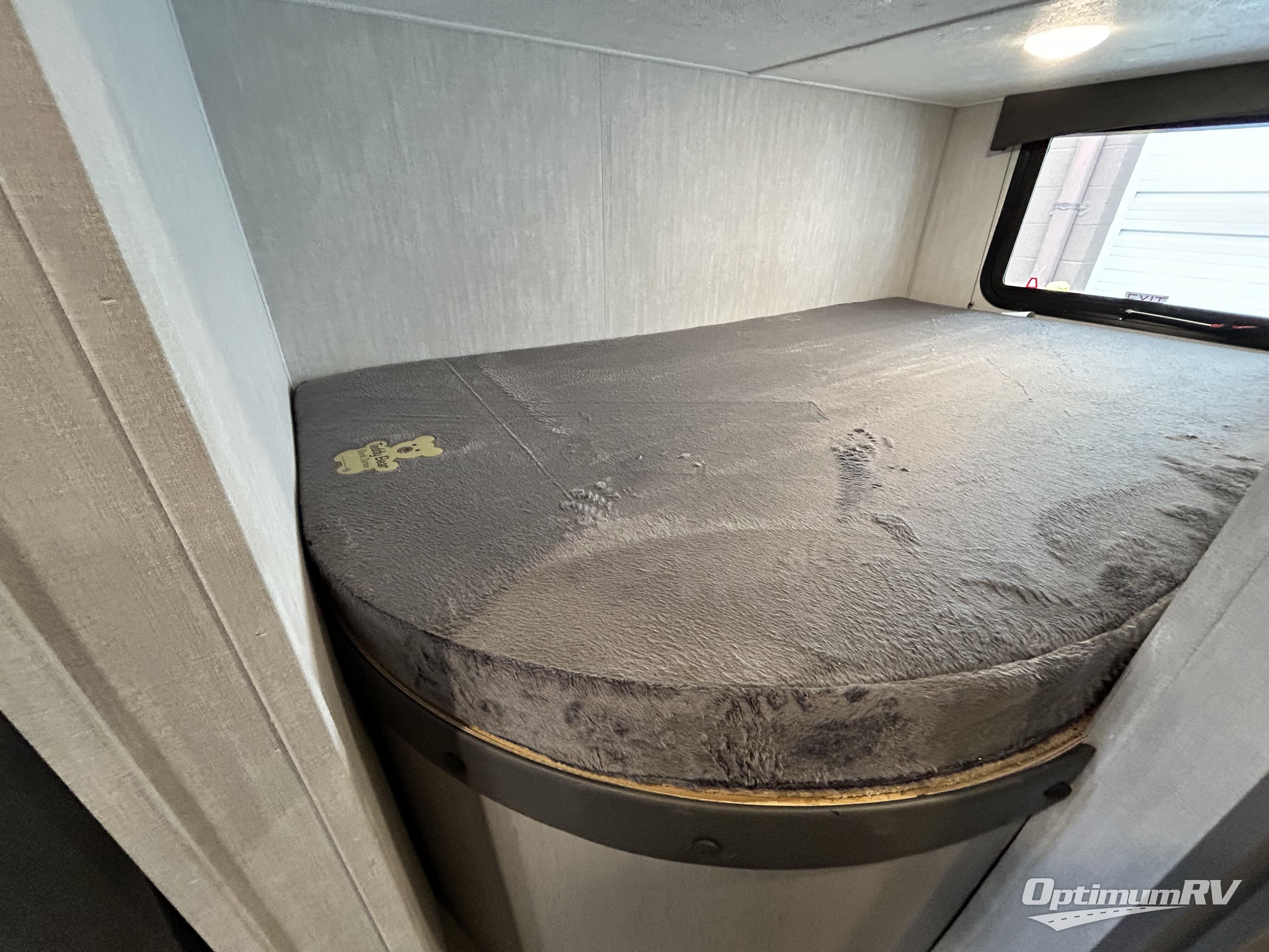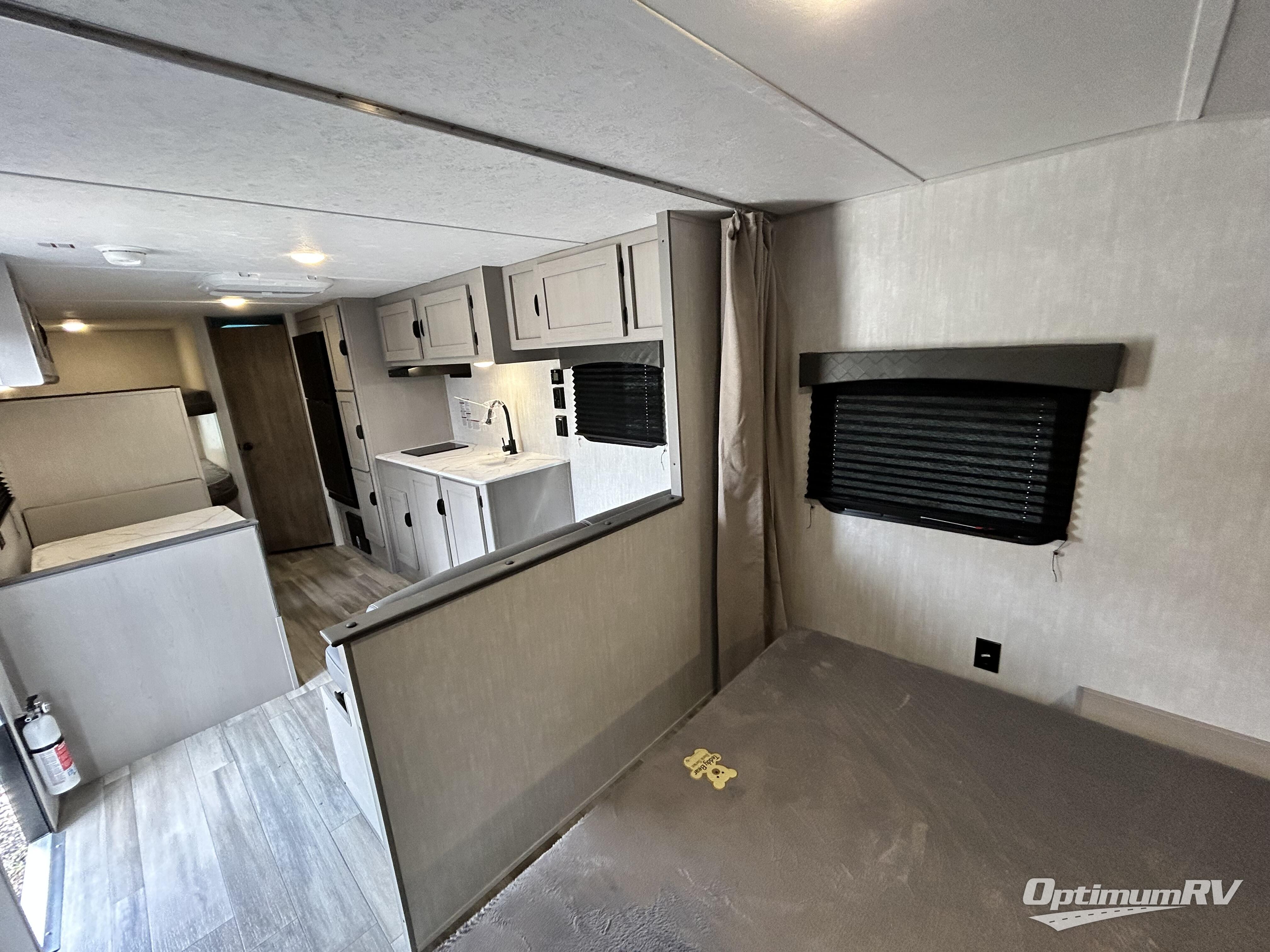 Bring the whole family with you in this travel trailer! The kiddos can sleep on the rear corner set of double bed bunks. The opposite rear corner features a full bath including a 24" x 36" shower, linen cabinet, toilet, and vanity with medicine cabinet overhead. In the main living space, you will find plenty of seating with a booth dinette and jackknife sofa which can also transform into an extra sleeping space if needed. Everyone's bellies will stay full with the two burner cooktop, 11 cu. ft. 12-volt refrigerator, and microwave which you can use to pop a bag of popcorn for movie night. You will enjoy the front bedroom for a bit of privacy including a queen bed and large overhead cabinet for your things. On the outside, a large front pass-through for lawn chairs and camp gear. There is more storage beneath the double bed bunks in back and a nice 10' awning to provide protection from the elements when outdoors.