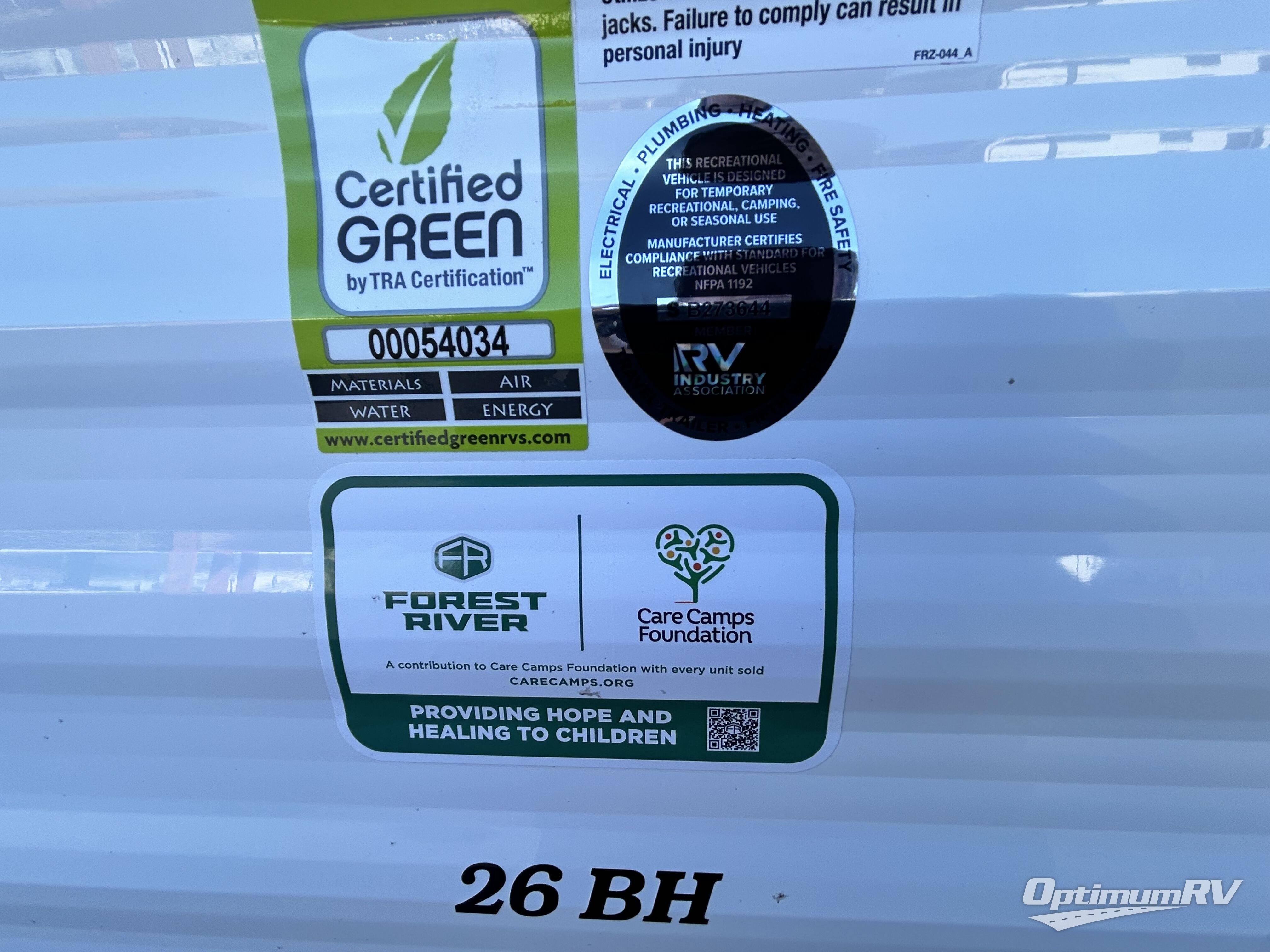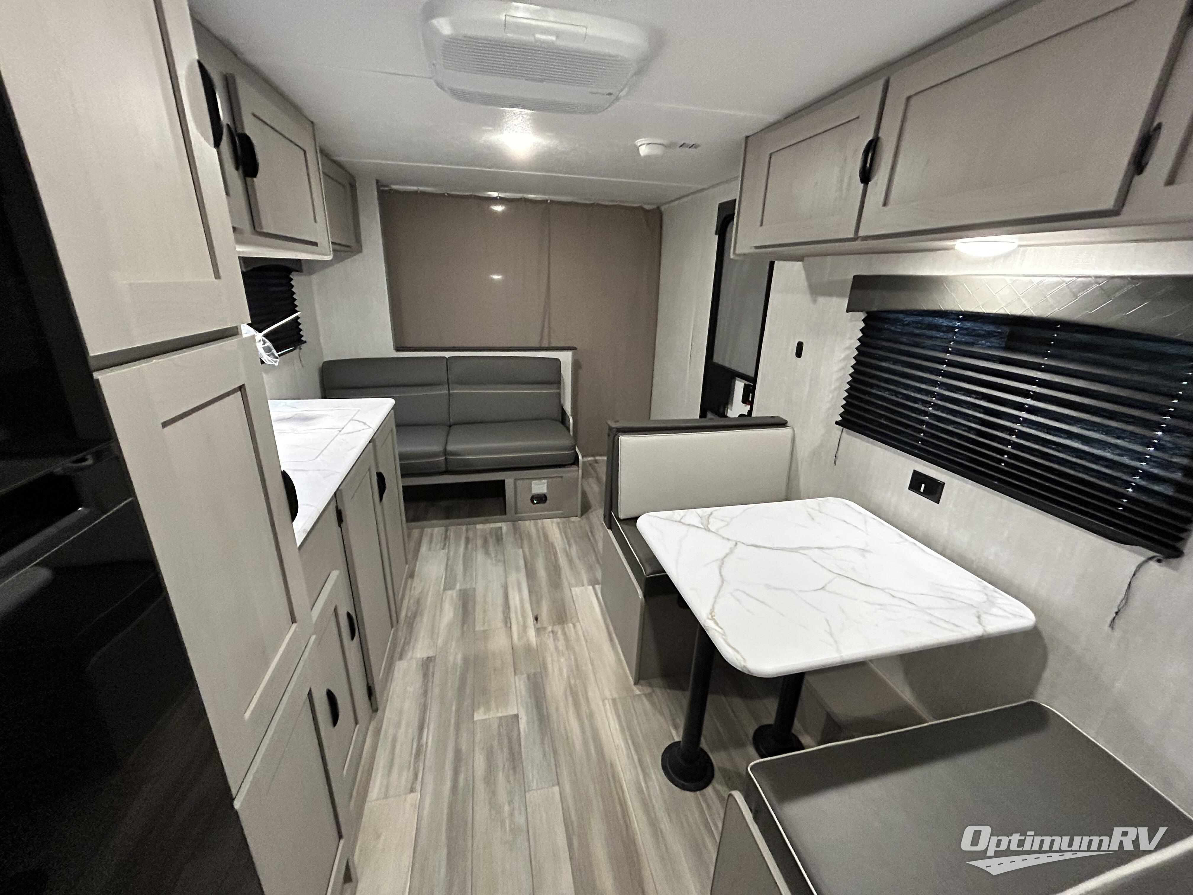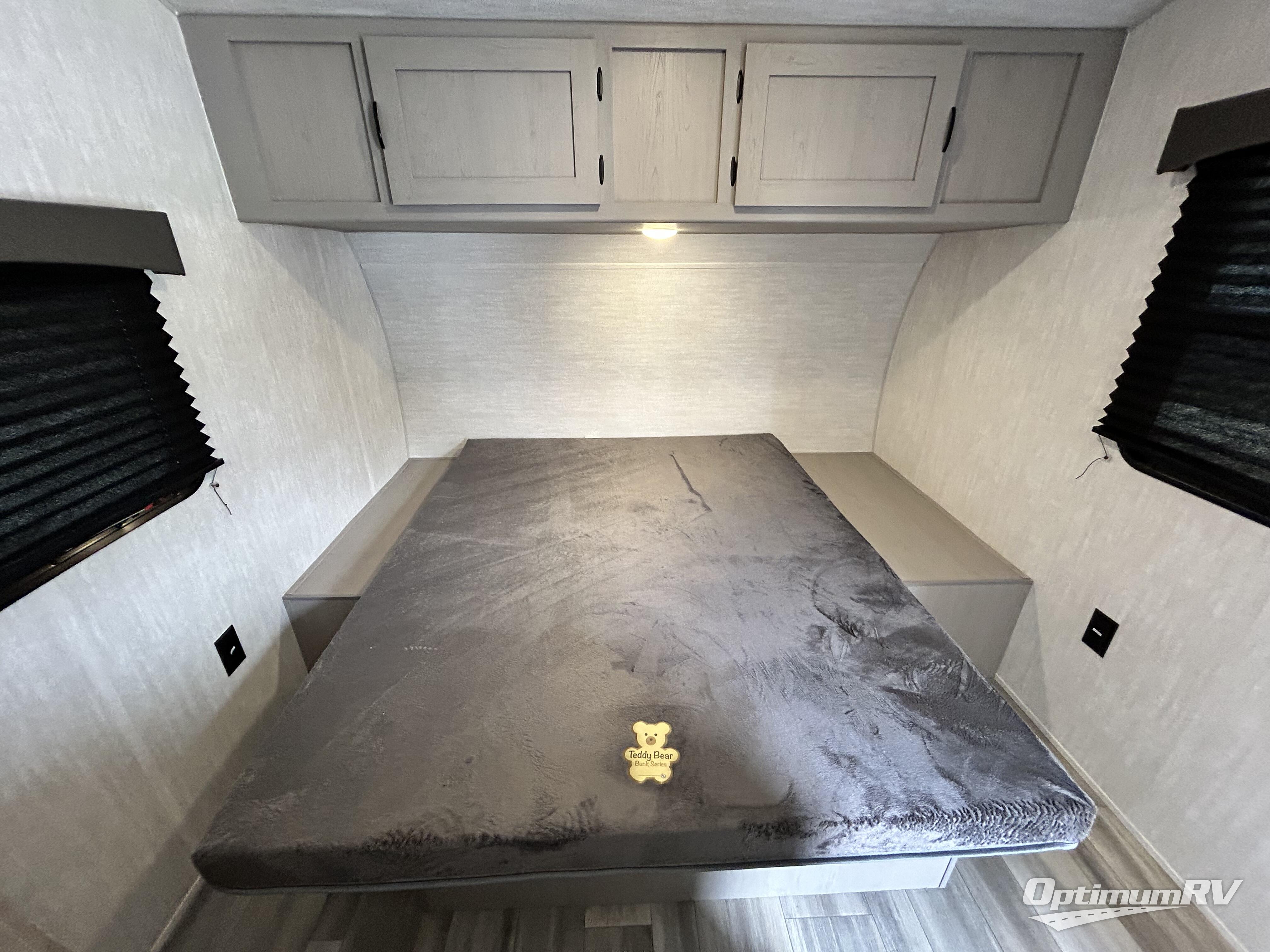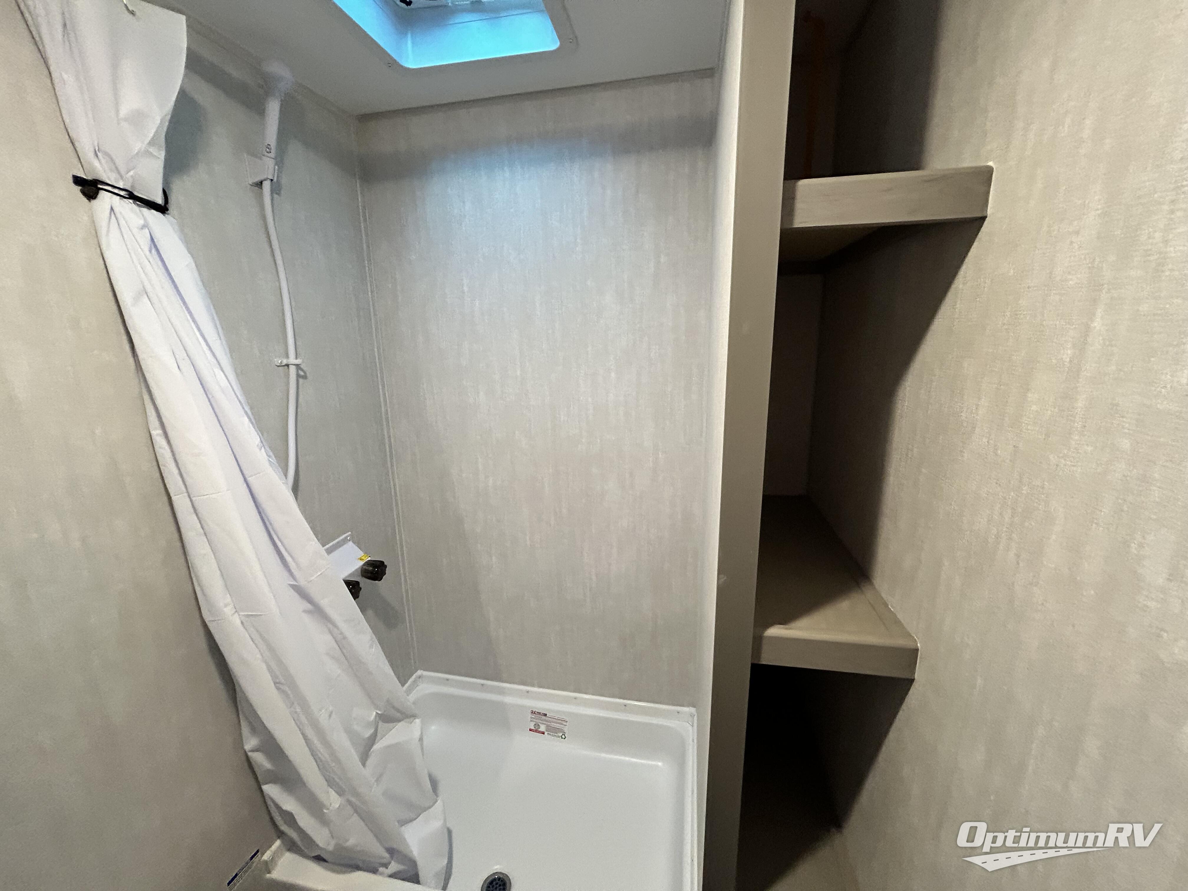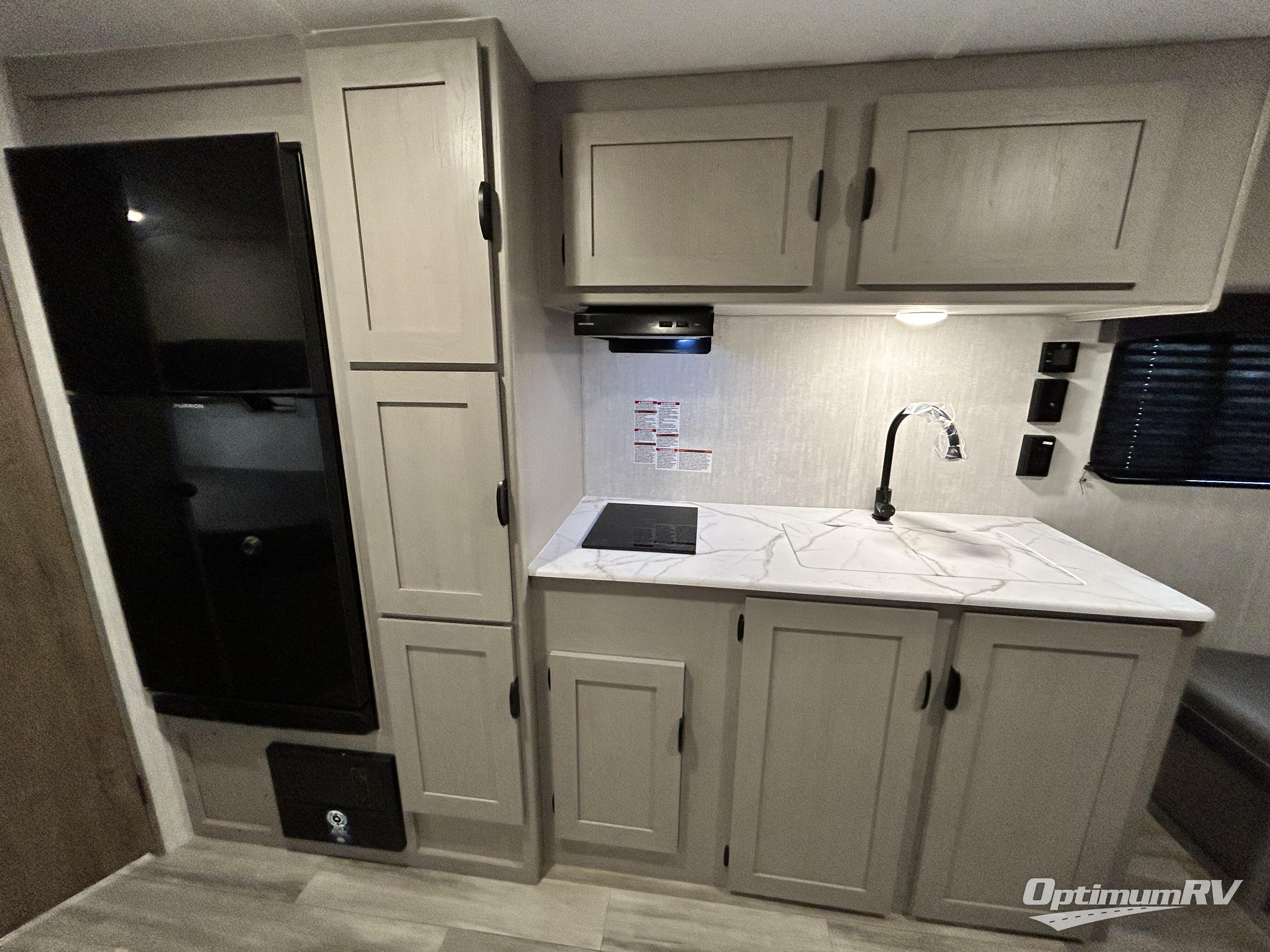 Bring the whole family with you in this travel trailer! The kiddos can sleep on the rear corner set of double bed bunks. The opposite rear corner features a full bath including a 24" x 36" shower, linen cabinet, toilet, and vanity with medicine cabinet overhead. In the main living space, you will find plenty of seating with a booth dinette and jackknife sofa which can also transform into an extra sleeping space if needed. Everyone's bellies will stay full with the two burner cooktop, 11 cu. ft. 12-volt refrigerator, and microwave which you can use to pop a bag of popcorn for movie night. You will enjoy the front bedroom for a bit of privacy including a queen bed and large overhead cabinet for your things. On the outside, a large front pass-through for lawn chairs and camp gear. There is more storage beneath the double bed bunks in back and a nice 10' awning to provide protection from the elements when outdoors.