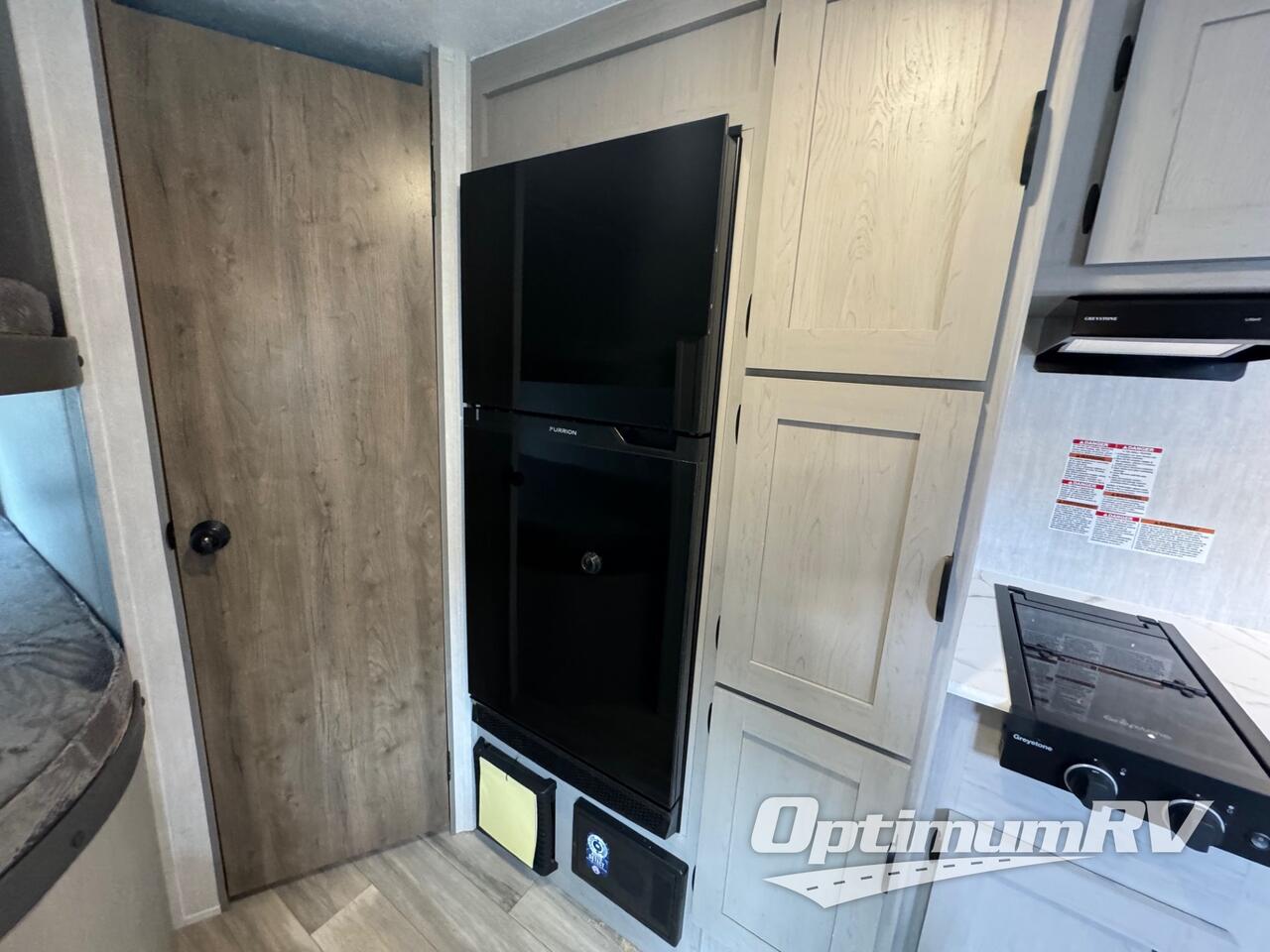 Bring the whole family with you in this travel trailer! The kiddos can sleep on the rear corner set of double bed bunks. The opposite rear corner features a full bath including a 24" x 36" shower, linen cabinet, toilet, and vanity with medicine cabinet overhead. In the main living space, you will find plenty of seating with a booth dinette and jackknife sofa which can also transform into an extra sleeping space if needed. Everyone's bellies will stay full with the two burner cooktop, 11 cu. ft. 12-volt refrigerator, and microwave which you can use to pop a bag of popcorn for movie night. You will enjoy the front bedroom for a bit of privacy including a queen bed and large overhead cabinet for your things. On the outside, a large front pass-through for lawn chairs and camp gear. There is more storage beneath the double bed bunks in back and a nice 10' awning to provide protection from the elements when outdoors.