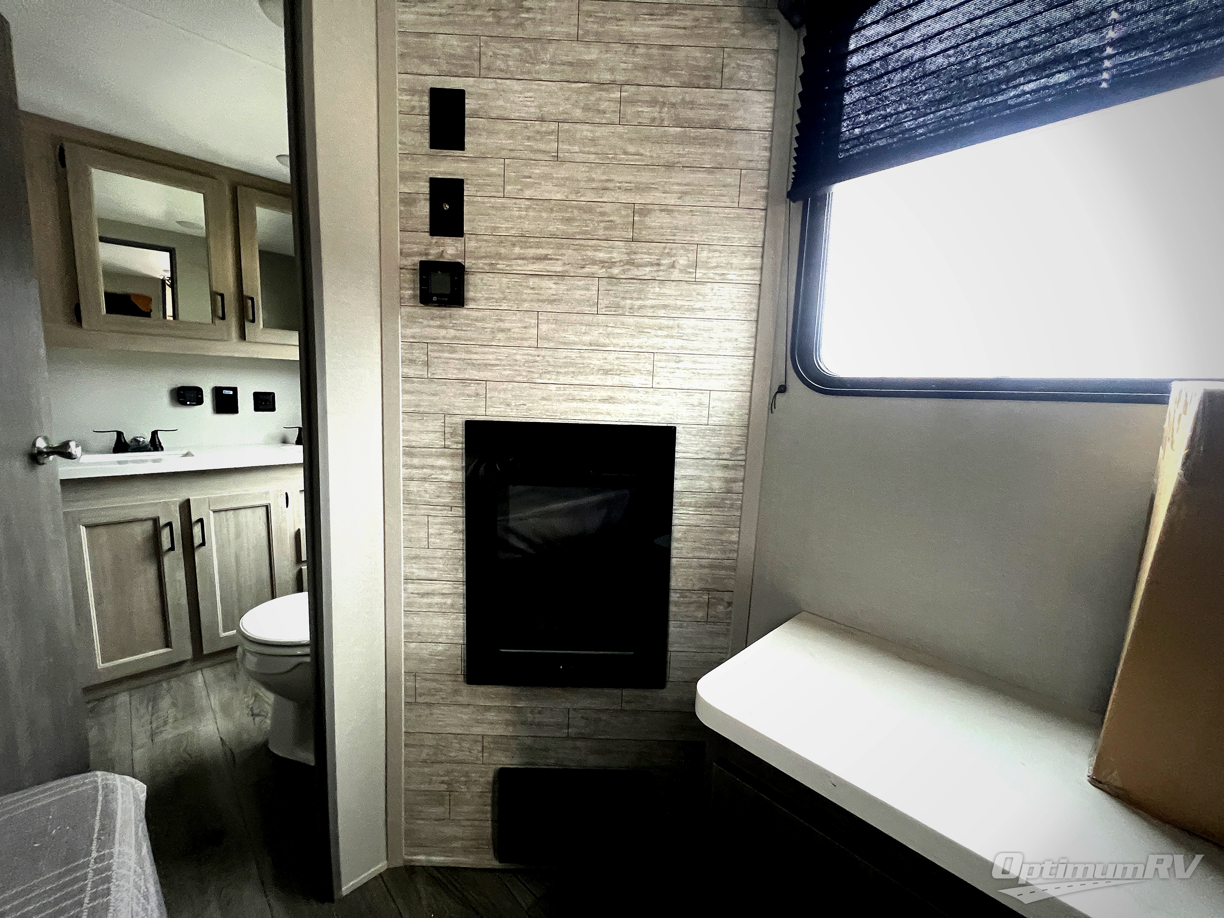 There is much to love about this destination trailer! Starting with the loft that has two queen beds, a wardrobe/storage, and a custom 58" x 71" bed. Downstairs there's a private bedroom with a king bed slide, a fireplace, and its very own private full bathroom complete with a dual sink vanity. The main living area has a huge bi-fold sleeper sectional sofa so you can fit even more guests, or just relax and watch the TV on the power lift in the entertainment center. The kitchen is well-equipped with a french door refrigerator, microwave, and pantry. The centerpiece here is a kitchen island with a deep basin farm-style sink and bar stool seating so your group can gather together and make new memories. The second full bath has a roomy 36" x 30" shower with glass door, and just around the corner find the stackable washer and dryer!