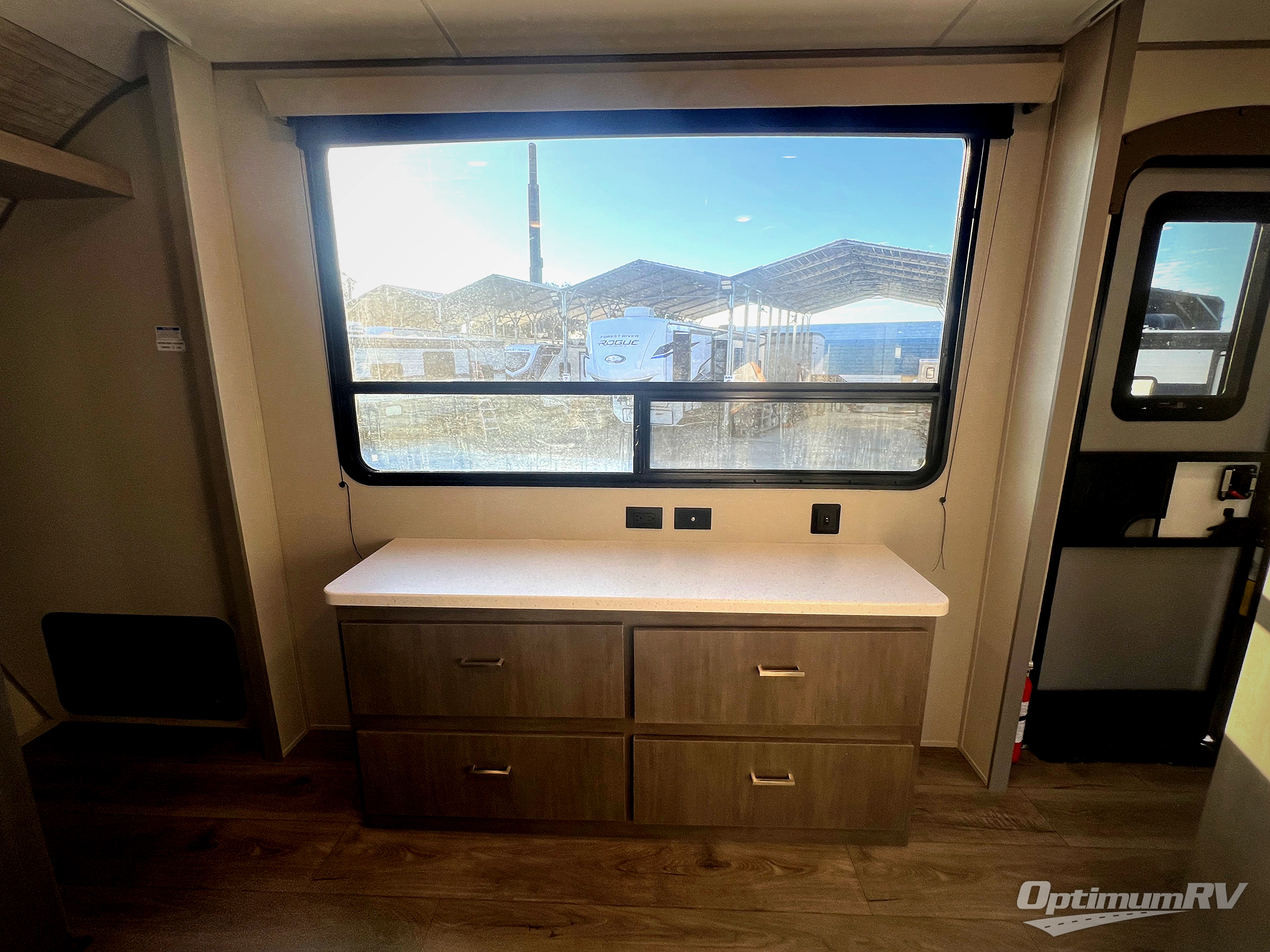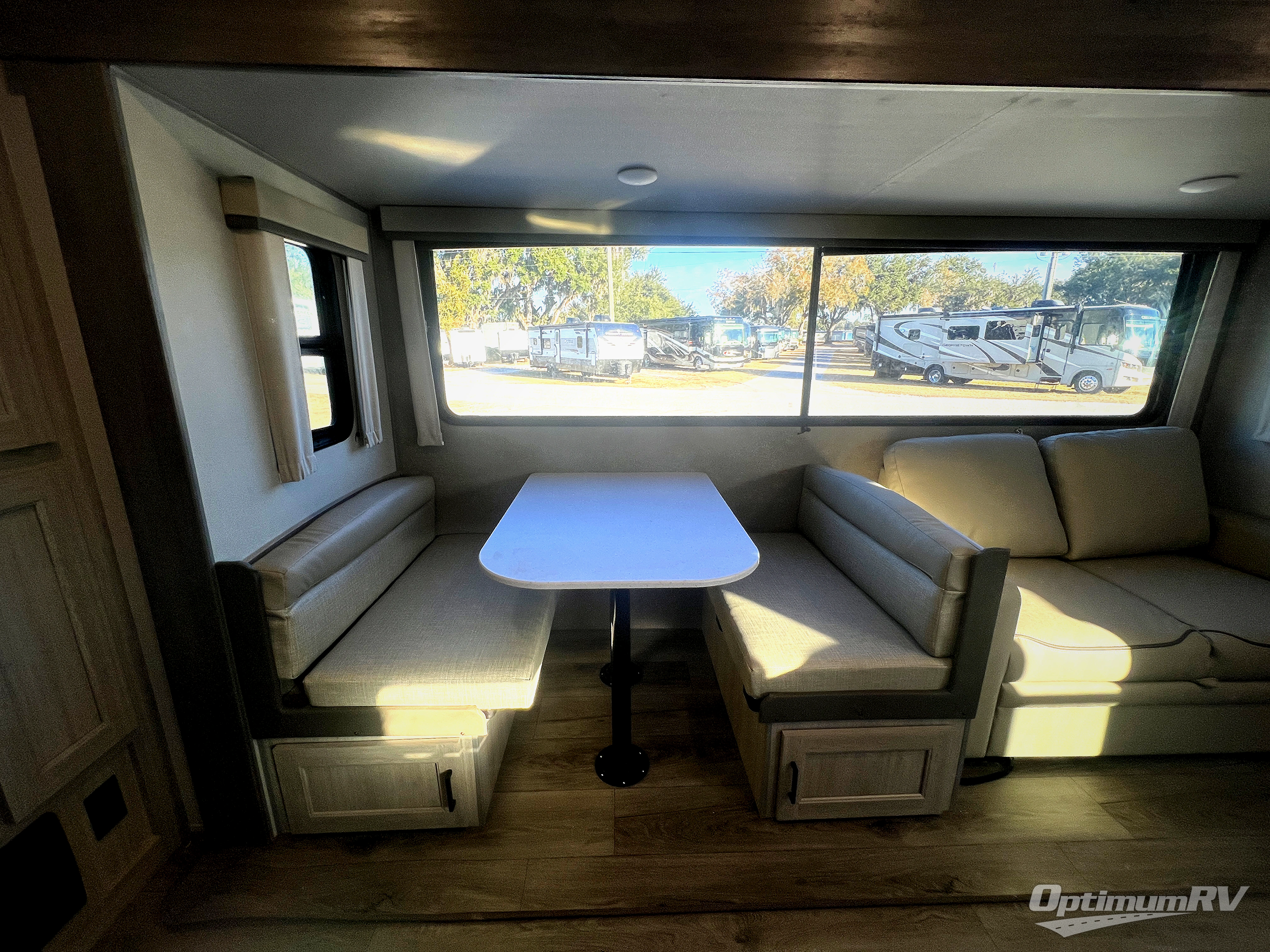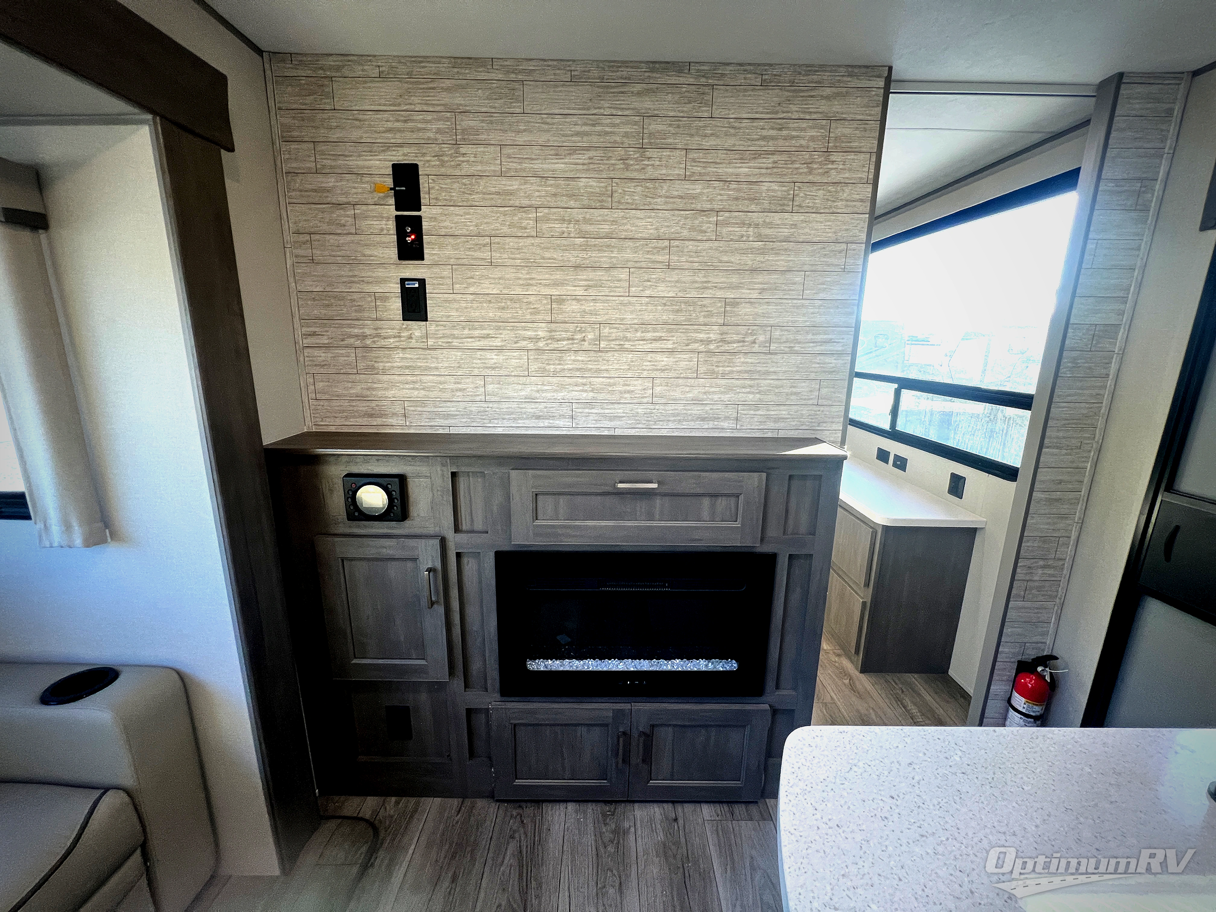 This family-friendly trailer offers lots of floor space thanks to the triple slides throughout! You and your family will love the combined living and kitchen area with a slide out booth dinette and a sofa with drink holders. The L-shaped kitchen counter allows the cook to make meals without moving for anyone trying to get to the full bathroom or the rear bunkhouse. The kids will have their own privacy, two bunk beds, a jack knife sofa with storage totes below plus a TV/wardrobe cabinet. The front private bedroom allows you to sleep like royalty and offers a large closet for your clothing and another closet prepped for a washer/dryer. And don't forget about the full-size camper kitchen and the 21' power awning with multicolor LED lights when you are outside.