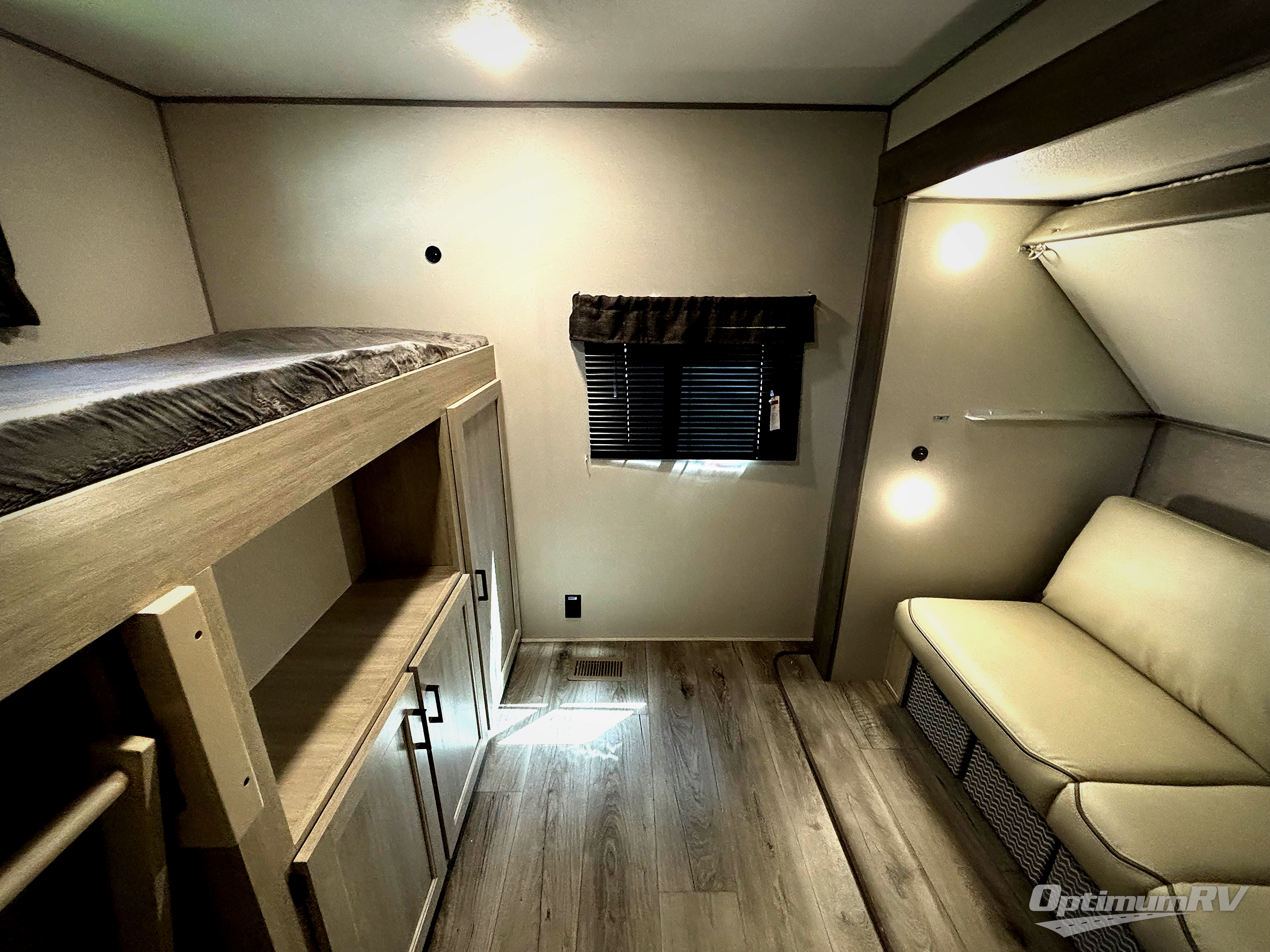 This family-friendly trailer offers lots of floor space thanks to the triple slides throughout! You and your family will love the combined living and kitchen area with a slide out booth dinette and a sofa with drink holders. The L-shaped kitchen counter allows the cook to make meals without moving for anyone trying to get to the full bathroom or the rear bunkhouse. The kids will have their own privacy, two bunk beds, a jack knife sofa with storage totes below plus a TV/wardrobe cabinet. The front private bedroom allows you to sleep like royalty and offers a large closet for your clothing and another closet prepped for a washer/dryer. And don't forget about the full-size camper kitchen and the 21' power awning with multicolor LED lights when you are outside.