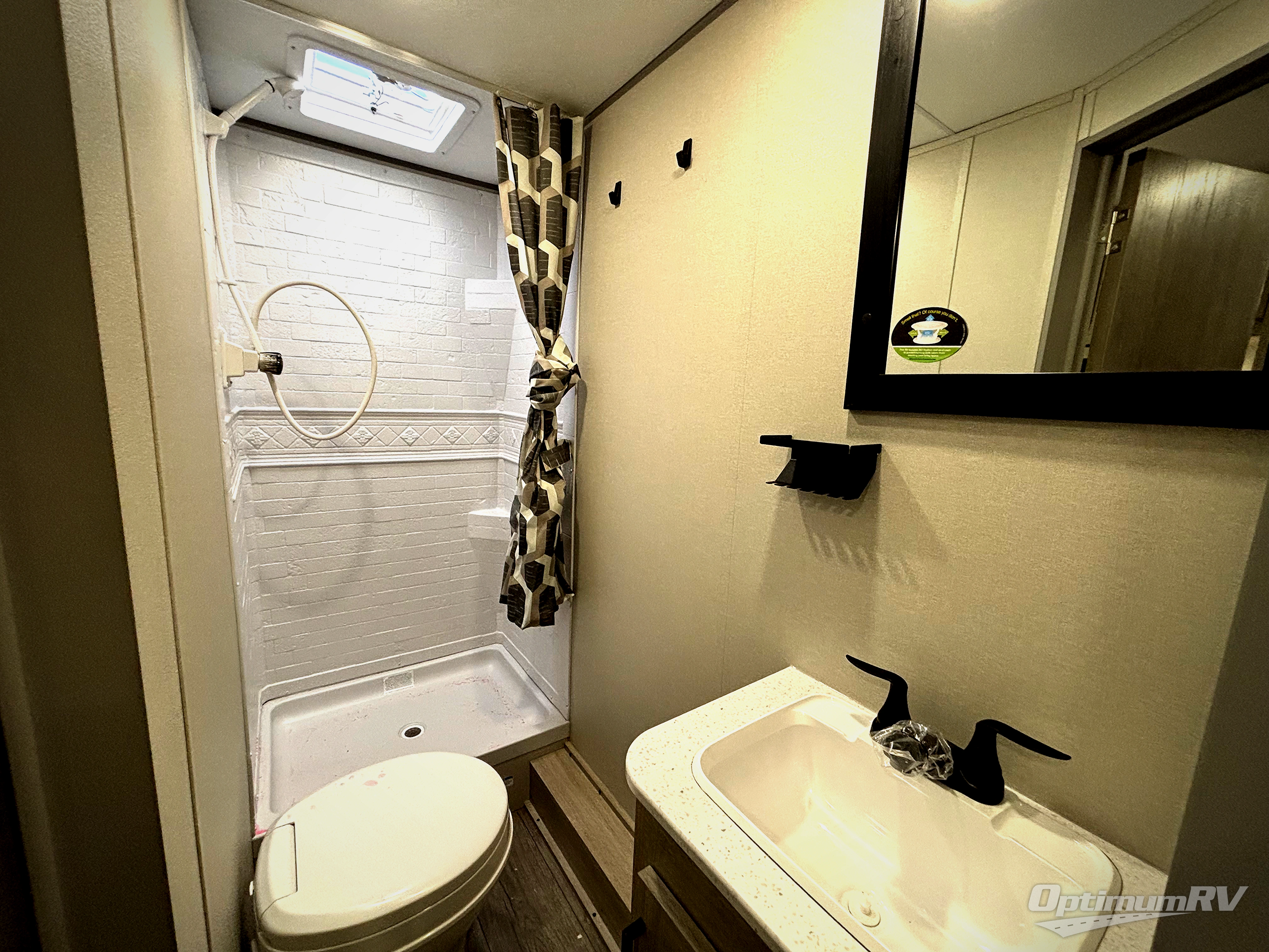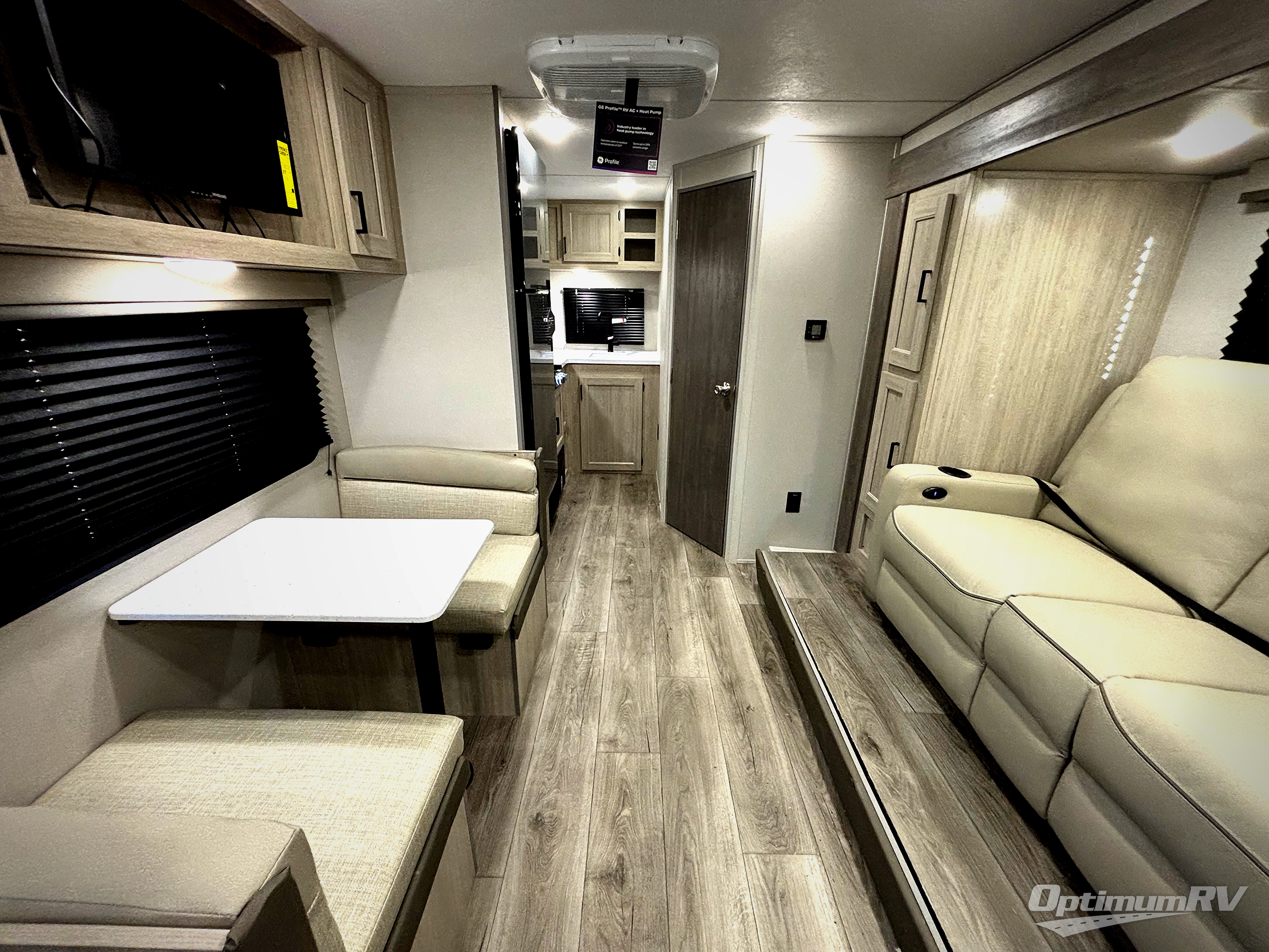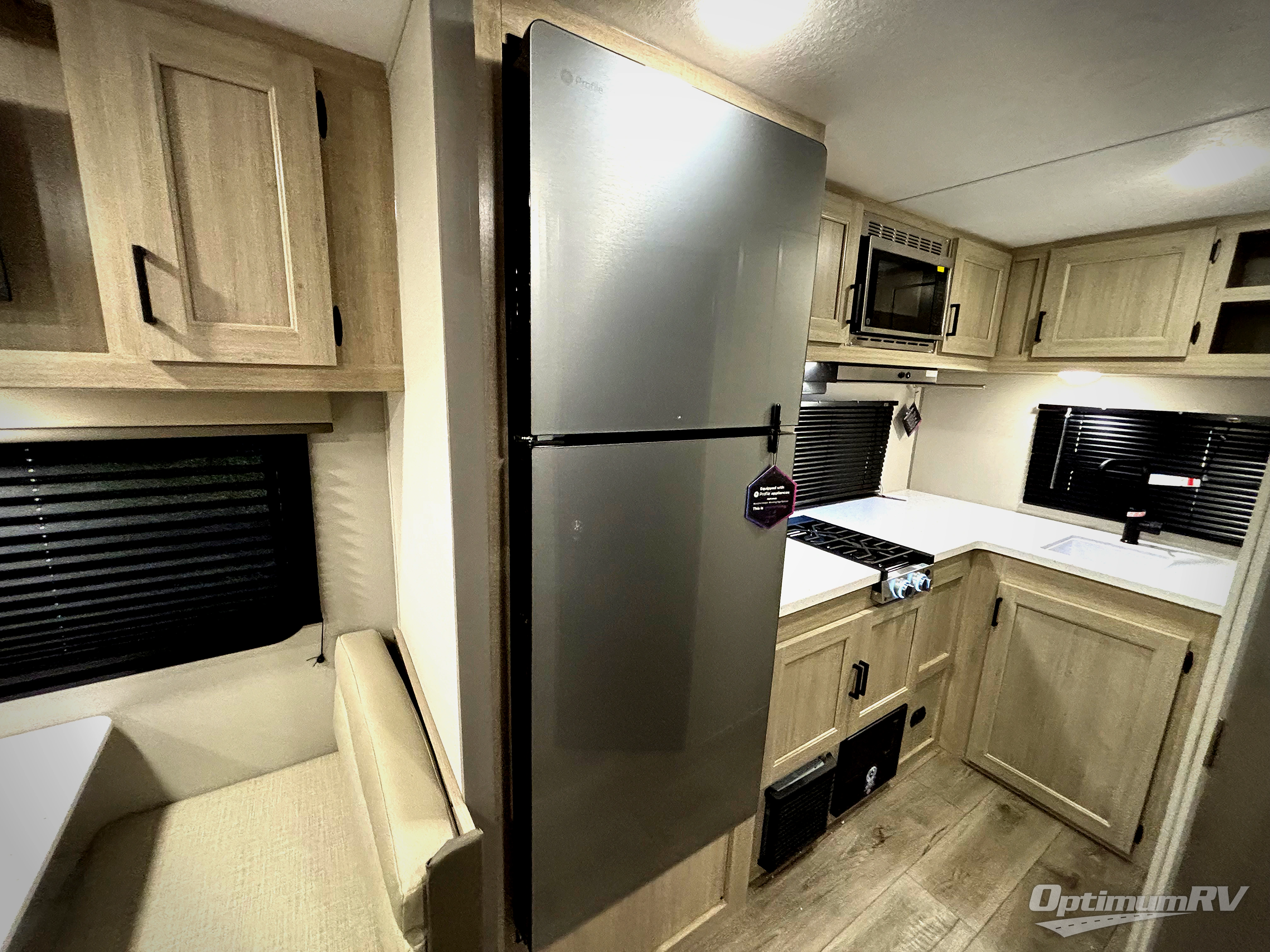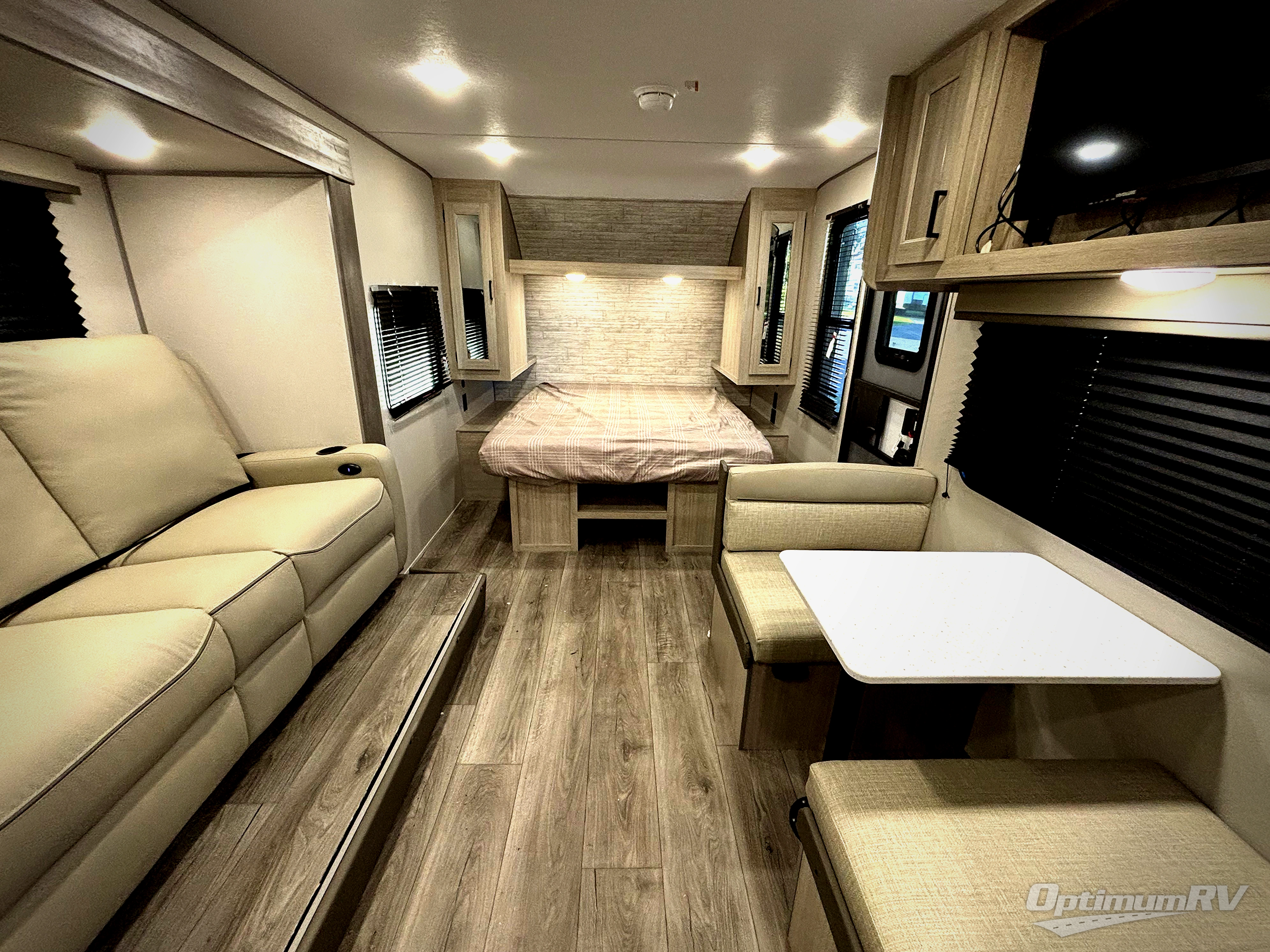 You will love how conventional this travel trailer is! If you want to travel for just a weekend or even more, you won't have to worry since you have all the amenities you need. This model has a queen bed with dual end wardrobes for some extra storage so you can neatly store your clothes. There is also a slide with theater seating, and a booth dinette to enjoy your favorite breakfast. A rear corner kitchen features everything you need to cook indoors, or you can head outside to use the outdoor Camper Kitchen with mini fridge and griddle. A rear corner bath features a 24" x 32" shower, toilet and sink. Outside, you'll find a 17' power awning with multicolor LED lights and exterior storage for camp gear.