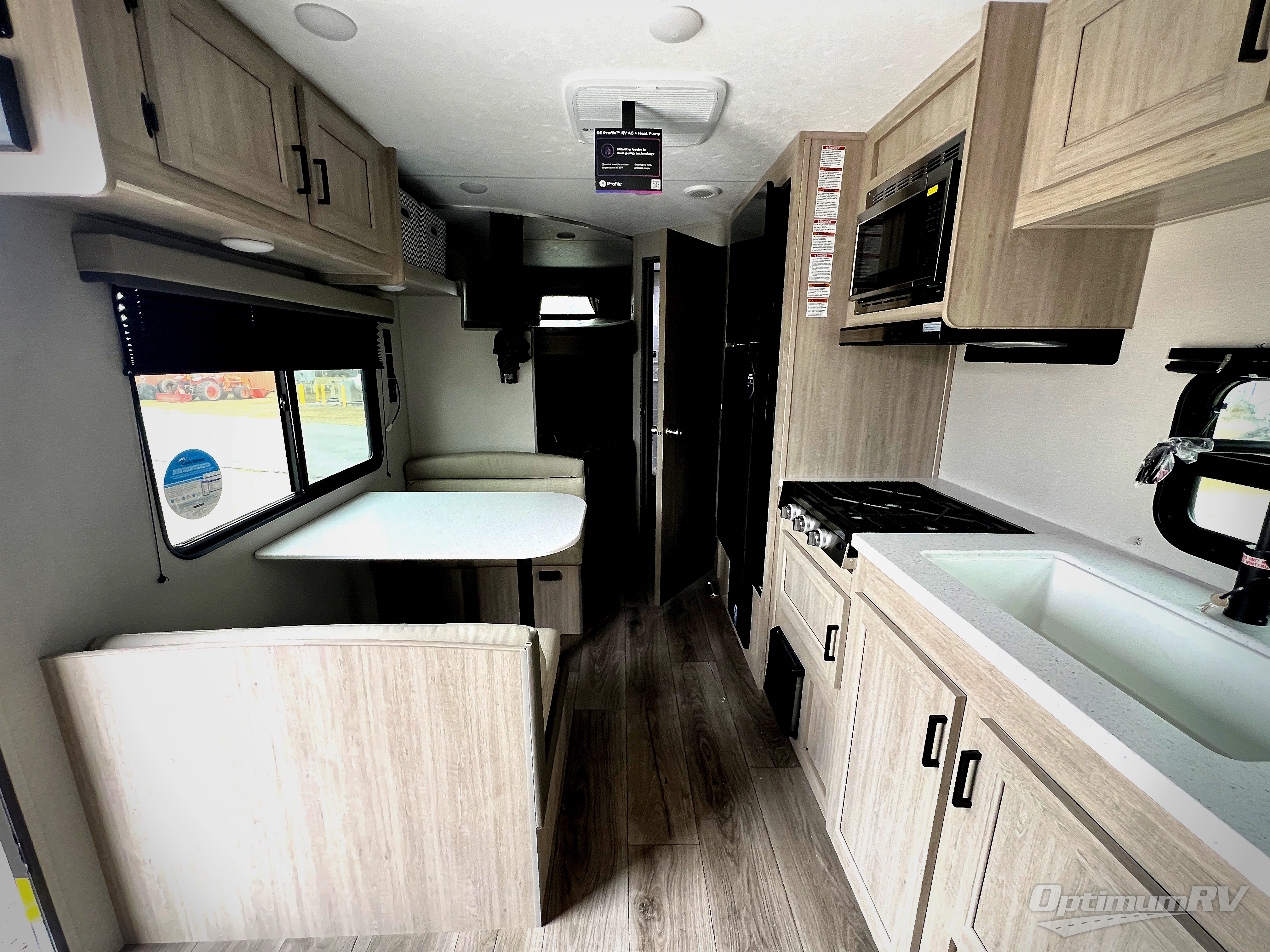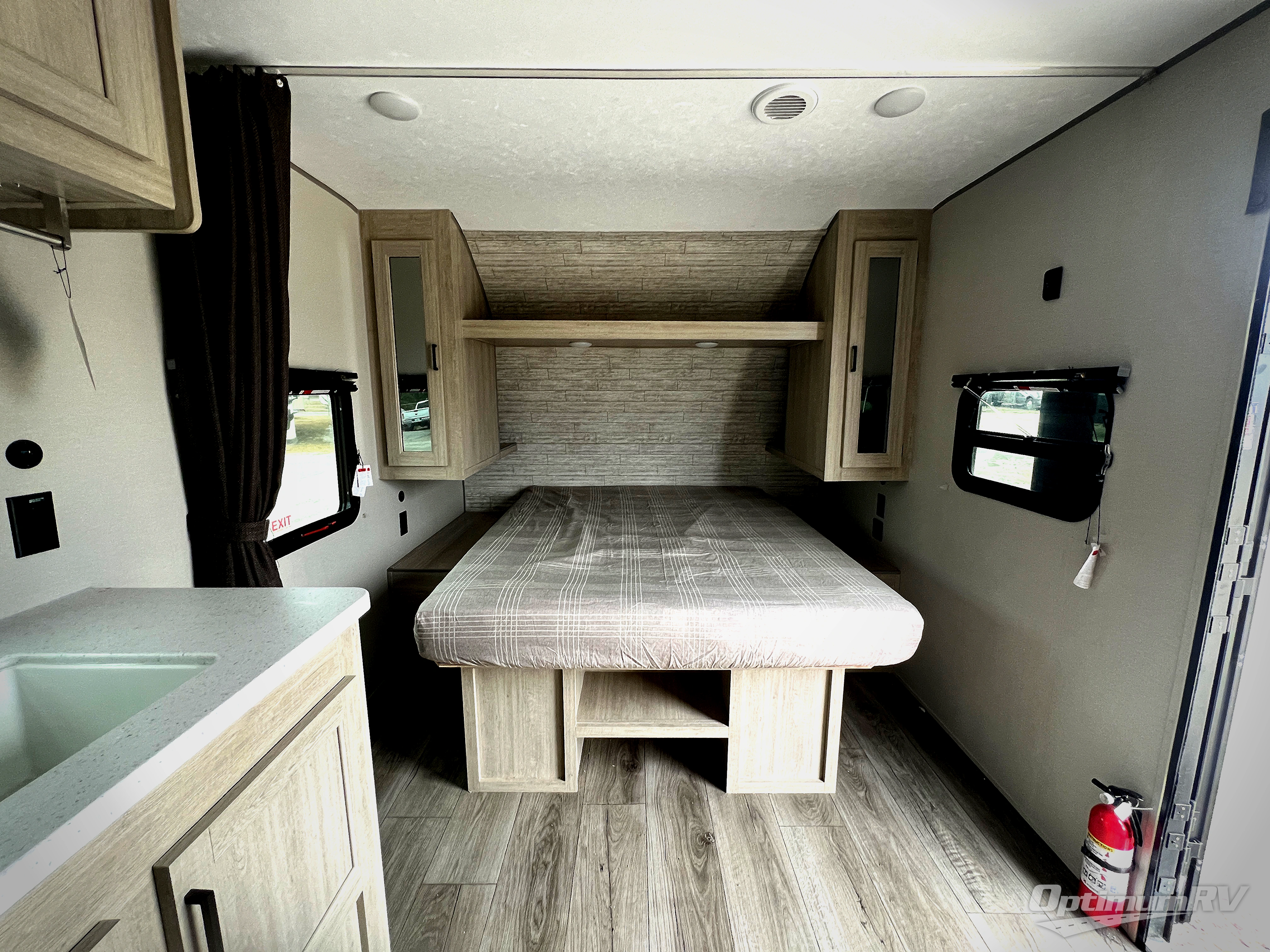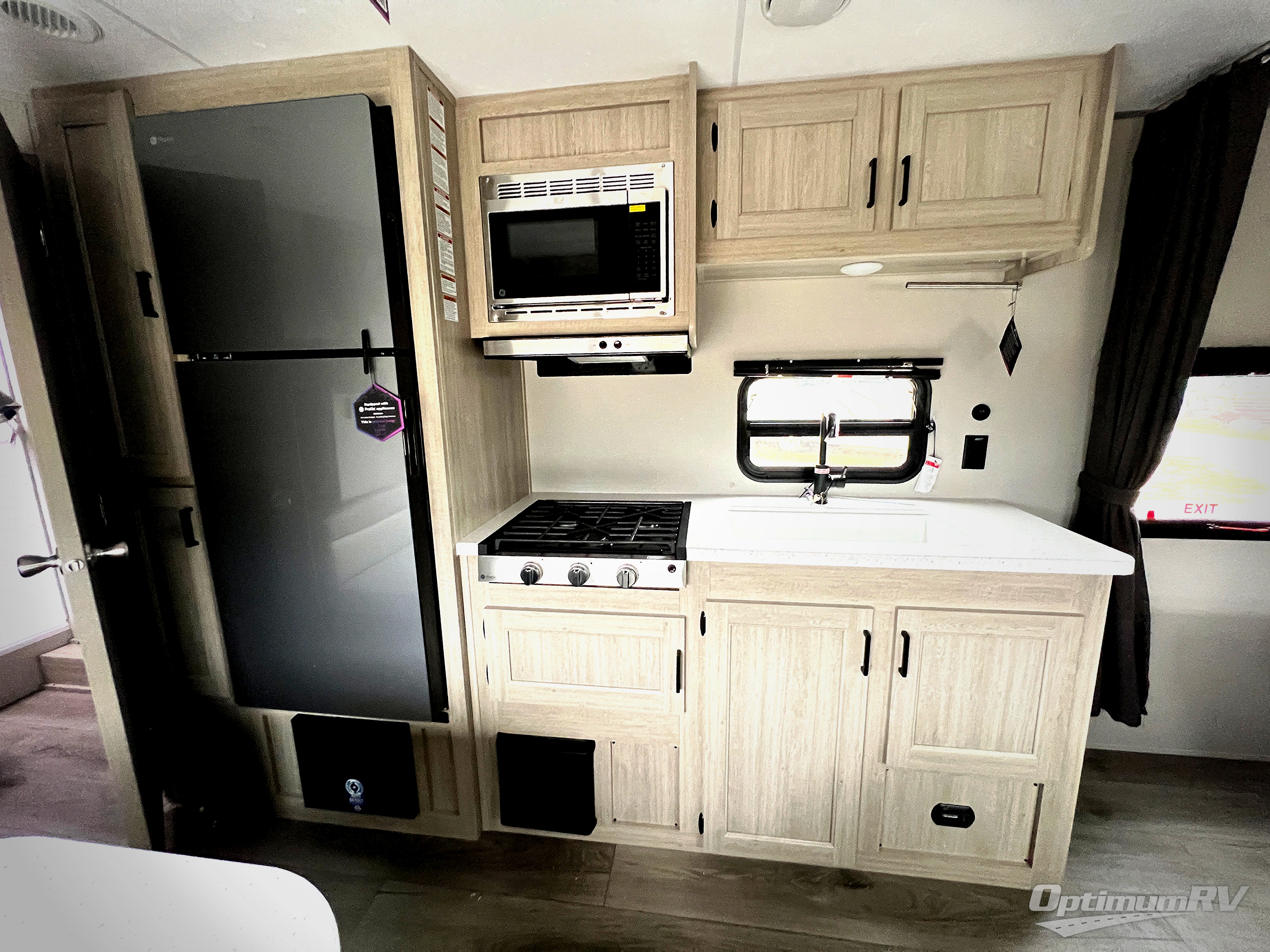 You'll love camping and spending time together in this travel trailer for seven! The bunk beds include under-bunk storage to keep bags out of the way, and the full bath is right next to the bunks for easy nighttime use. A semi-private bedroom up front includes a privacy curtain so you can get dressed each morning, and there are dual wardrobes to keep your things tidy. The chef of your group can whip up breakfast each morning on the three burner cooktop or in the GE stainless microwave, and there is a GE 10.7 cu. ft. 12V refrigerator to keep perishables fresh! A booth dinette provides a place to dine, or you can take your plate outdoors to sit under the 15' power awning with multicolored lights!