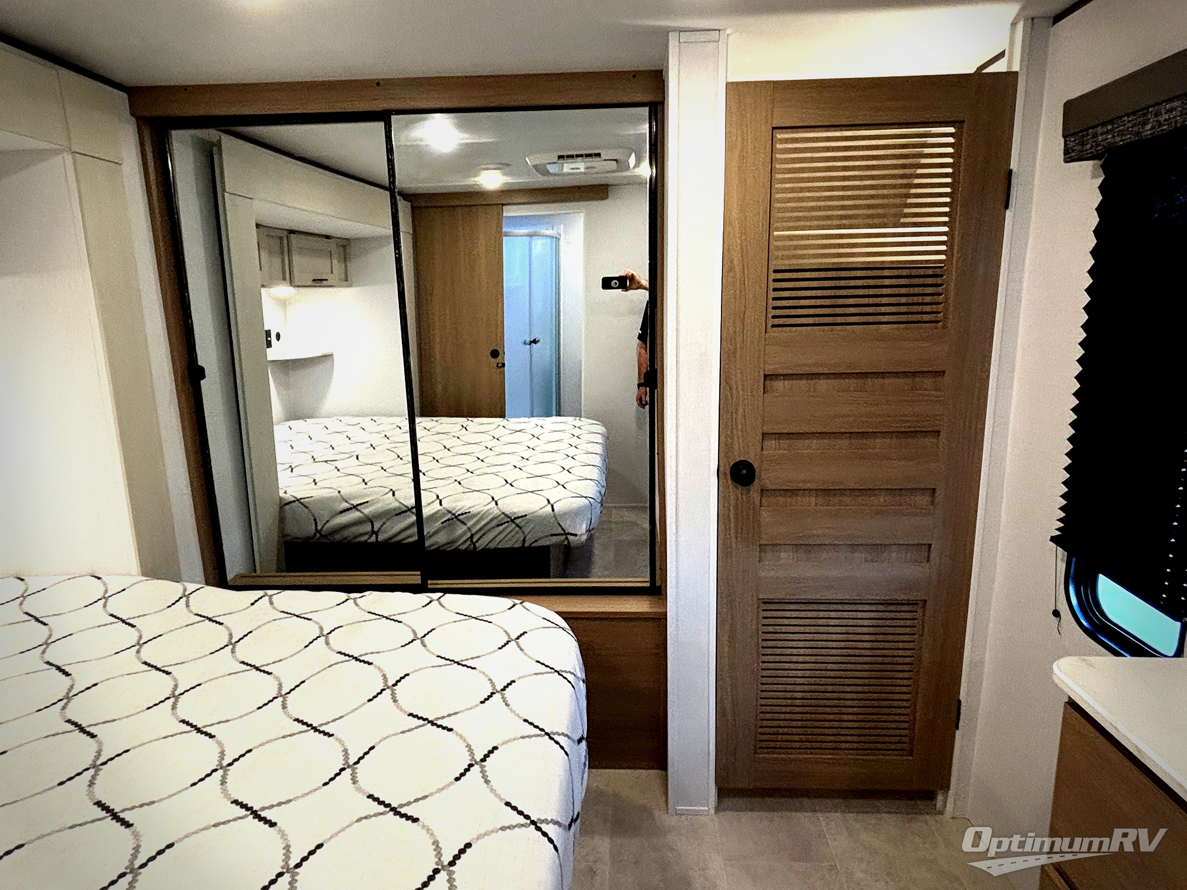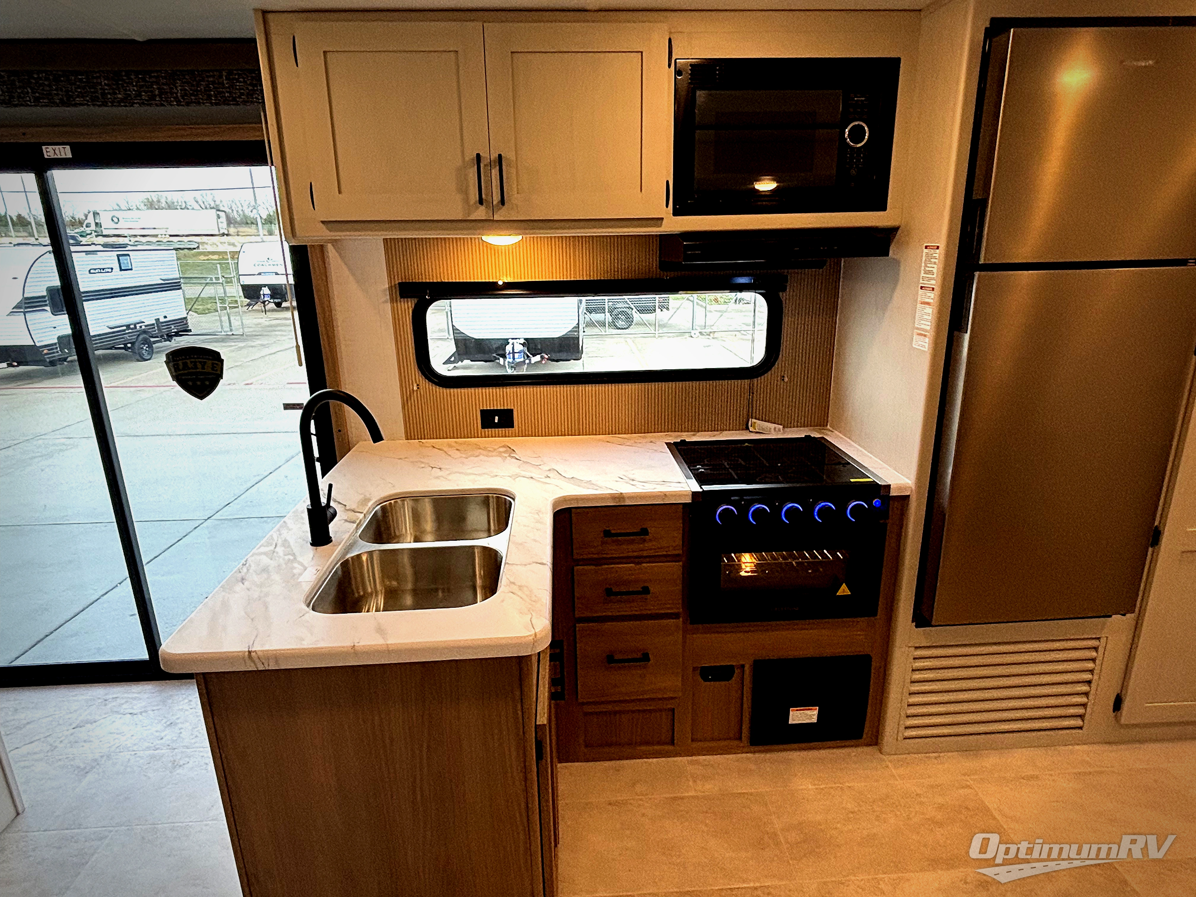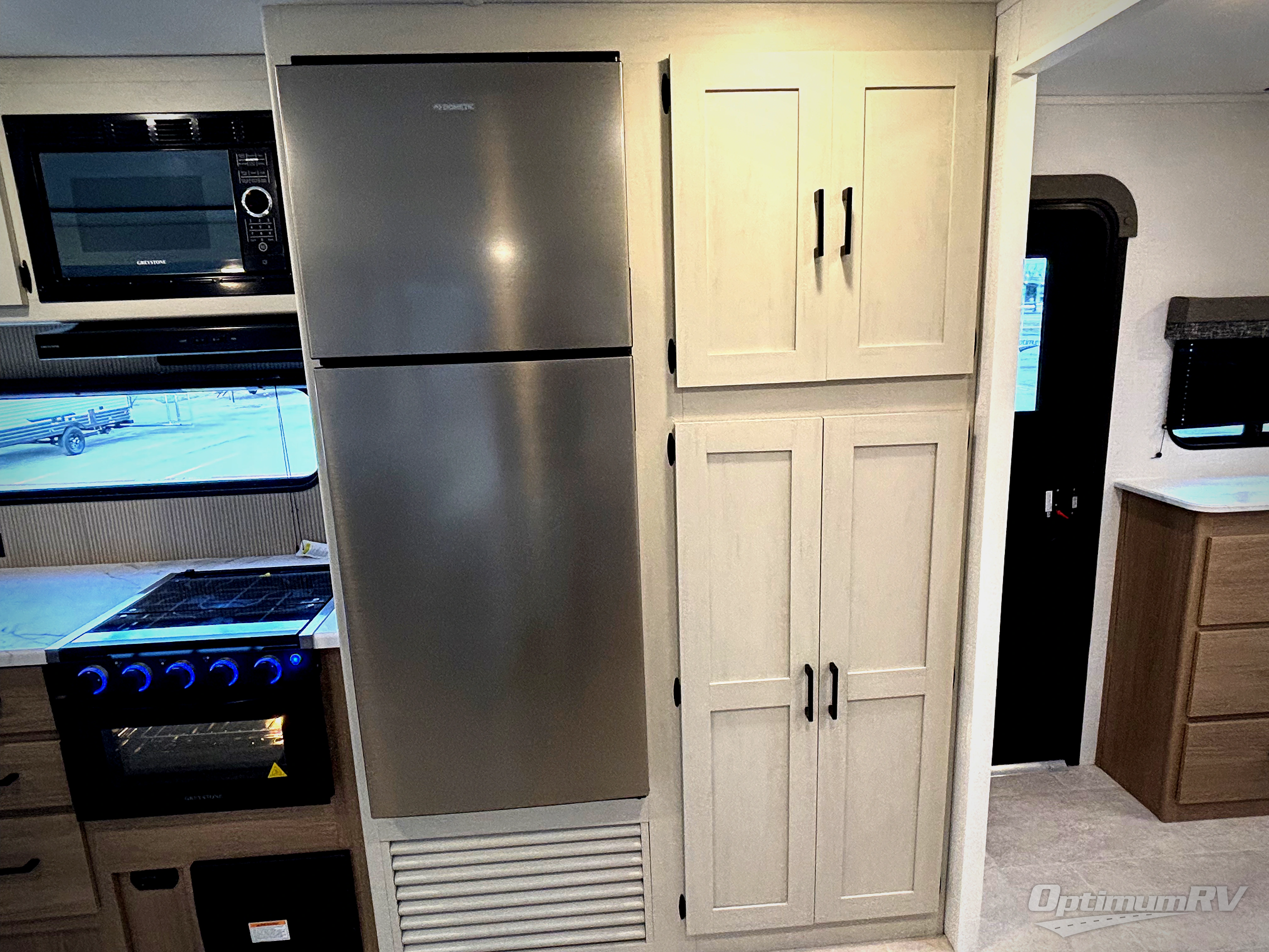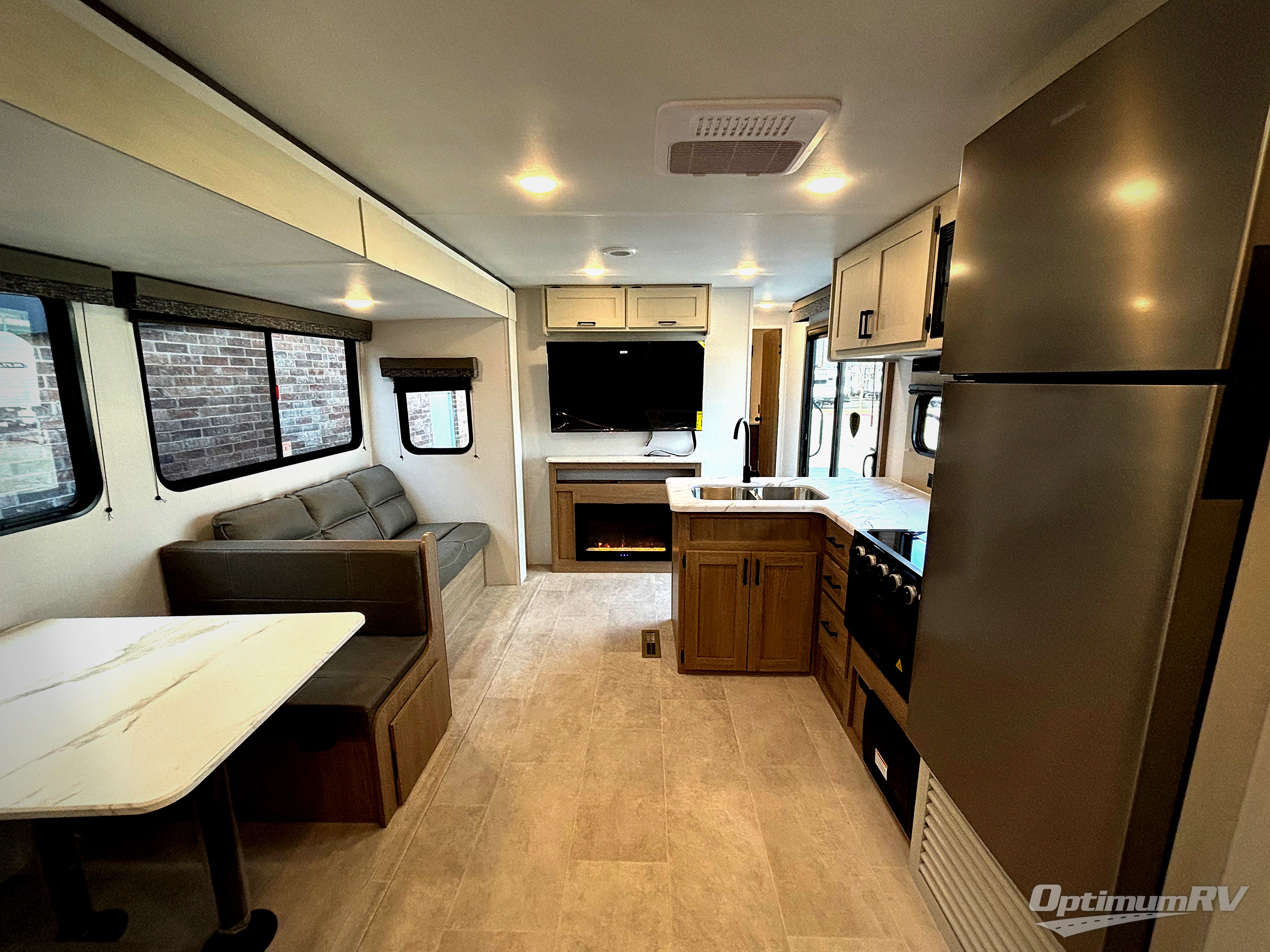 This is the perfect travel trailer if you like to camp with friends! The rear master includes a full rear bath, residential queen bed slide out, dresser, plus one of the dual entry doors. Your guests can sleep in the front master bedroom with a king bed slide out, closet and dresser, plus washer and dryer prep. The combined kitchen and living area will be a favorite hangout spot with its large slide out, tri-fold sofa, booth dinette, and spacious pantry where snacks can be kept stocked! There is even a fireplace to make it cozier!