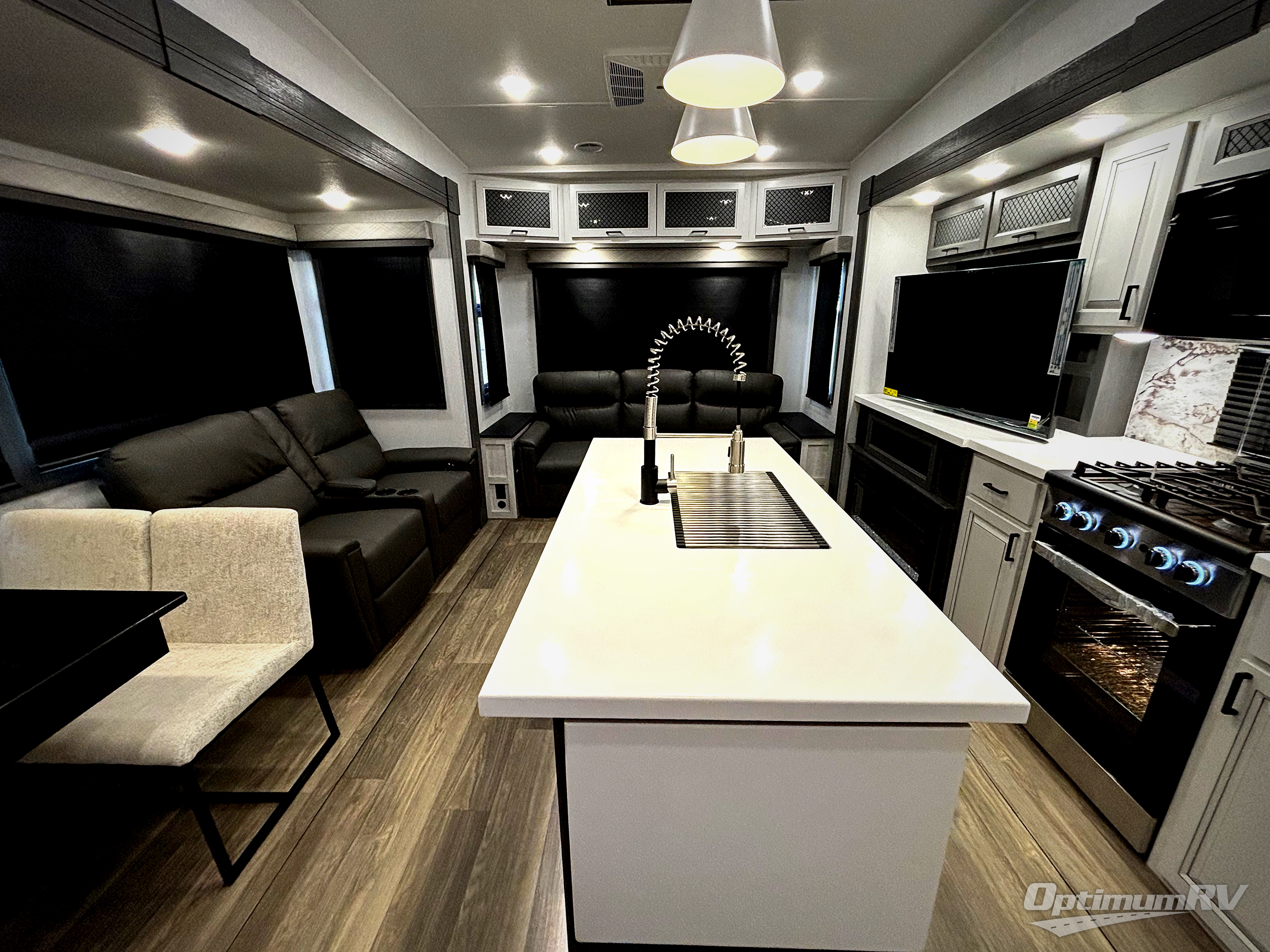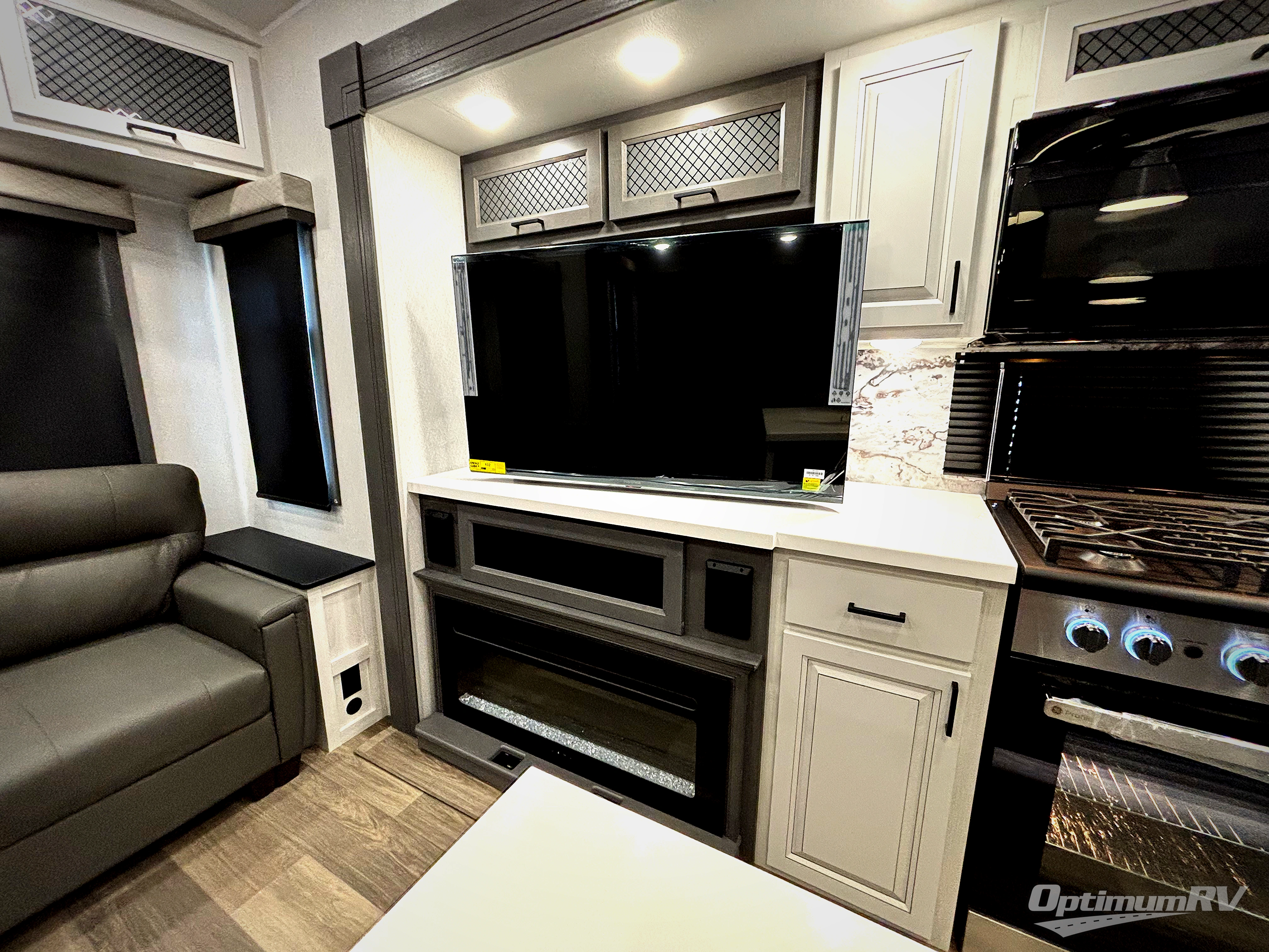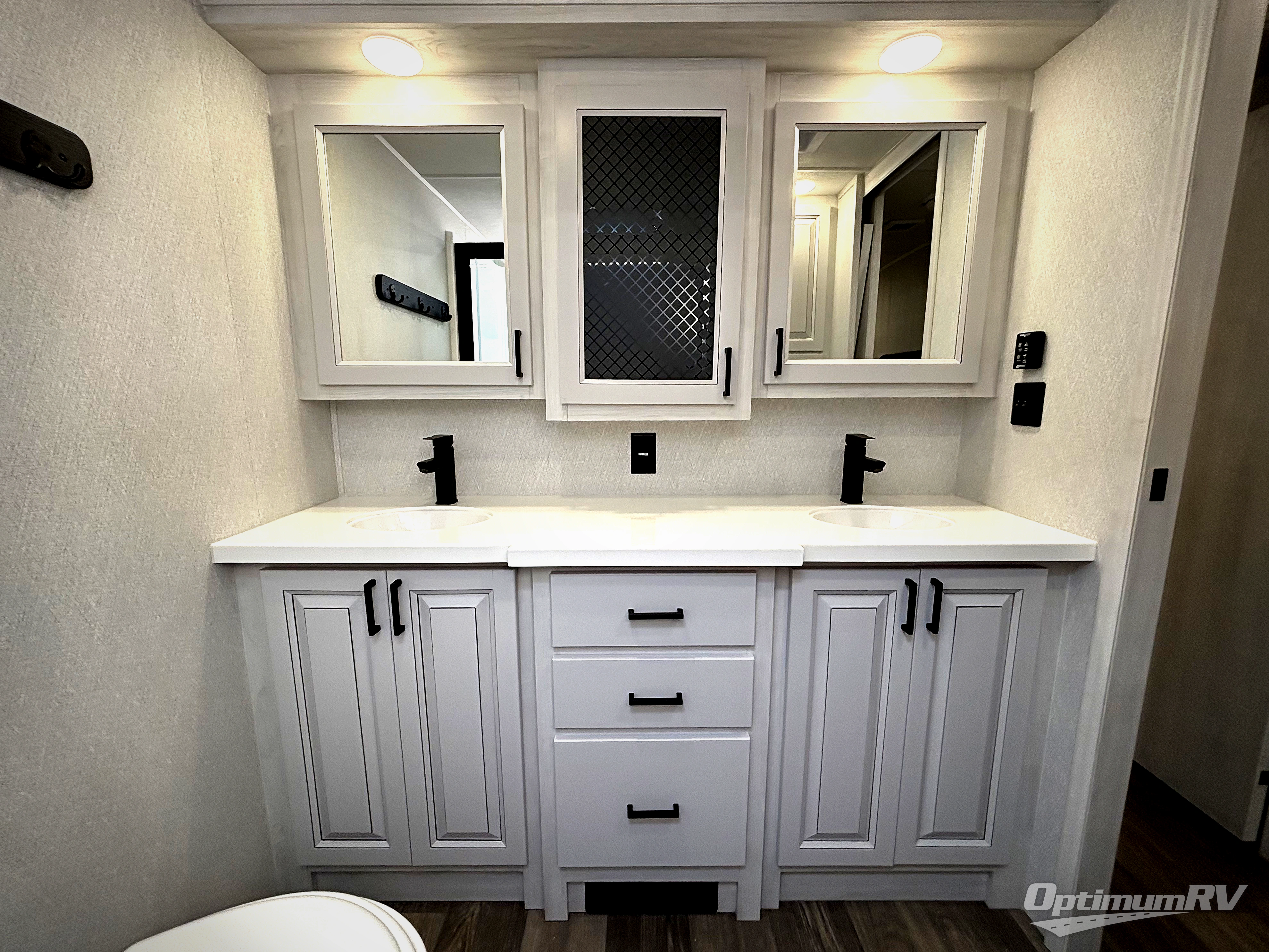 Besides the dimensions and the weights, the only real difference between this Ahara fifth wheel and model 325RL is the bedroom and bathroom configuration. This model offers you a private bedroom that has a king bed slide with drawers under the bed, a sliding dresser top with hidden storage across from the bed, a closet with washer/dryer prep, and a large closet with sliding doors for your clothes. The full bathroom is located right next to the bedroom, and it offers you a dual-sink vanity which is helpful because it allows two people to wash their face and brush their teeth at the same time. The kitchen is quite amazing with its kitchen island with countertop extensions, pantry and hutch, 16-cubic foot 12V refrigerator, and 24" residential oven. As you sit back on the theater seating or 78" sofa, you'll be kept warm by the 5,100 BTU electric fireplace below the TV.