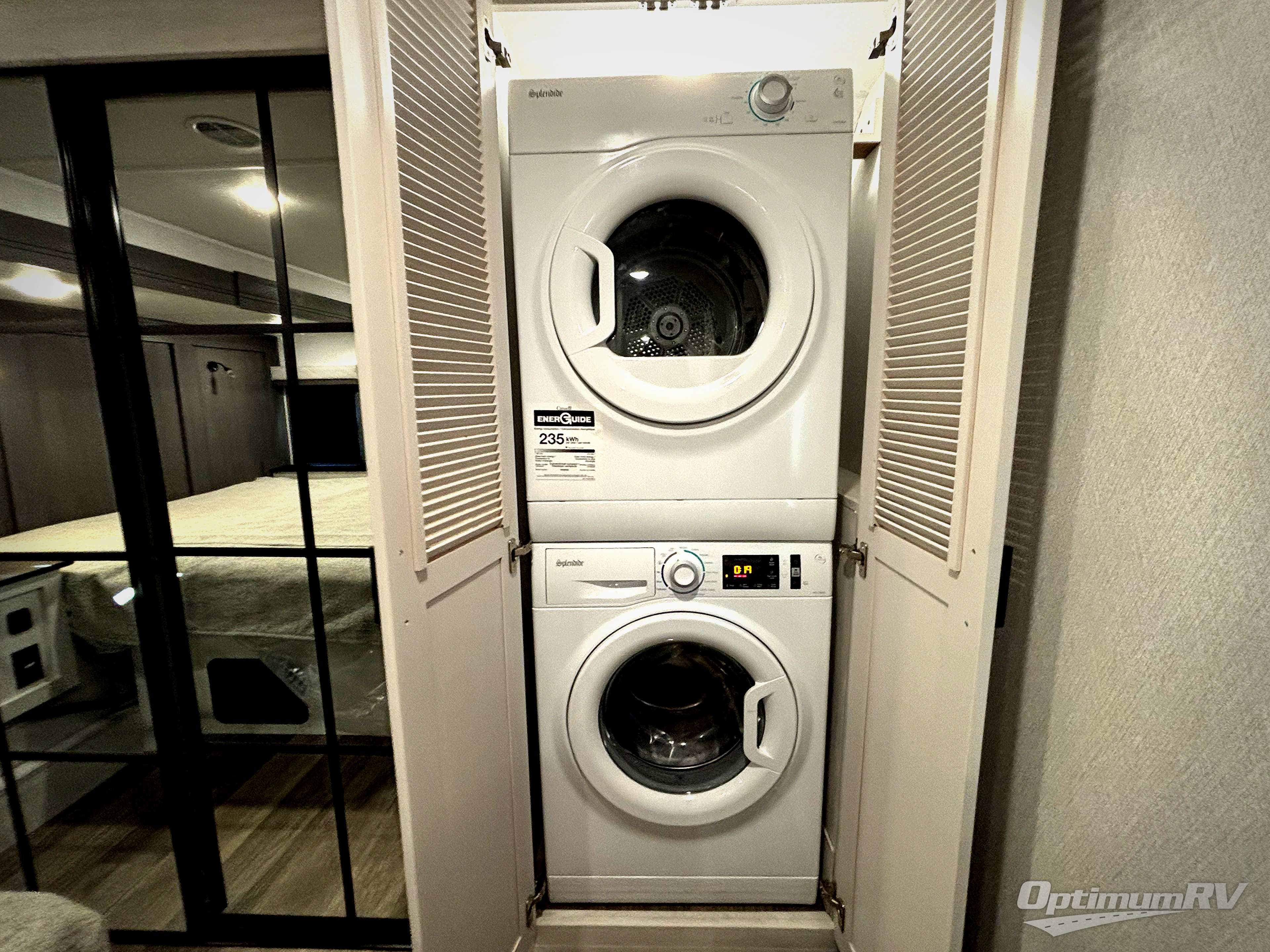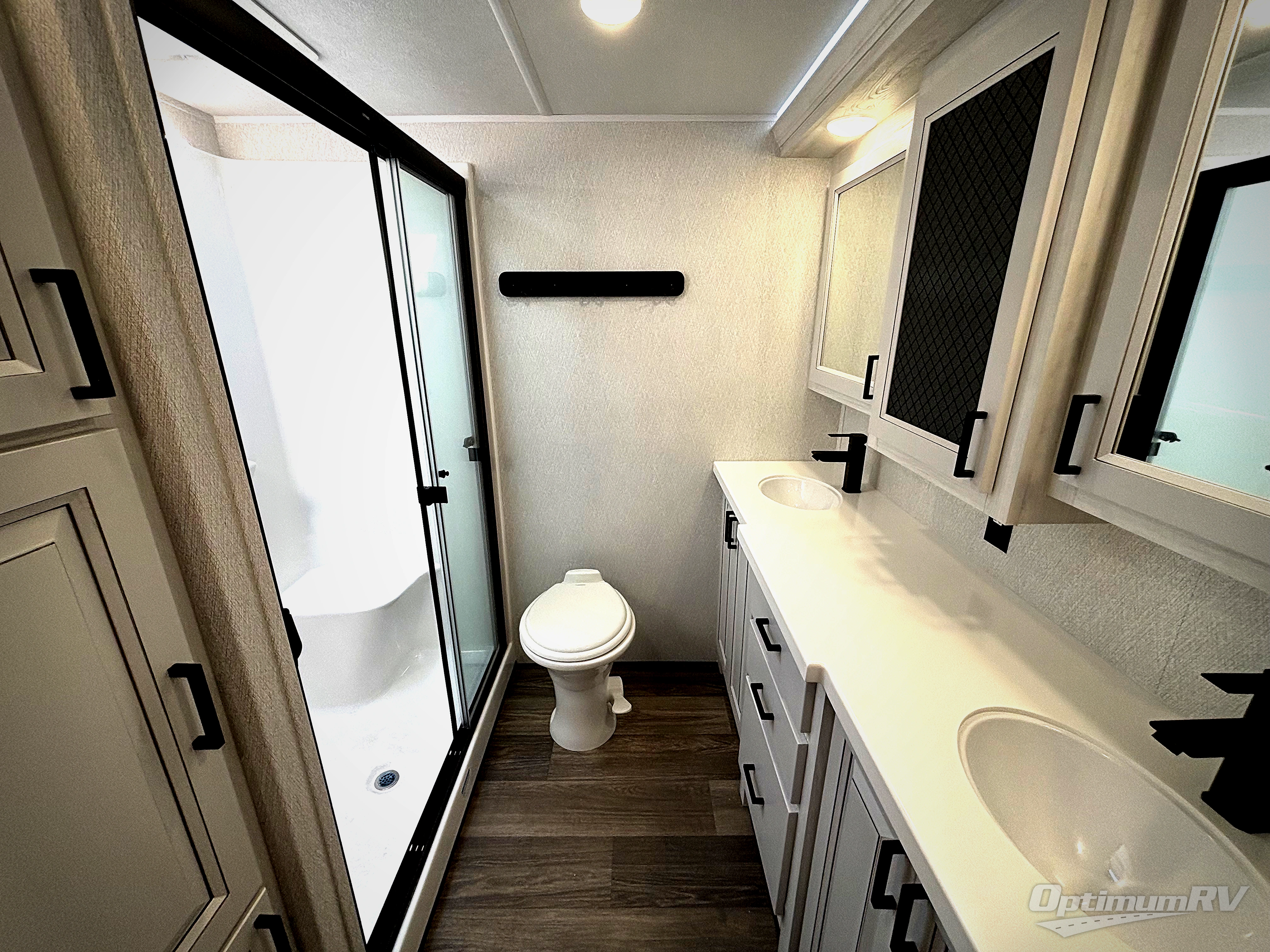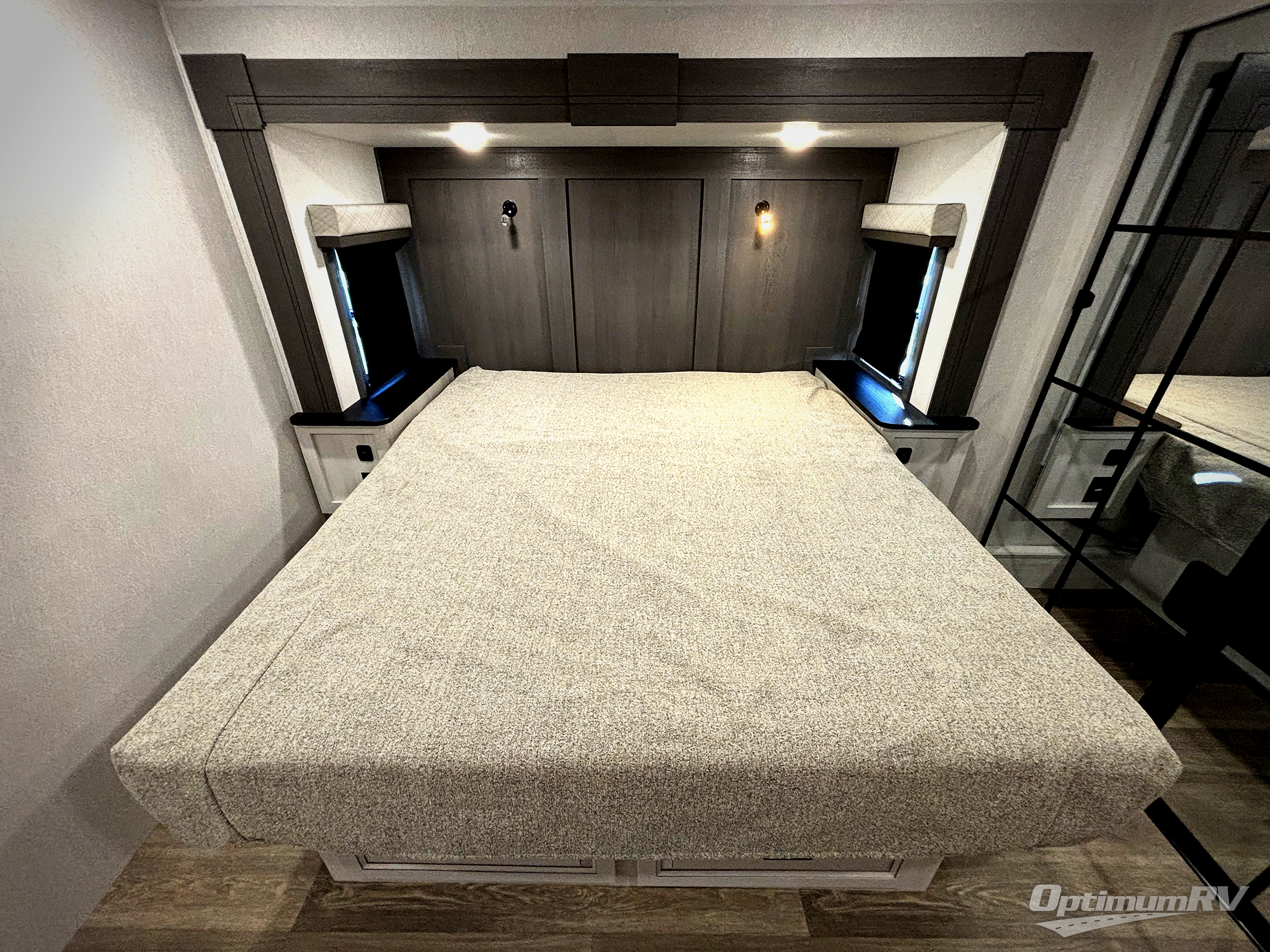 Besides the dimensions and the weights, the only real difference between this Ahara fifth wheel and model 325RL is the bedroom and bathroom configuration. This model offers you a private bedroom that has a king bed slide with drawers under the bed, a sliding dresser top with hidden storage across from the bed, a closet with washer/dryer prep, and a large closet with sliding doors for your clothes. The full bathroom is located right next to the bedroom, and it offers you a dual-sink vanity which is helpful because it allows two people to wash their face and brush their teeth at the same time. The kitchen is quite amazing with its kitchen island with countertop extensions, pantry and hutch, 16-cubic foot 12V refrigerator, and 24" residential oven. As you sit back on the theater seating or 78" sofa, you'll be kept warm by the 5,100 BTU electric fireplace below the TV.