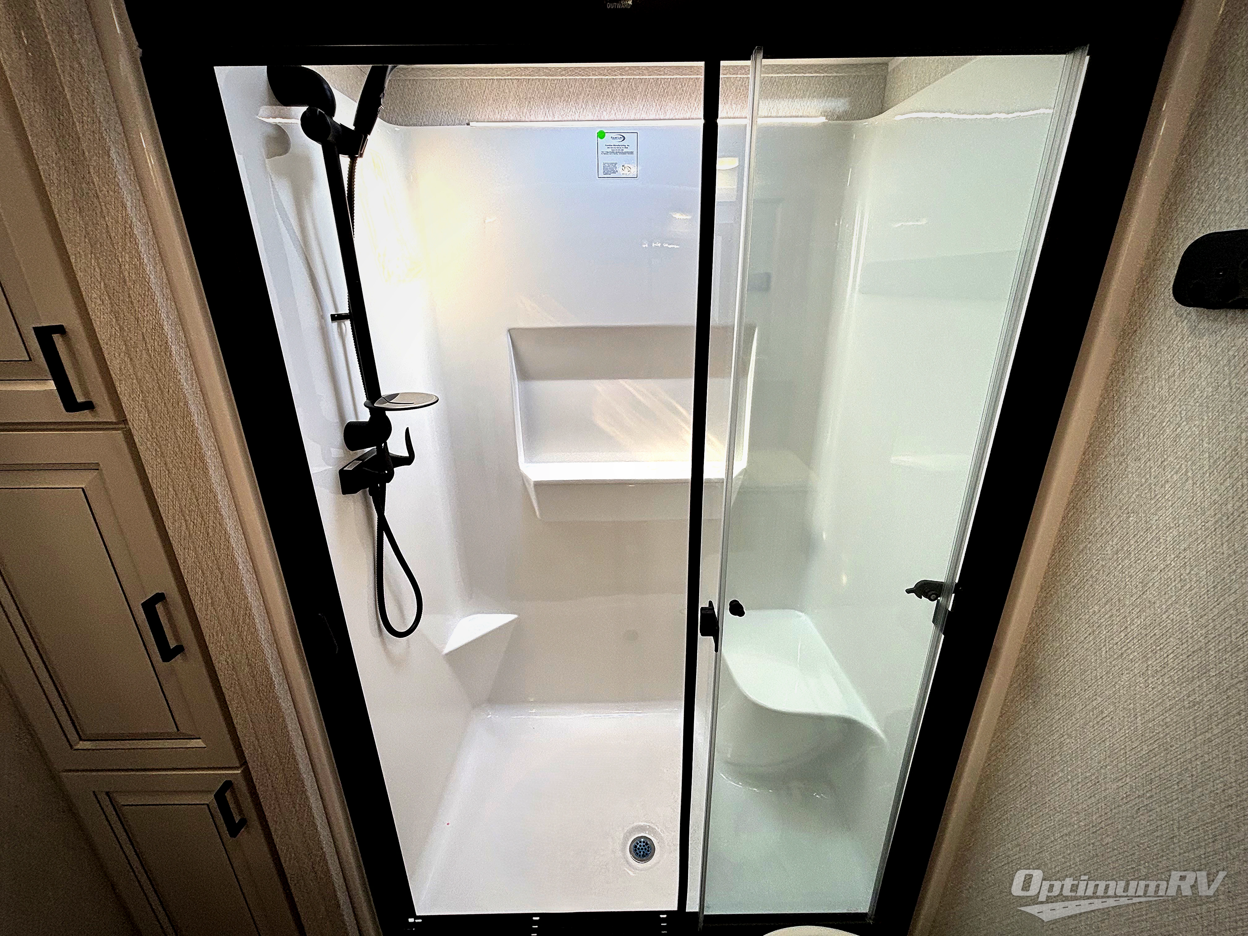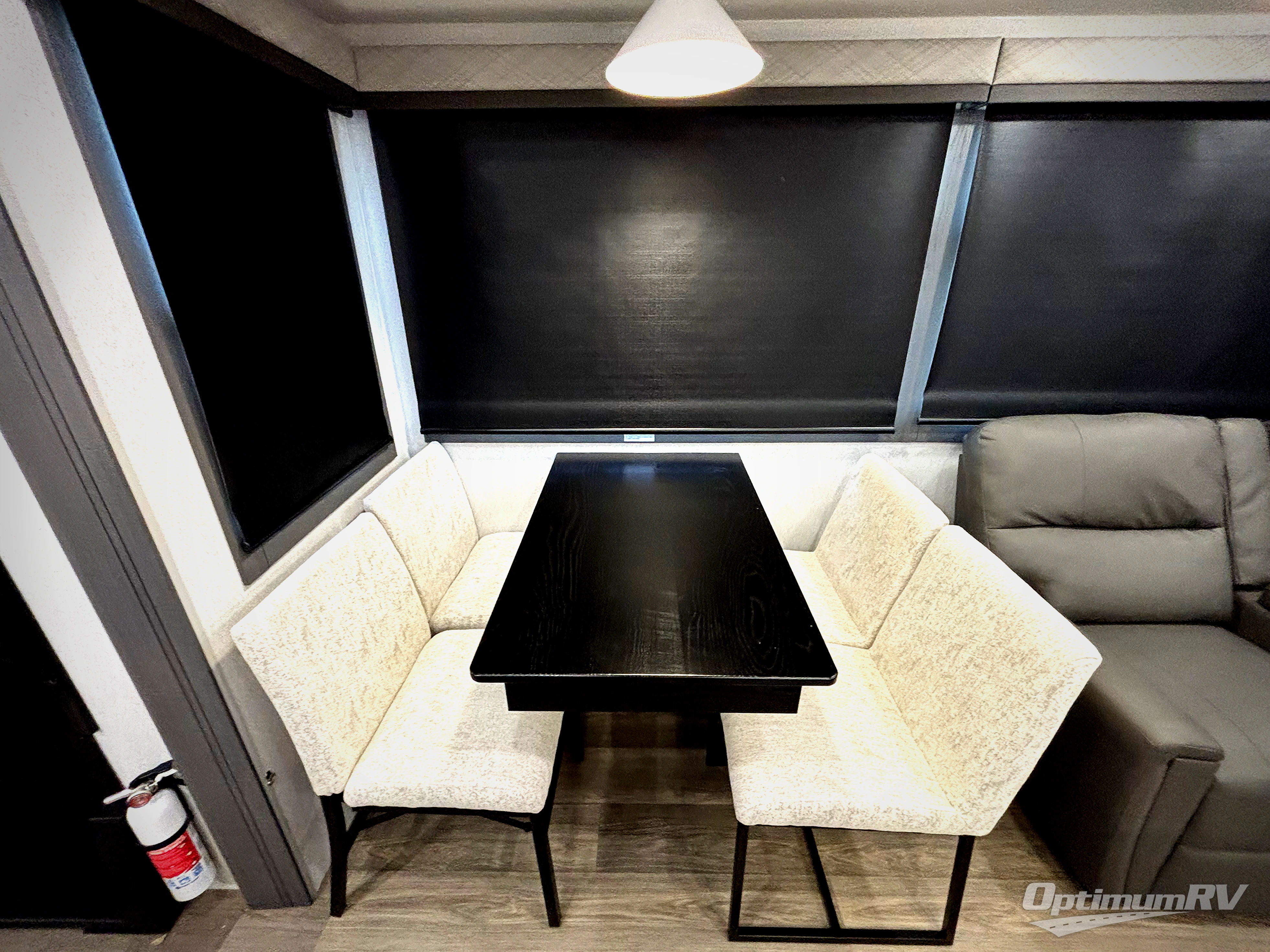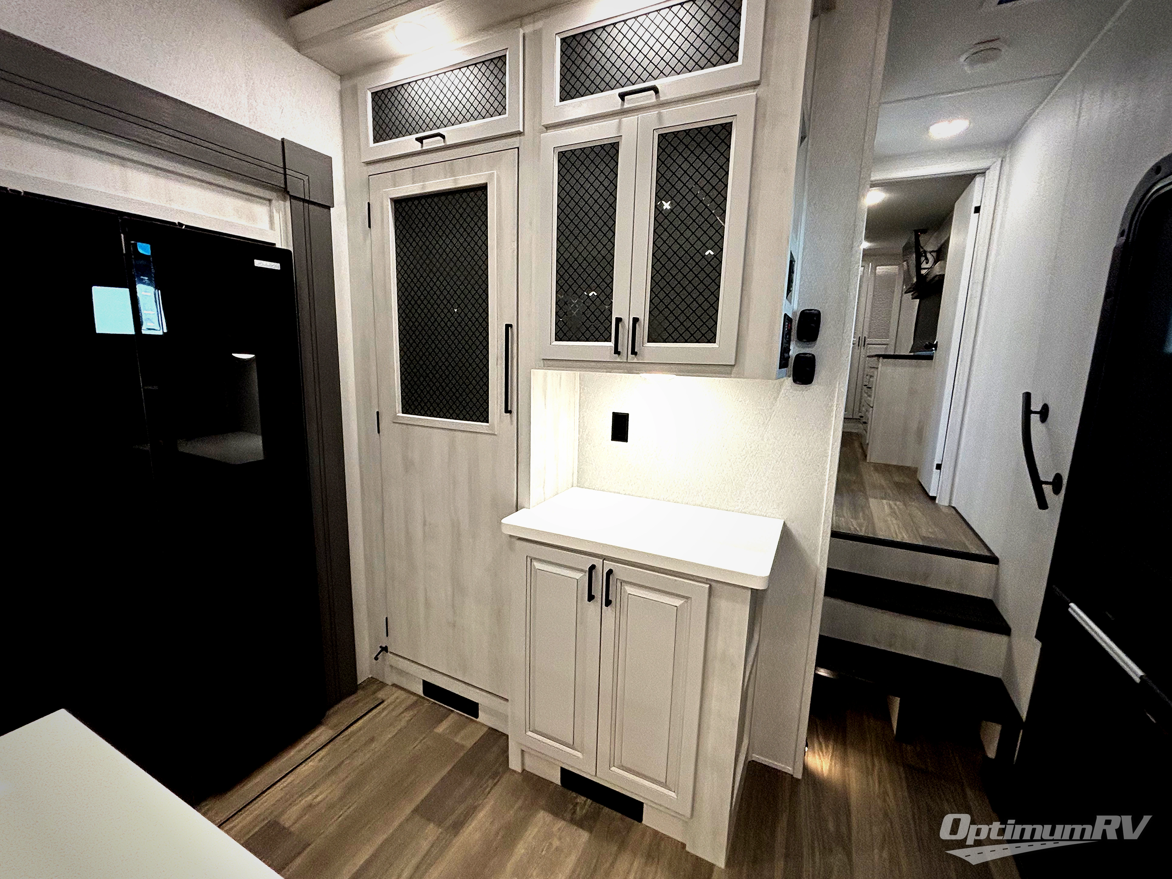 There is just too much luxury to name on the EAST TO WEST Ahara fifth wheel! These units are quite impressive, and once you see them, you'll know what we mean. The Ahara first grabs your attention with its fully painted aerodynamic fiberglass front cap, 102" wide-body chassis, and deep tint square frameless windows. For towing, you'll find a MORryde CRE 3000 suspension, LED marker lights, LED taillights with back-up lights, and rear view camera prep. Traveling in different climates is also made easy with the high-efficiency triple A/C system, 40,000 BTU high-capacity furnace, plus heated, insulated, and enclosed underbelly found within the Climate Package. Head inside to enjoy Slow Rise roller shades, a flush floor kitchen slide to help prevent trips, and solid surface countertops in the kitchen and bath to name a few luxuries!