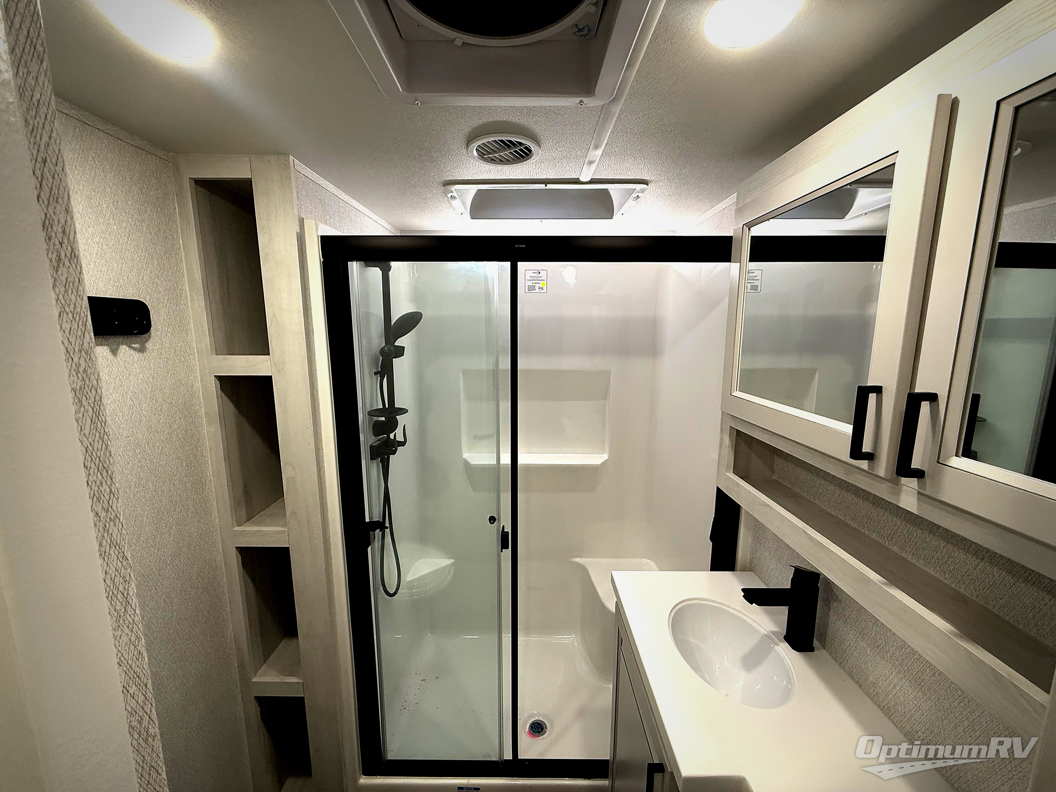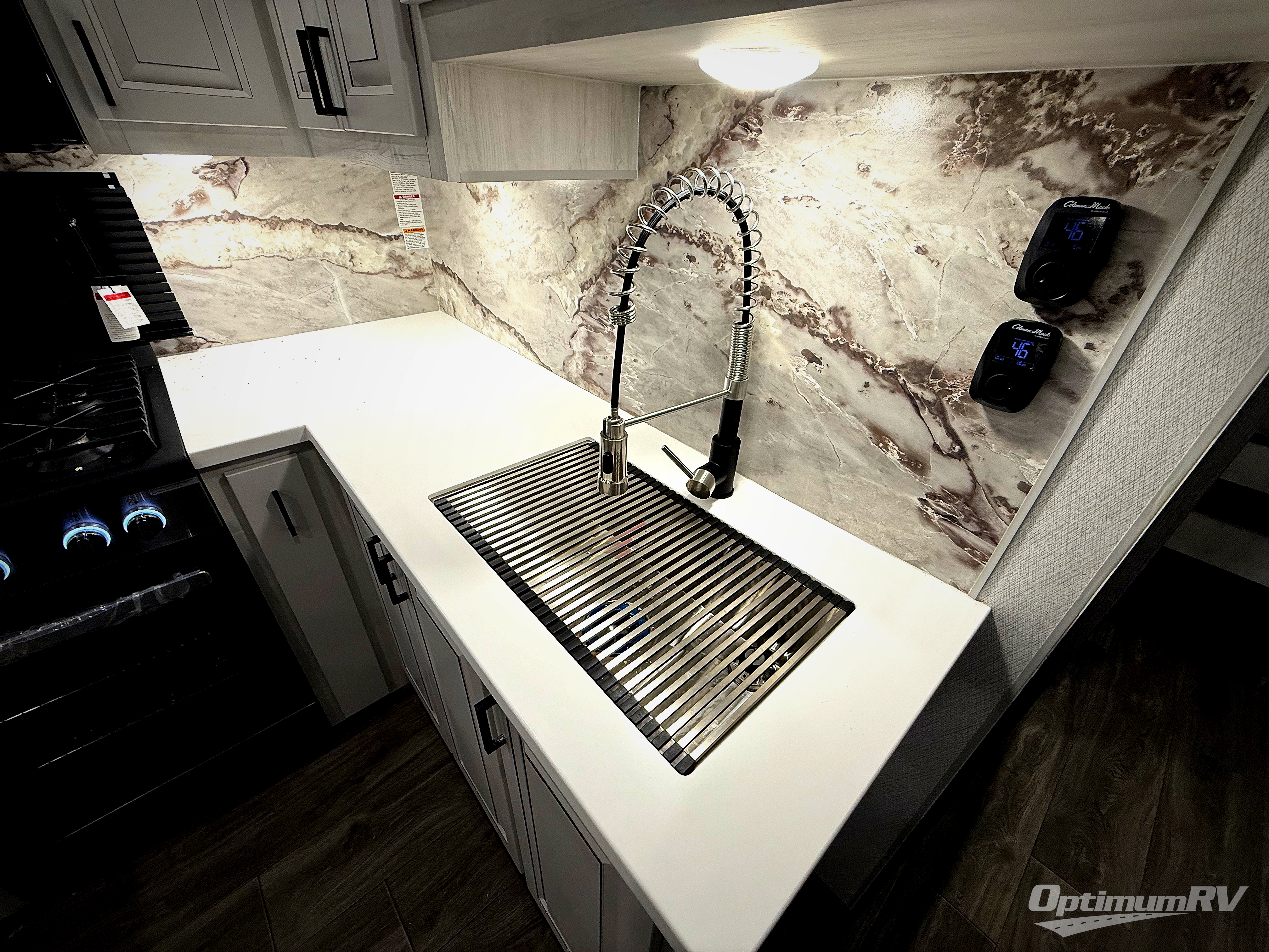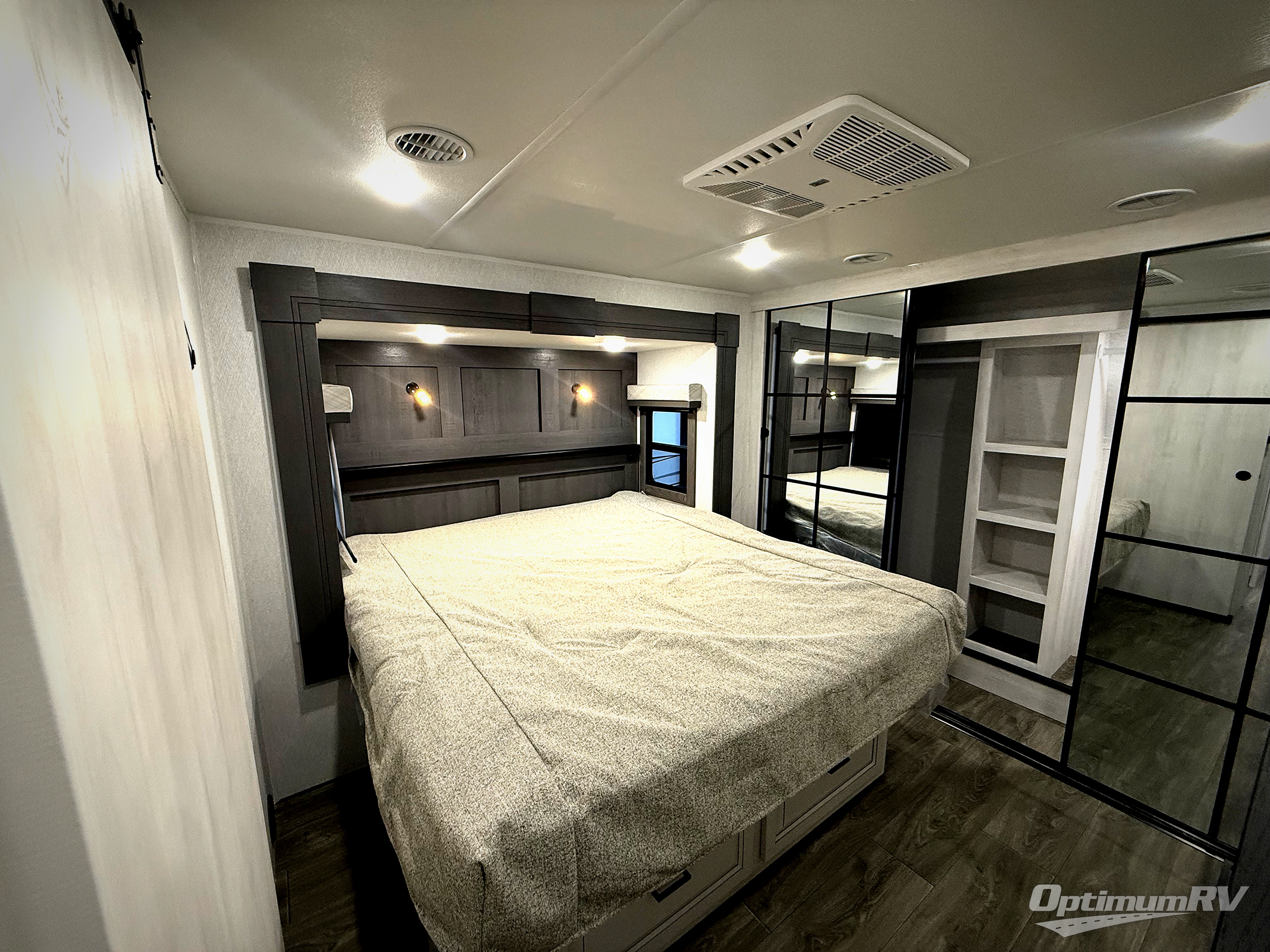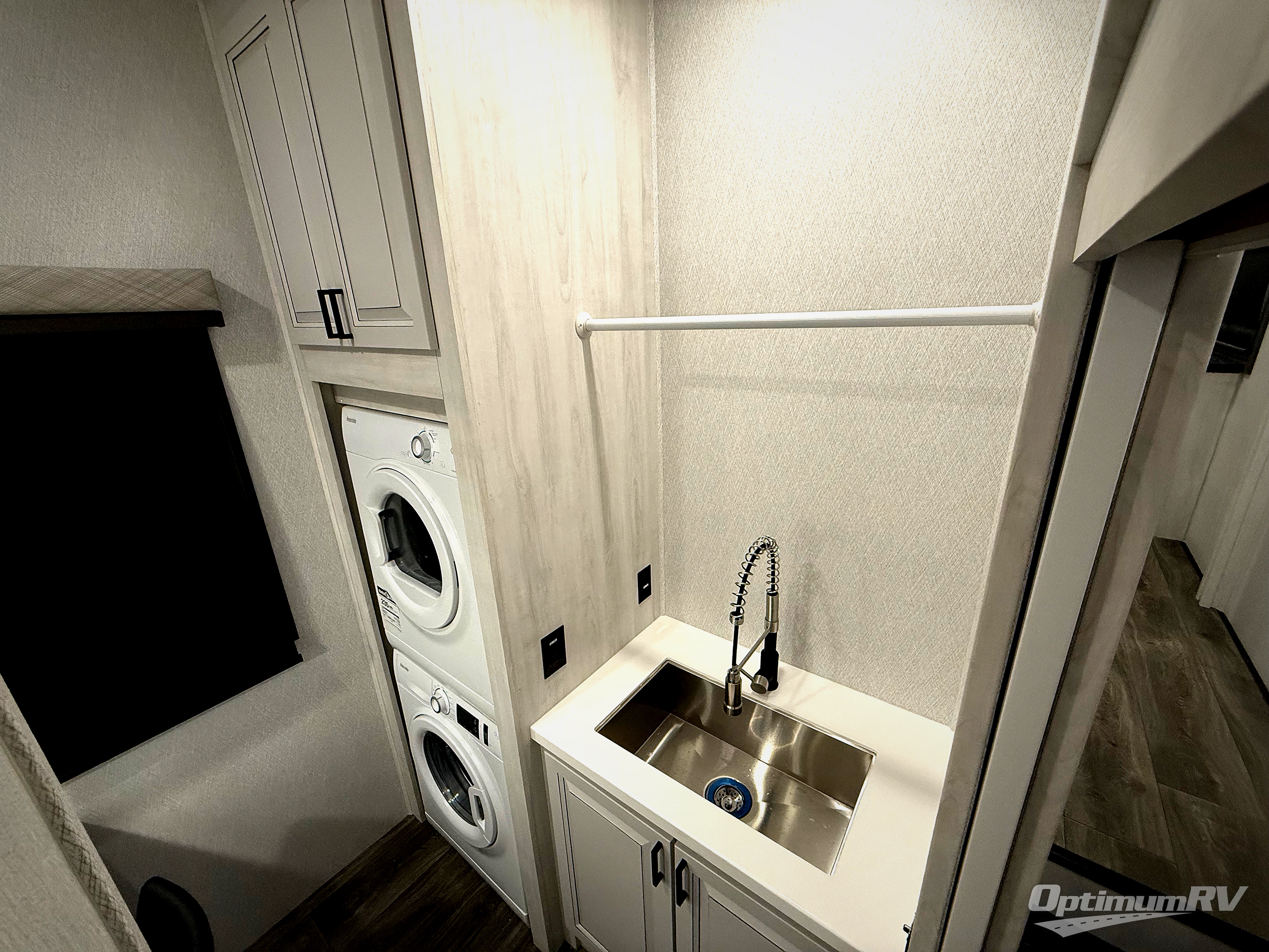 Head to the lake in this spacious fifth wheel for four! You will love the front private bedroom with a king bed slide out, sliding dresser top with hidden storage, and front closet to keep your clothes organized. The full bath is right next to the bedroom for easy access at night, and you're going to love having the utility room in this unit. There is stackable washer and dryer prep, a desk or laundry table, plus a sink with a mirror, making this room multi-functional! A full kitchen includes a u-shaped counter, a four burner range and an over-the-range microwave, plus a 16 cu. ft. refrigerator and walk-in pantry with a coffee bar and shelves. There is also a breakfast bar with seating here where you can visit with the chef while dinner is being made. Last but not least, the rear living area will be a favorite place to hang out with theater seating, a rear 78" EZ out sofa, and a TV with a fireplace!