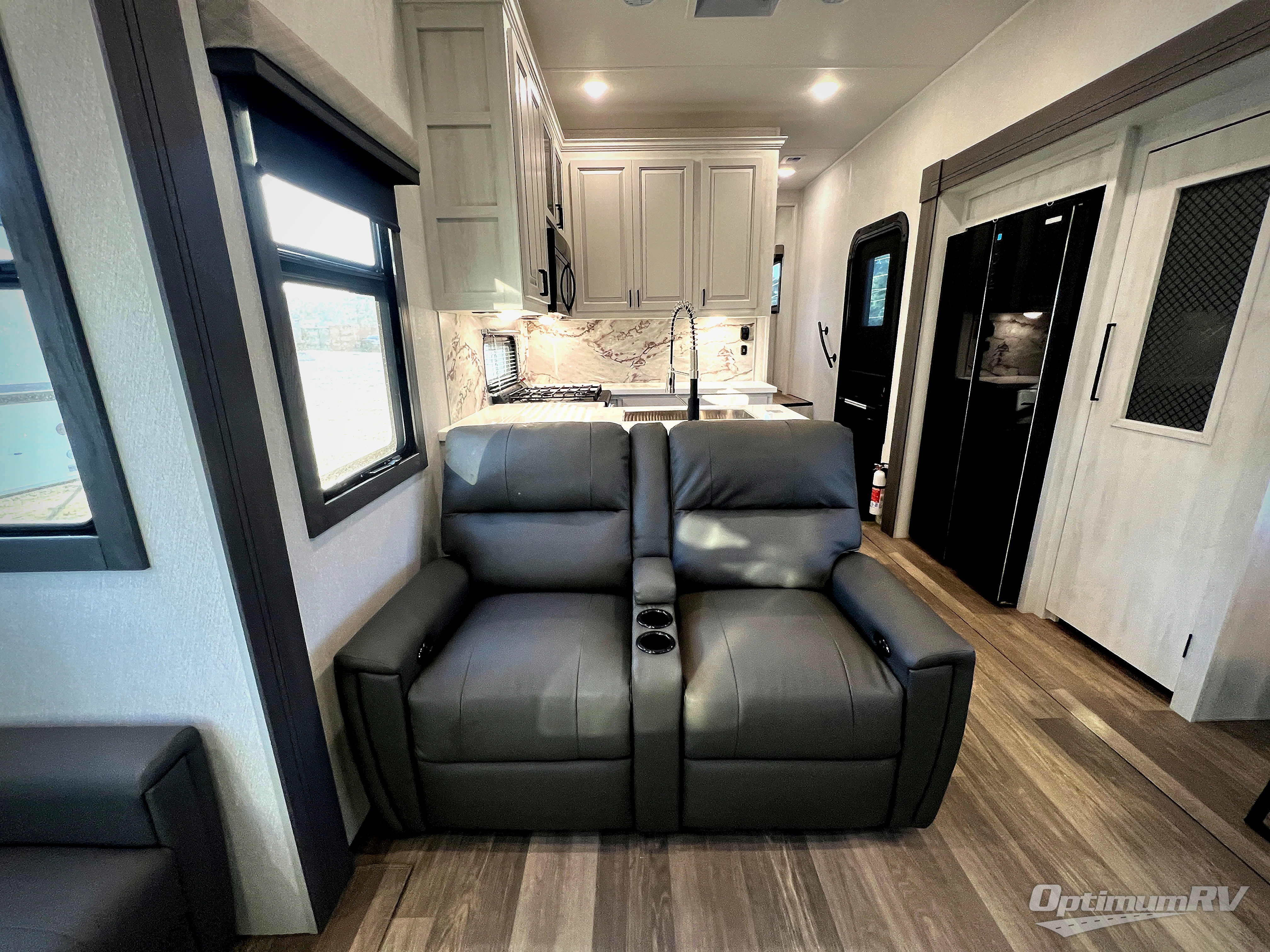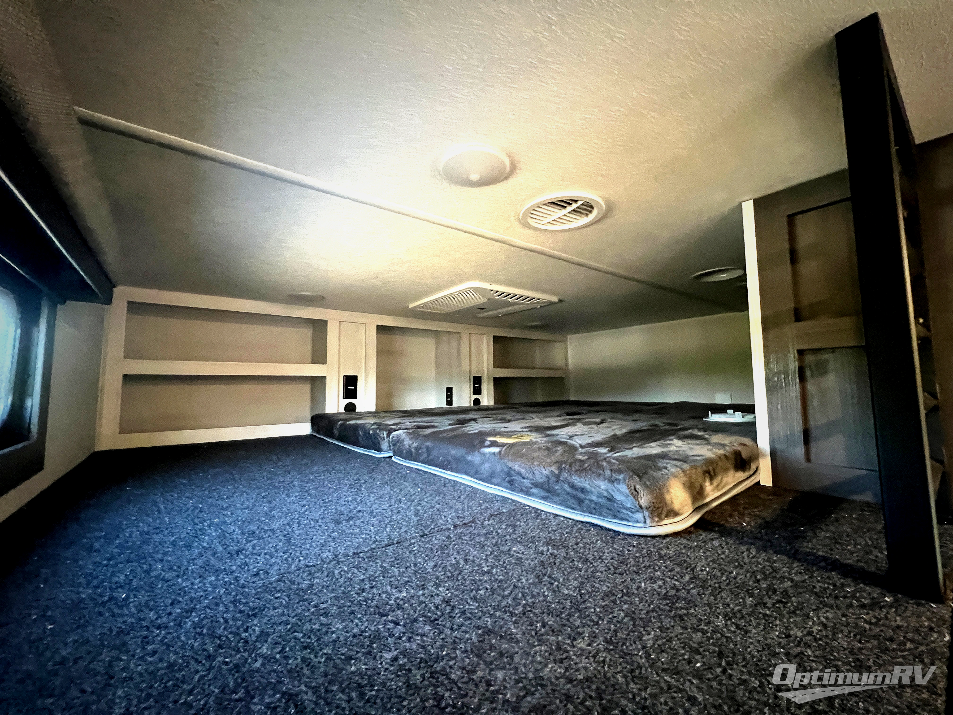 If you enjoy camping with a larger group of family or friends, this dual entry fifth wheel is for you! There is a front bedroom with a king bed slide and storage, plus a second bedroom in the back, complete with a full rear bath, a queen bed slide and storage space. A loft with a ladder is above the rear bedroom, which includes two bunk mats, loft cabinets, and TV prep if the little ones want to watch movies at night. Head to the middle of the unit to enjoy cooking on the four burner range and utilizing the generous counter space in the kitchen. There is also a walk-in pantry with a coffee bar and shelves, plus a 16 cu. ft. 12V refrigerator for food storage. Theater seating in the living room is in direct view of the TV and fireplace, and there is a tri-fold sofa slide out here as well for even more seating and sleeping space!