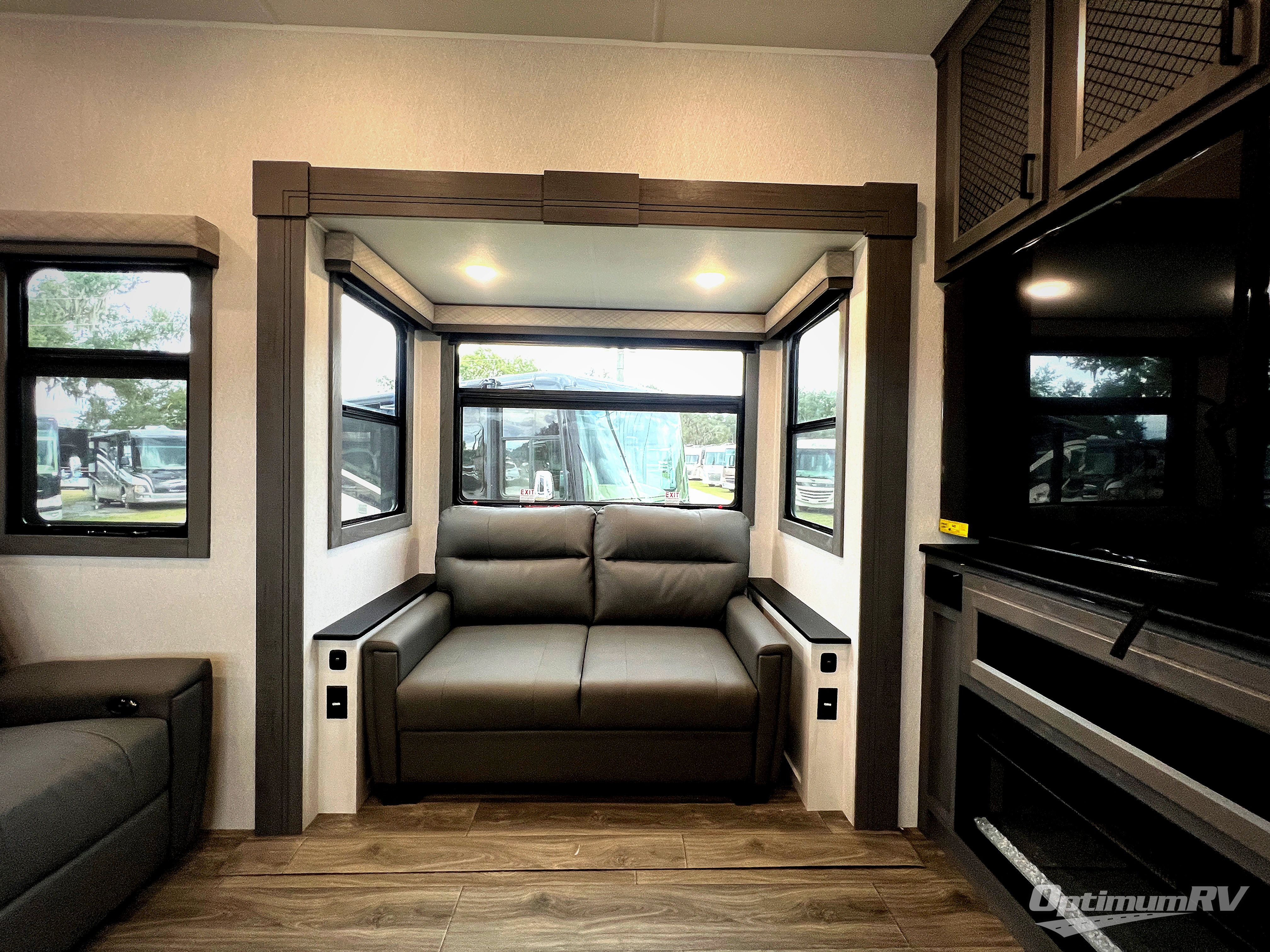 The spacious rear kitchen is equipped with a 30” microwave, 24” residential oven, overhead cabinets, breakfast bar with bar stools, walk-in pantry, and 16 cu. ft. refrigerator, perfect for cooking all your favorite dishes with the greatest convenience The living room is the heart of the home, featuring a desk with chairs, theater seating, two 60” trifold sofas, a TV with fireplace, and more. And when nature calls, you'll appreciate the convenient half bath with overhead cabinets and washer and dryer prep. The main bedroom is a serene retreat, featuring a king bed, drawers under the bed, a bedroom fireplace, and more. This is the perfect place to relax and recharge after a long day of adventure, and with a front full bathroom featuring a 30” x 40” shower, dual sink vanity, walk-in closet, dresser/drawers, you'll have everything you need to stay clean and comfortable on the go. Outside, you'll find not one, but two awnings to providing plenty of shade and protection from the elements.