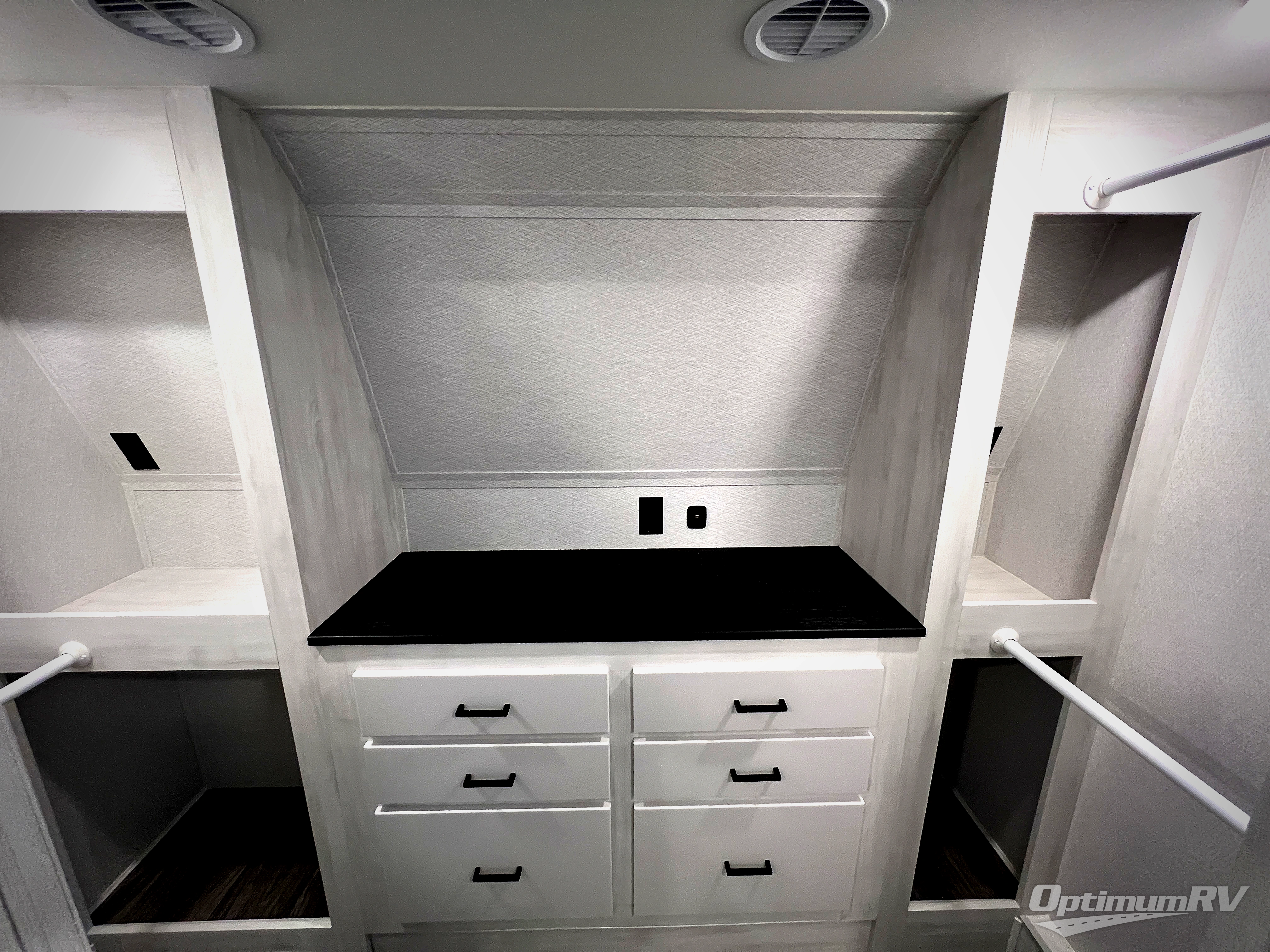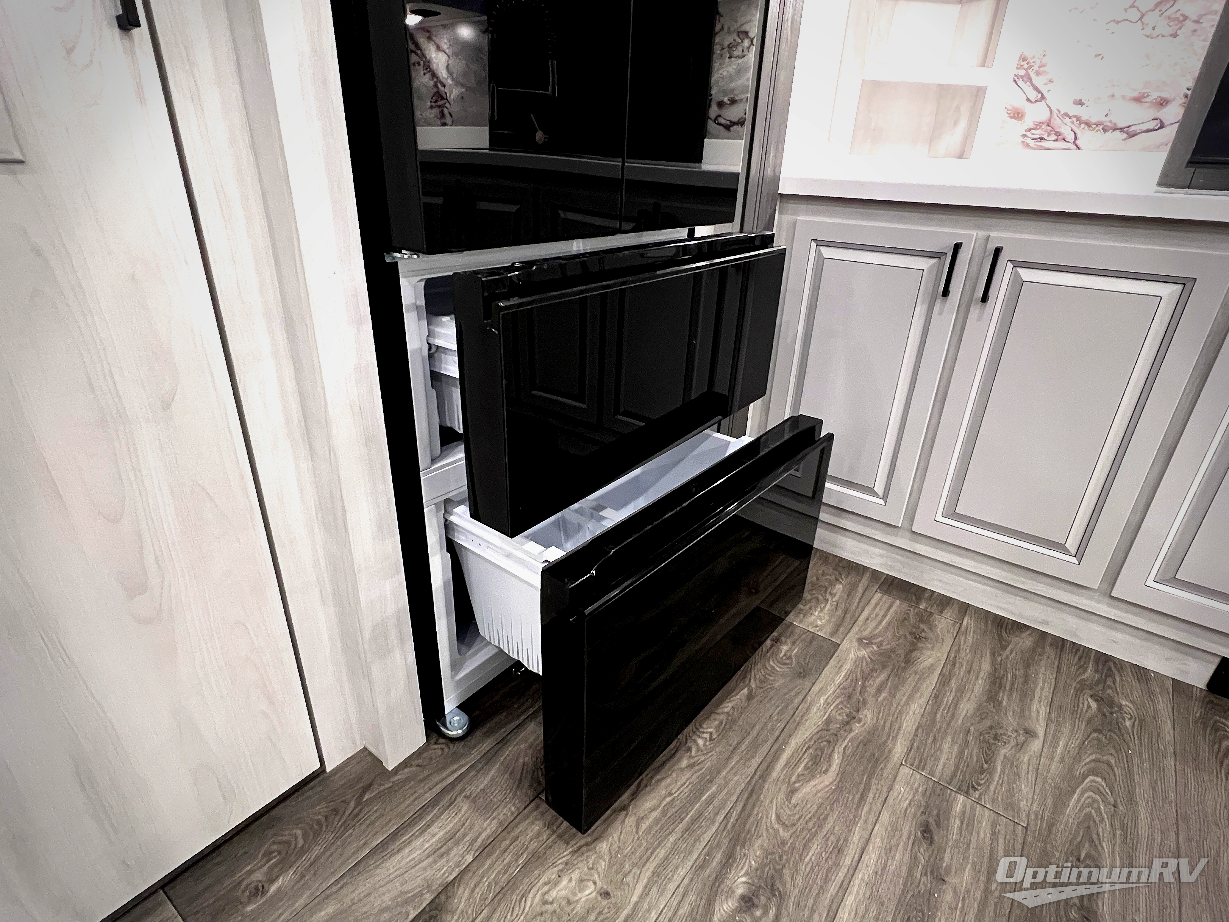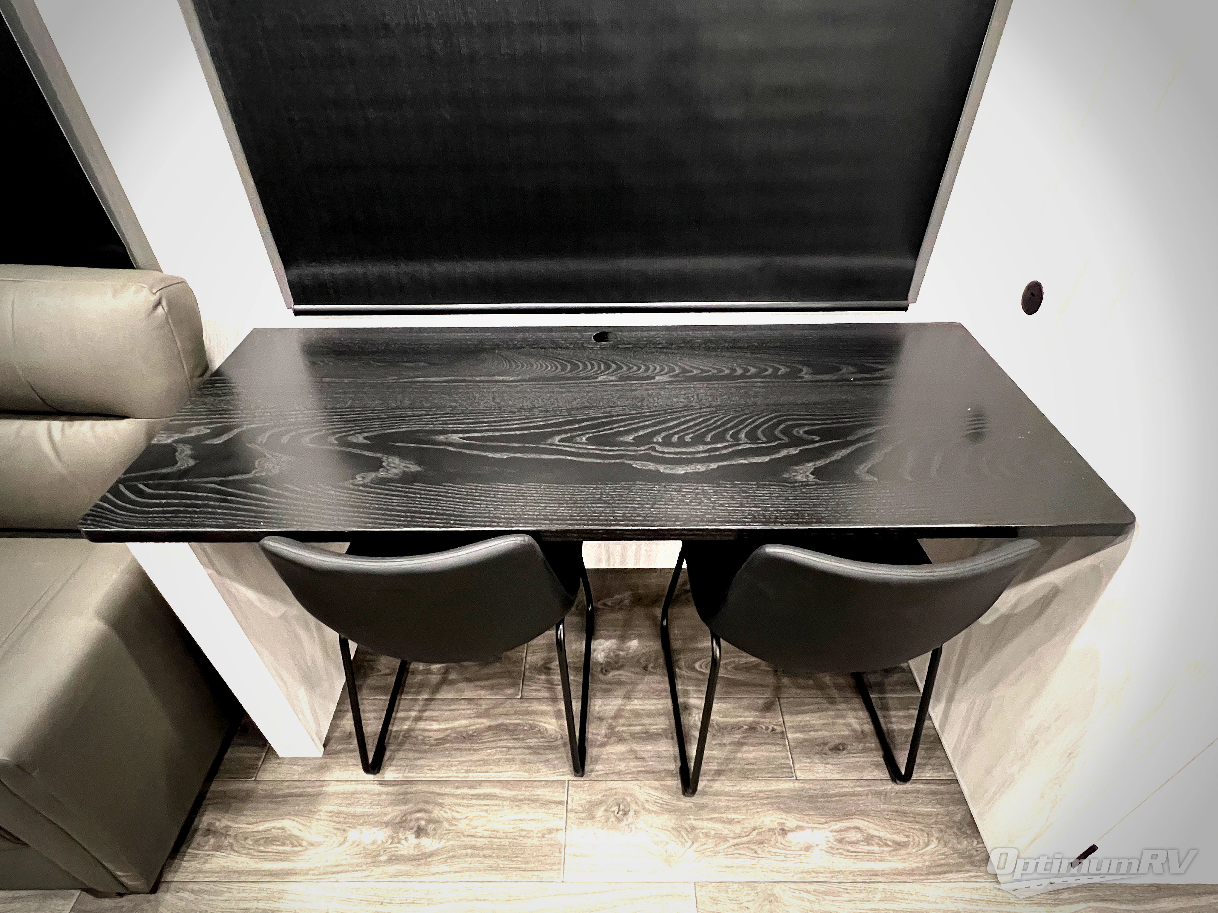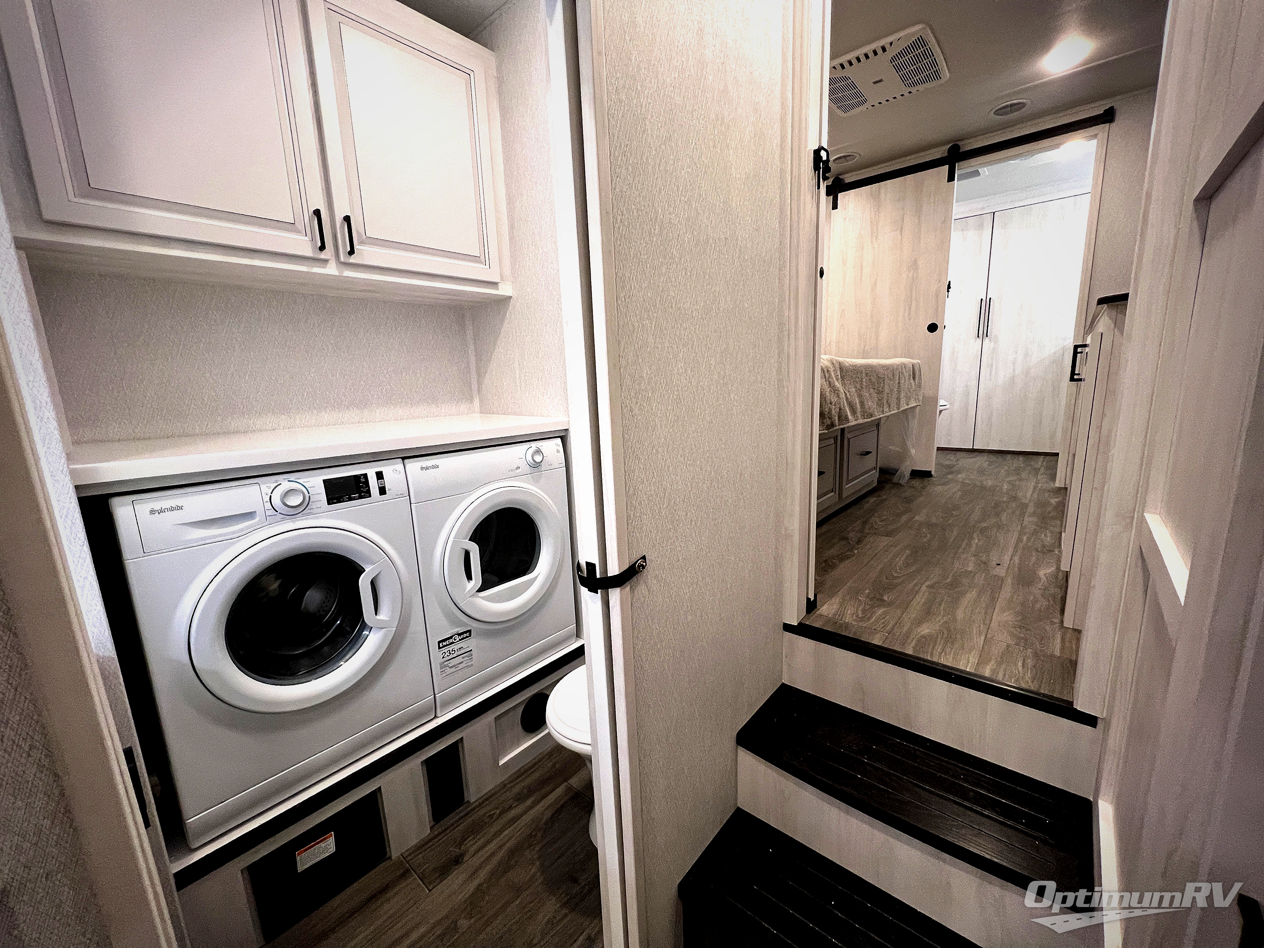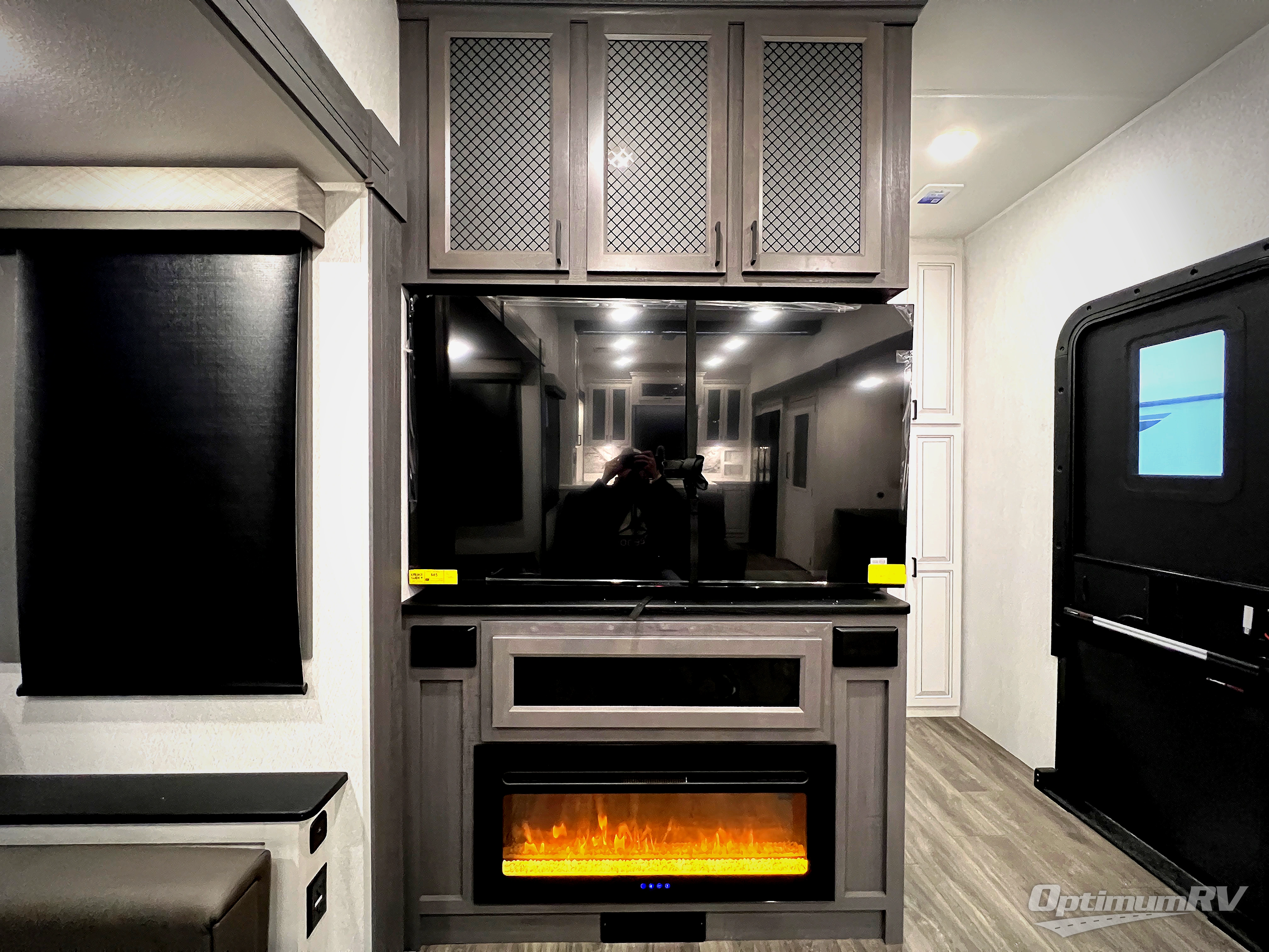 The spacious rear kitchen is equipped with a 30” microwave, 24” residential oven, overhead cabinets, breakfast bar with bar stools, walk-in pantry, and 16 cu. ft. refrigerator, perfect for cooking all your favorite dishes with the greatest convenience The living room is the heart of the home, featuring a desk with chairs, theater seating, two 60” trifold sofas, a TV with fireplace, and more. And when nature calls, you'll appreciate the convenient half bath with overhead cabinets and washer and dryer prep. The main bedroom is a serene retreat, featuring a king bed, drawers under the bed, a bedroom fireplace, and more. This is the perfect place to relax and recharge after a long day of adventure, and with a front full bathroom featuring a 30” x 40” shower, dual sink vanity, walk-in closet, dresser/drawers, you'll have everything you need to stay clean and comfortable on the go. Outside, you'll find not one, but two awnings to providing plenty of shade and protection from the elements.