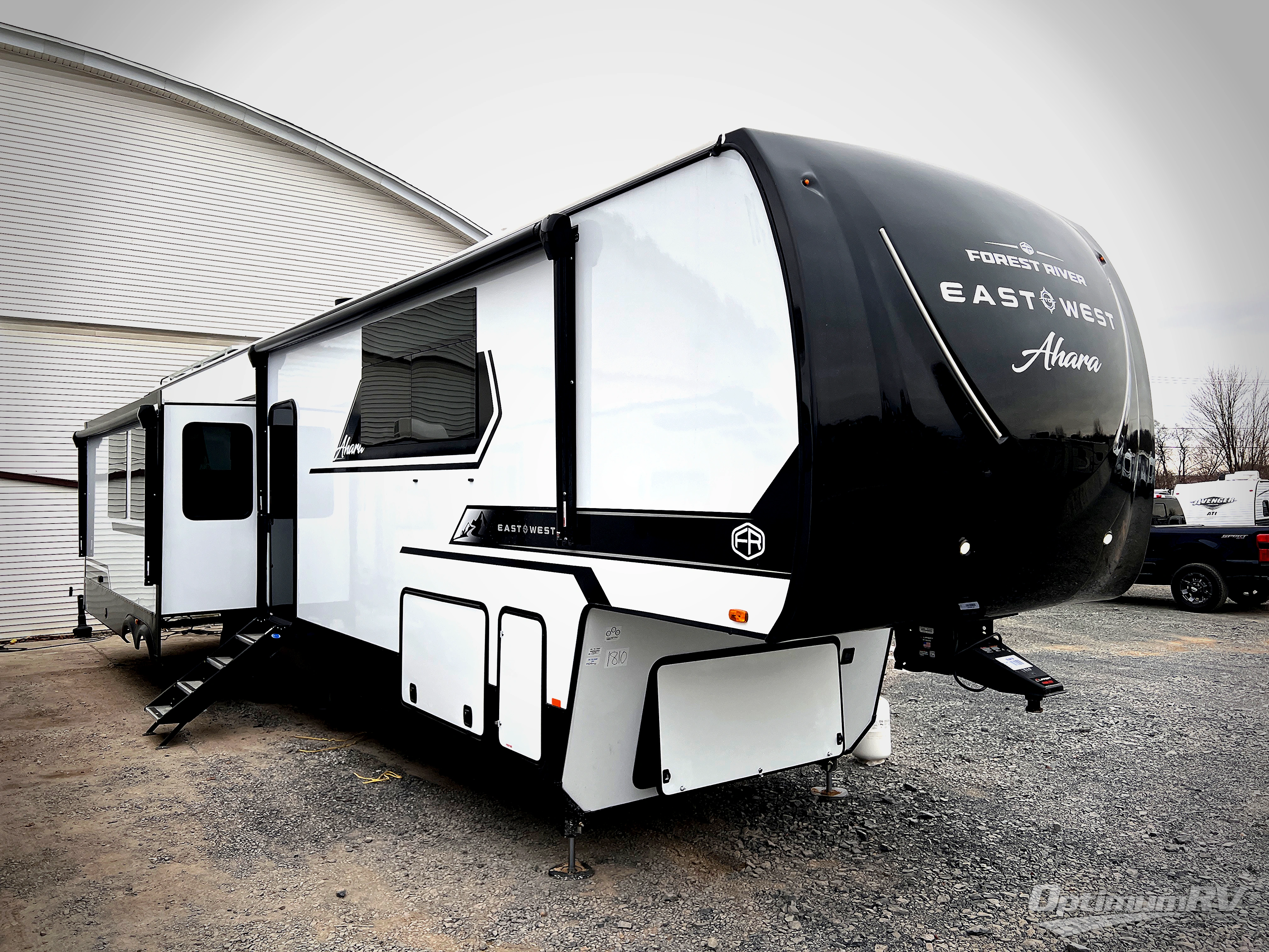 There is just too much luxury to name on the EAST TO WEST Ahara fifth wheel! These units are quite impressive, and once you see them, you'll know what we mean. The Ahara first grabs your attention with its fully painted aerodynamic fiberglass front cap, 102" wide-body chassis, and deep tint square frameless windows. For towing, you'll find a MORryde CRE 3000 suspension, LED marker lights, LED taillights with back-up lights, and rear view camera prep. Traveling in different climates is also made easy with the high-efficiency triple A/C system, 40,000 BTU high-capacity furnace, plus heated, insulated, and enclosed underbelly found within the Climate Package. Head inside to enjoy Slow Rise roller shades, a flush floor kitchen slide to help prevent trips, and solid surface countertops in the kitchen and bath to name a few luxuries!
