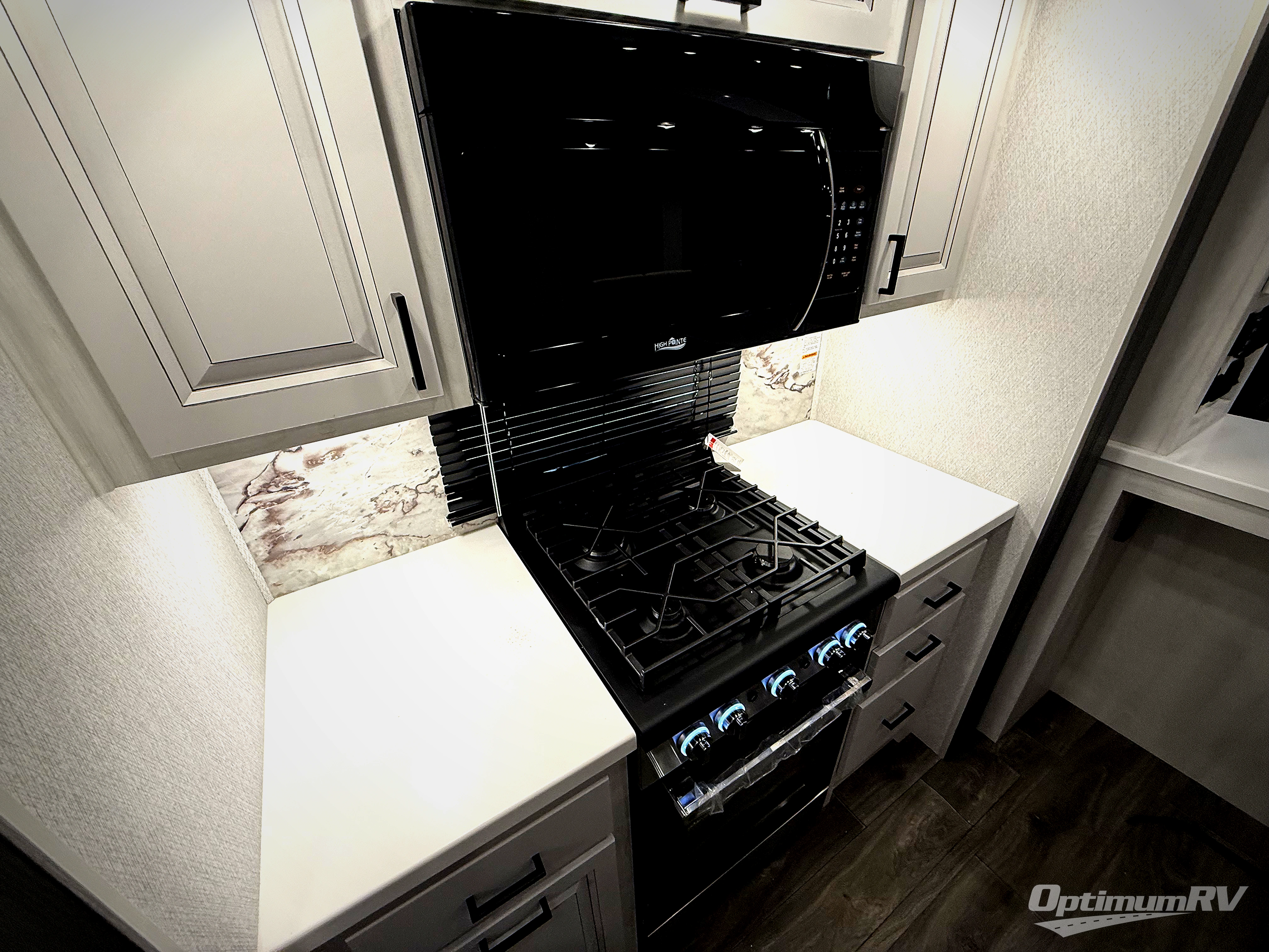 There is just too much luxury to name on the EAST TO WEST Ahara fifth wheel! These units are quite impressive, and once you see them, you'll know what we mean. The Ahara first grabs your attention with its fully painted aerodynamic fiberglass front cap, 102" wide-body chassis, and deep tint square frameless windows. For towing, you'll find a MORryde CRE 3000 suspension, LED marker lights, LED taillights with back-up lights, and rear view camera prep. Traveling in different climates is also made easy with the high-efficiency triple A/C system, 40,000 BTU high-capacity furnace, plus heated, insulated, and enclosed underbelly found within the Climate Package. Head inside to enjoy Slow Rise roller shades, a flush floor kitchen slide to help prevent trips, and solid surface countertops in the kitchen and bath to name a few luxuries!