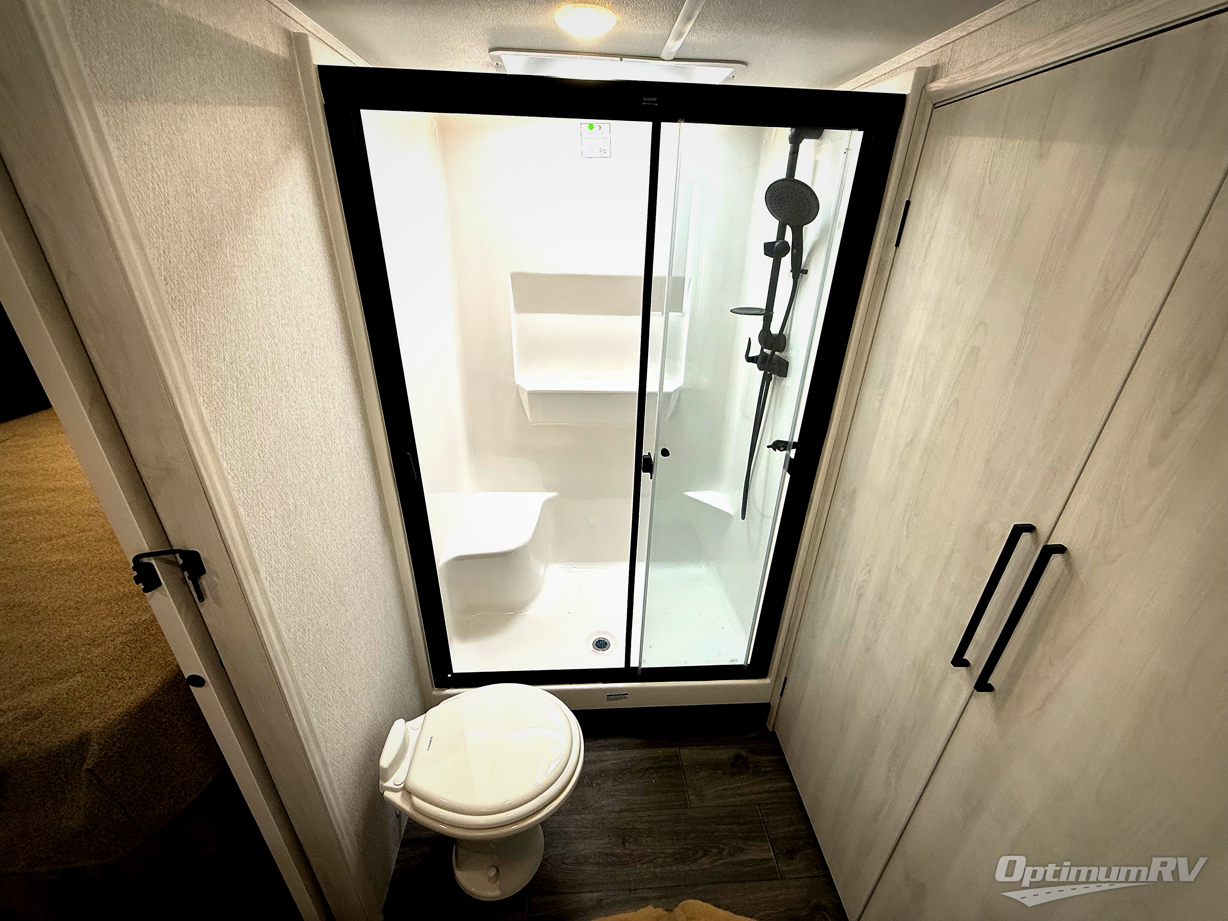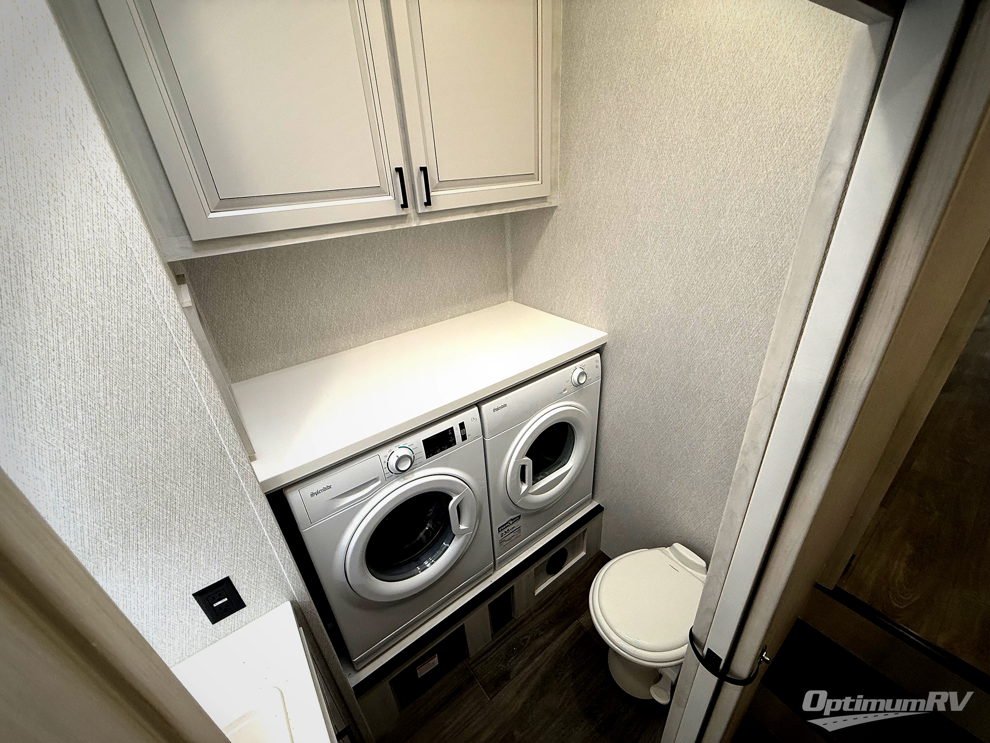 The spacious rear kitchen is equipped with a 30” microwave, 24” residential oven, overhead cabinets, breakfast bar with bar stools, walk-in pantry, and 16 cu. ft. refrigerator, perfect for cooking all your favorite dishes with the greatest convenience The living room is the heart of the home, featuring a desk with chairs, theater seating, two 60” trifold sofas, a TV with fireplace, and more. And when nature calls, you'll appreciate the convenient half bath with overhead cabinets and washer and dryer prep. The main bedroom is a serene retreat, featuring a king bed, drawers under the bed, a bedroom fireplace, and more. This is the perfect place to relax and recharge after a long day of adventure, and with a front full bathroom featuring a 30” x 40” shower, dual sink vanity, walk-in closet, dresser/drawers, you'll have everything you need to stay clean and comfortable on the go. Outside, you'll find not one, but two awnings to providing plenty of shade and protection from the elements.