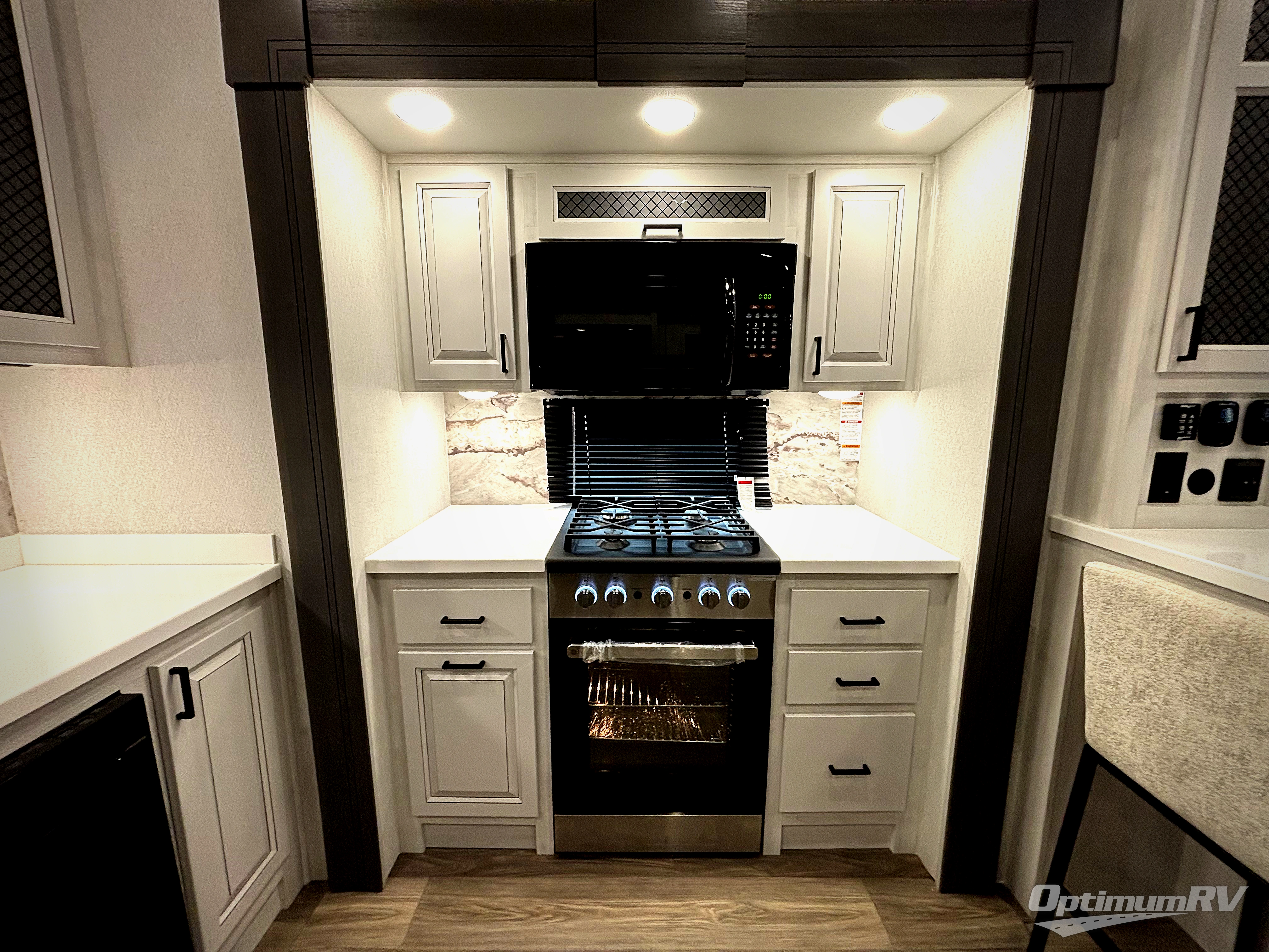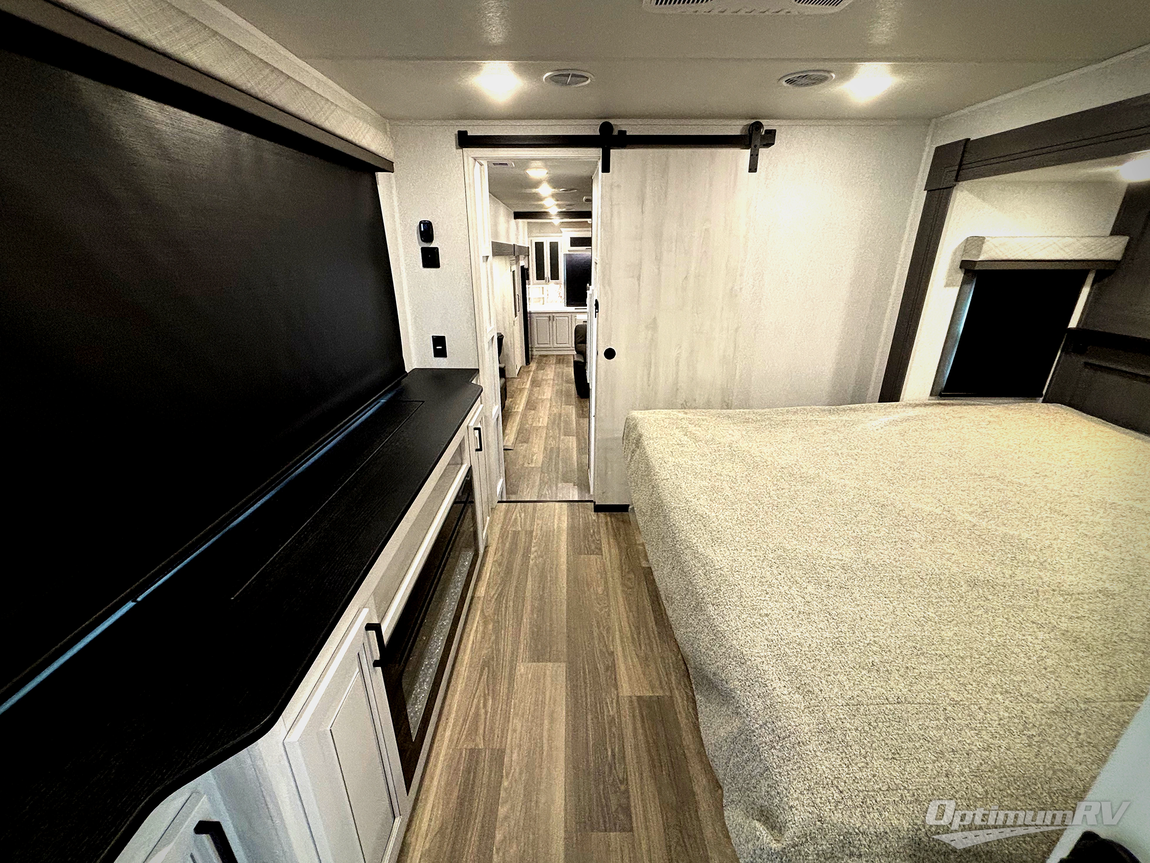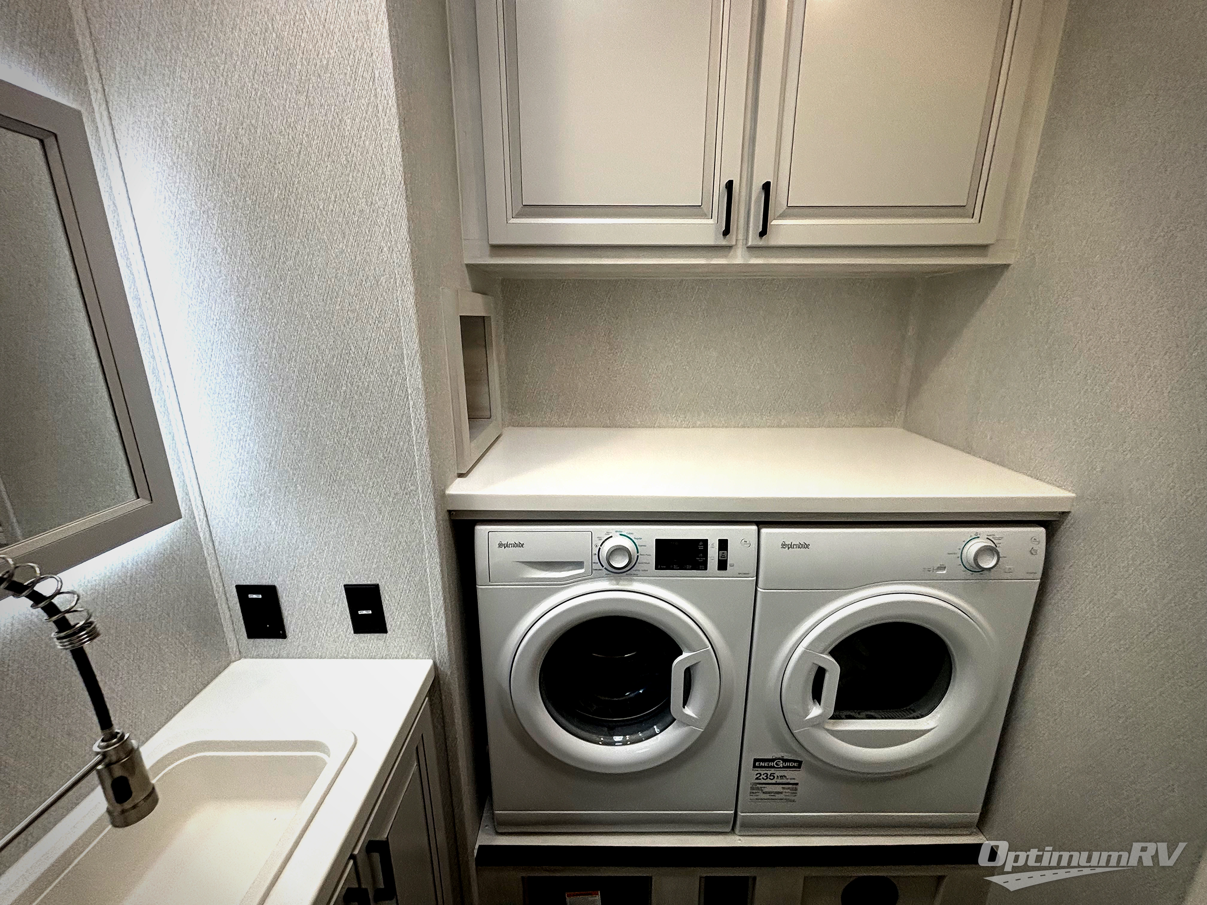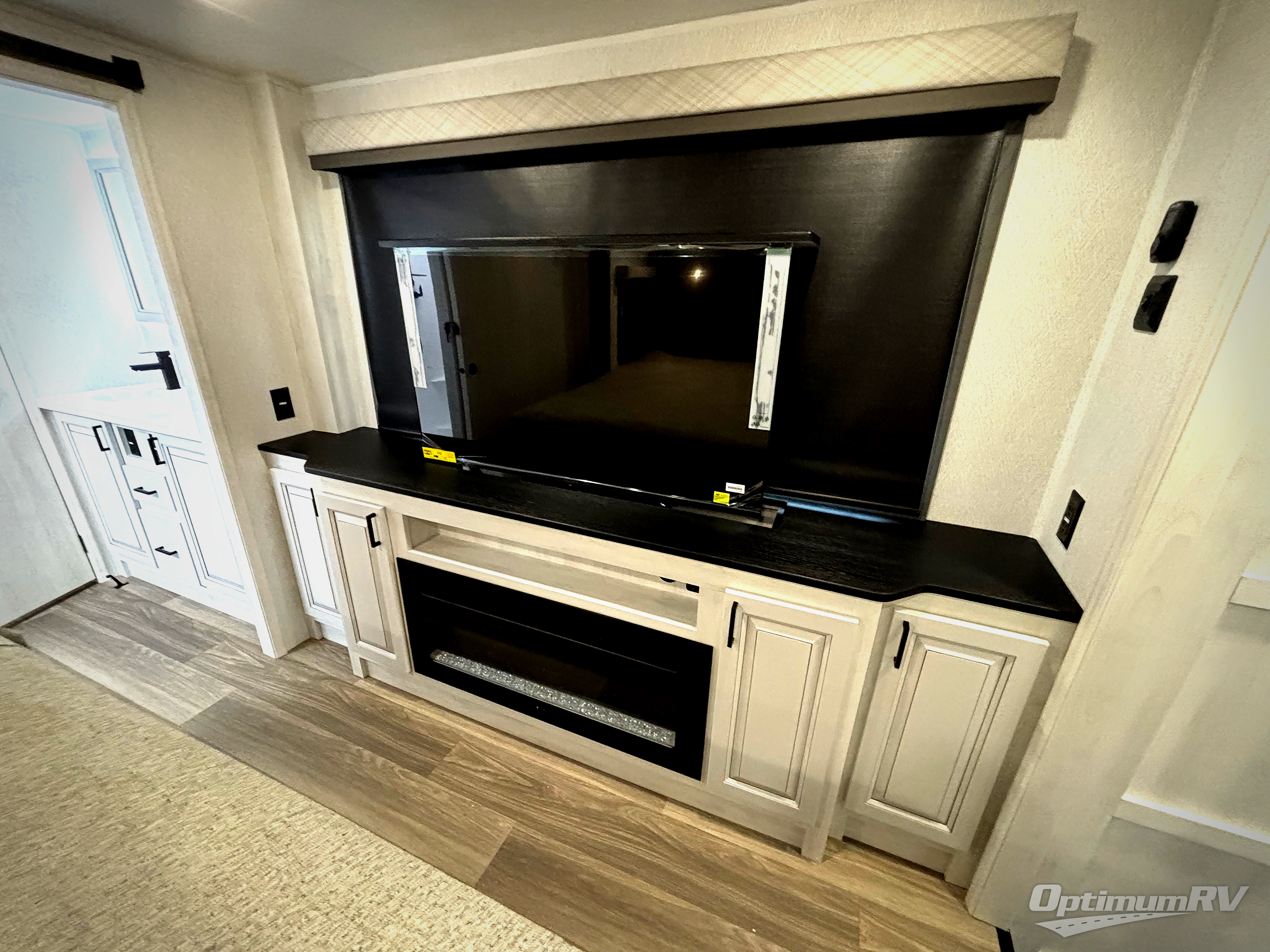 The spacious rear kitchen is equipped with a 30” microwave, 24” residential oven, overhead cabinets, breakfast bar with bar stools, walk-in pantry, and 16 cu. ft. refrigerator, perfect for cooking all your favorite dishes with the greatest convenience The living room is the heart of the home, featuring a desk with chairs, theater seating, two 60” trifold sofas, a TV with fireplace, and more. And when nature calls, you'll appreciate the convenient half bath with overhead cabinets and washer and dryer prep. The main bedroom is a serene retreat, featuring a king bed, drawers under the bed, a bedroom fireplace, and more. This is the perfect place to relax and recharge after a long day of adventure, and with a front full bathroom featuring a 30” x 40” shower, dual sink vanity, walk-in closet, dresser/drawers, you'll have everything you need to stay clean and comfortable on the go. Outside, you'll find not one, but two awnings to providing plenty of shade and protection from the elements.