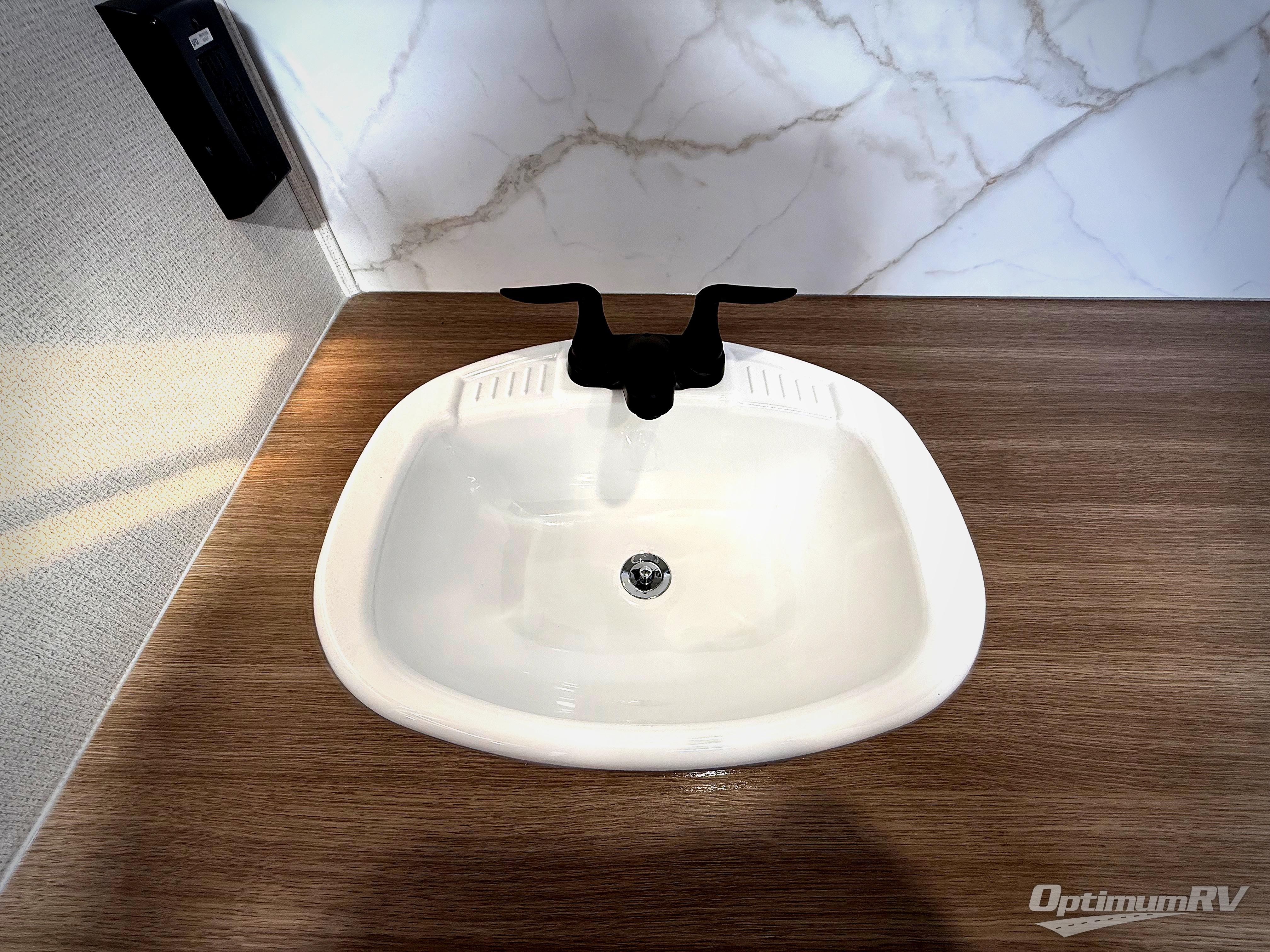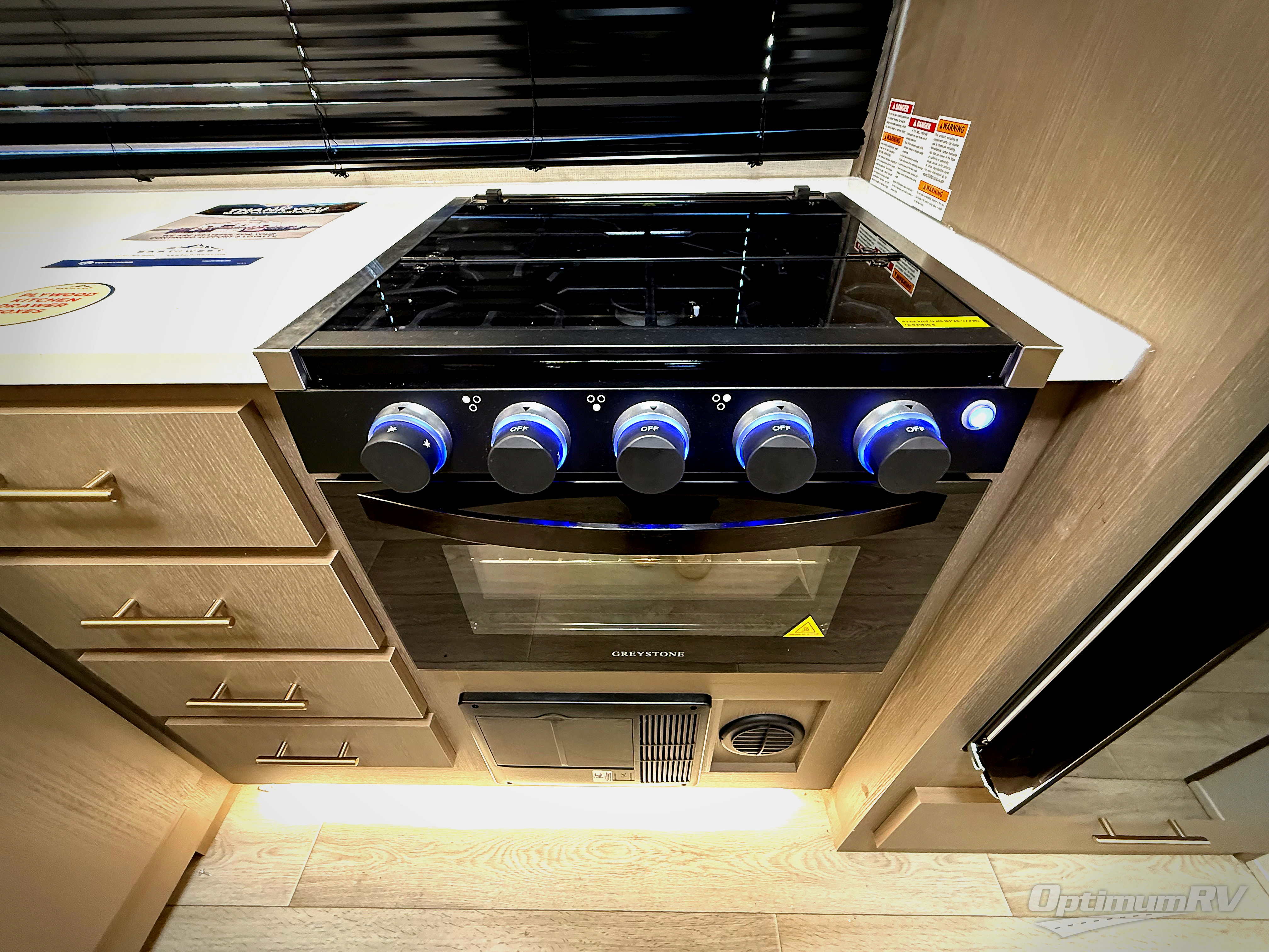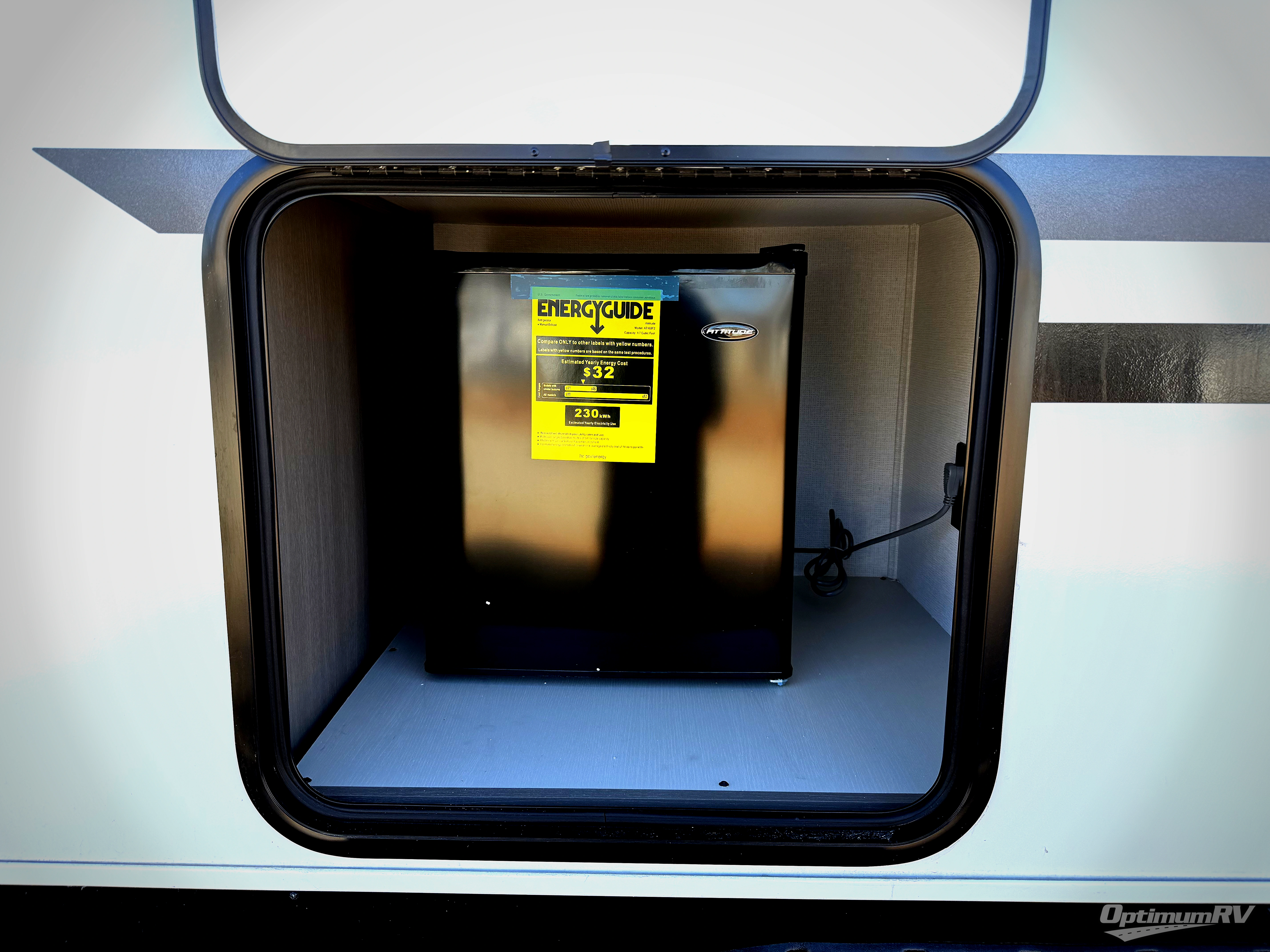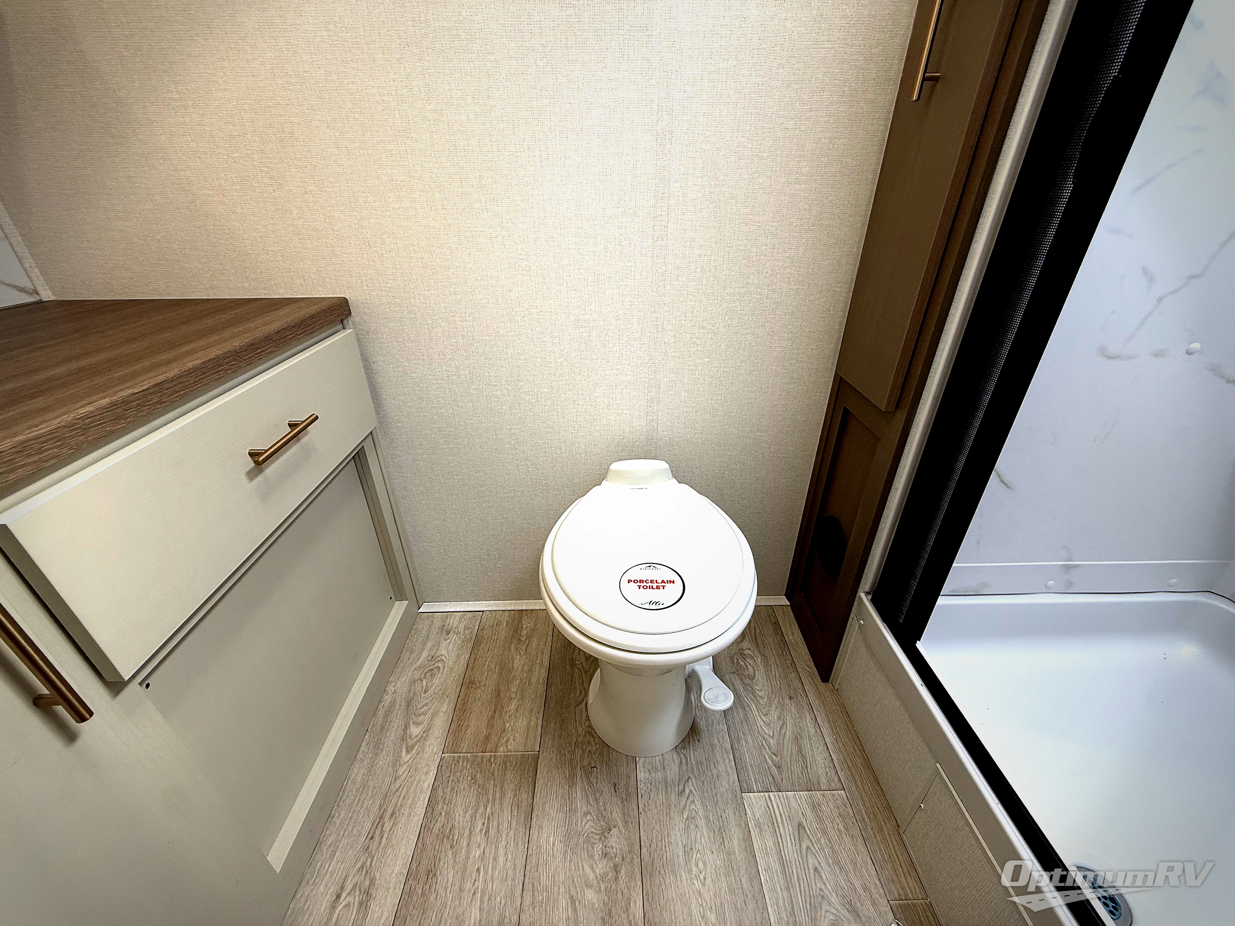 Wow! Check out the spacious full rear bath in this travel trailer for five! You'll appreciate a linen closet here and a shower skylight to let natural light in. Your crew can get comfortable on the tri-fold sofa that sits directly across from the fireplace for a more cozy feel. There is also a booth dinette here with storage space underneath for board games. Head to the kitchen to prepare dinner on the three burner cooktop, and use the countertop extension to cut fresh fruits and vegetables. A front private bedroom with a king bed and dual wardrobes will have you feeling right at home. Start camping today!