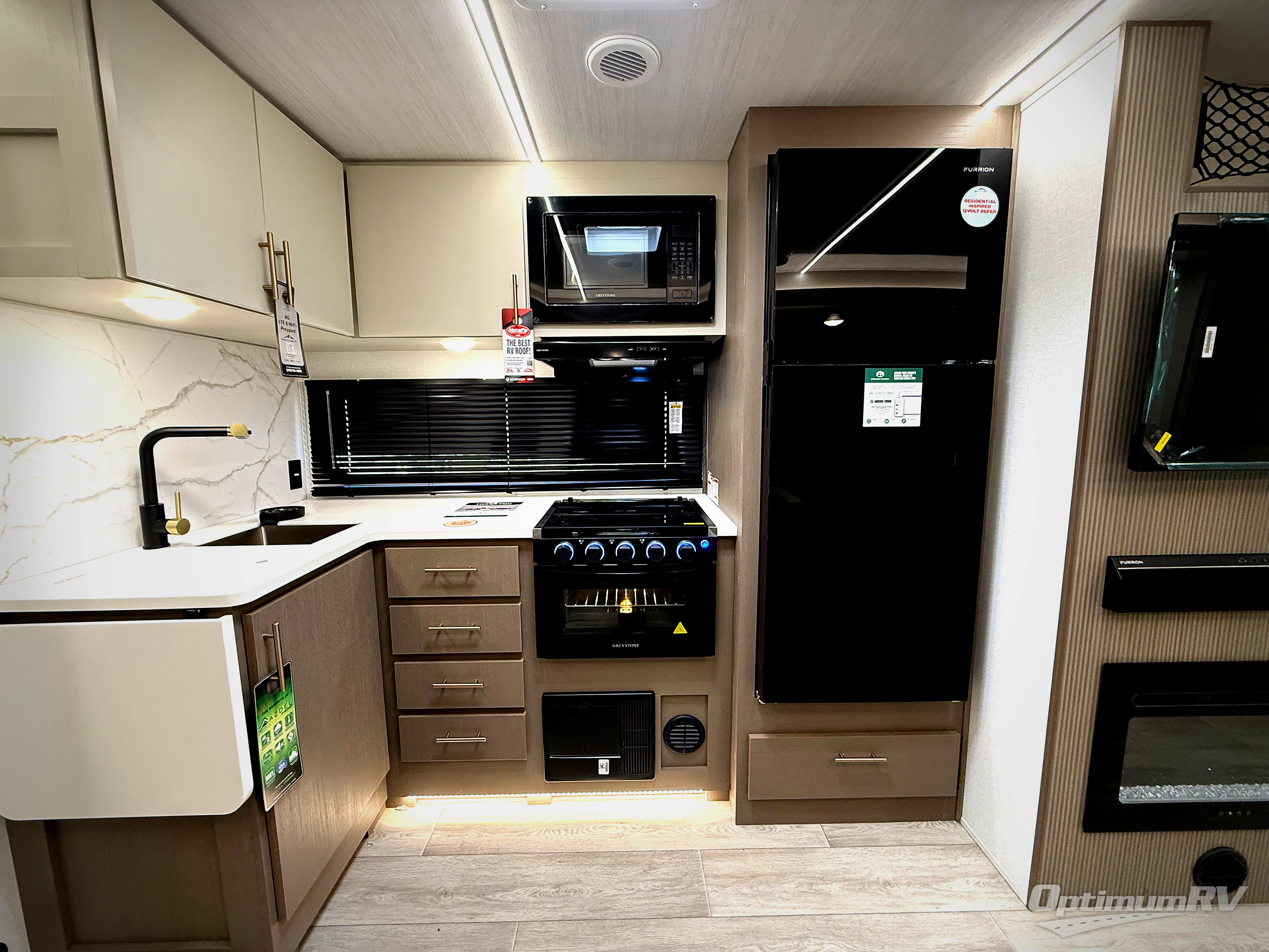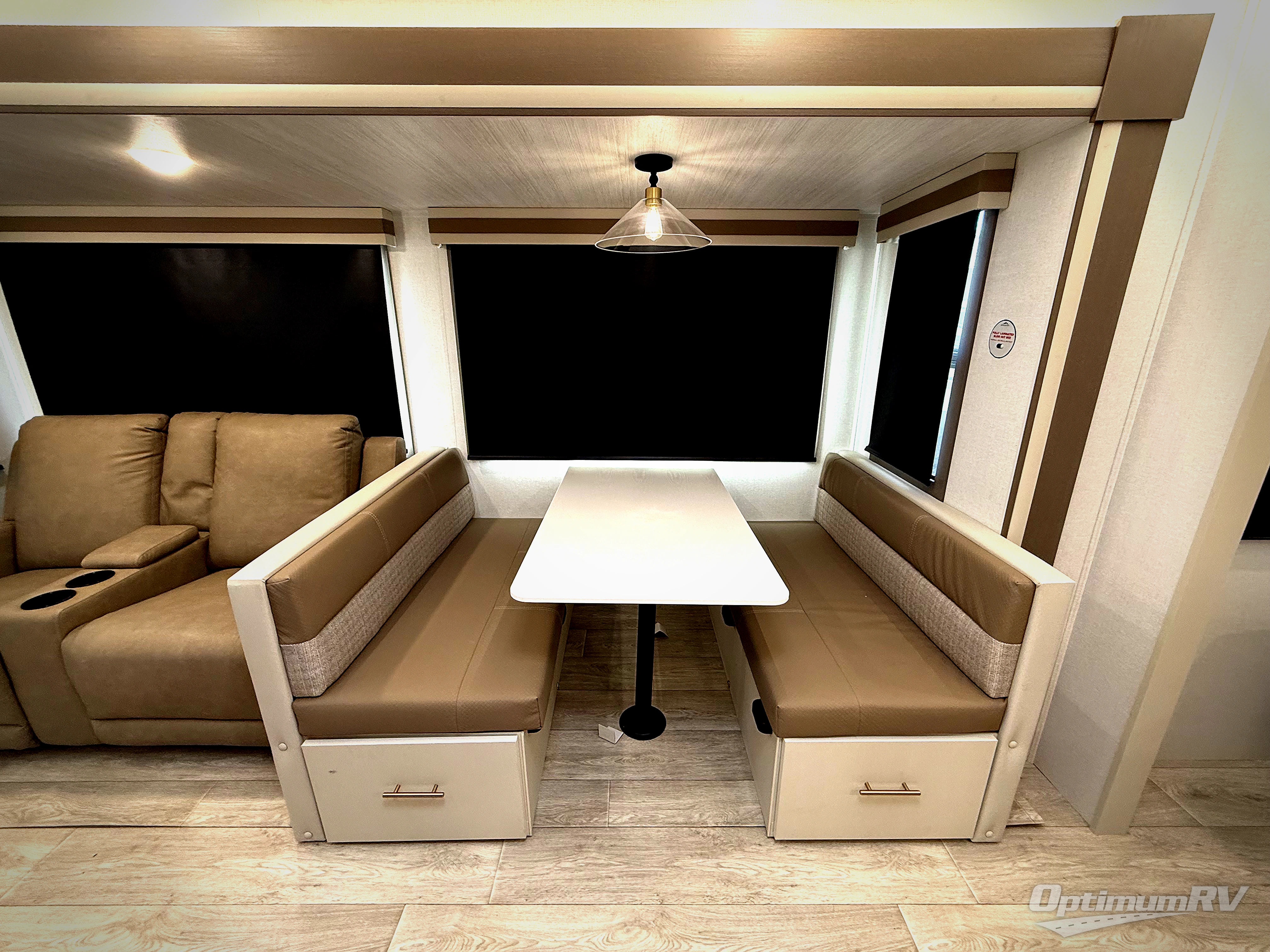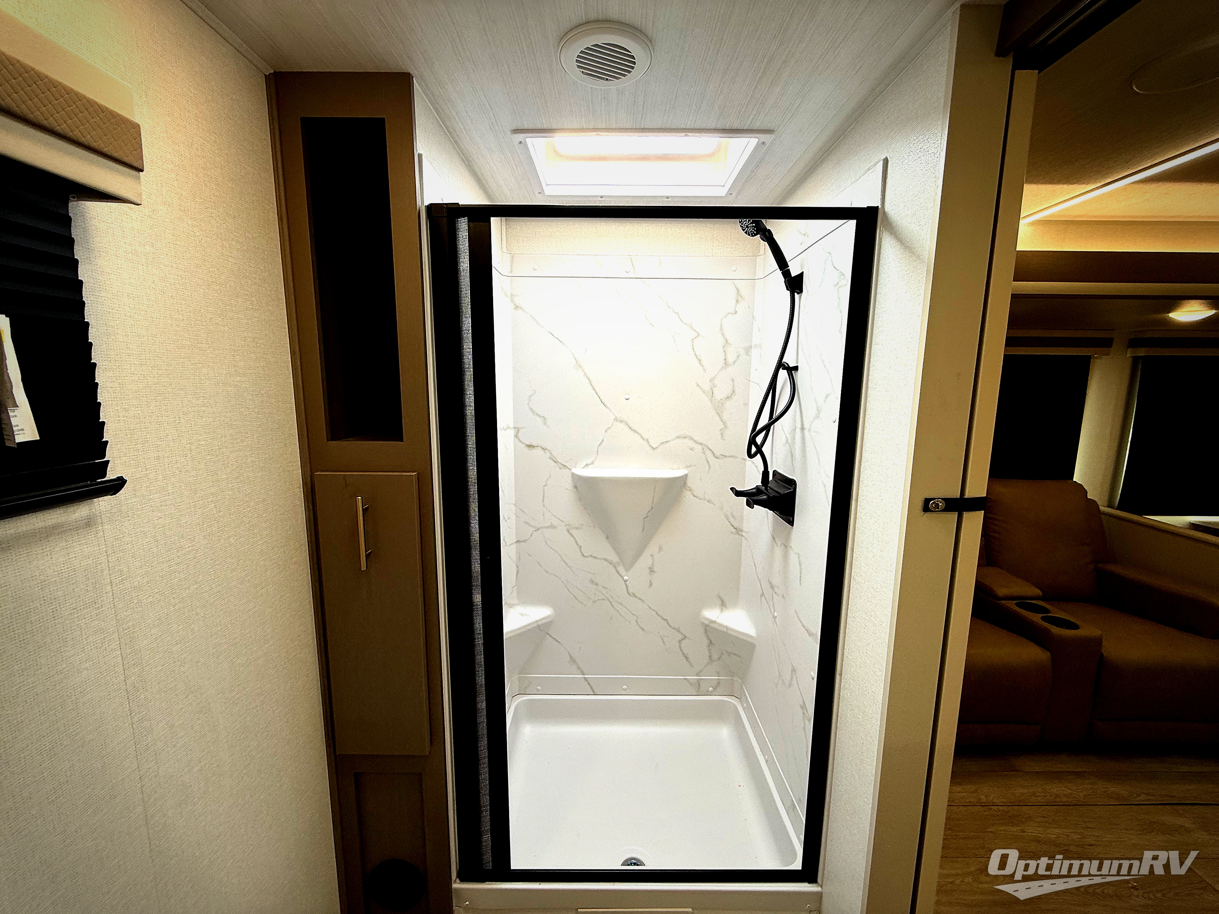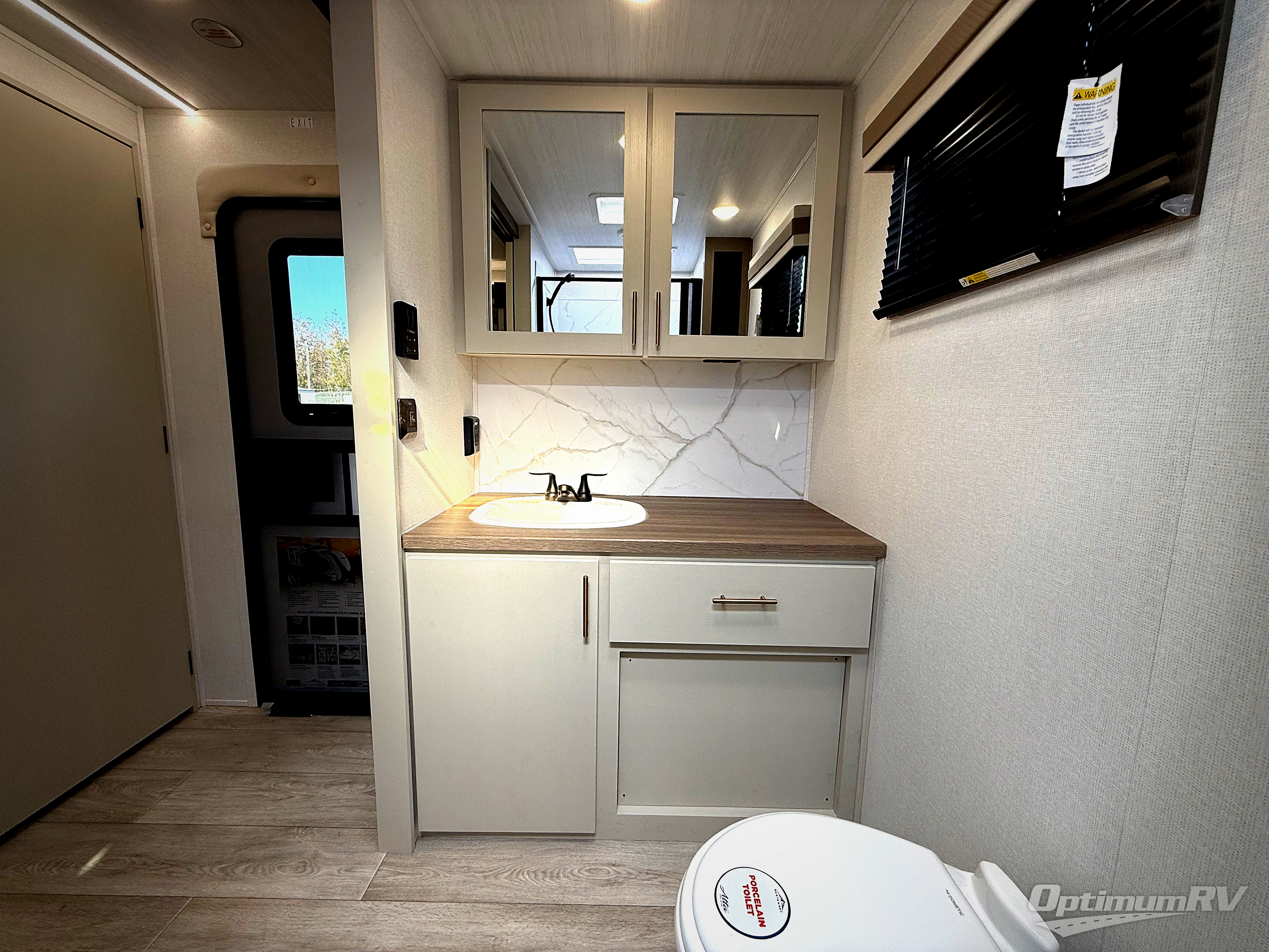 Wow! Check out the spacious full rear bath in this travel trailer for five! You'll appreciate a linen closet here and a shower skylight to let natural light in. Your crew can get comfortable on the tri-fold sofa that sits directly across from the fireplace for a more cozy feel. There is also a booth dinette here with storage space underneath for board games. Head to the kitchen to prepare dinner on the three burner cooktop, and use the countertop extension to cut fresh fruits and vegetables. A front private bedroom with a king bed and dual wardrobes will have you feeling right at home. Start camping today!
