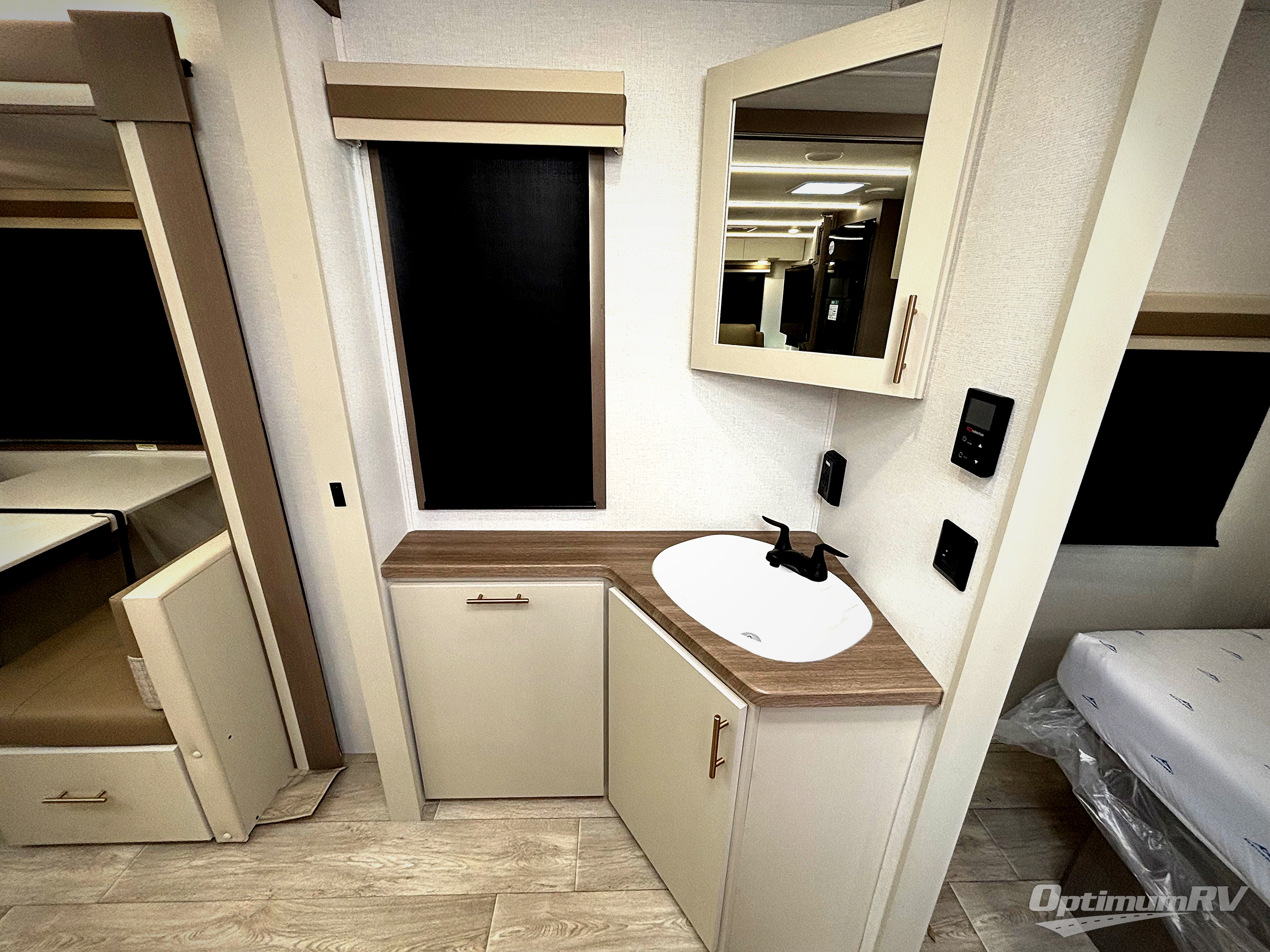 You'll feel right at home in this rear living travel trailer that includes theater seats and a front master bedroom with a king bed. The walk-through bath includes a medicine cabinet and a shower skylight to let natural light in, and the bedroom includes its own exterior entry door for convenience. When you're not relaxing outdoors under the 21' power awning with LED lights, you can play a game at the booth dinette or relax on the tri-fold sofa. This model also includes a pass-through storage for your larger camp gear and a universal docking station for easy access to your hookups.