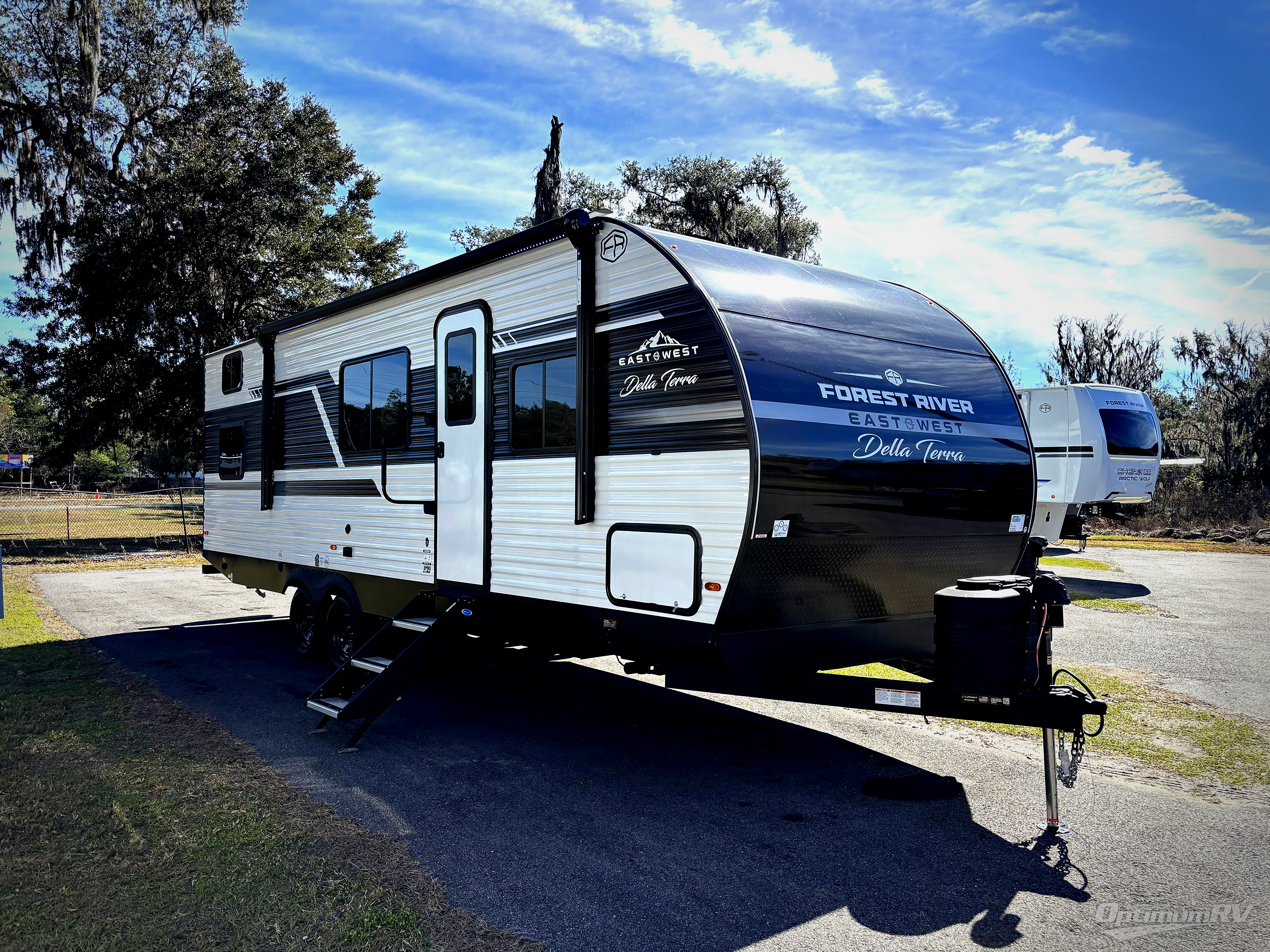 Each Della Terra travel trailer by EAST TO WEST is constructed with an enclosed and heated underbelly and enclosed holding tanks for added protection against the elements. There is also a power tongue jack with an LED light for easy set up and a power awning with LED lights you can rest under after you've unpacked. The Explore Comfort Package comes seamless pressed countertops, kitchen backsplash, window valance package with black night shades, and many more comforts. You will also appreciate the Adventure Outdoor Package with backup camera prep and solar prep, a tankless water heater, an RV grill quick disconnect, and a universal docking station with battery disconnect.