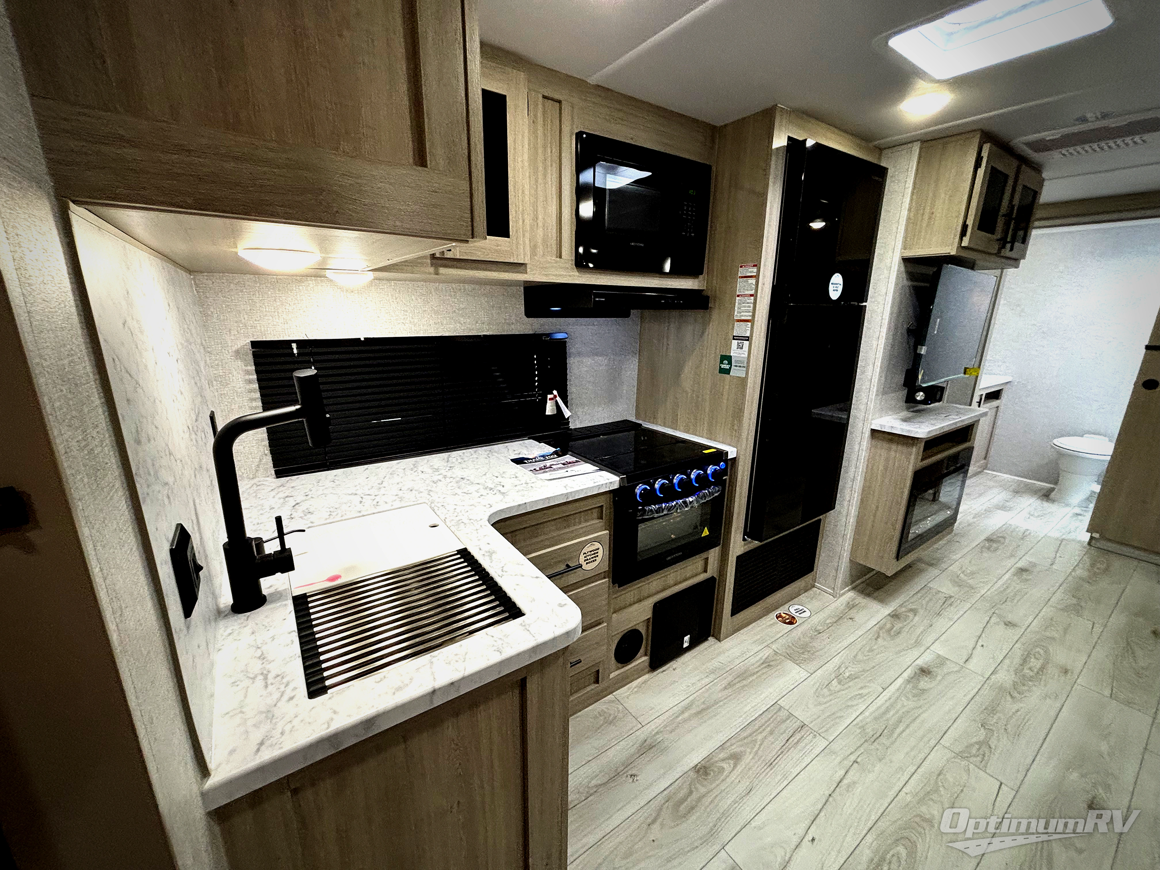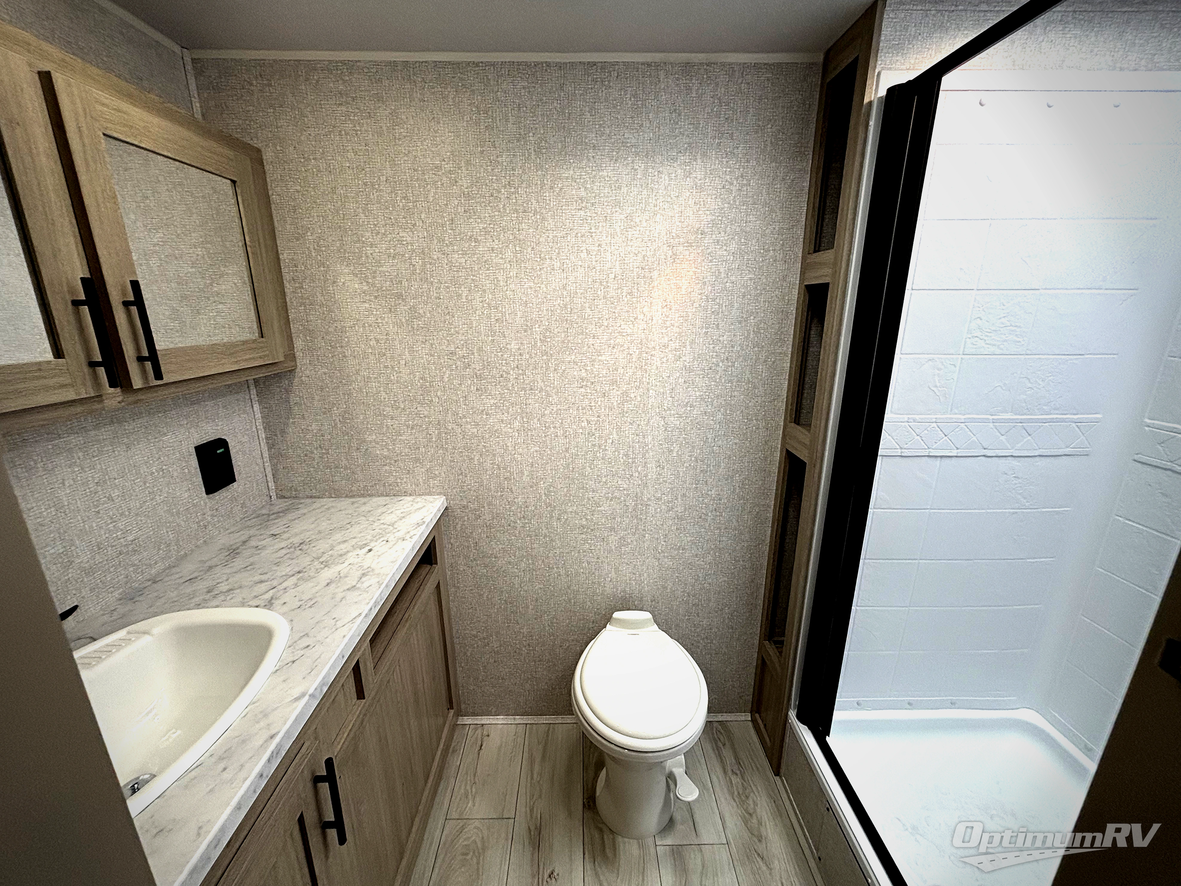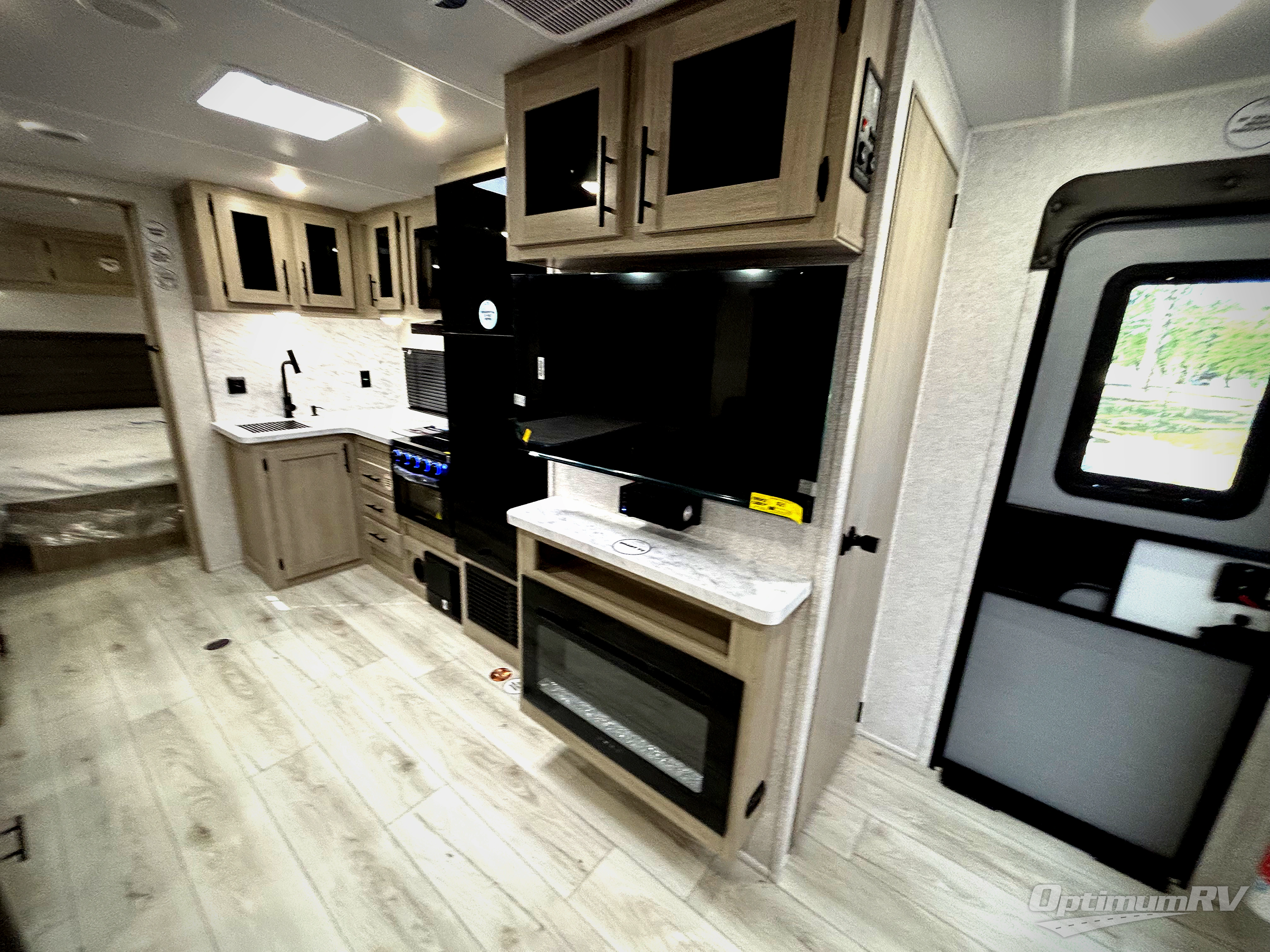 When you are wanting a little more interior space in your next travel trailer, take a look inside! This large slide out widens the center so you can easily make meals using full amenities without having to move for someone walking from the front private bedroom to the rear spacious bathroom. There is a king-size bed with storage on both sides, underneath and above, plus a space saving sliding door. The booth dinette and jiffy sofa offer comfortable seating as well as extra sleeping space for overnight guests. The fireplace is just a nice feature to enjoy, and the large pantry with washer/dryer prep gives you the option to make laundry day easier!