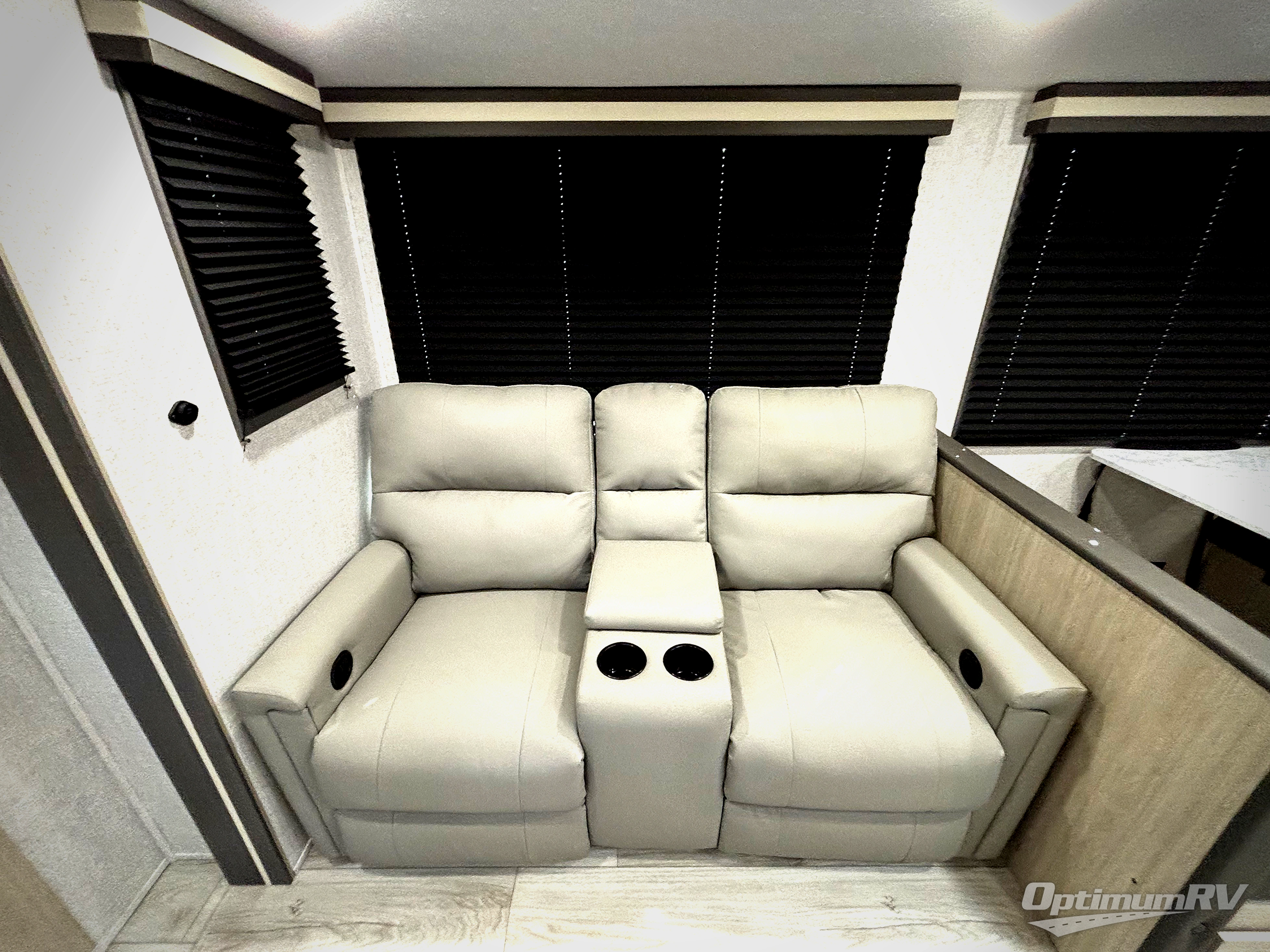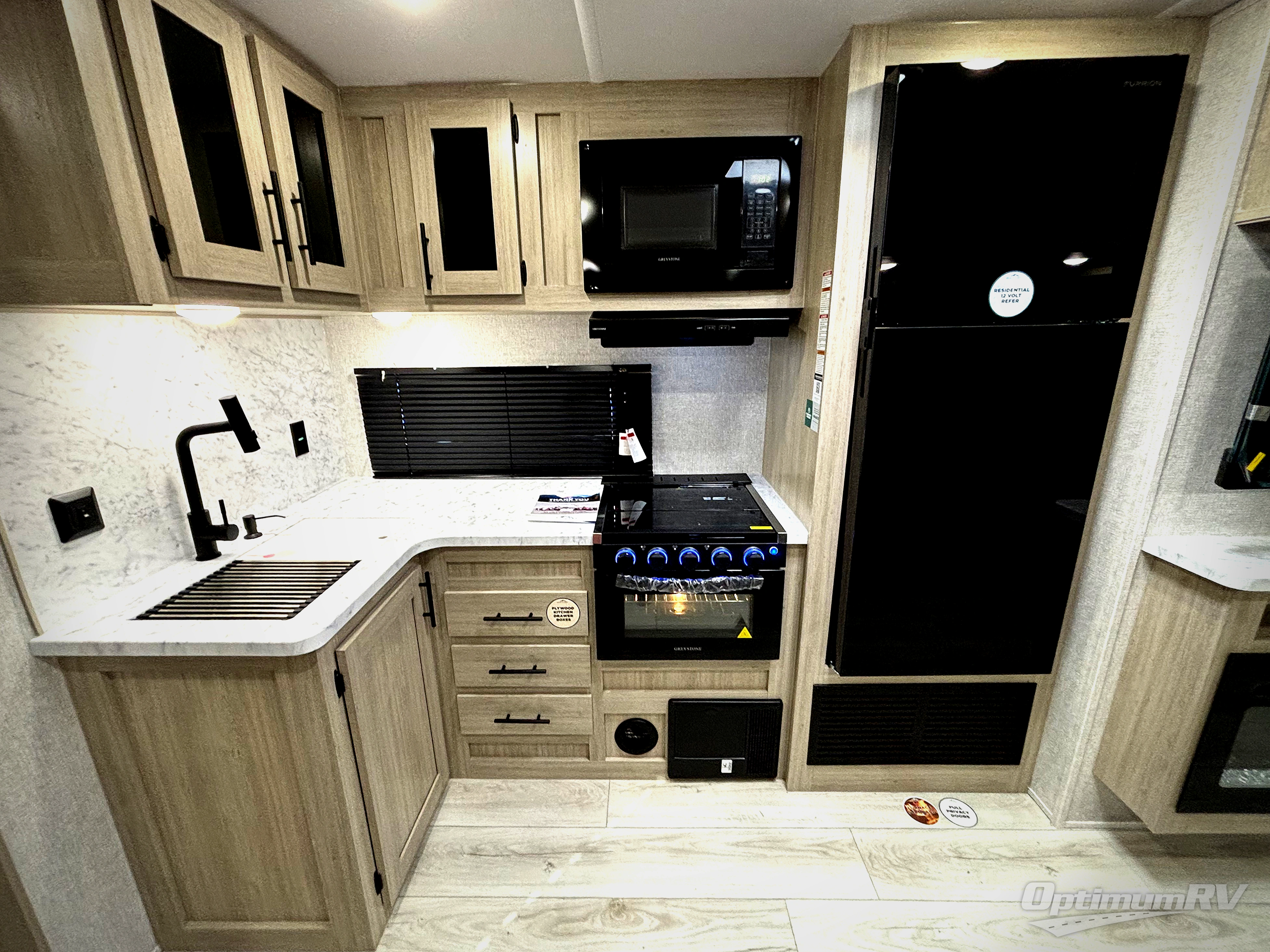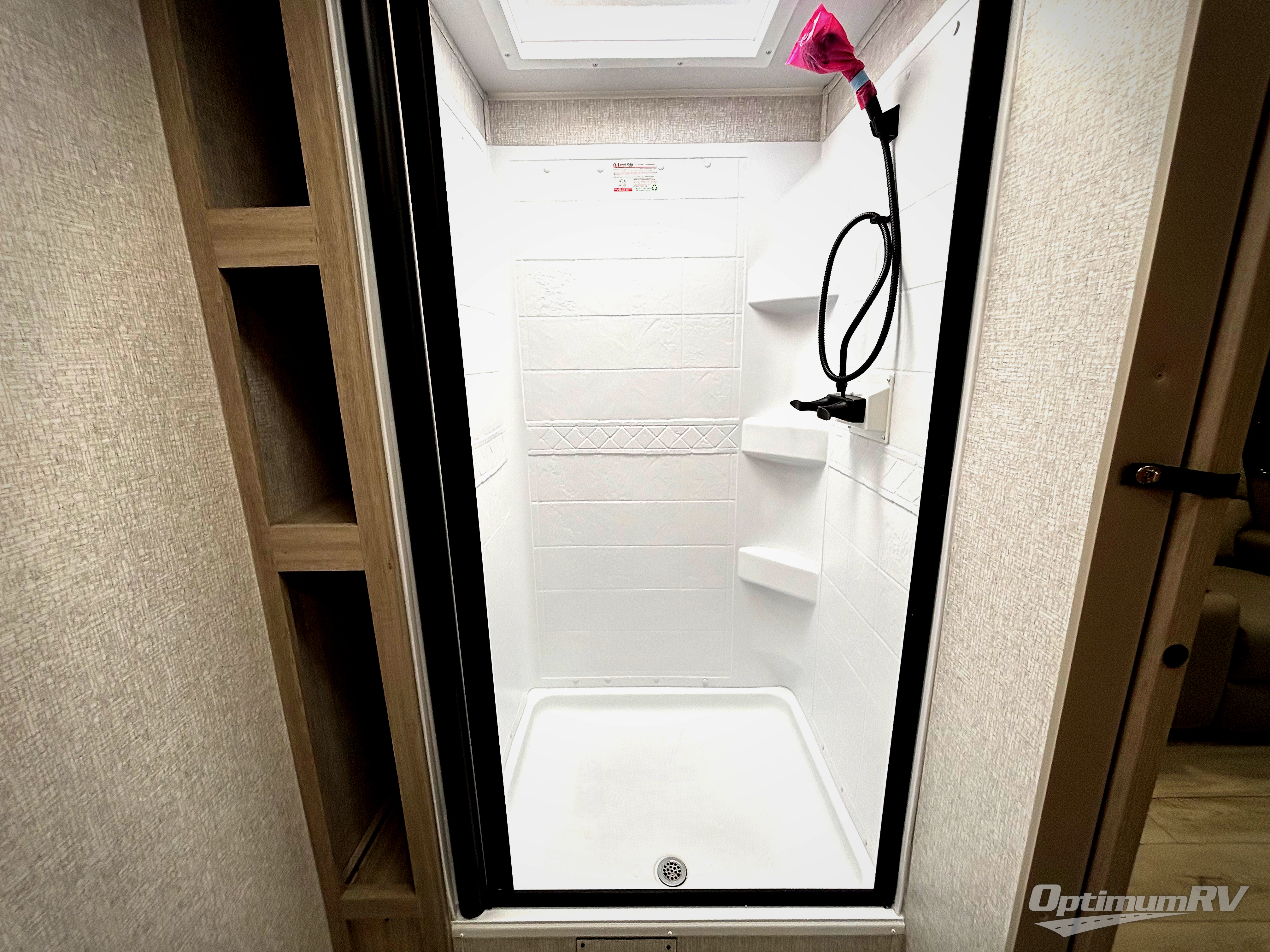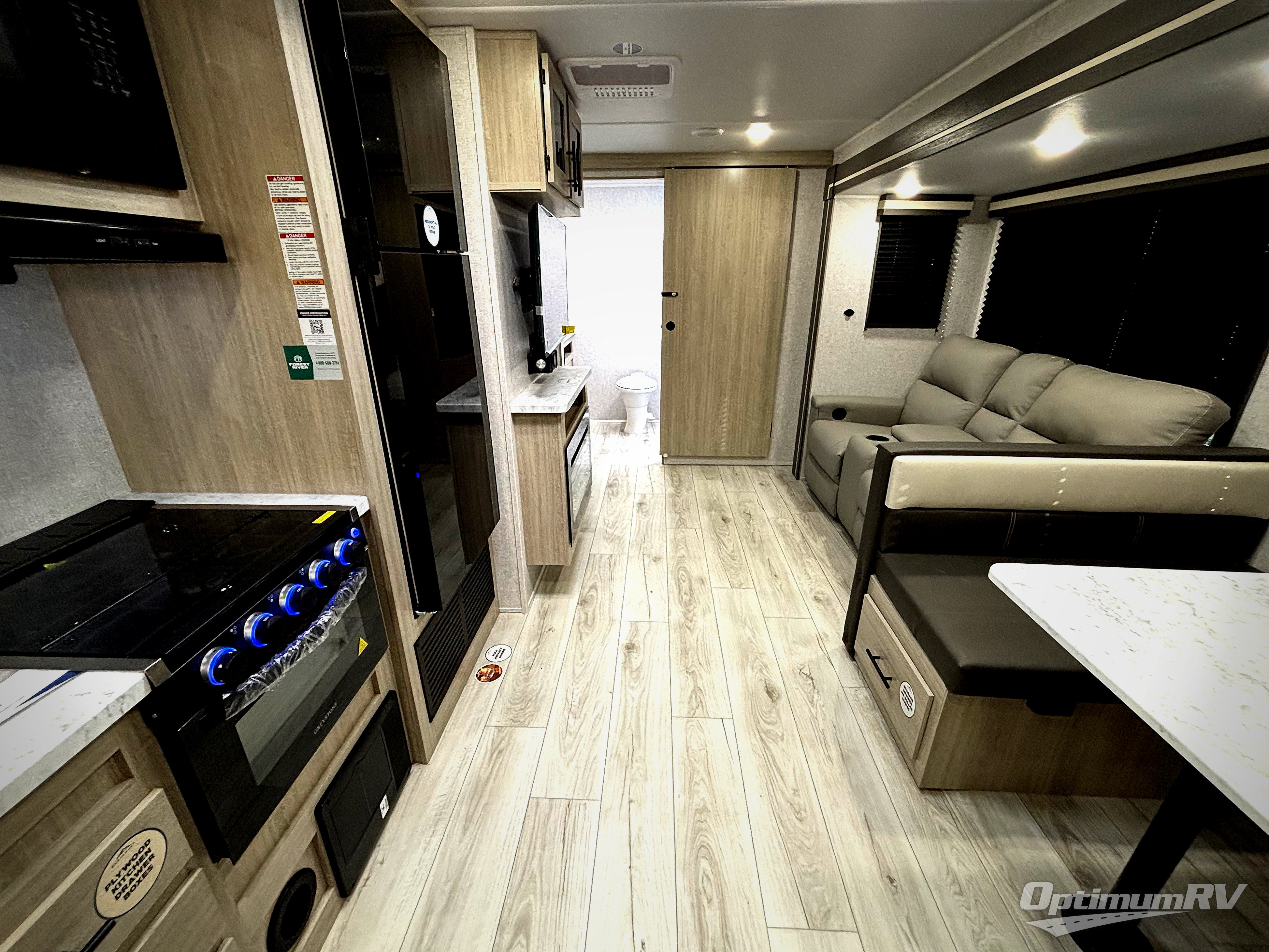 When you are wanting a little more interior space in your next travel trailer, take a look inside! This large slide out widens the center so you can easily make meals using full amenities without having to move for someone walking from the front private bedroom to the rear spacious bathroom. There is a king-size bed with storage on both sides, underneath and above, plus a space saving sliding door. The booth dinette and jiffy sofa offer comfortable seating as well as extra sleeping space for overnight guests. The fireplace is just a nice feature to enjoy, and the large pantry with washer/dryer prep gives you the option to make laundry day easier!