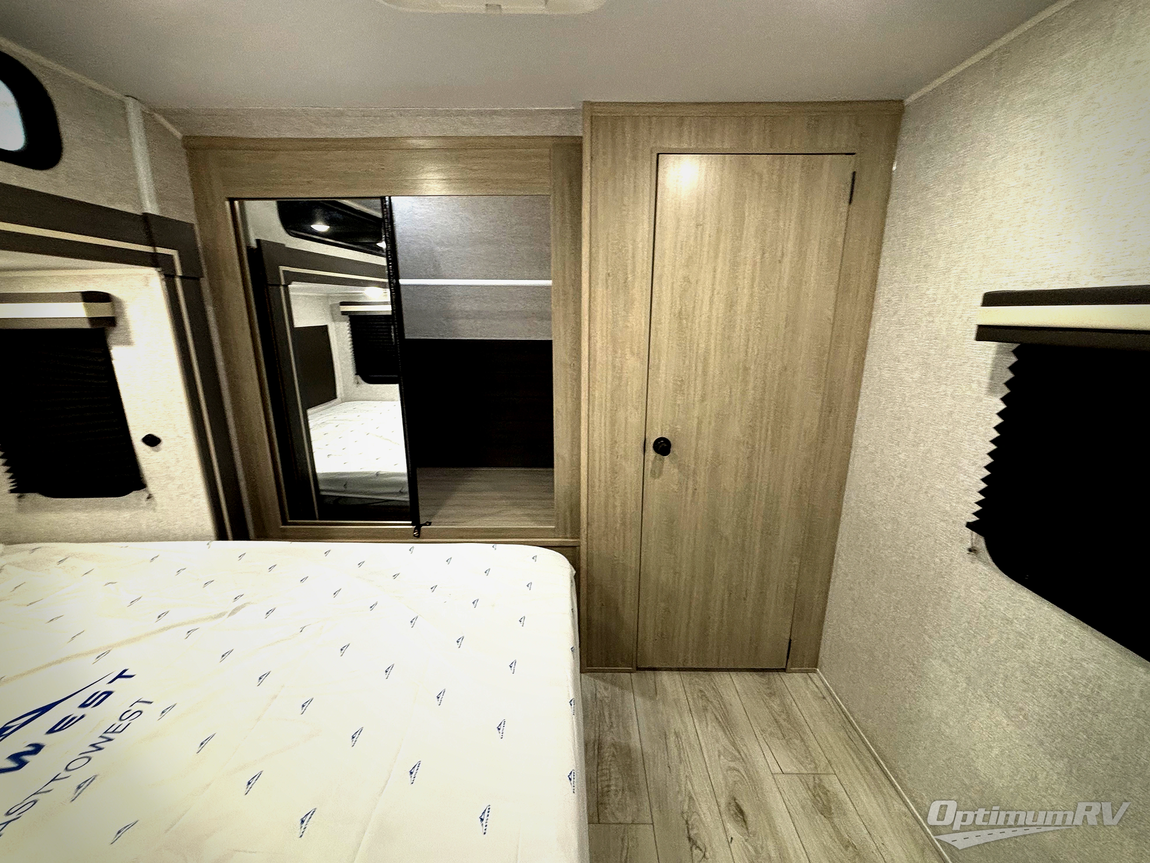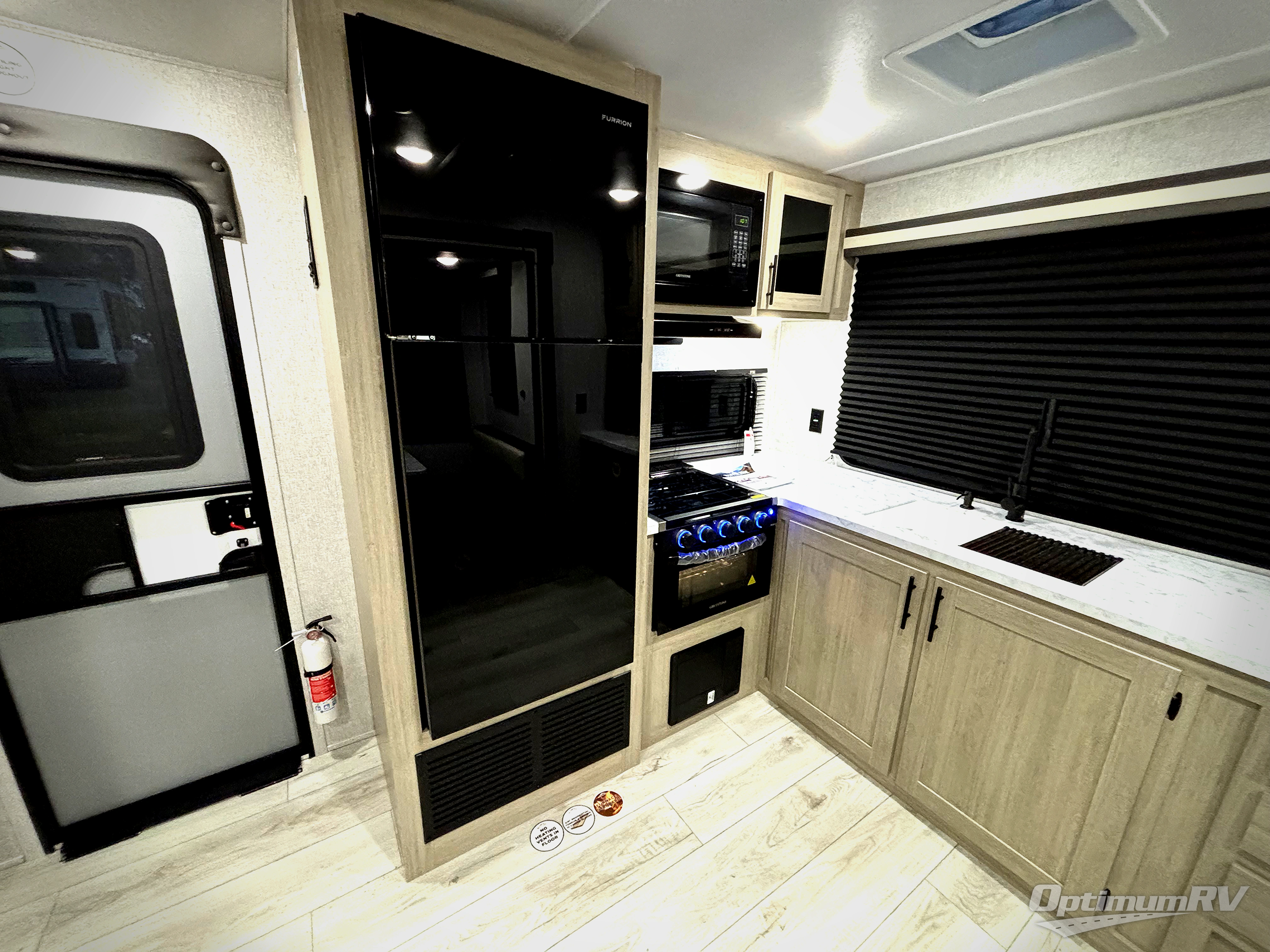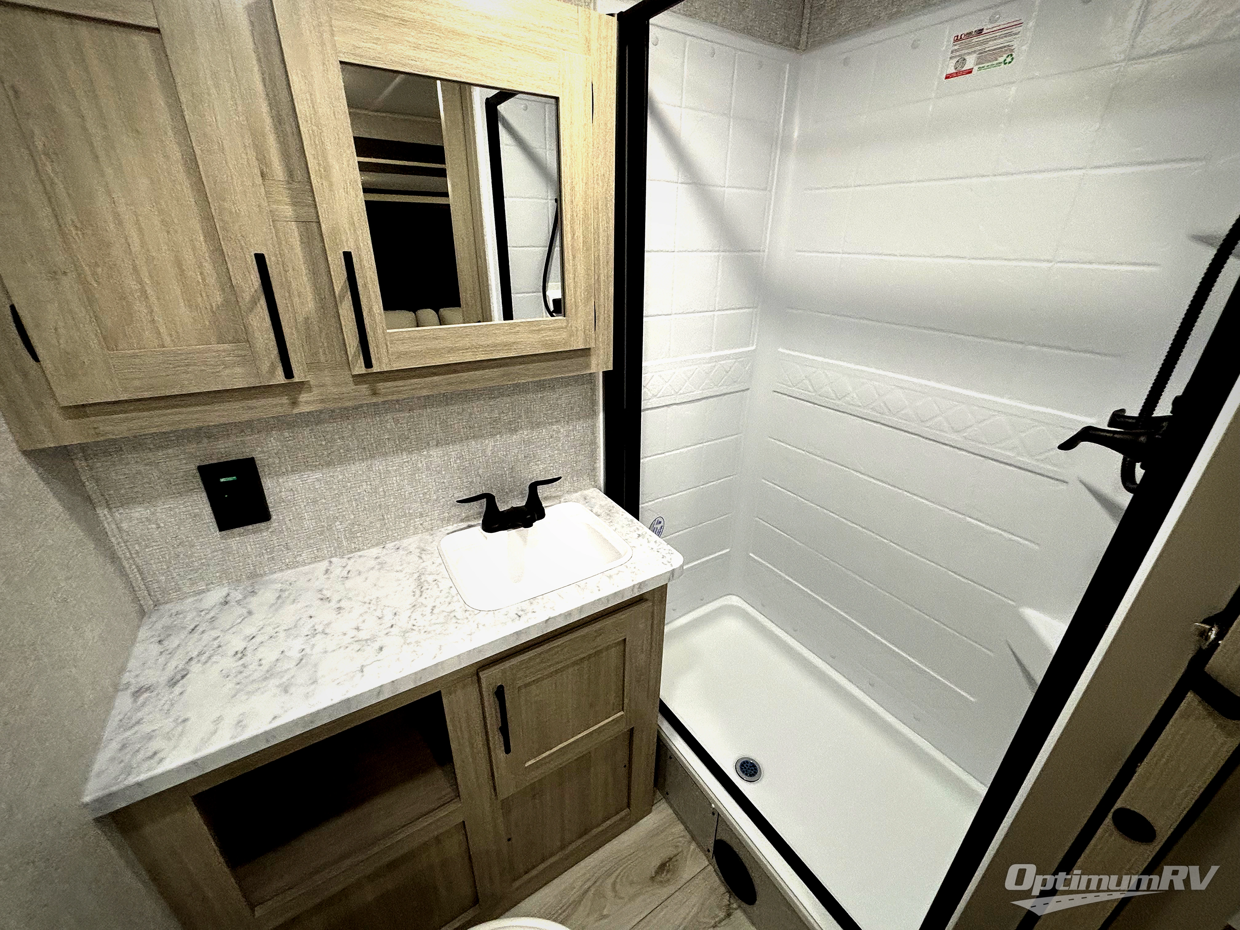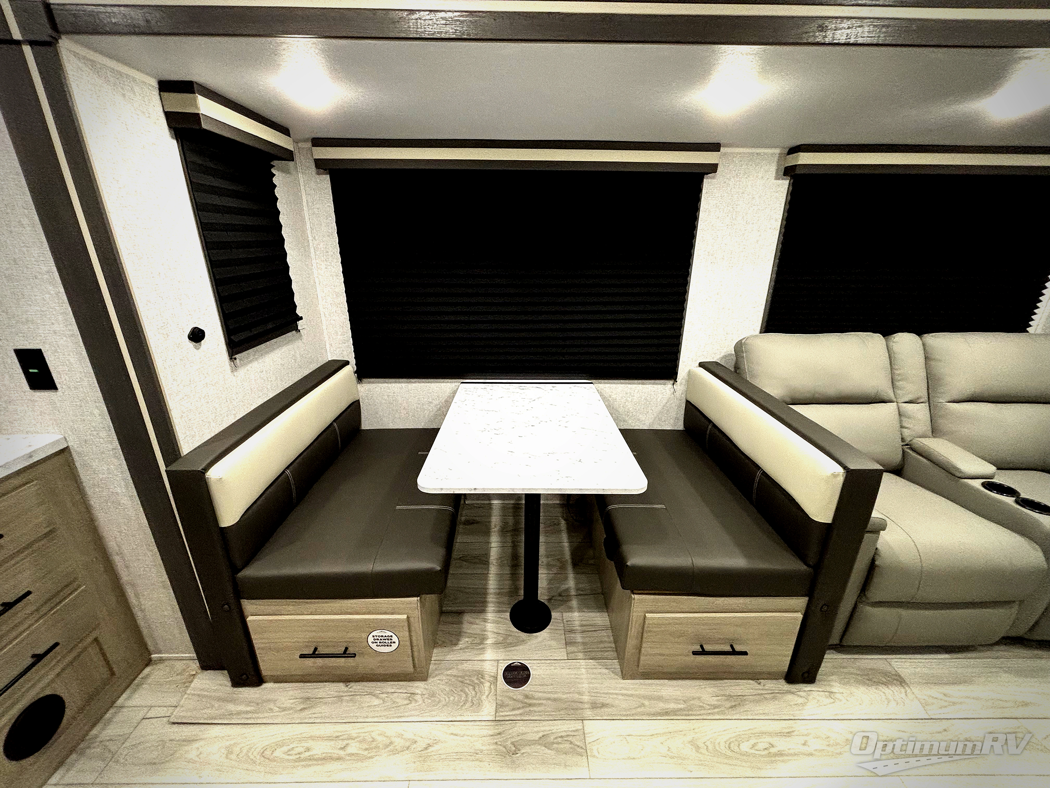 This travel trailer will feel just like home with its spacious interior and at-home comforts. Since there are dual entry doors, you can enter in through the front bedroom or the rear kitchen and living area. A king bed slide in the bedroom is sure to bring comfort, and there is a closet to keep your clothes wrinkle-free, plus washer and dryer prep. The second slide out is found in the living room, and here you can relax on the jiffy sofa or dine at the booth dinette. The chef of your group will love cooking in the rear kitchen, and there is generous counter space here to set out snacks. An entryway pantry and closet will provide additional storage for snacks, jackets, and more!