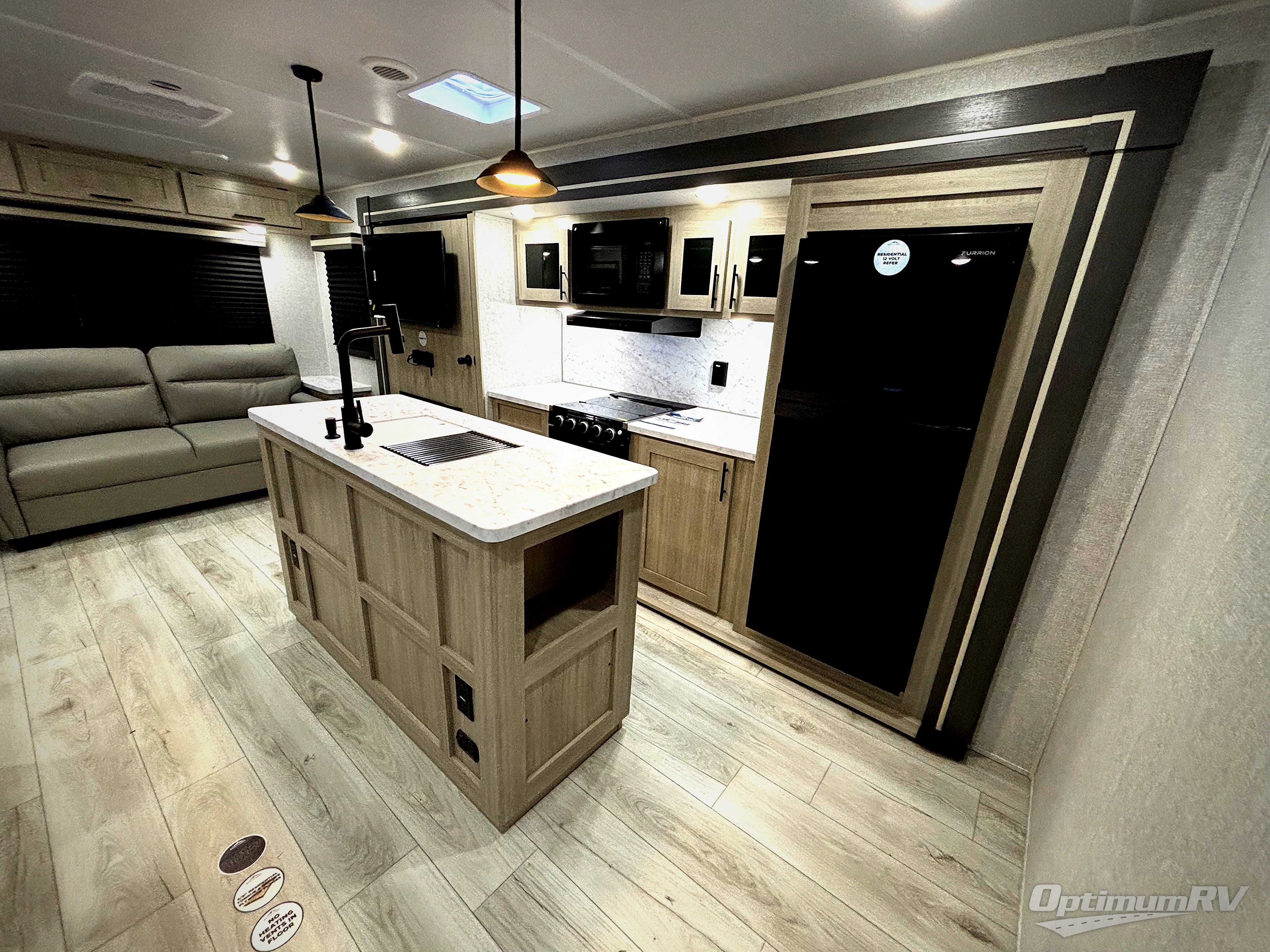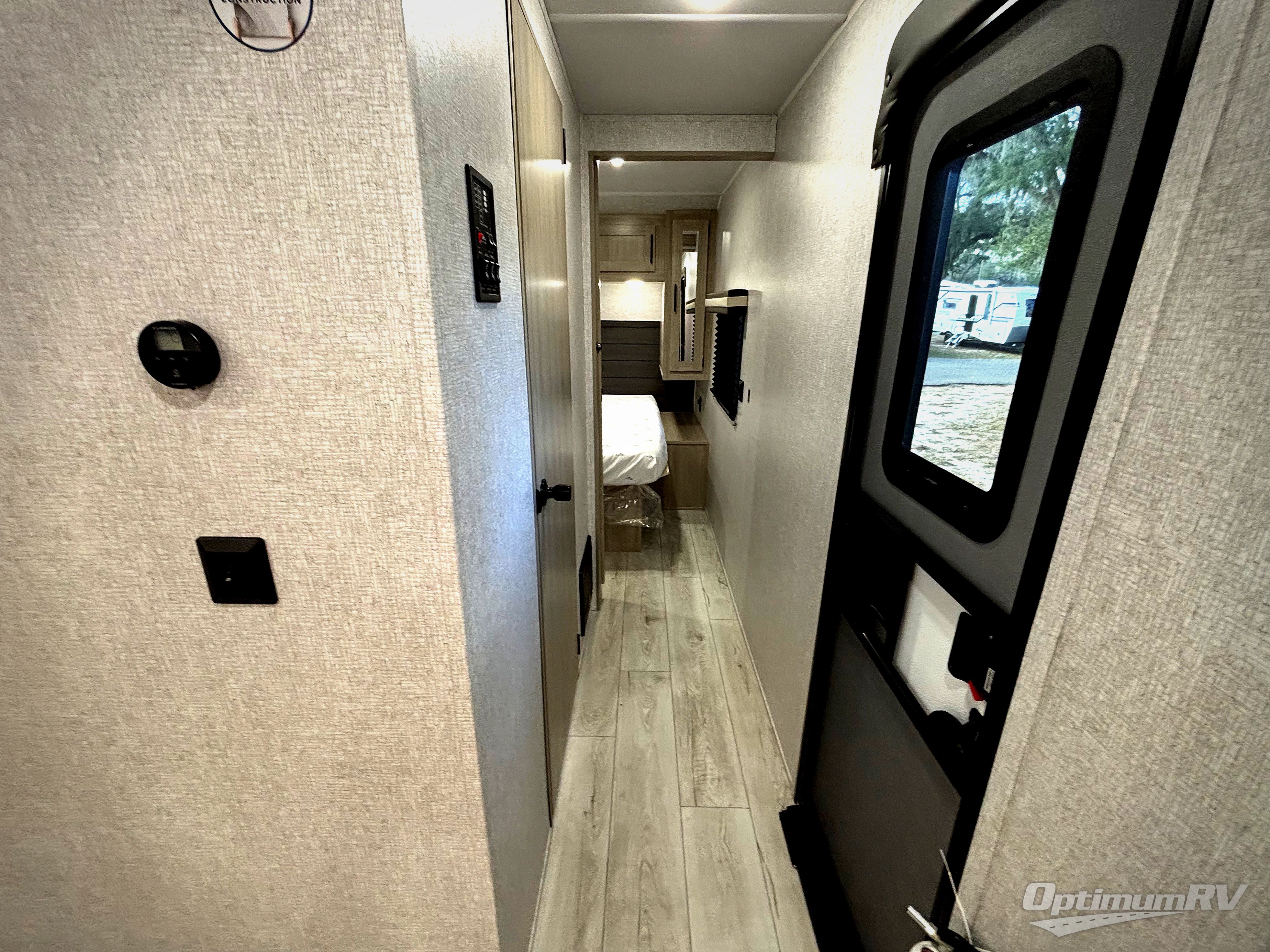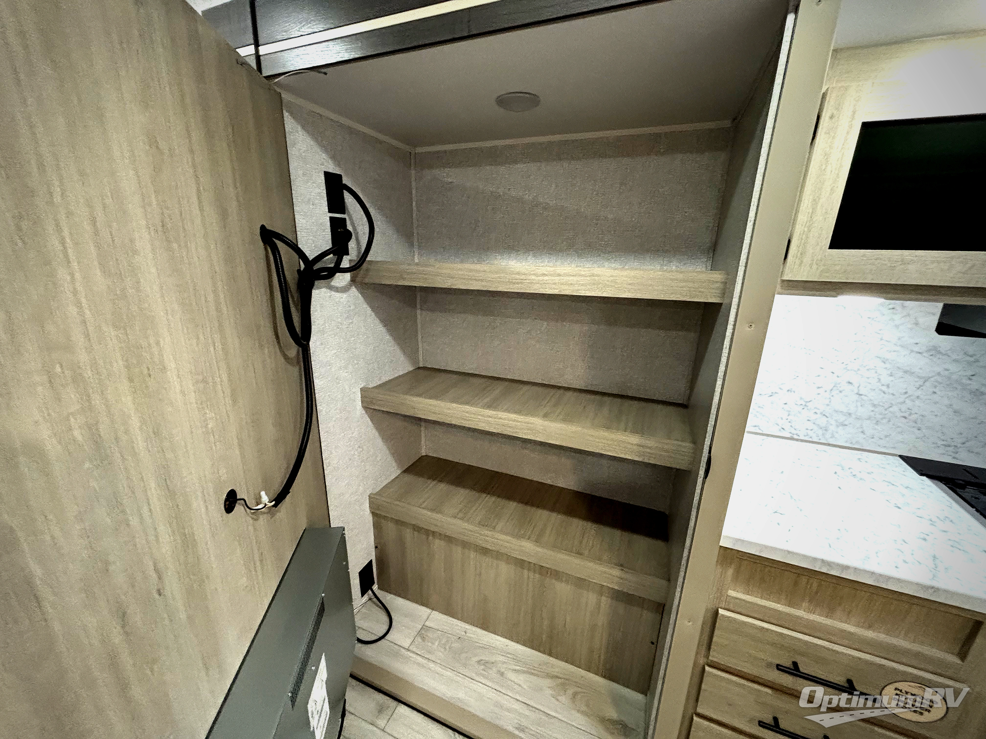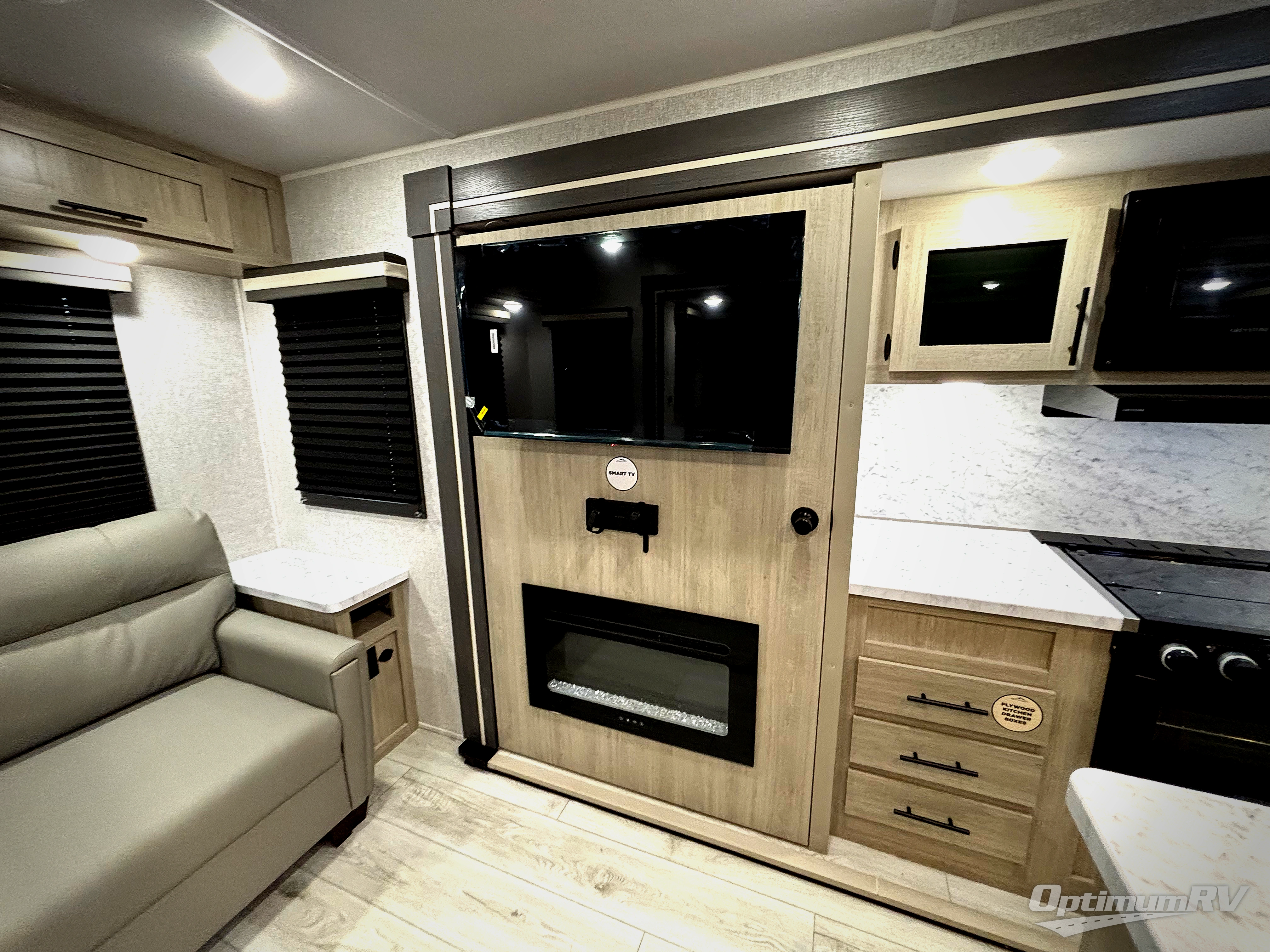 Camping in this double slide out travel trailer will be easier than ever! Once you arrive at your destination, set up the power awning, unload the pass-through storage, and head inside to make lunch in the full kitchen. There is a kitchen island for more prep space, along with a 10.7 cu. ft. 12V refrigerator, three burner range, and microwave oven. You'll find comfortable seating space on the booth dinette, jiffy sofa, and dual lounge chairs, and the fireplace is sure to make your space feel more like home. There is also hidden storage behind the fireplace for pantry items, board games, and more! Up front, a full bath and front private bedroom will let you freshen up before a great night's rest on the king bed!