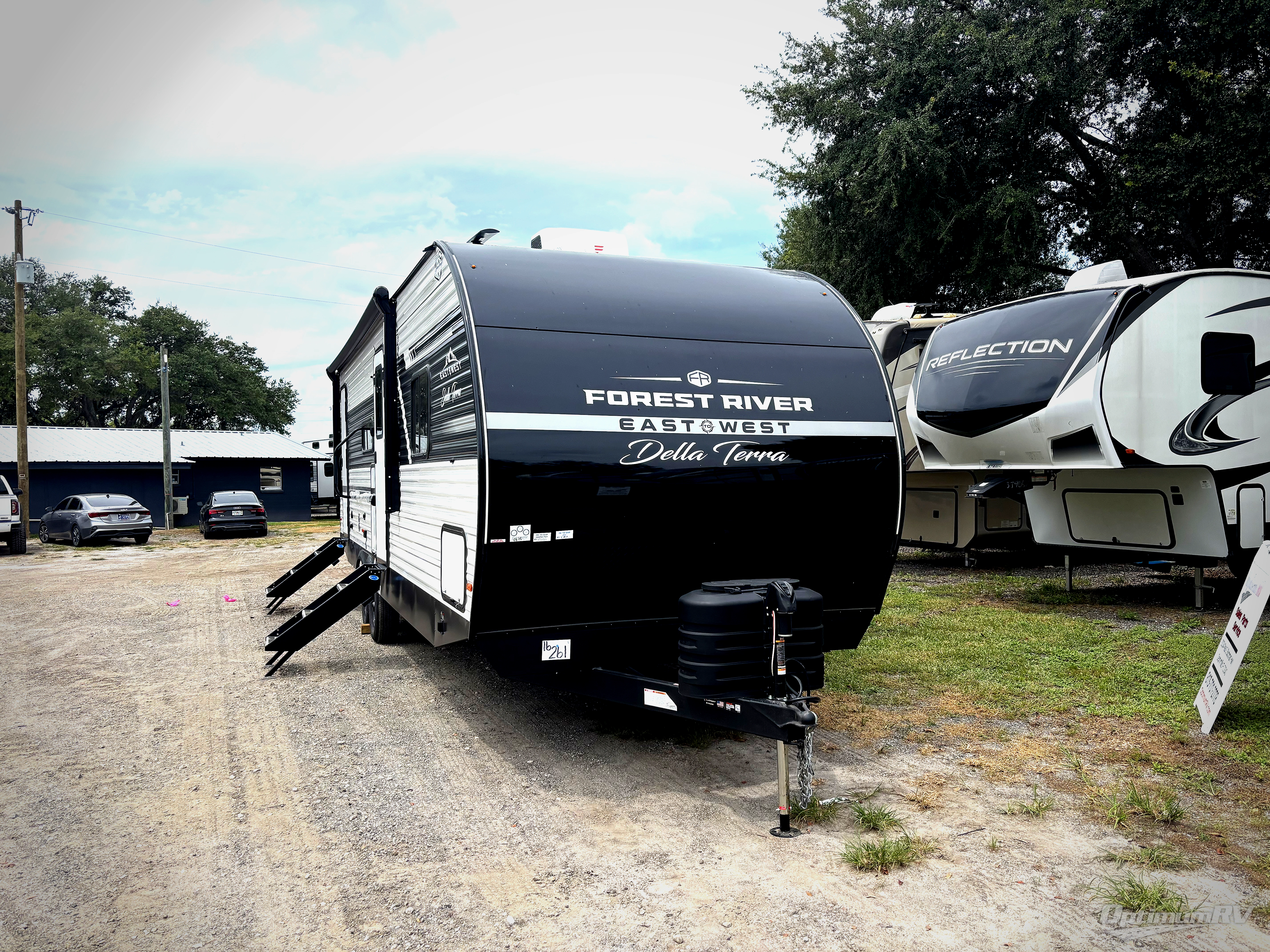 Each Della Terra travel trailer by EAST TO WEST is constructed with an enclosed and heated underbelly and enclosed holding tanks so you can camp all year long. There is also a power tongue jack with an LED light for easy set up and a power awning with LED lights you can rest under after you've unpacked. The Explore Comfort Package comes seamless pressed countertops, kitchen backsplash, window valance package with black night shades, and many more comforts. You will also appreciate the Adventure Outdoor Package with backup camera prep and solar prep, a tankless water heater, an RV grill quick disconnect, and a universal docking station with battery disconnect.