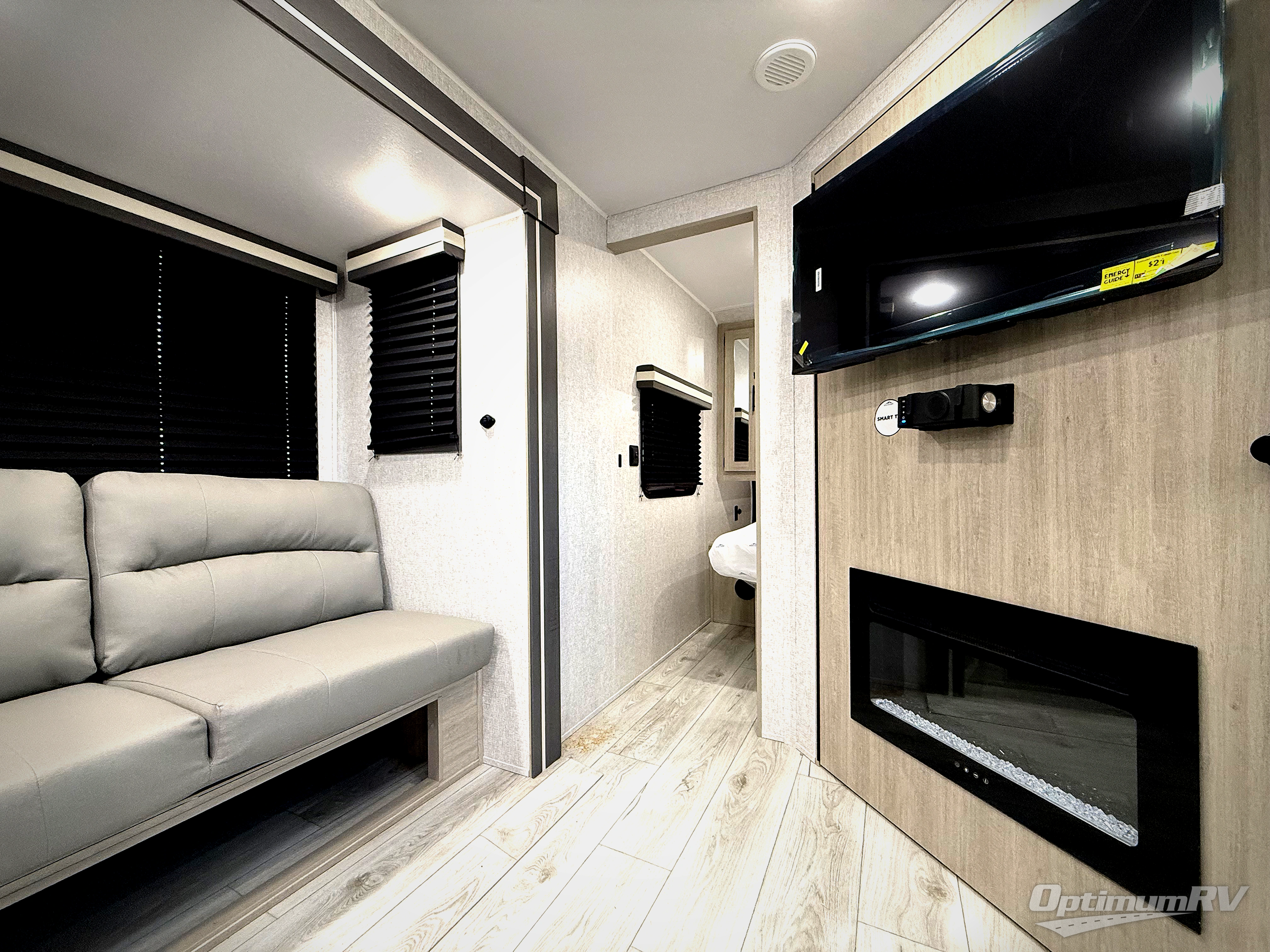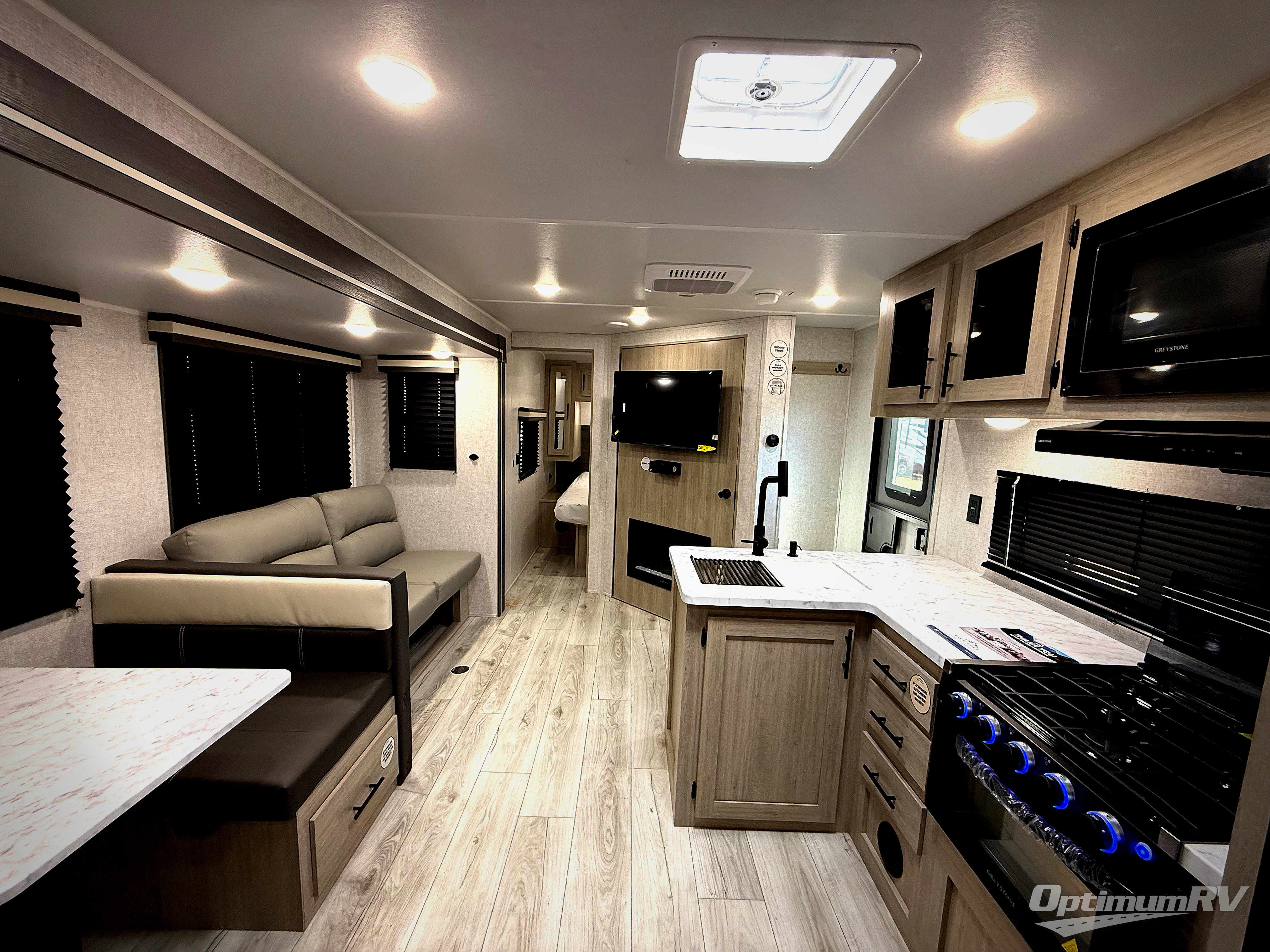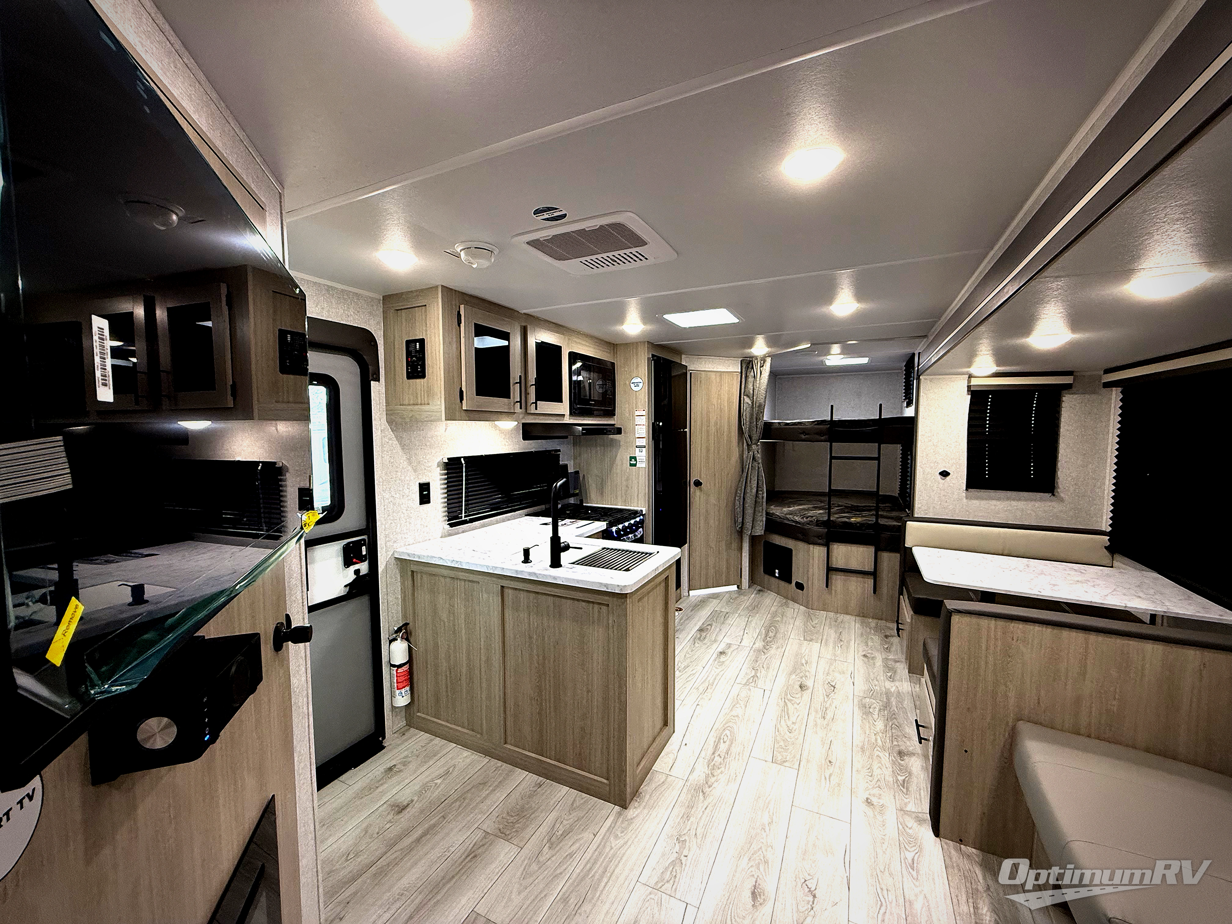 Pack your bags and hitch up this travel trailer for a fun family adventure! You will get a good night's rest on the front king bed in the front private bedroom, and the kids can sleep on the double bunk beds with storage. You could even transform the booth dinette with storage underneath it and the jiffy sofa which can be switched out for the optional theater seat or optional tri-fold sofa. The entertainment center has a fireplace for a cozy evening indoors and a hidden pantry behind it for all of your movie night snacks. With dual entry doors, it will be easy to enter and exit this unit especially from the rear corner bathroom which has one of the entry/exit doors to the unit. Enjoy cooking breakfast outside at the outdoor kitchen complete with a pull-out griddle and fridge!