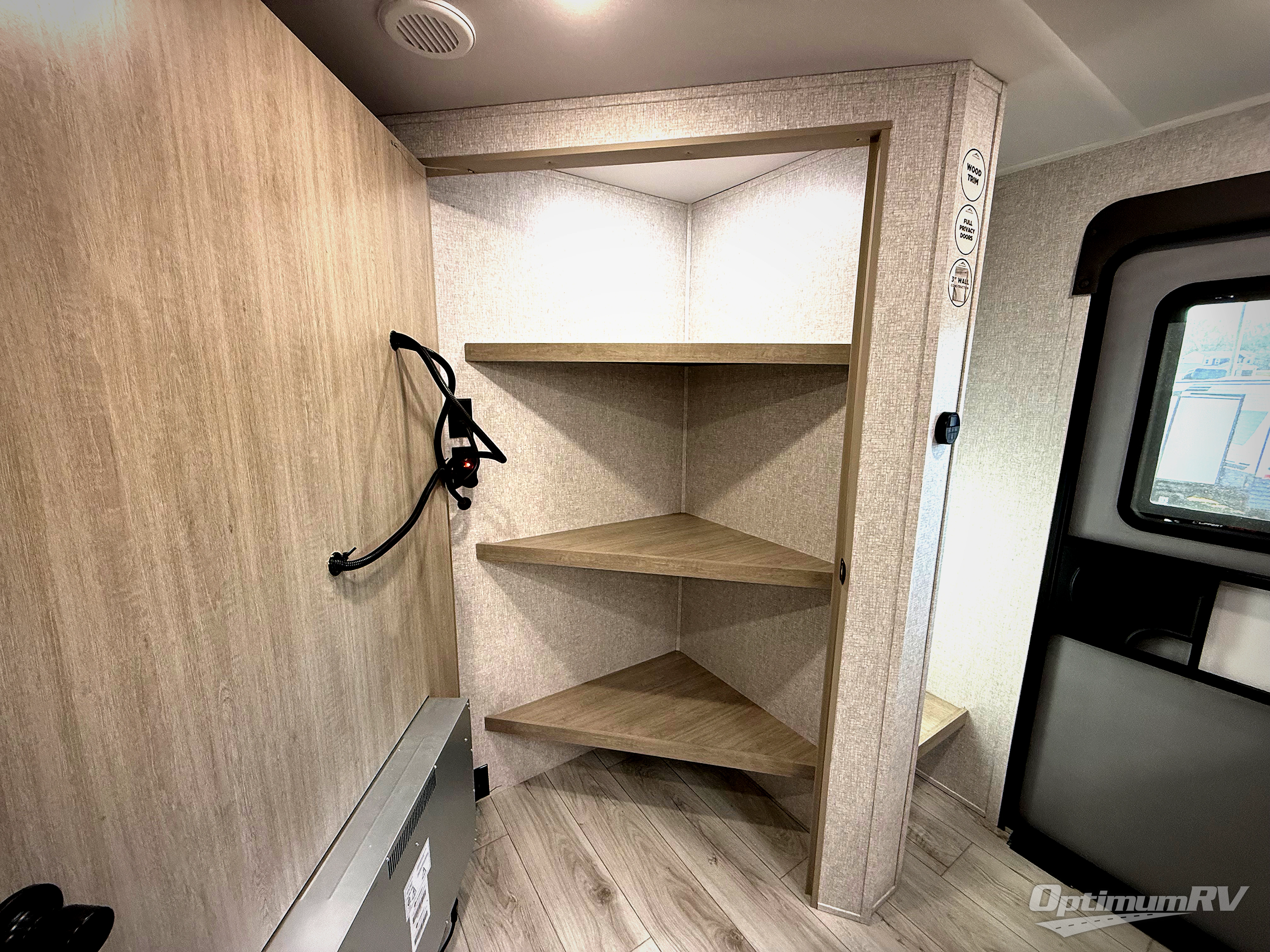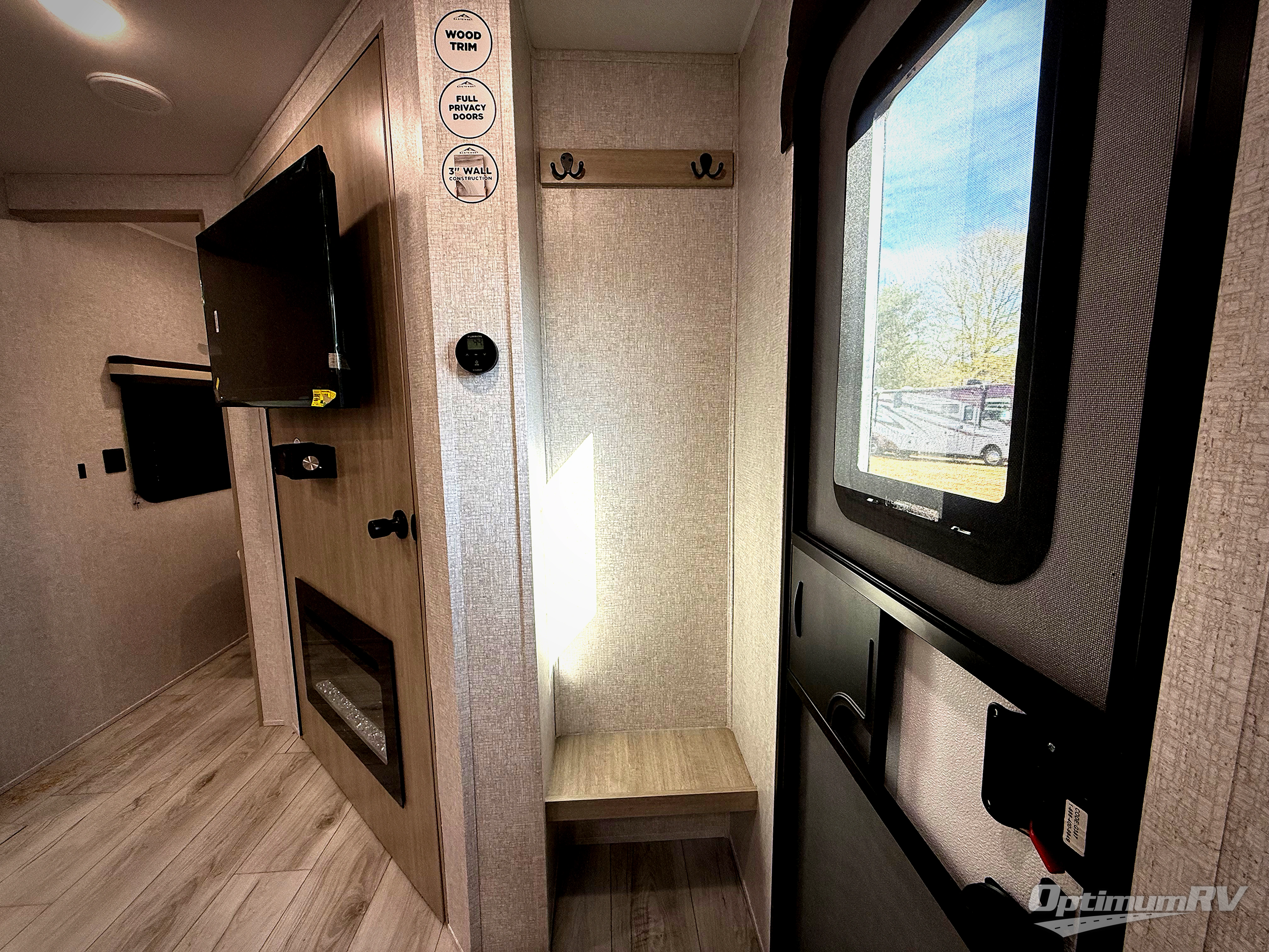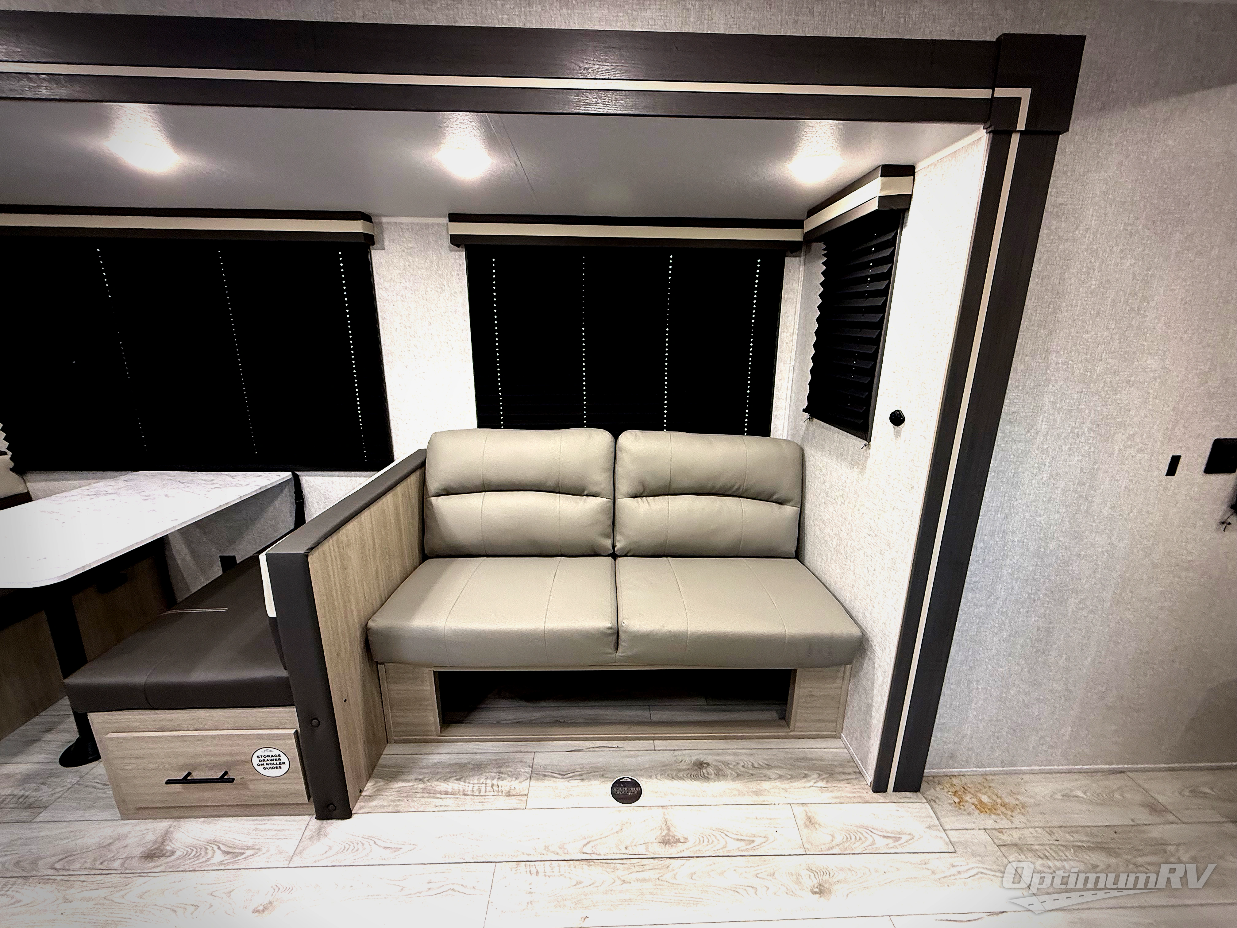Pack your bags and hitch up this travel trailer for a fun family adventure! You will get a good night's rest on the front king bed in the front private bedroom, and the kids can sleep on the double bunk beds with storage. You could even transform the booth dinette with storage underneath it and the jiffy sofa which can be switched out for the optional theater seat or optional tri-fold sofa. The entertainment center has a fireplace for a cozy evening indoors and a hidden pantry behind it for all of your movie night snacks. With dual entry doors, it will be easy to enter and exit this unit especially from the rear corner bathroom which has one of the entry/exit doors to the unit. Enjoy cooking breakfast outside at the outdoor kitchen complete with a pull-out griddle and fridge!