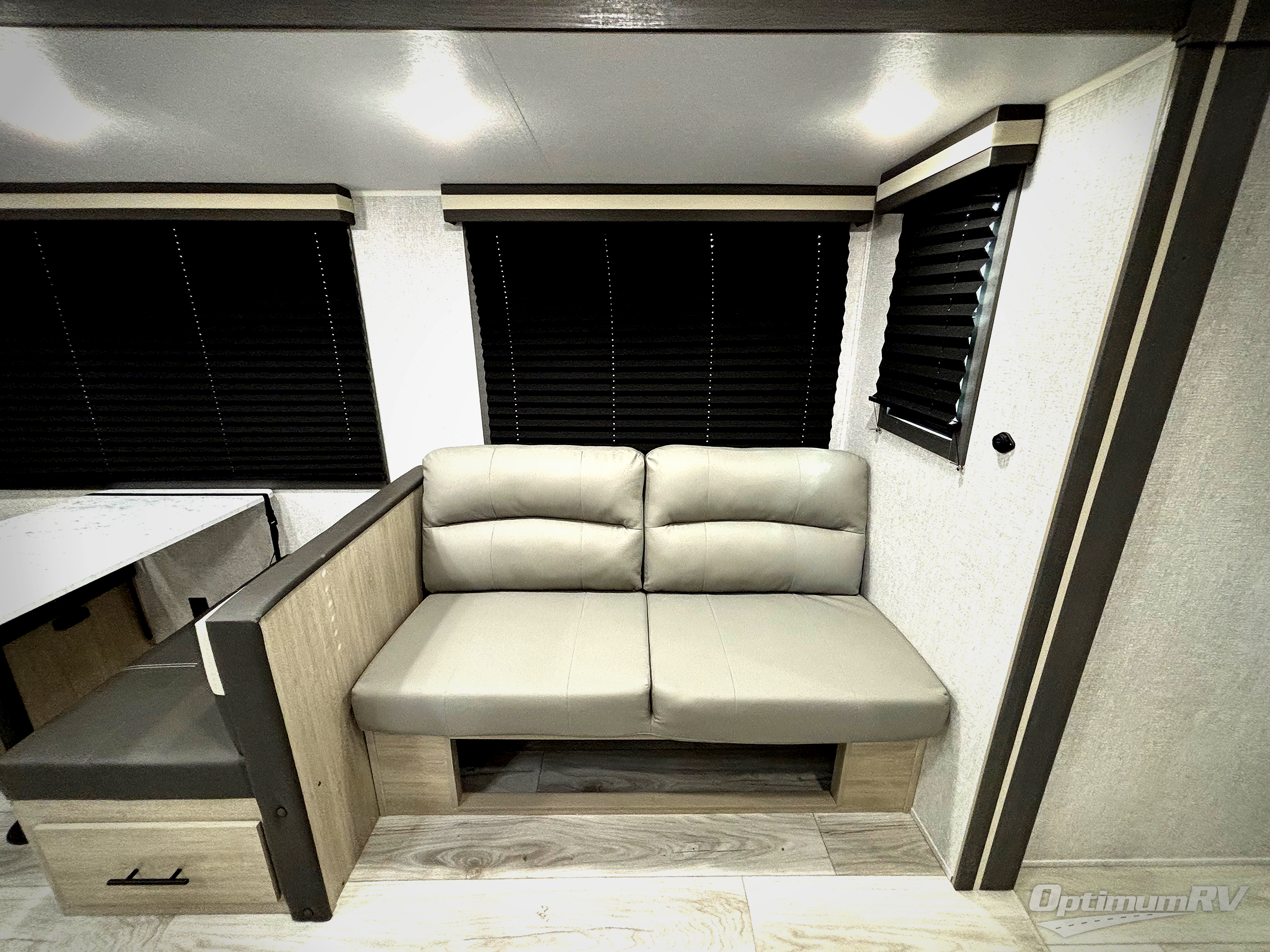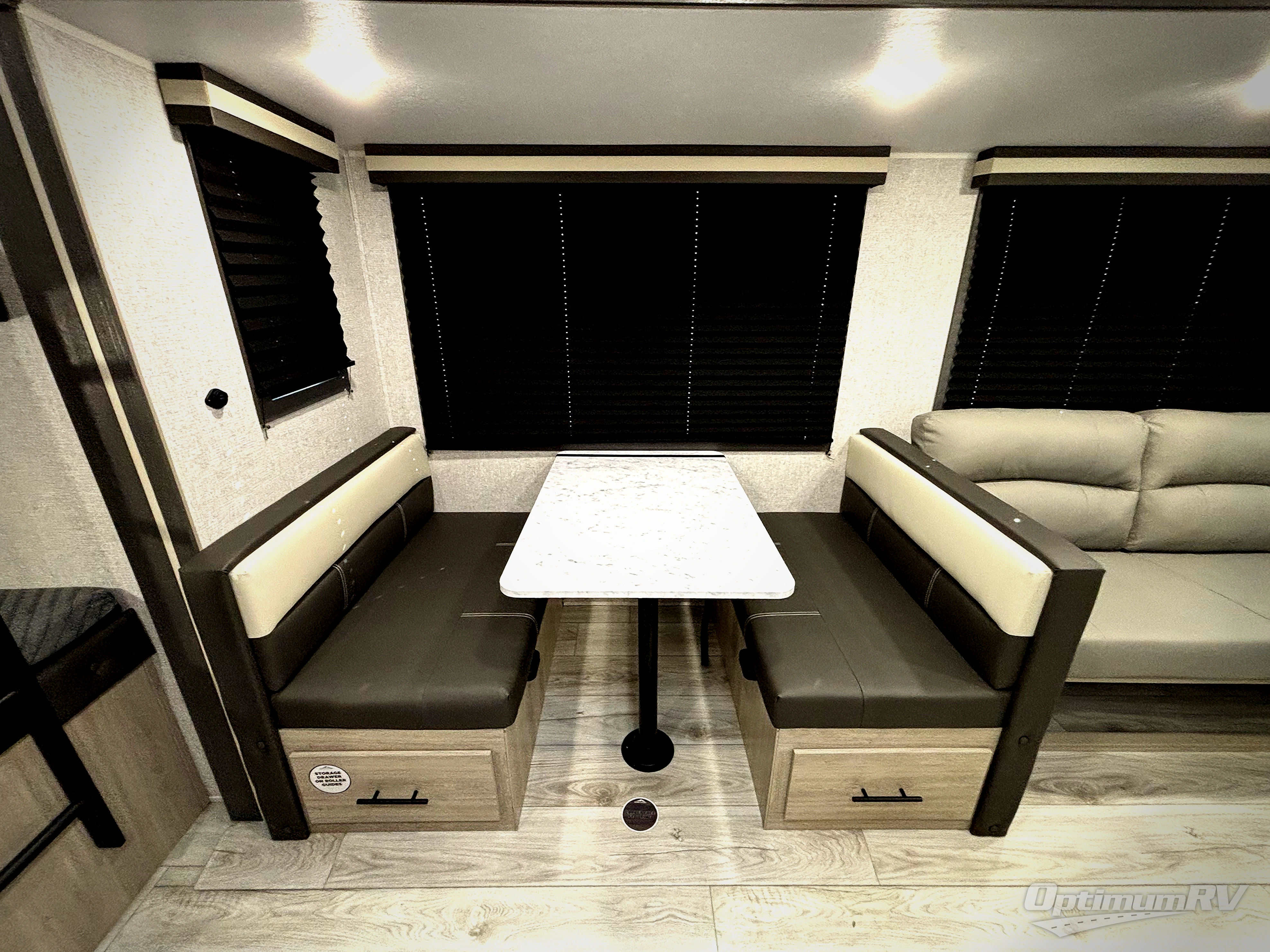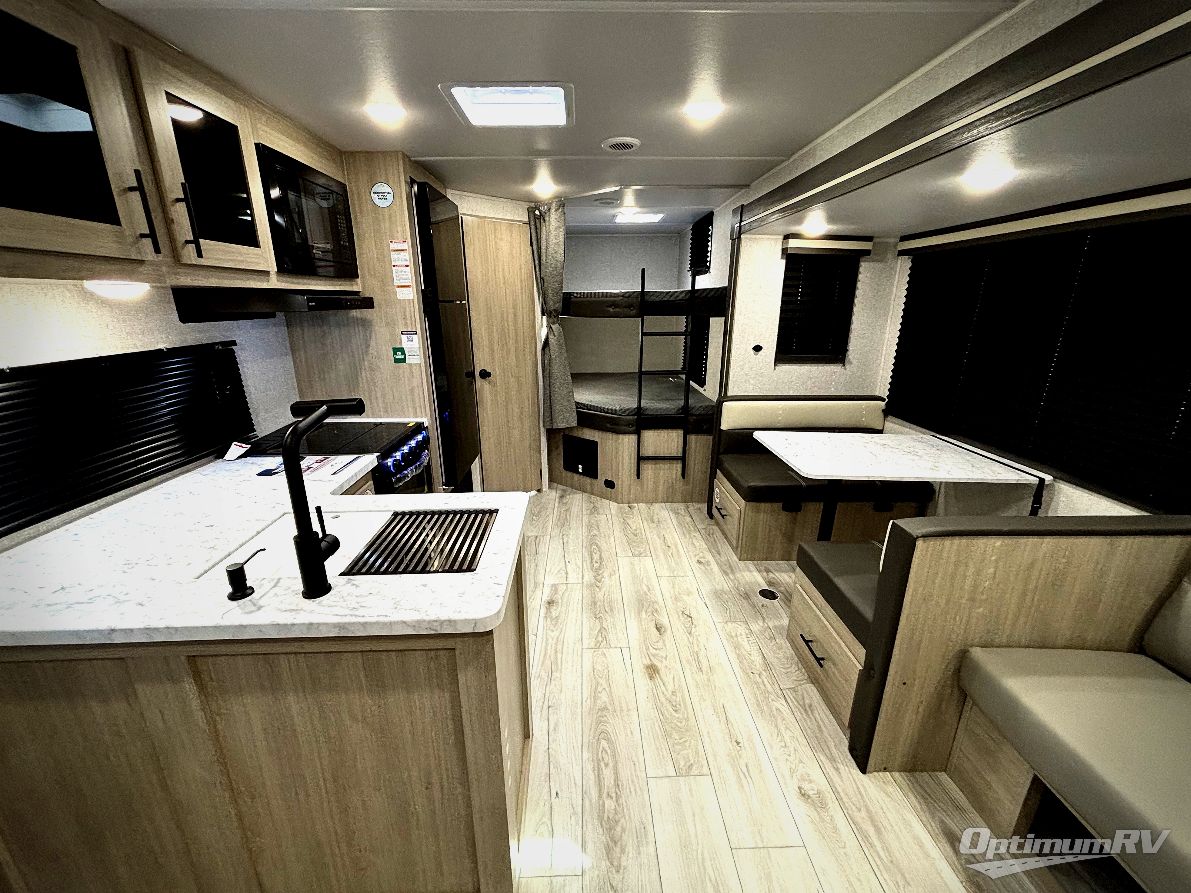 Pack your bags and hitch up this travel trailer for a fun family adventure! You will get a good night's rest on the front king bed in the front private bedroom, and the kids can sleep on the double bunk beds with storage. You could even transform the booth dinette with storage underneath it and the jiffy sofa which can be switched out for the optional theater seat or optional tri-fold sofa. The entertainment center has a fireplace for a cozy evening indoors and a hidden pantry behind it for all of your movie night snacks. With dual entry doors, it will be easy to enter and exit this unit especially from the rear corner bathroom which has one of the entry/exit doors to the unit. Enjoy cooking breakfast outside at the outdoor kitchen complete with a pull-out griddle and fridge!