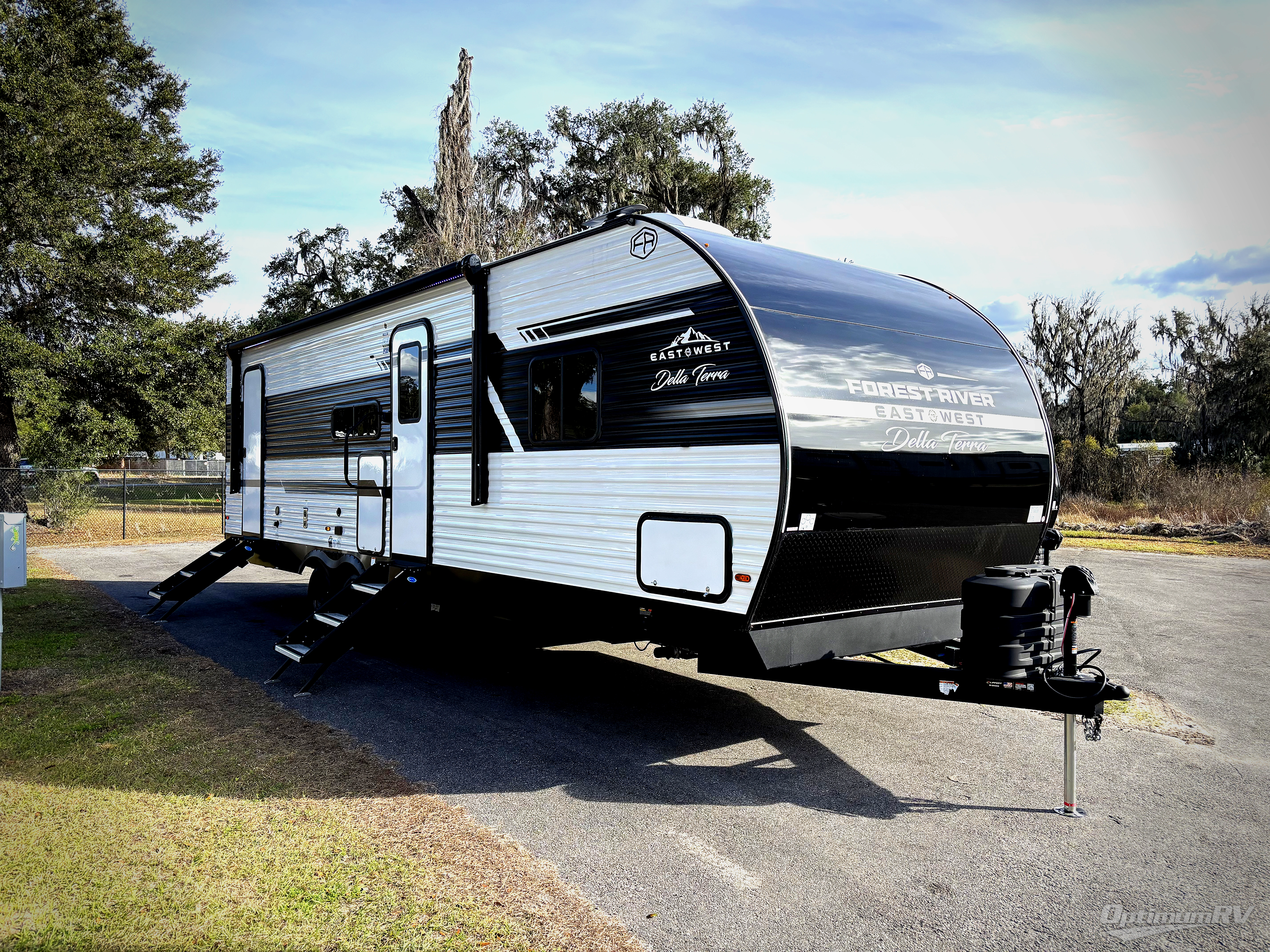 Each Della Terra travel trailer by EAST TO WEST is constructed with an enclosed and heated underbelly and enclosed holding tanks for added protection against the elements. There is also a power tongue jack with an LED light for easy set up and a power awning with LED lights you can rest under after you've unpacked. The Explore Comfort Package comes seamless pressed countertops, kitchen backsplash, window valance package with black night shades, and many more comforts. You will also appreciate the Adventure Outdoor Package with backup camera prep and solar prep, a tankless water heater, an RV grill quick disconnect, and a universal docking station with battery disconnect.