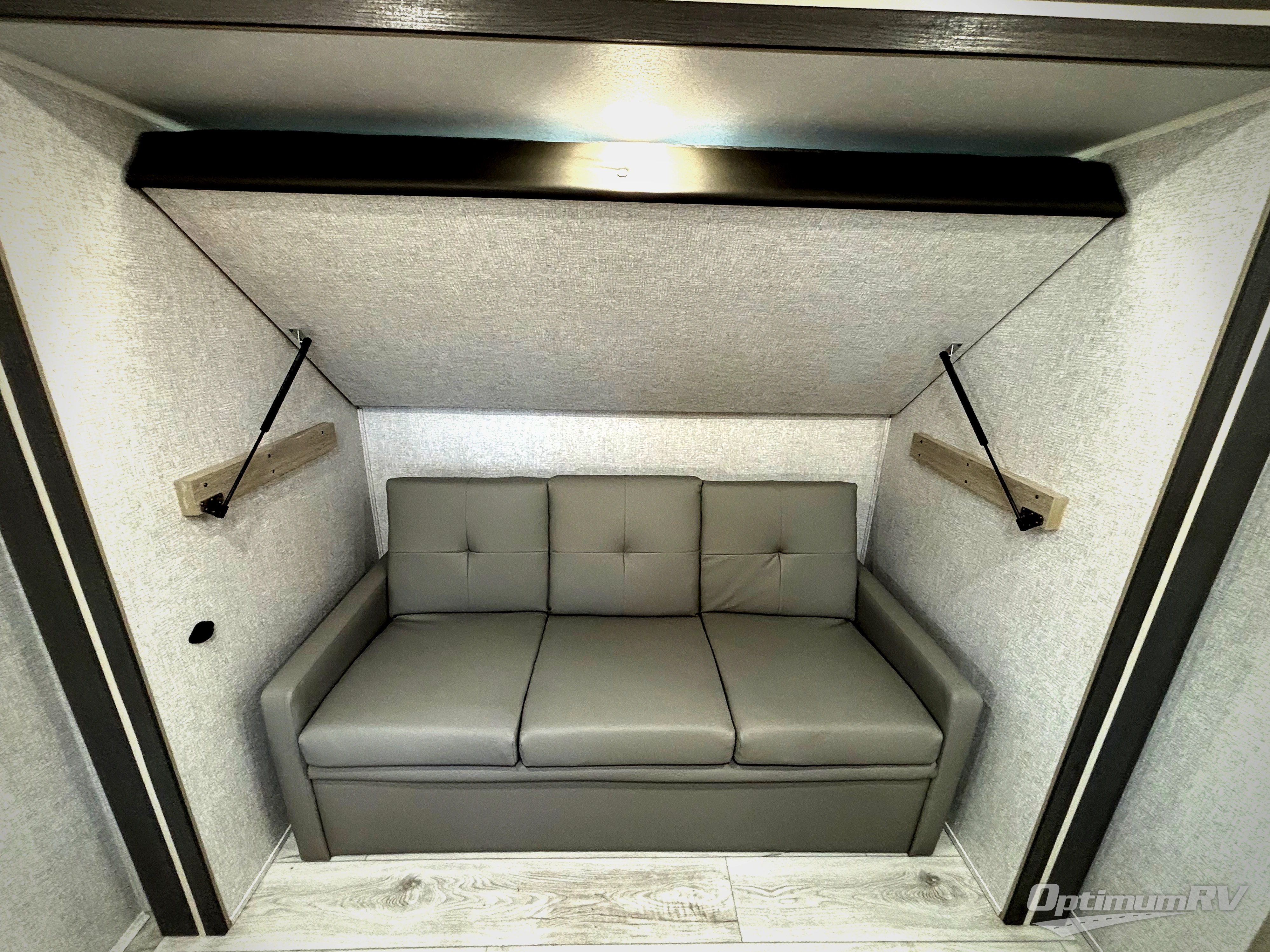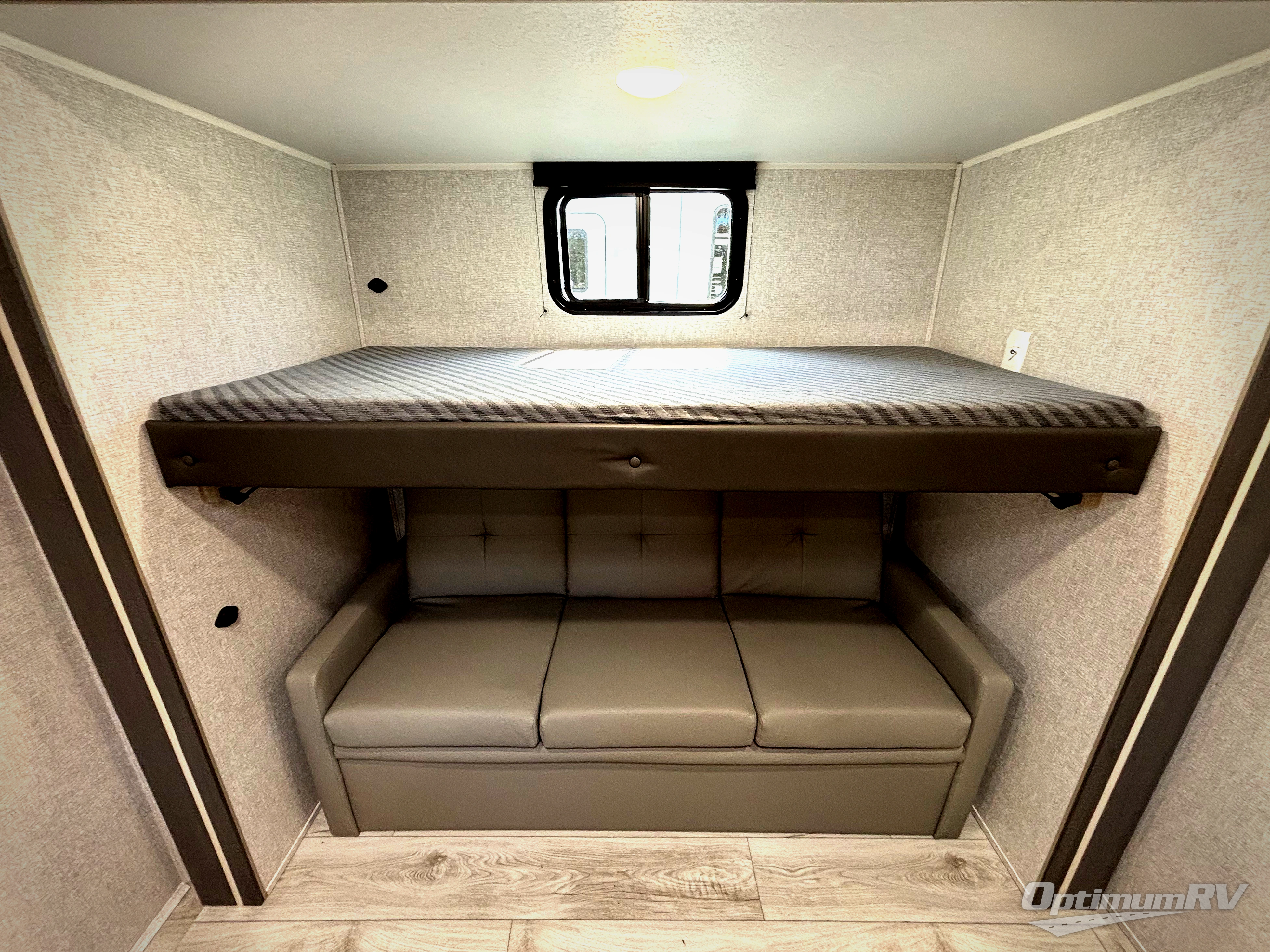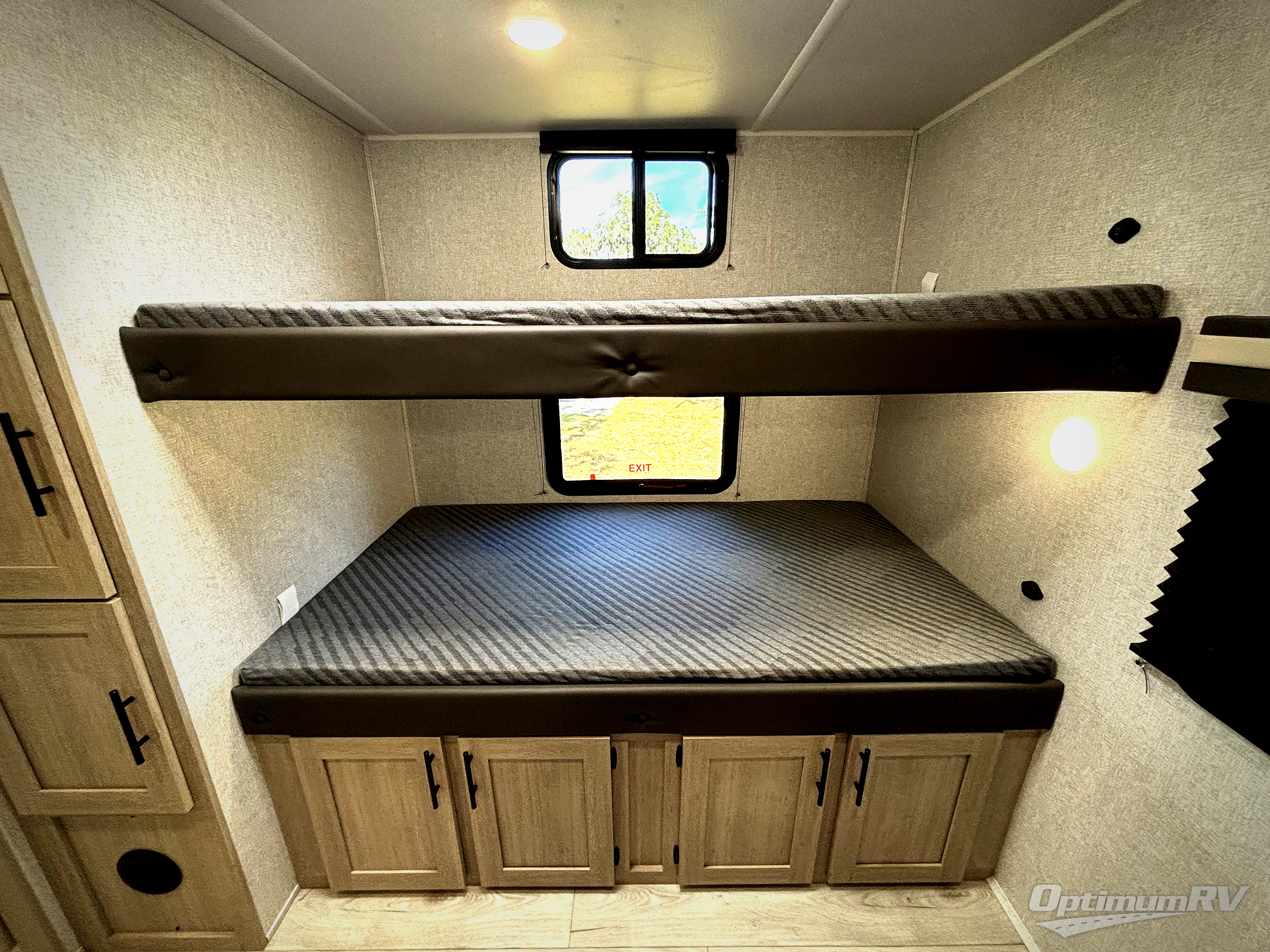 Head to the RV park for a long-weekend or week-long break from your everyday routine with this trailer at your favorite campsite. After setting up the two slide outs and the 15' power awning, you can relax inside on the jack knife sofa, dine at the oversized booth dinette or whip up a meal in the L-shaped kitchen. Everyone will enjoy the fireplace no matter what you are doing. The walk-through bathroom is super convenient, and the front bedroom allows you to live like royalty in privacy. The rear bunkhouse also offers privacy and includes three bunk beds and a sofa, plus storage. Your kids or guests will love having their own room. And the exterior offers an optional outdoor kitchen, an oversized pass-through storage for your larger gear like fishing poles, outdoor tables and bags of charcoal, plus there are two spray ports to easily rinse off dirty bikes, shoes and such.
