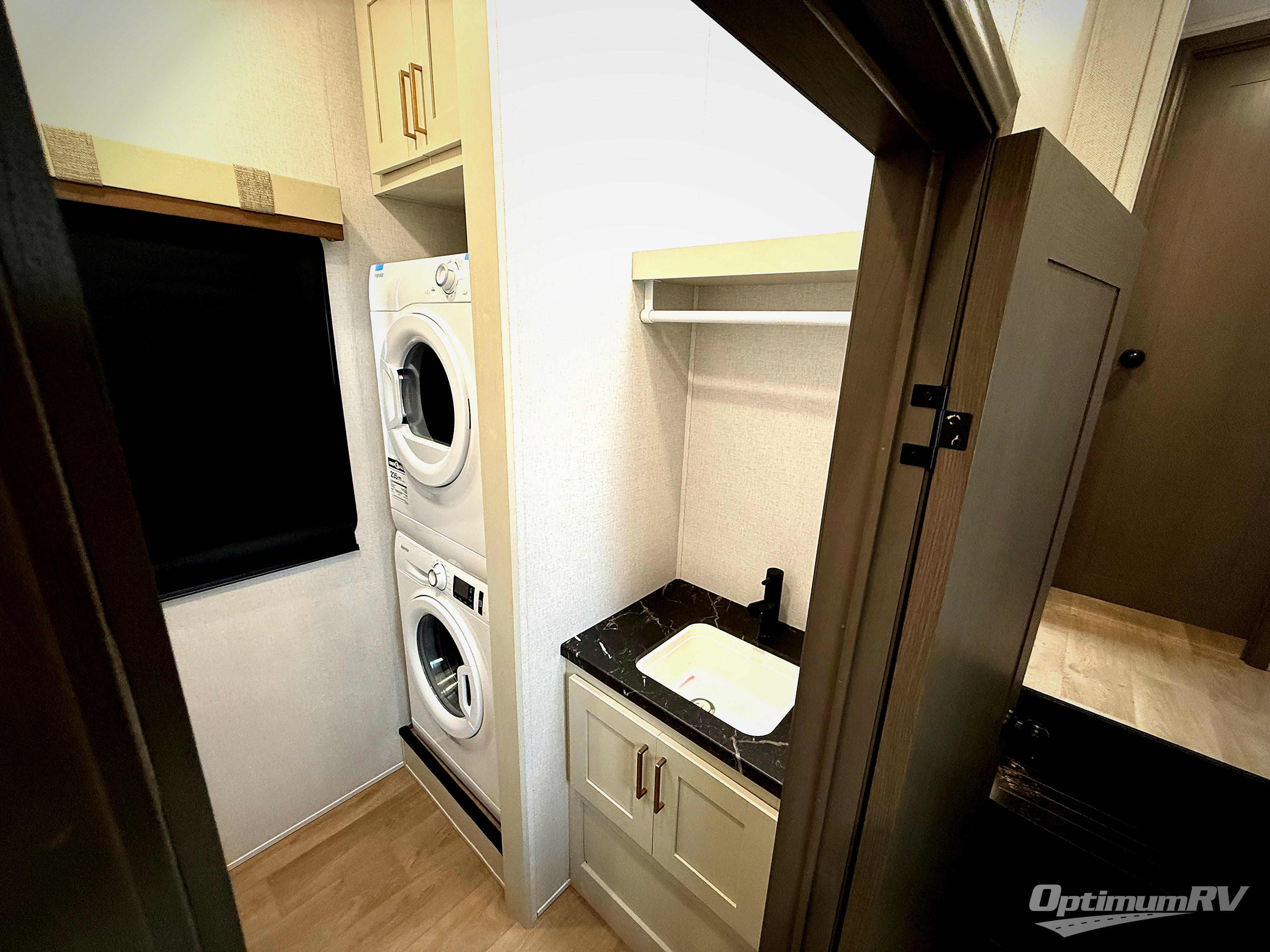 It won't be hard to find comfort and convenience in this spacious fifth wheel! The rear kitchen features ample counter space, a four burner 24" range, plus a 16 cu. ft. 12V refrigerator and pantry for food storage. There is also a desk here if you plan to work while you're away from home, and the coffee station by the pantry will be the perfect place to set up your own Keurig machine. The middle living area includes theater seating across from the 65" TV and fireplace, and there is a hide-a-bed sofa for guests to sleep on. A convenient utility room includes a sink with counter space plus stackable washer/dryer prep to make this an optional laundry room! A full bath will let you freshen up each day, and the front private bedroom will feel just like home with its king bed slide out, dresser and full-width wardrobe!